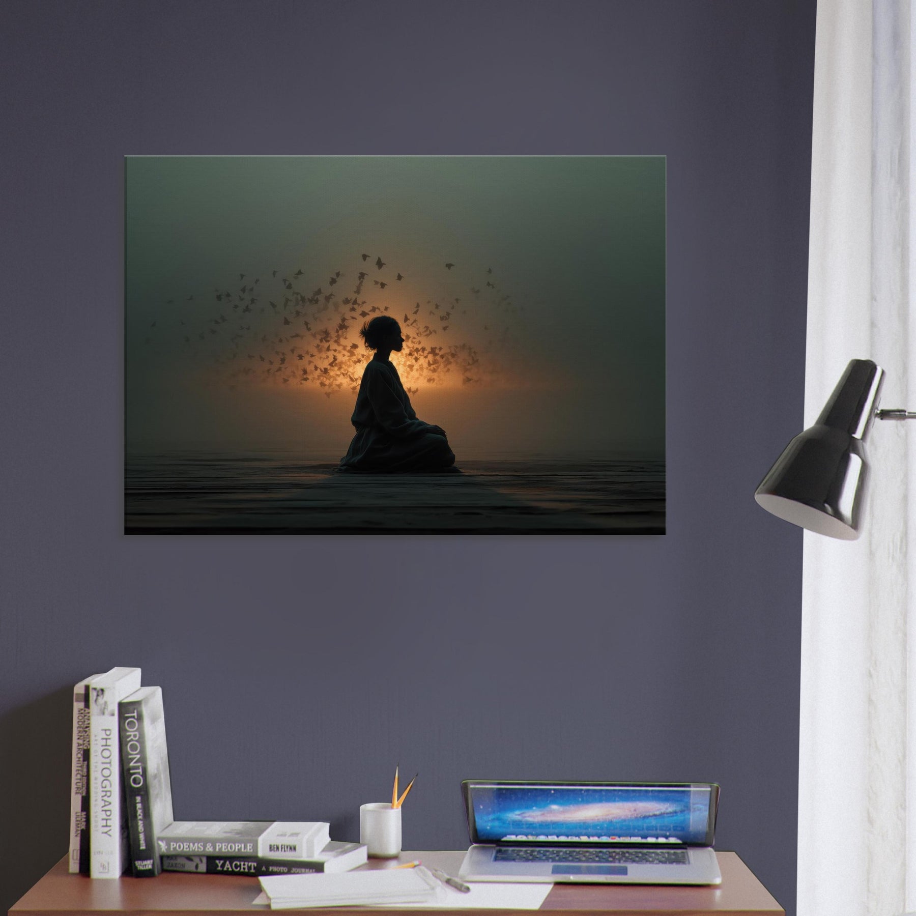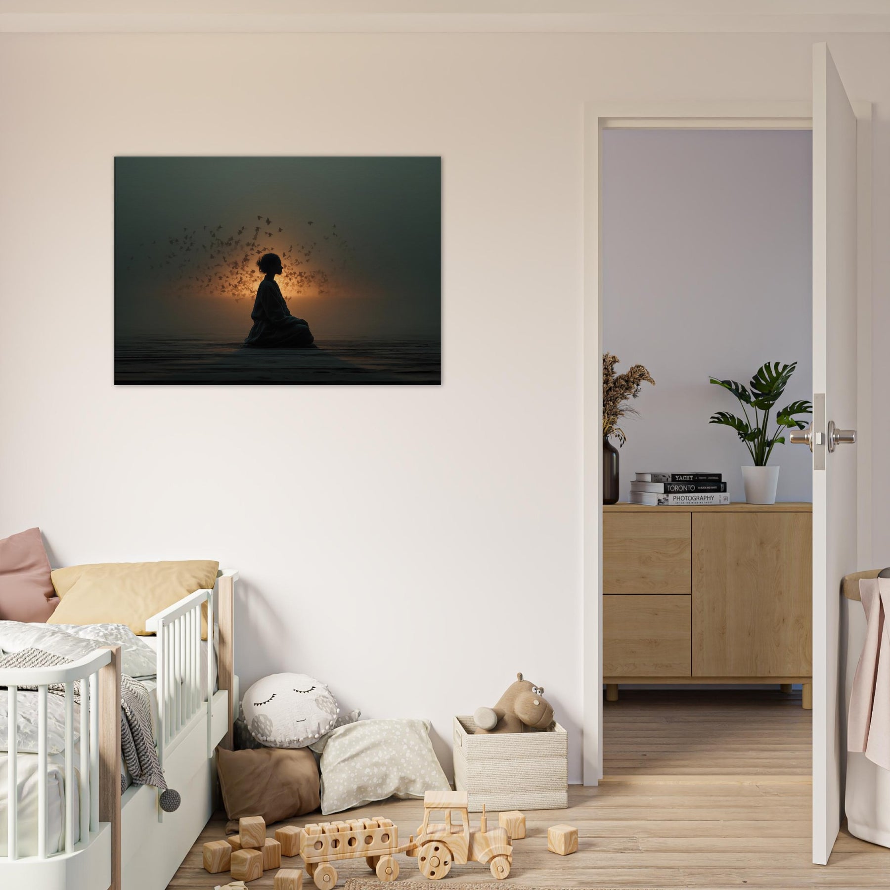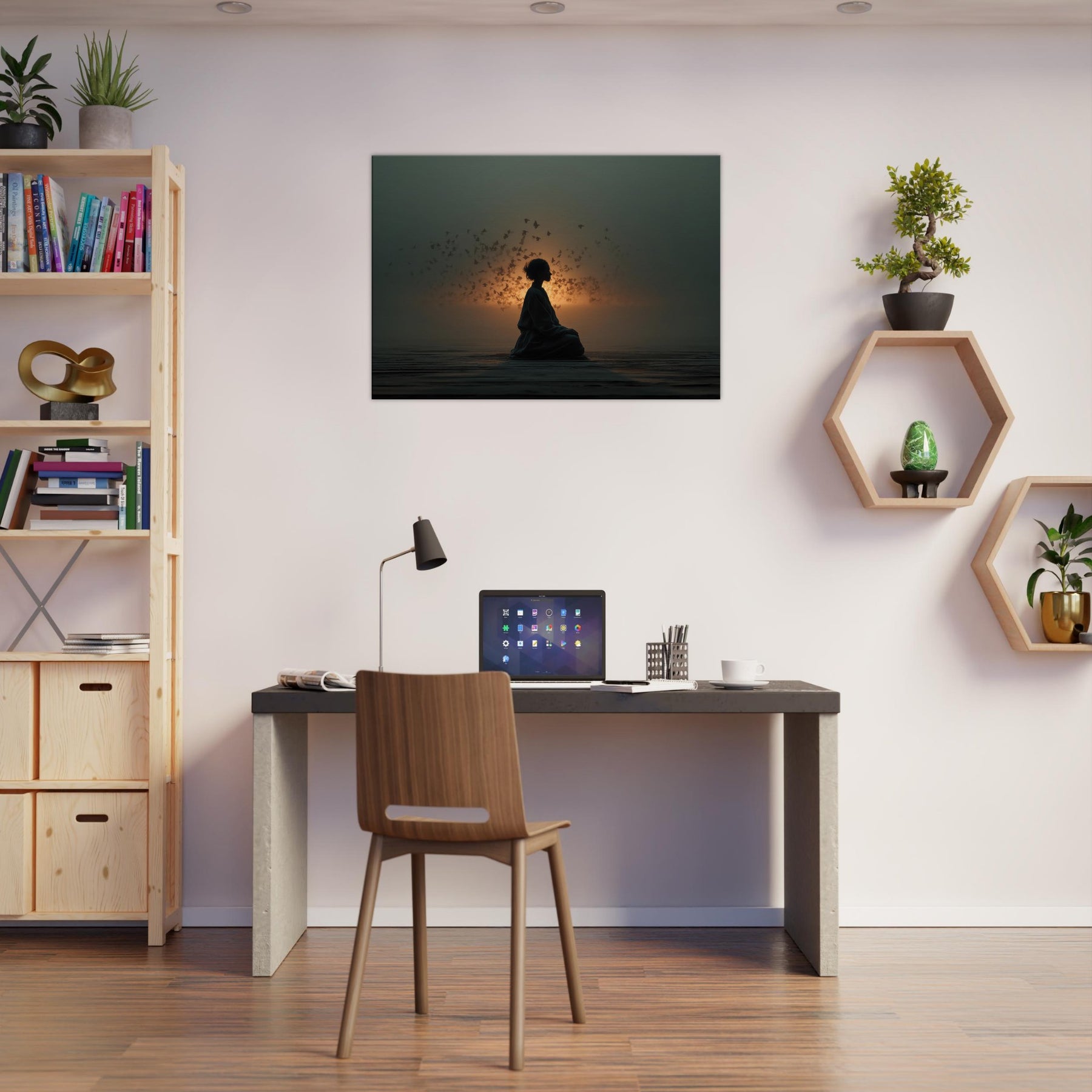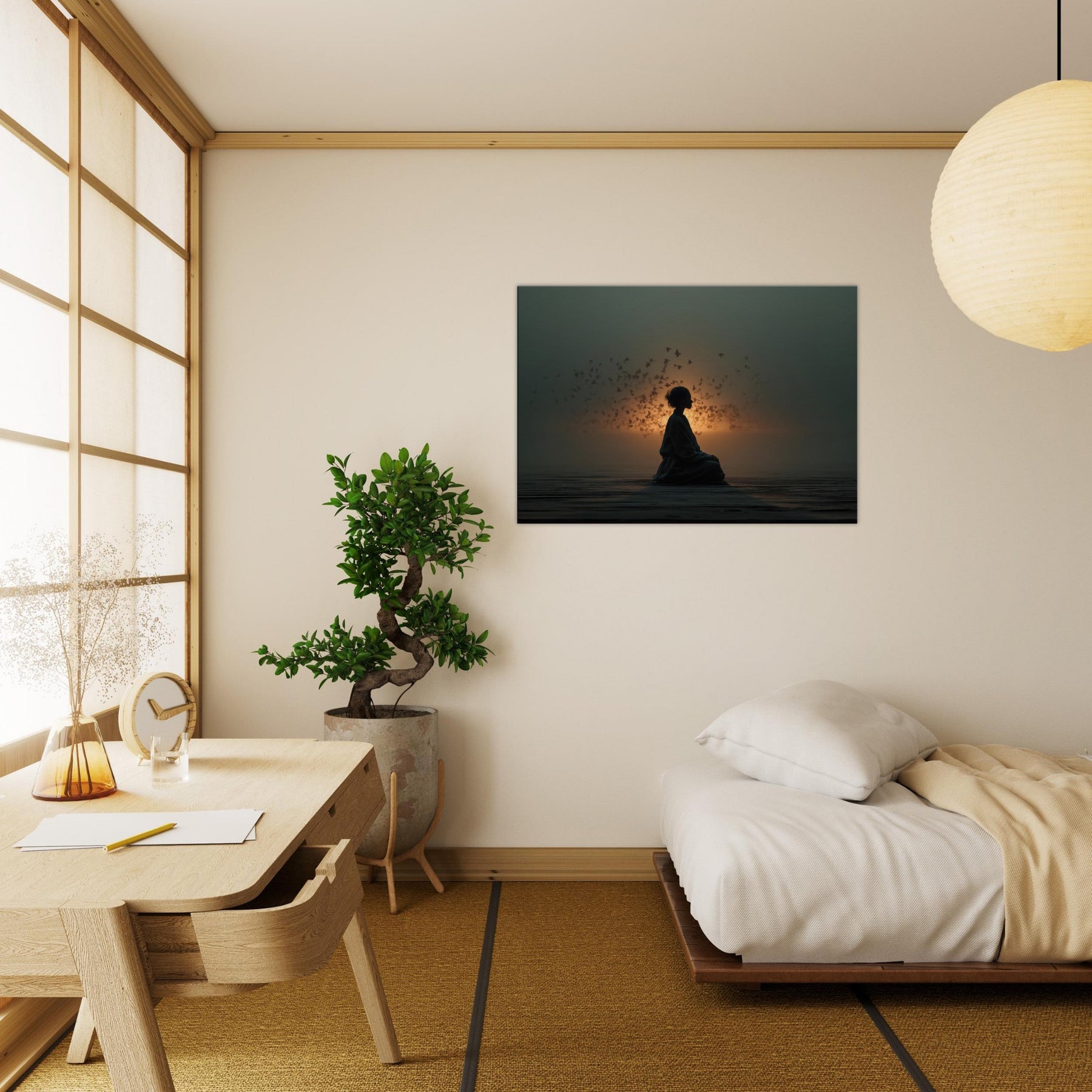 In the hush between day and night, Yoga Lotus Pose becomes a doorway to stillness. The silhouette sits on a quiet horizon, while a flock of birds gathers like breath around a soft halo, hinting at transformation and release. This surreal composition invites a living space to breathe a memory of balance, a focal point that calm and curiosity can share. Perfect for a meditation corner, study, or minimal living room, it evokes presence without shouting.