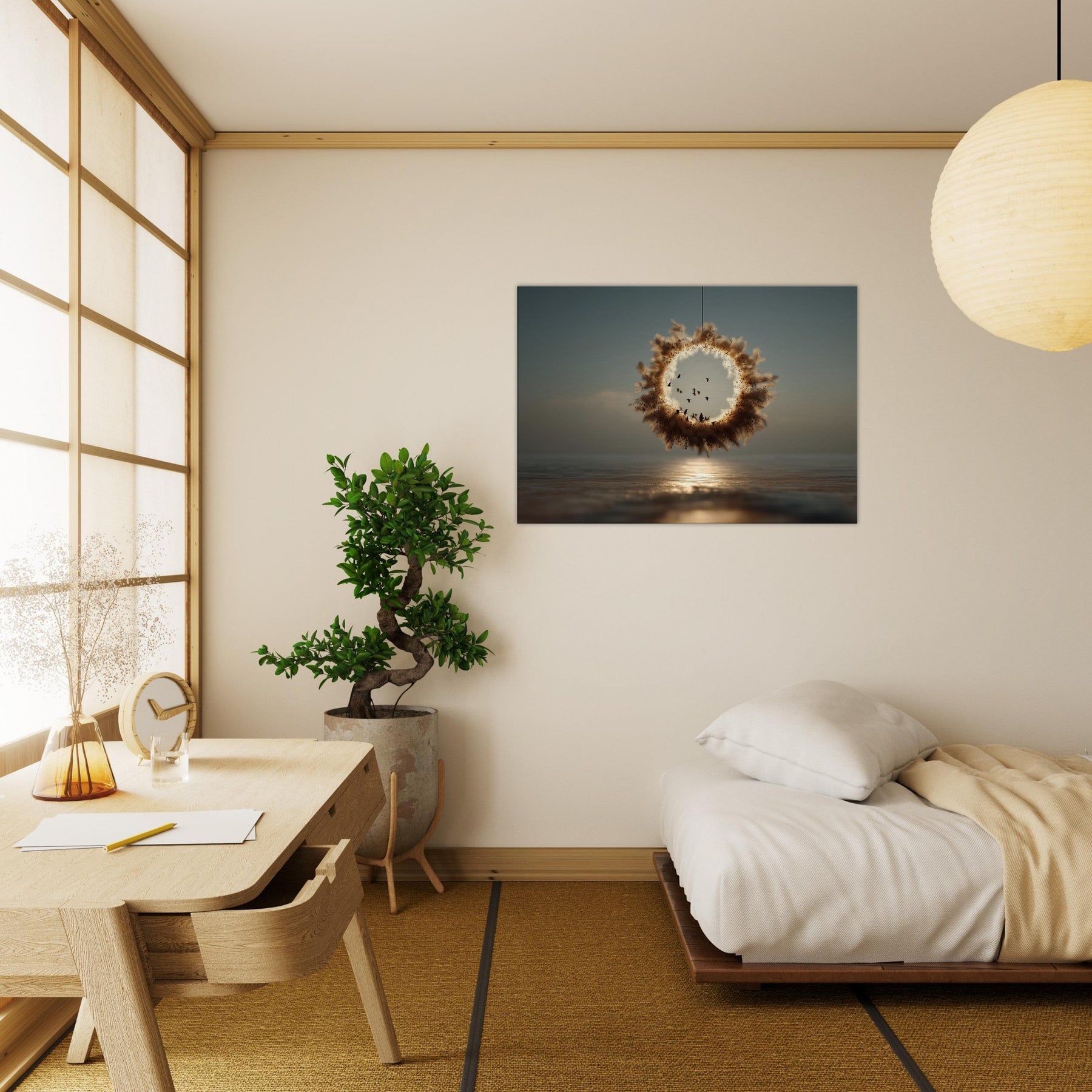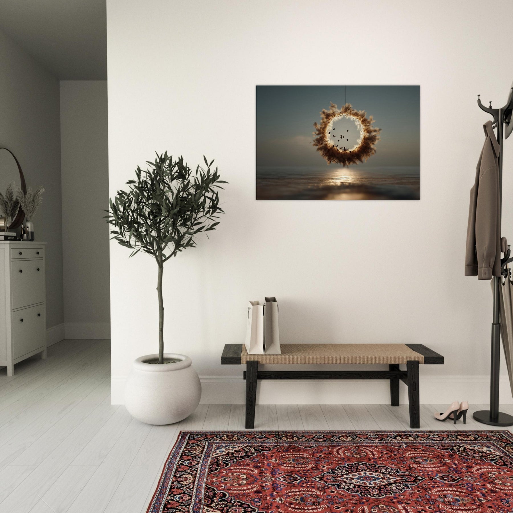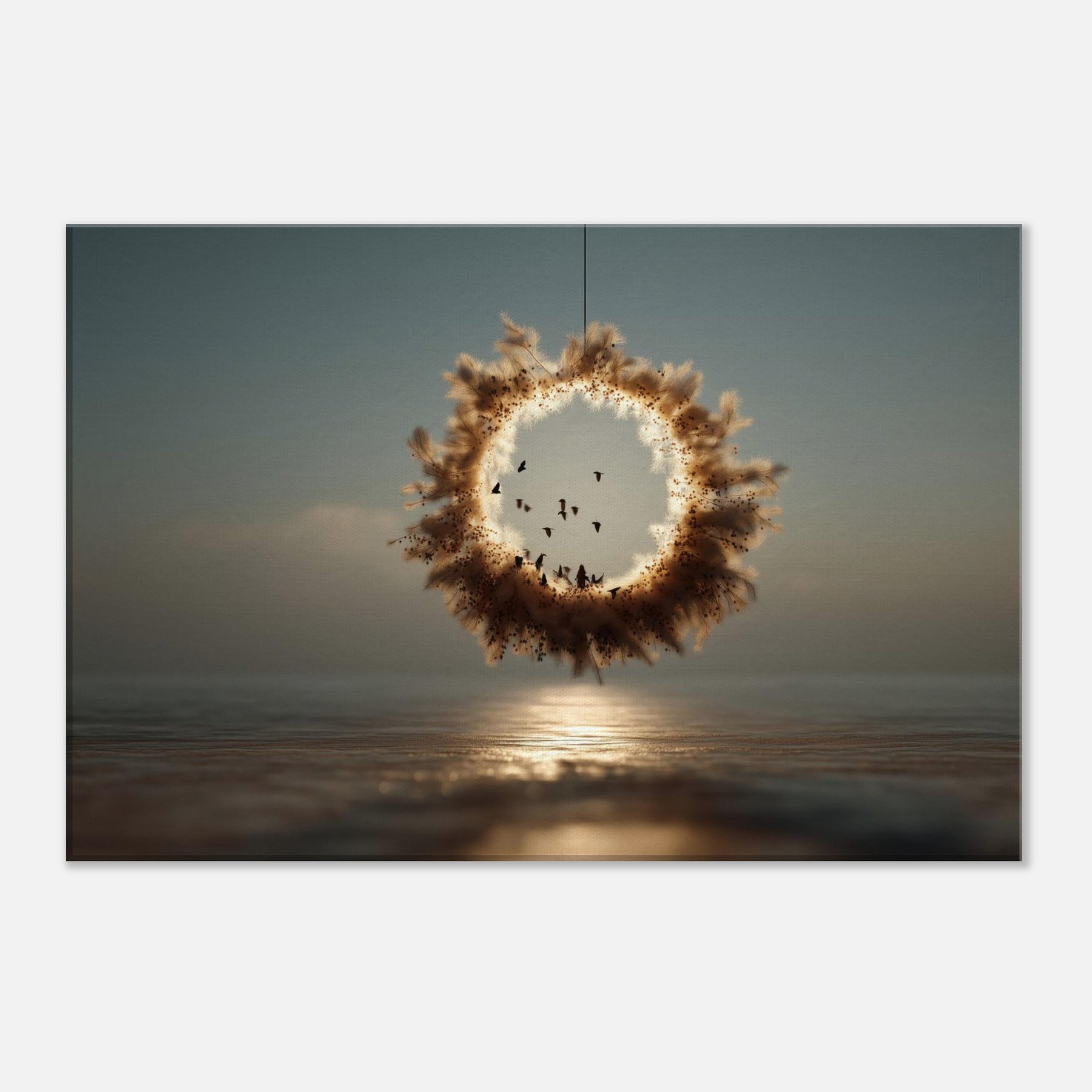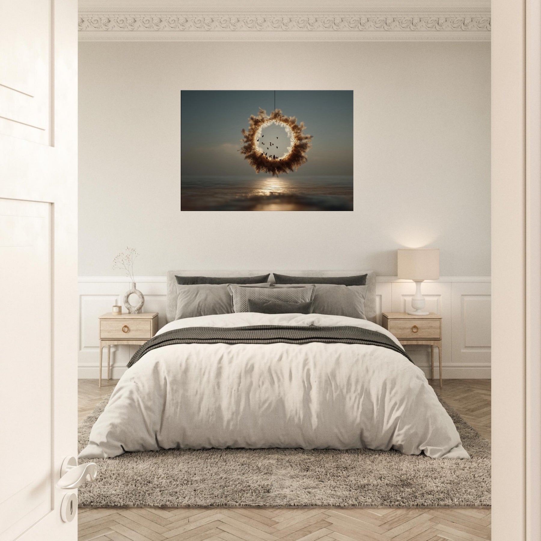 Suspended in a Gossamer ring, Pendulum (Divination) drifts between memory and omen. The soft halo of fluffy seed heads glows with dawn light, while a flock of dark silhouettes circles the center, turning reassurance into mystery. The surreal composition invites quiet reflection, turning a living room into a sanctuary where time slows and intuition awakens. Hang it where morning warmth and evening shadows meet, and let the piece guide conversations, dreams, and a gentle sense of fate through your space.