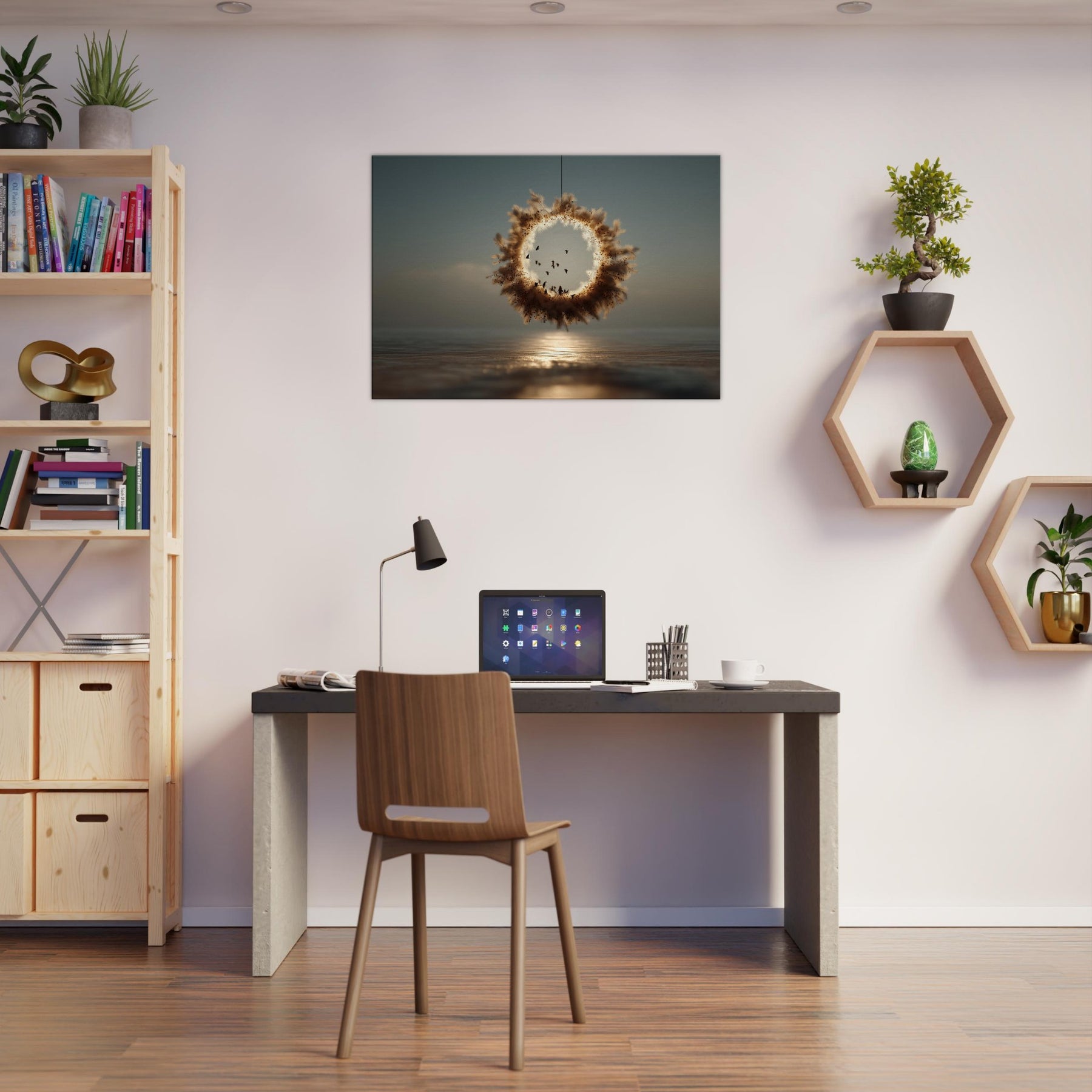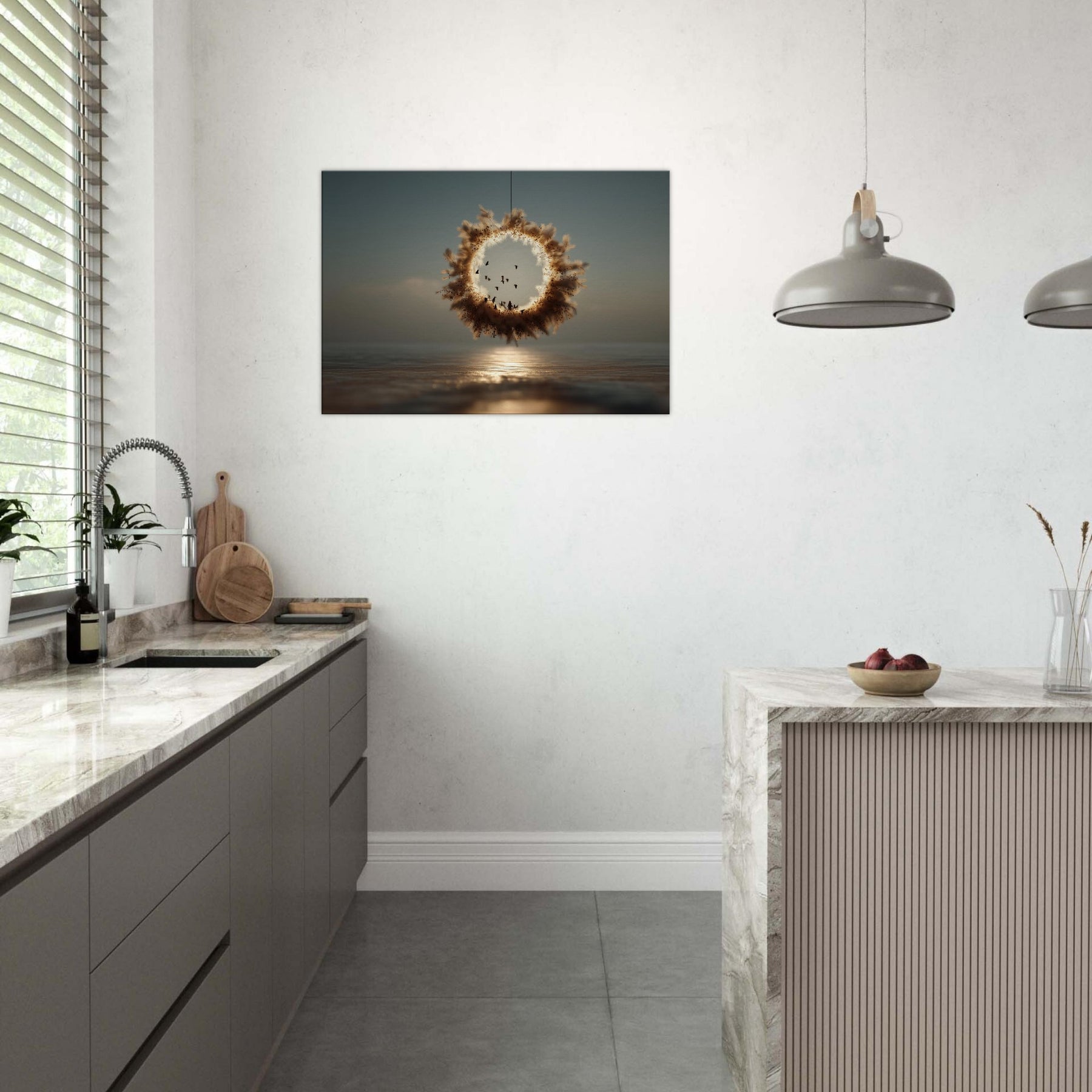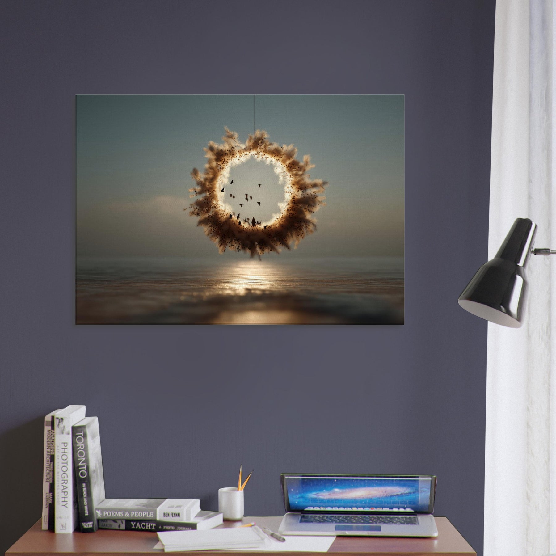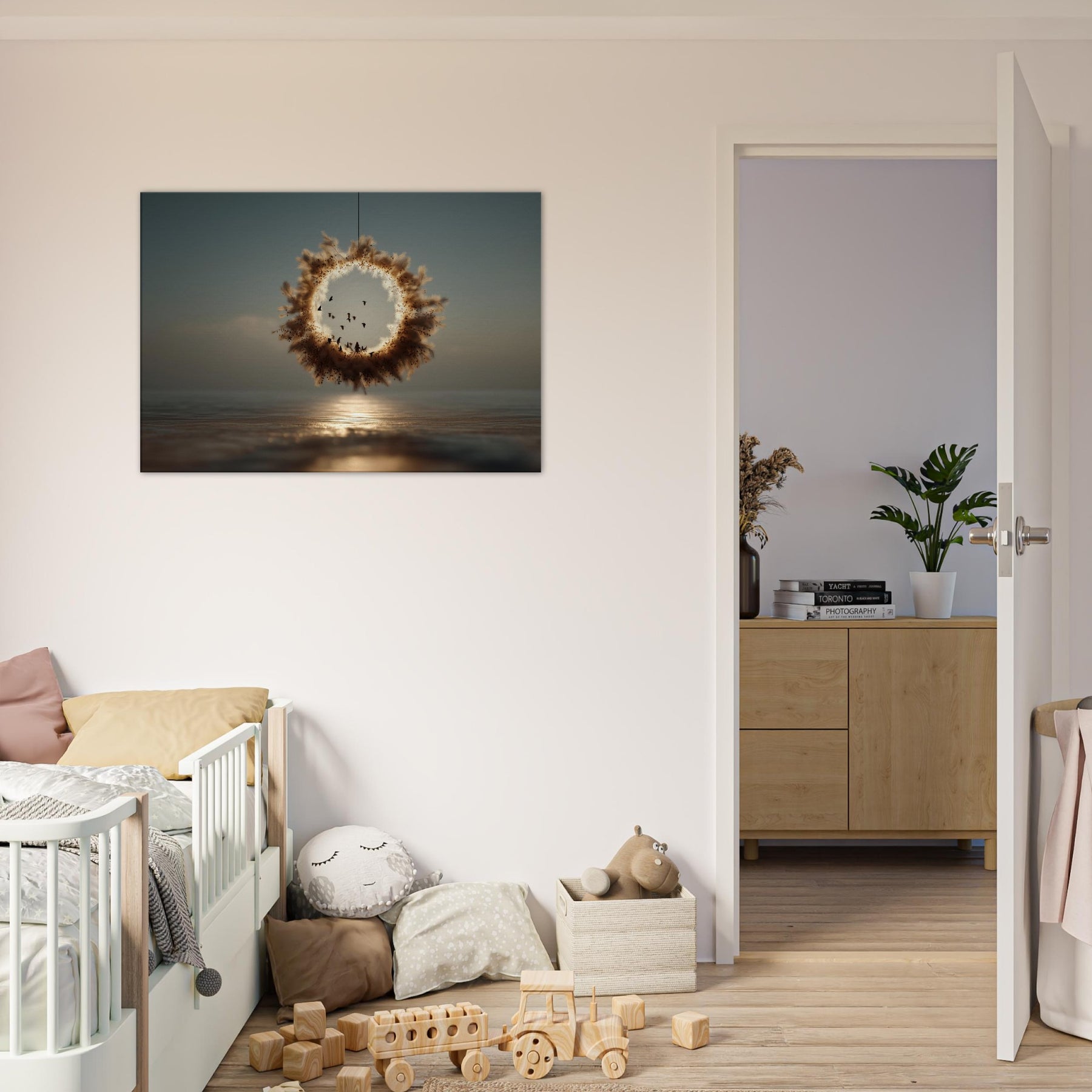 Suspended in a Gossamer ring, Pendulum (Divination) drifts between memory and omen. The soft halo of fluffy seed heads glows with dawn light, while a flock of dark silhouettes circles the center, turning reassurance into mystery. The surreal composition invites quiet reflection, turning a living room into a sanctuary where time slows and intuition awakens. Hang it where morning warmth and evening shadows meet, and let the piece guide conversations, dreams, and a gentle sense of fate through your space.