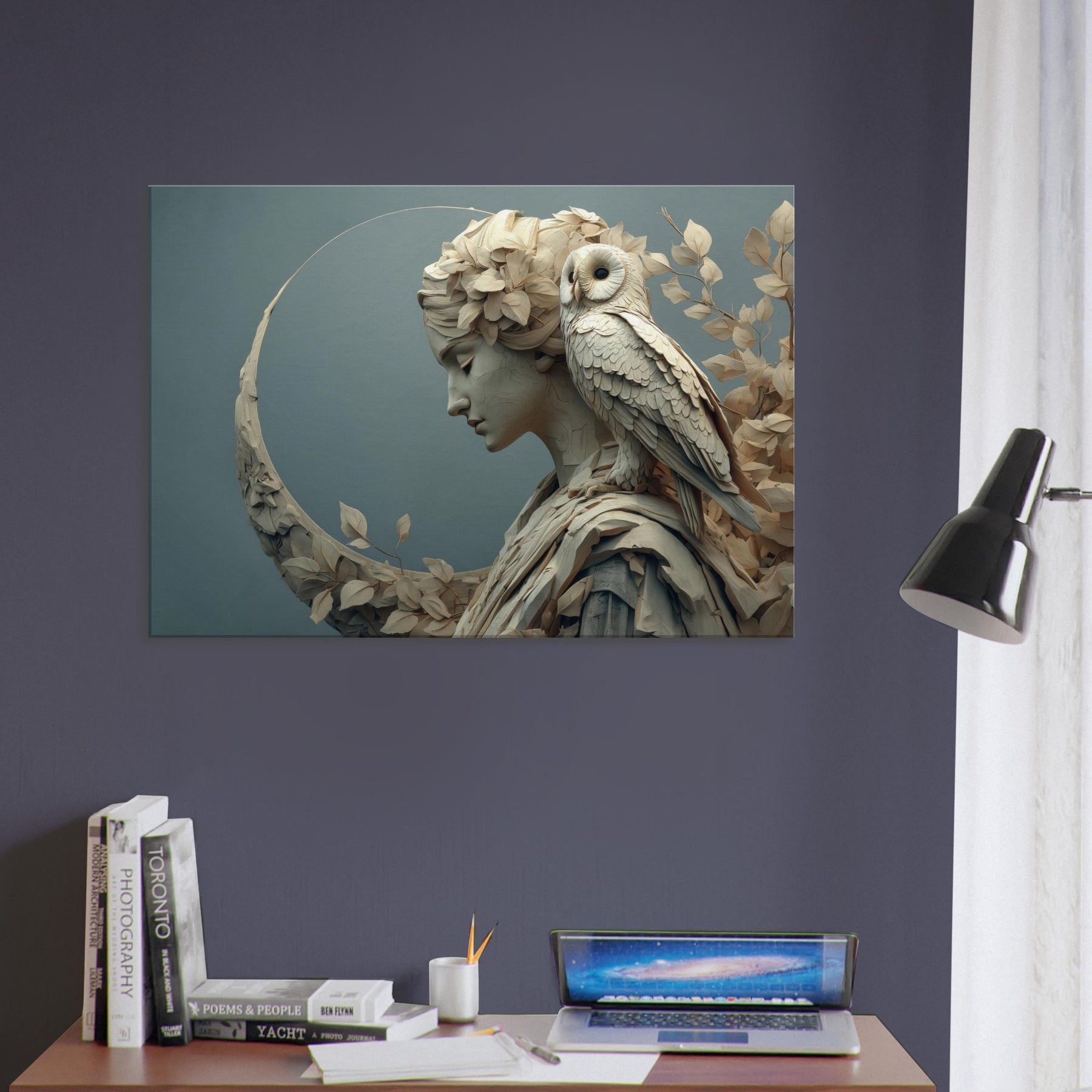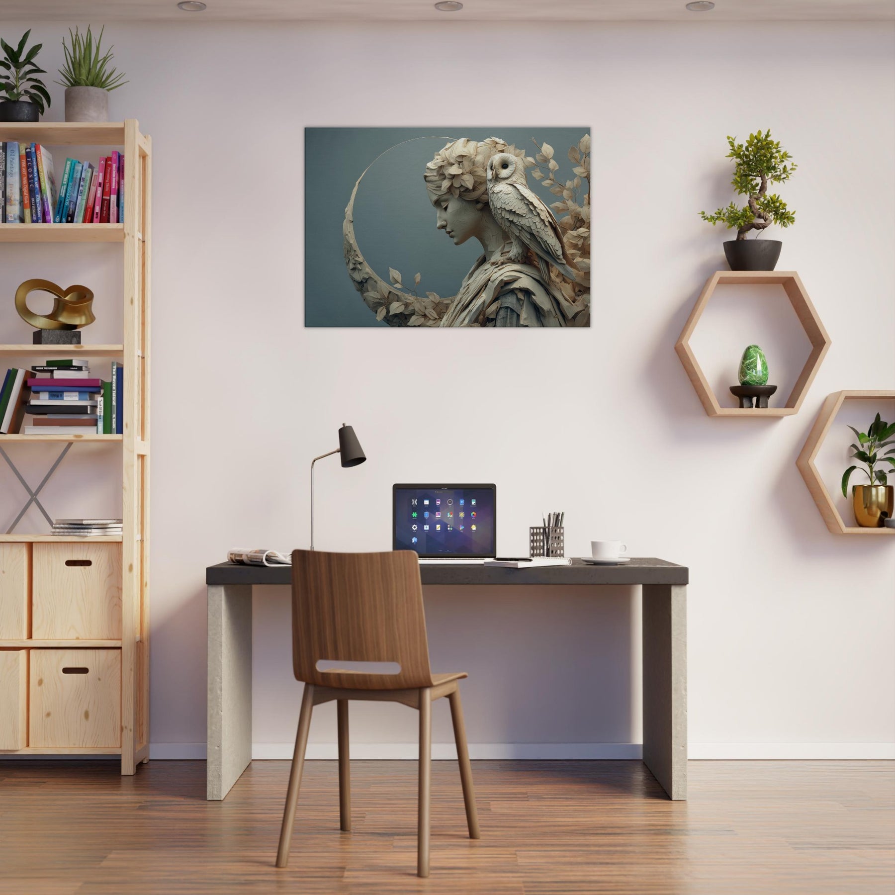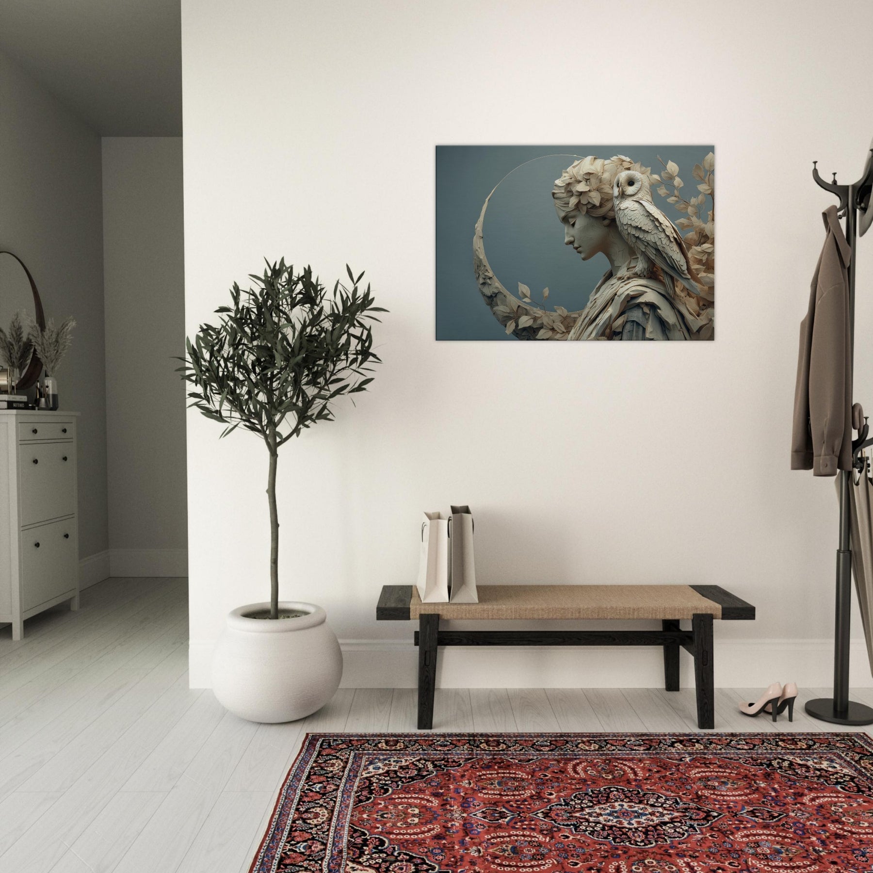 This surreal presents Athena, goddess of wisdom and strategy, as a seated silhouette crowned with a wreath of pale leaves. An owl perches beside her, its feathers etched like dreamt parchment, while a looping halo and winding vines ripple into the air. The composition radiates a calm, cerebral atmosphere cool marble tones, soft textures, and a dreamlike stillness that invites quiet reflection. In your living room or study, it becomes a focal point of mythic grace, elevating space with intellectual poise and timeless elegance.