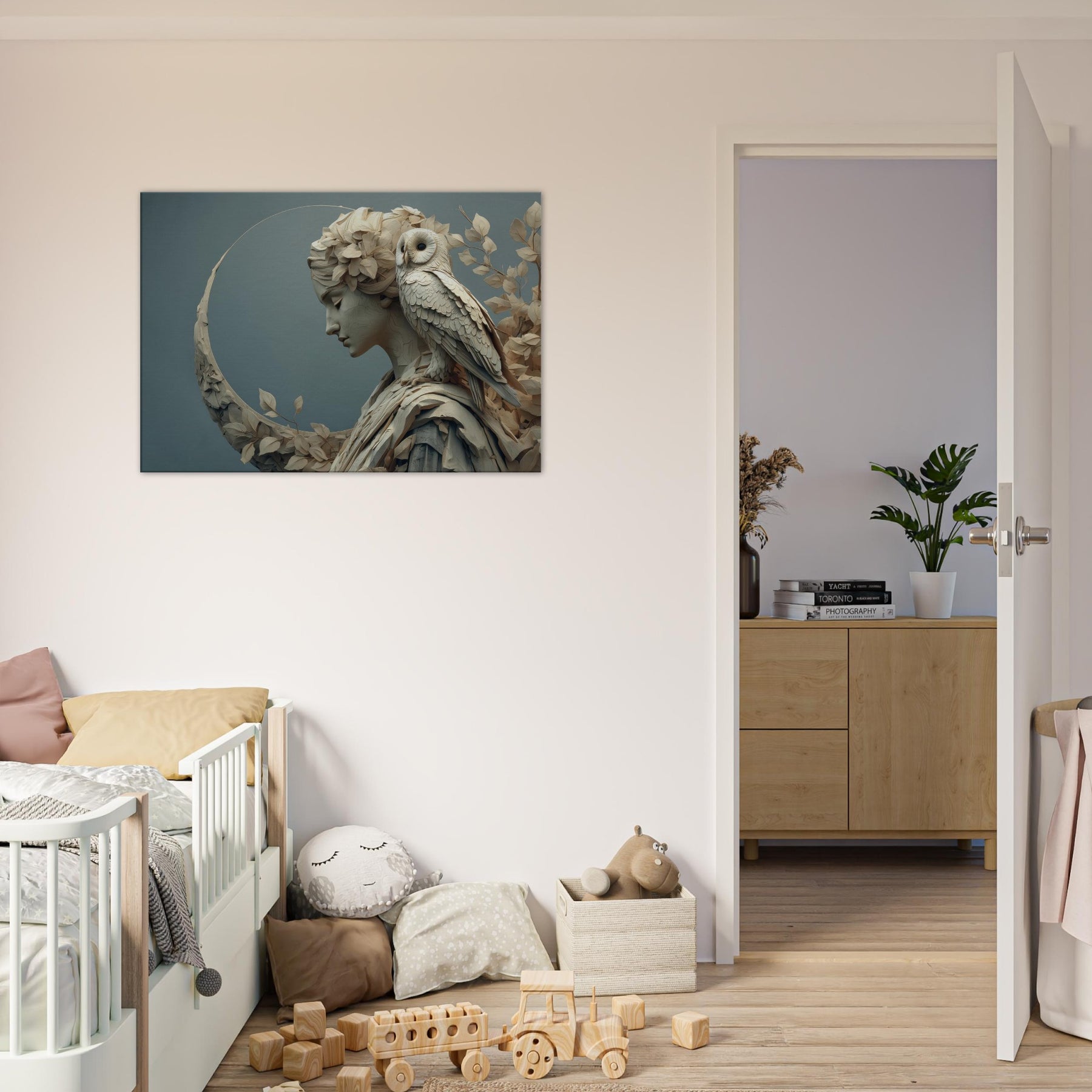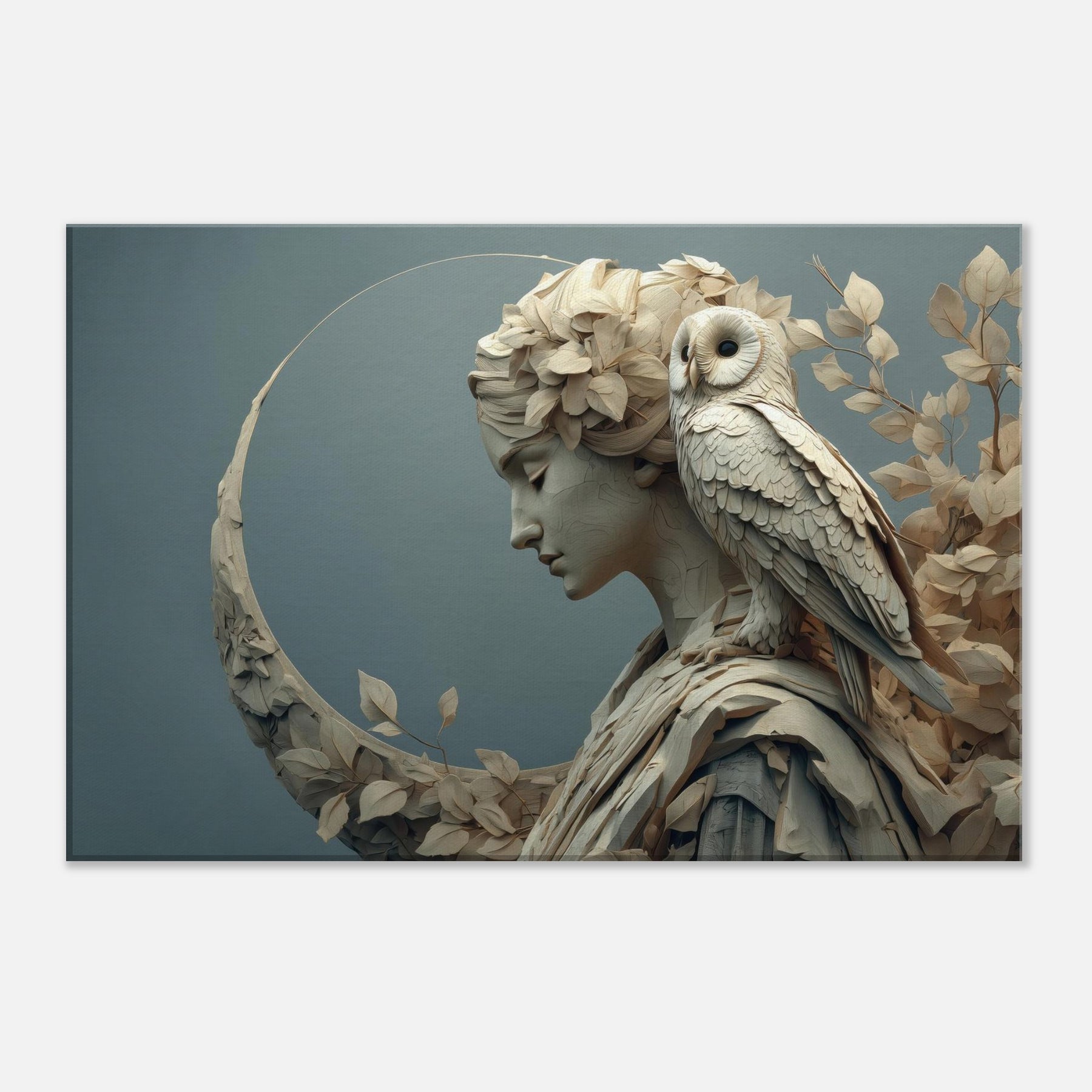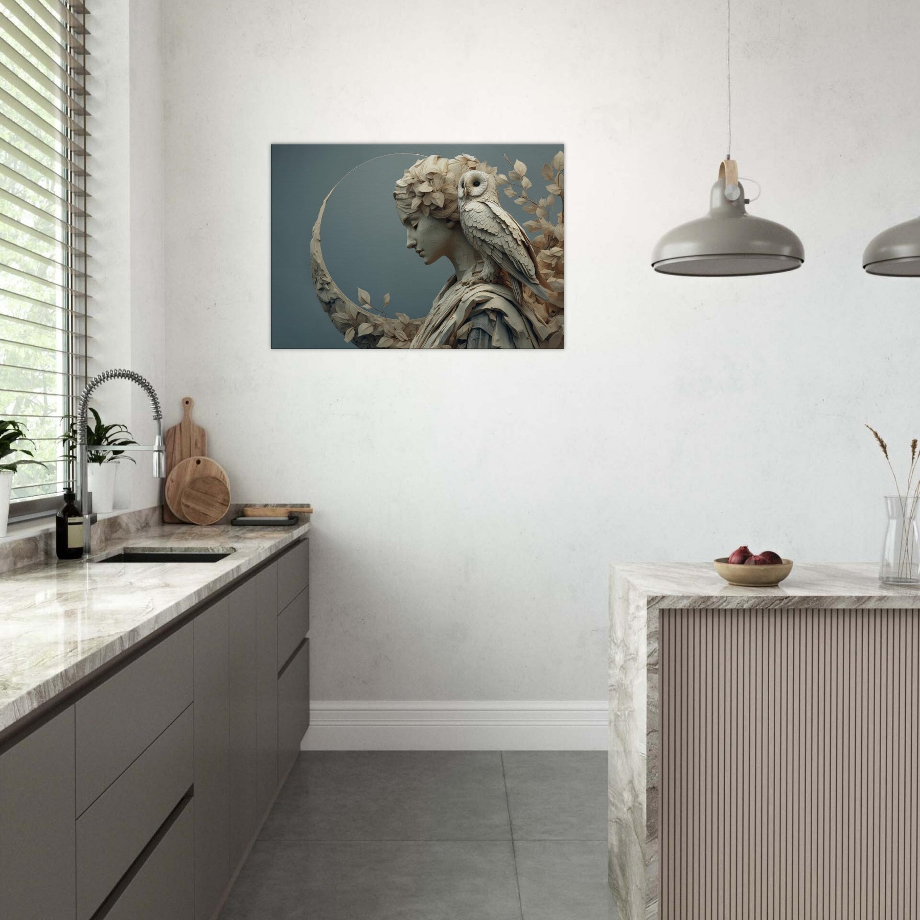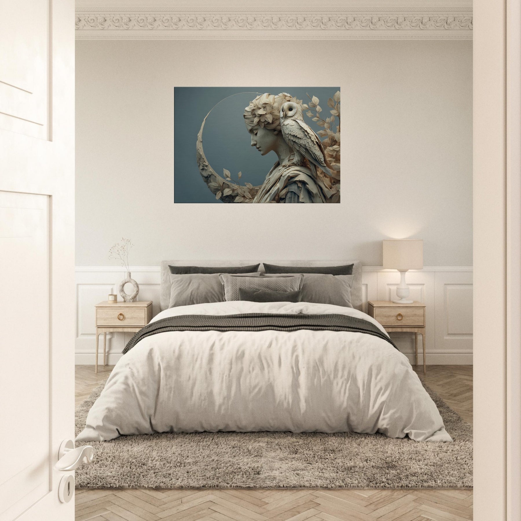 This surreal presents Athena, goddess of wisdom and strategy, as a seated silhouette crowned with a wreath of pale leaves. An owl perches beside her, its feathers etched like dreamt parchment, while a looping halo and winding vines ripple into the air. The composition radiates a calm, cerebral atmosphere cool marble tones, soft textures, and a dreamlike stillness that invites quiet reflection. In your living room or study, it becomes a focal point of mythic grace, elevating space with intellectual poise and timeless elegance.