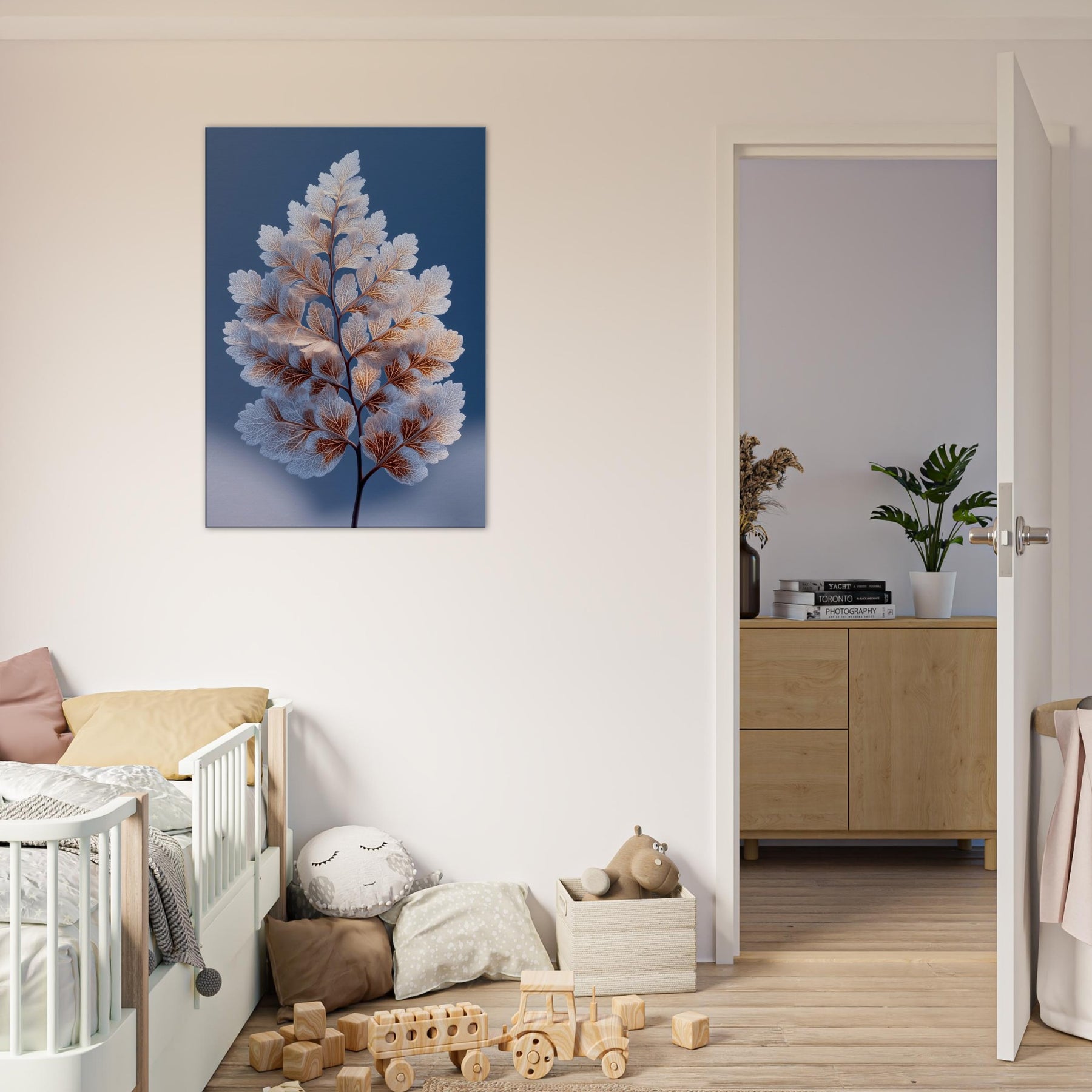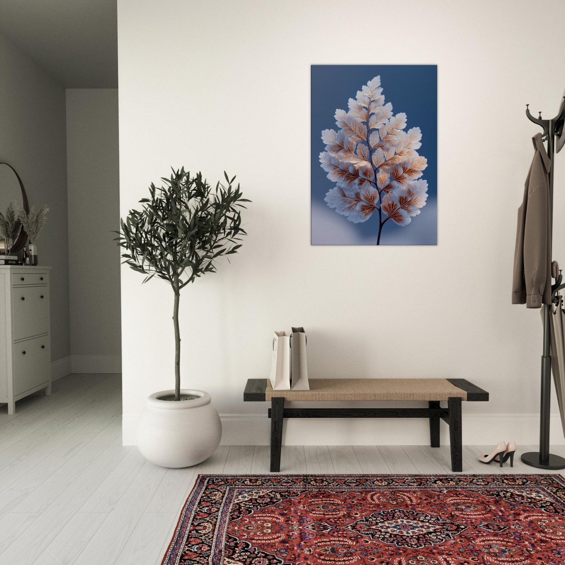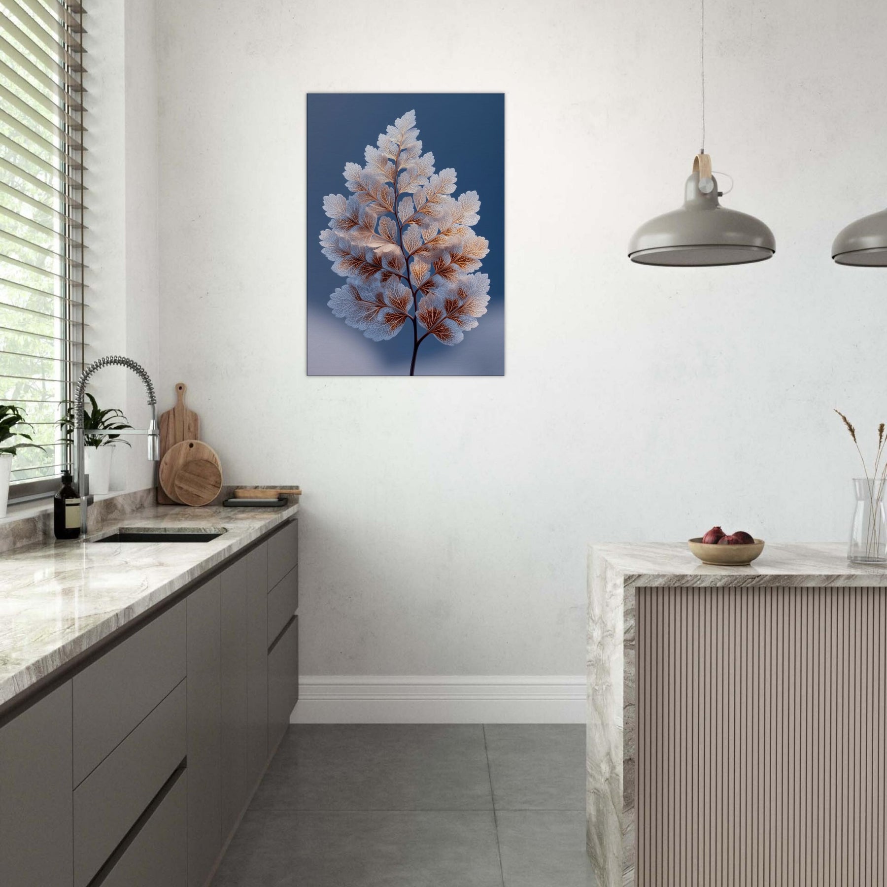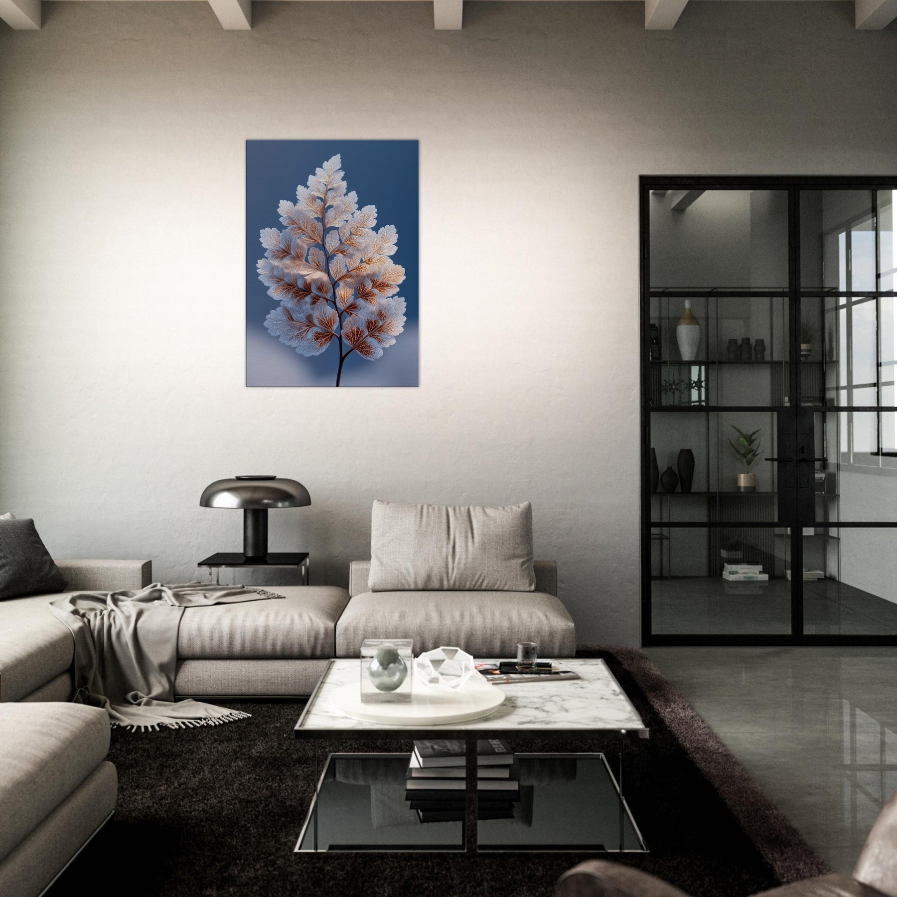 Let the frost kissed fern rise against a velvet dusk of blue, where each vein glows like a quiet ember. This surreal study of nature bends time, turning leaves into lanterns that drift with whispered gravity. The mood is serene and haunting, inviting a meditative pause and a breath of winter light into any living space. Place it above a seating area or entryway to foster calm, curiosity, and a luminous conversation between earth, dream, and home.