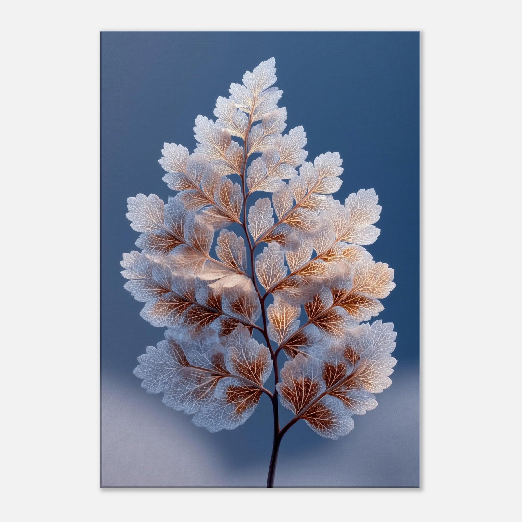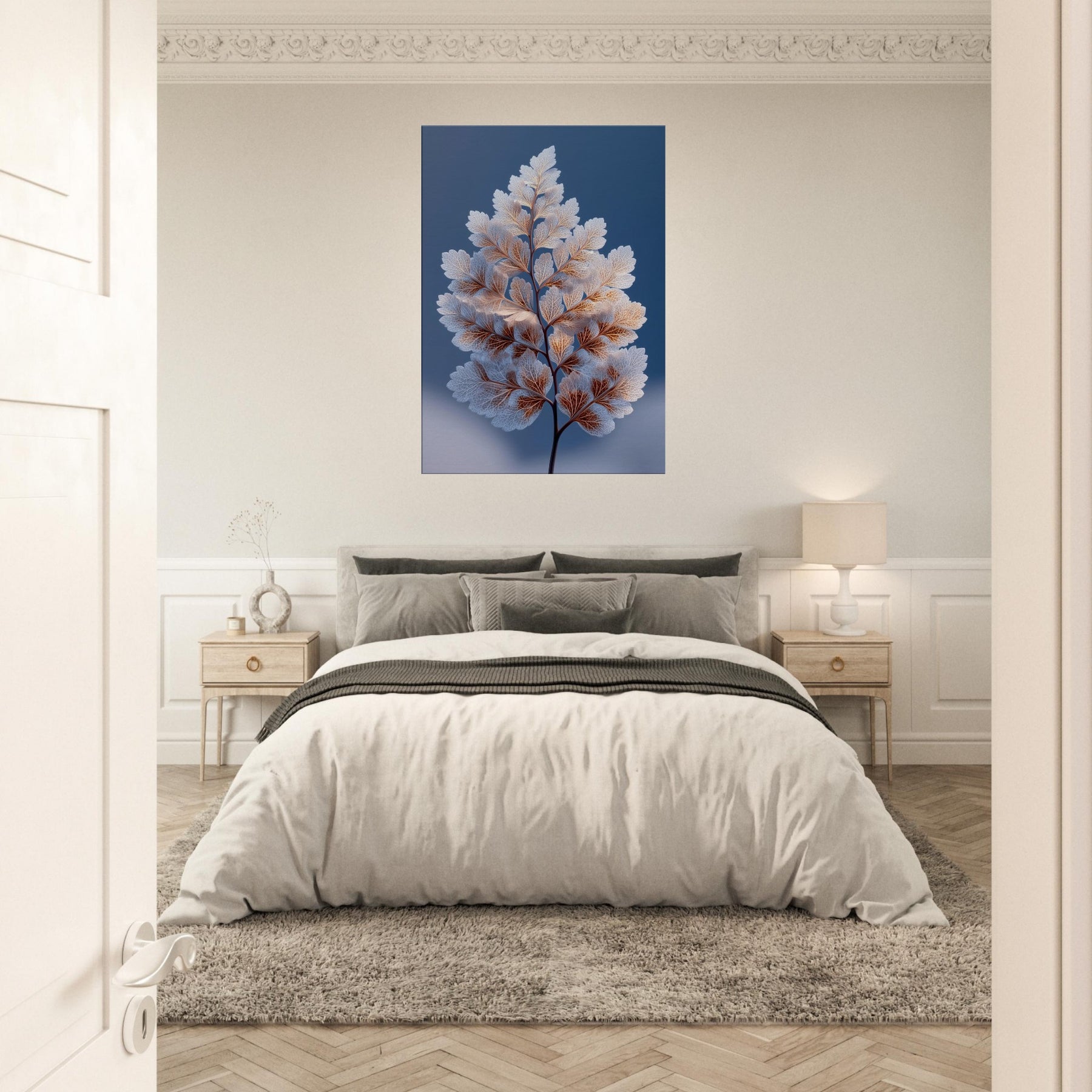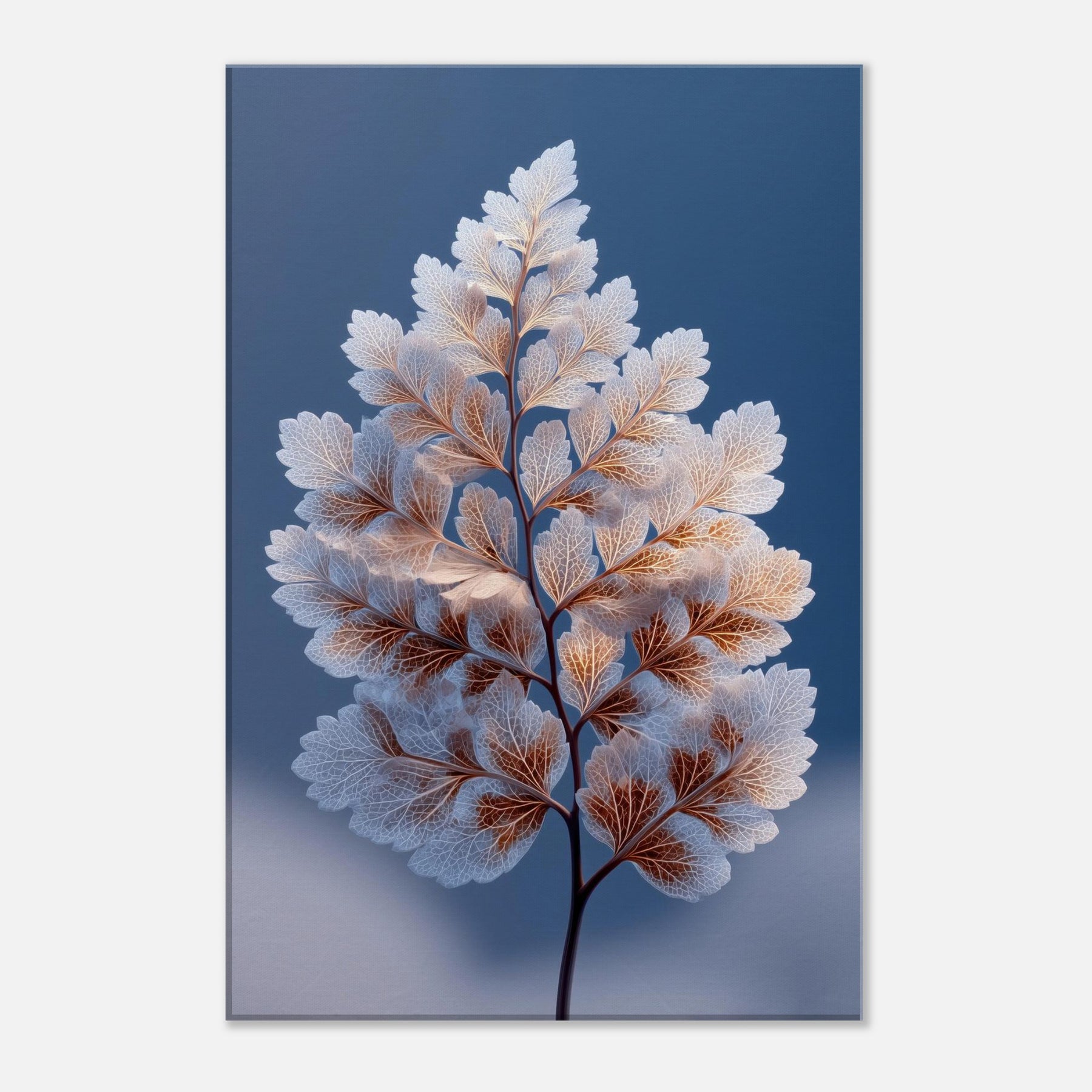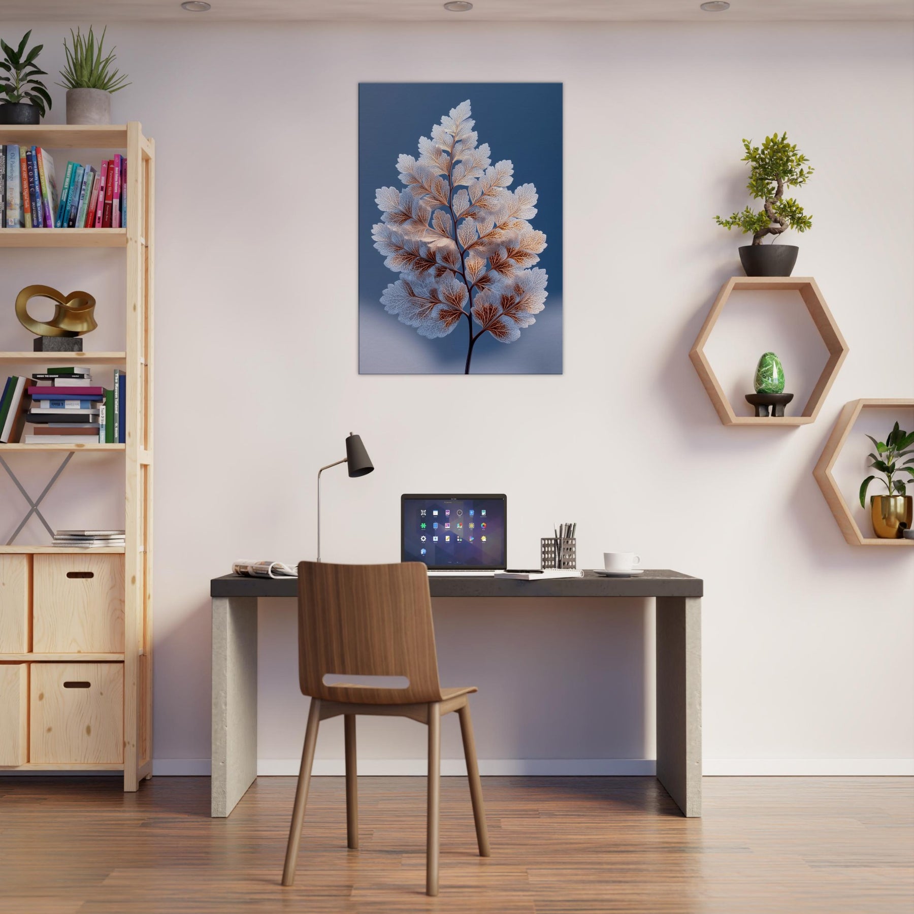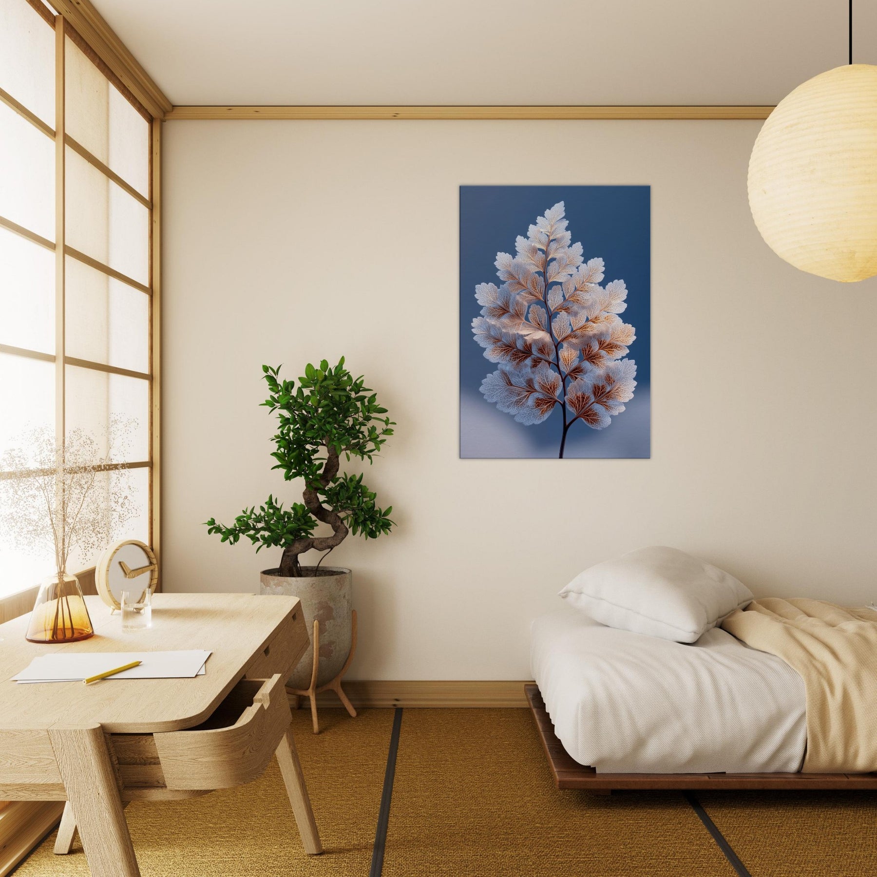 Let the frost kissed fern rise against a velvet dusk of blue, where each vein glows like a quiet ember. This surreal study of nature bends time, turning leaves into lanterns that drift with whispered gravity. The mood is serene and haunting, inviting a meditative pause and a breath of winter light into any living space. Place it above a seating area or entryway to foster calm, curiosity, and a luminous conversation between earth, dream, and home.