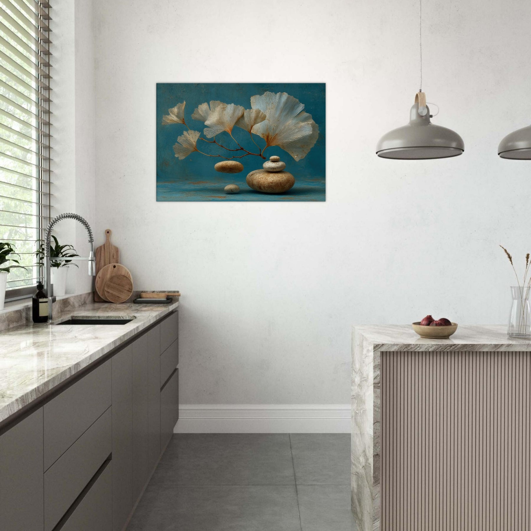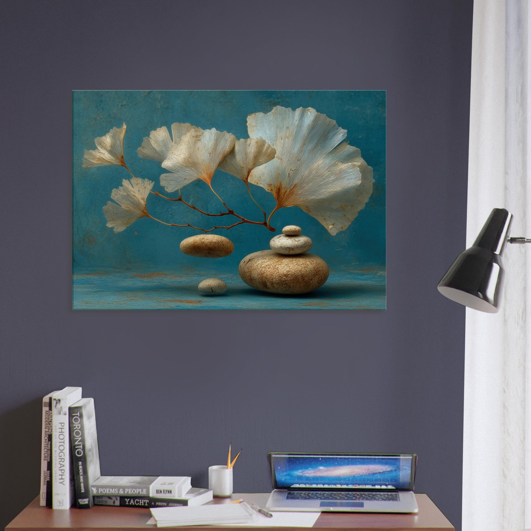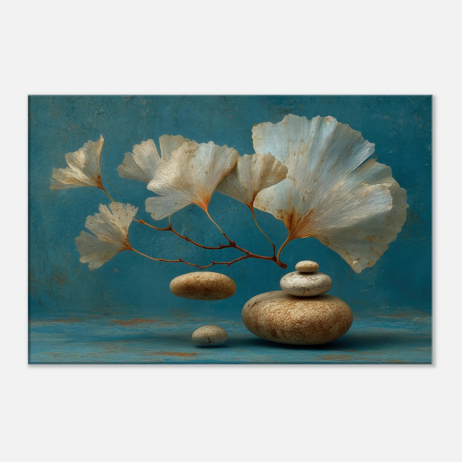 Let the Ginkgo Leaf drift into your living space as if suspended between memory and dream. This surreal composition blends airy, fan shaped leaves with smooth river stones, inviting a calm, meditative breath into the room. The cool teal backdrop and the earthy texture of the stones create a sense of balanced stillness, turning a wall into a quiet harbor. Hang it where light lingers the artwork will shimmer, guiding moments of pause and gentle contemplation.