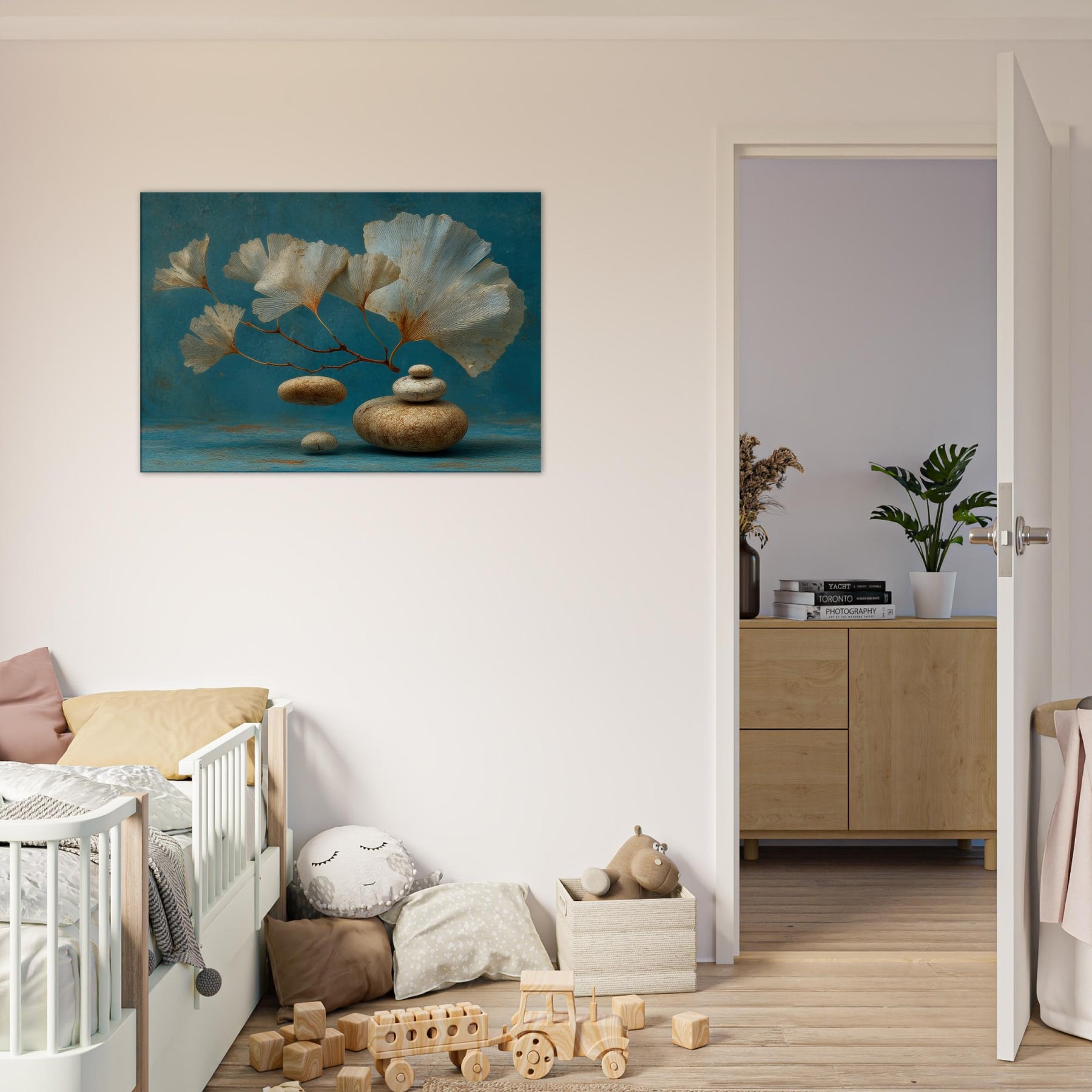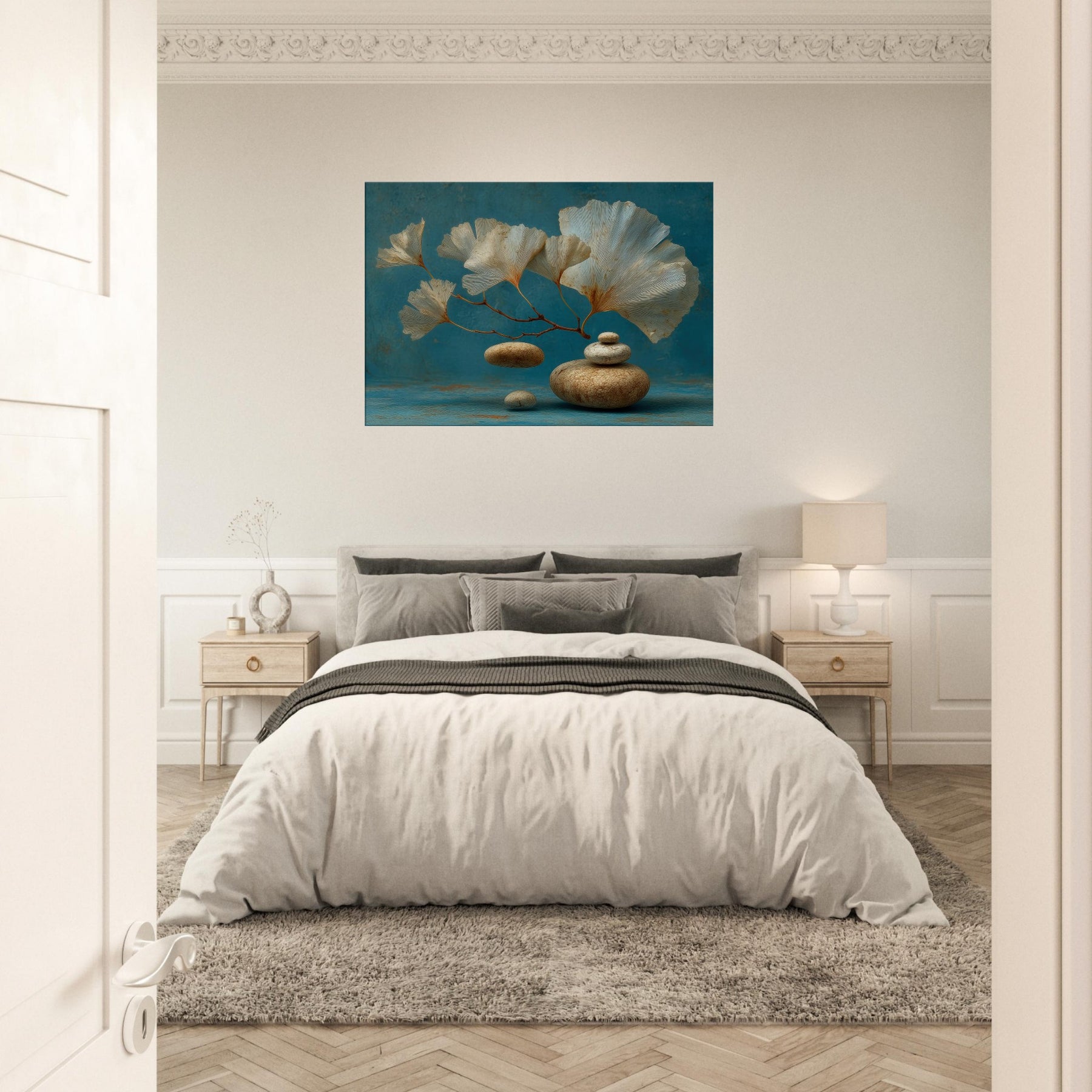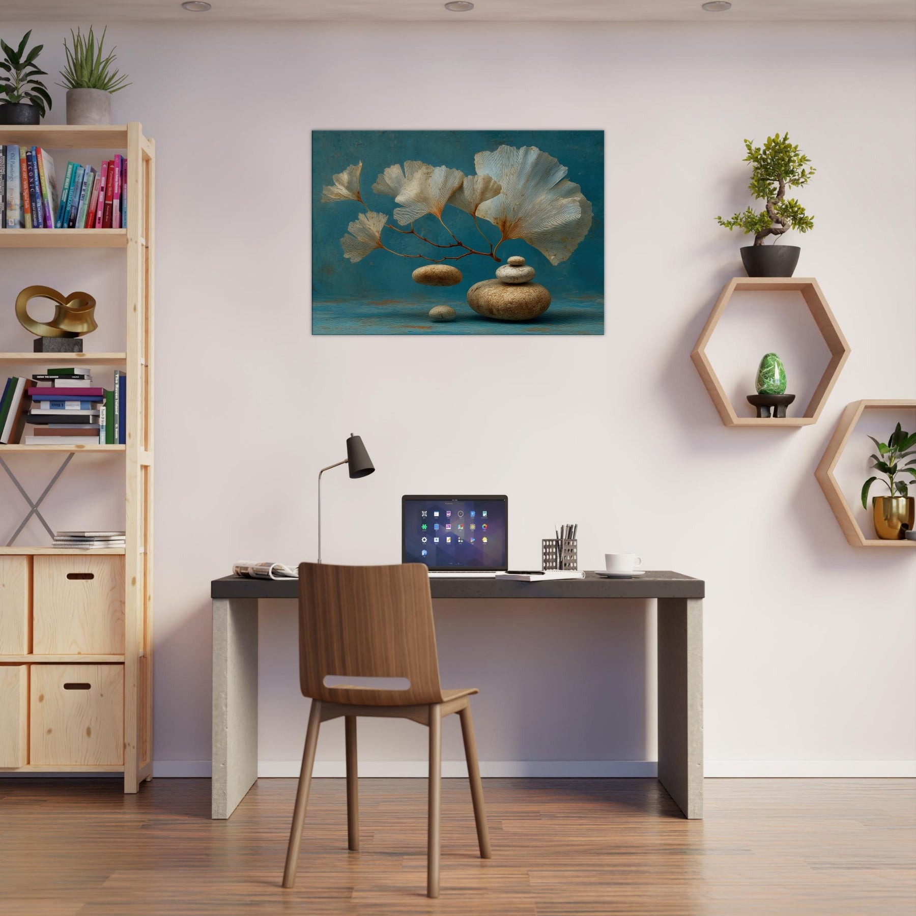 Let the Ginkgo Leaf drift into your living space as if suspended between memory and dream. This surreal composition blends airy, fan shaped leaves with smooth river stones, inviting a calm, meditative breath into the room. The cool teal backdrop and the earthy texture of the stones create a sense of balanced stillness, turning a wall into a quiet harbor. Hang it where light lingers the artwork will shimmer, guiding moments of pause and gentle contemplation.