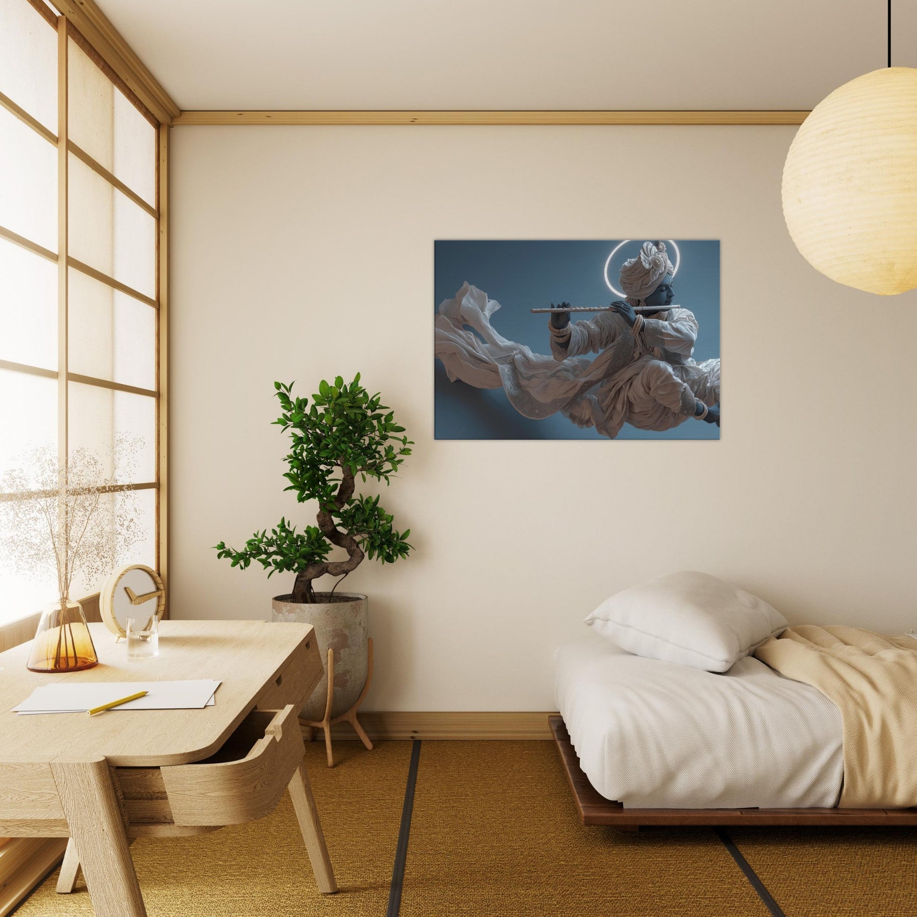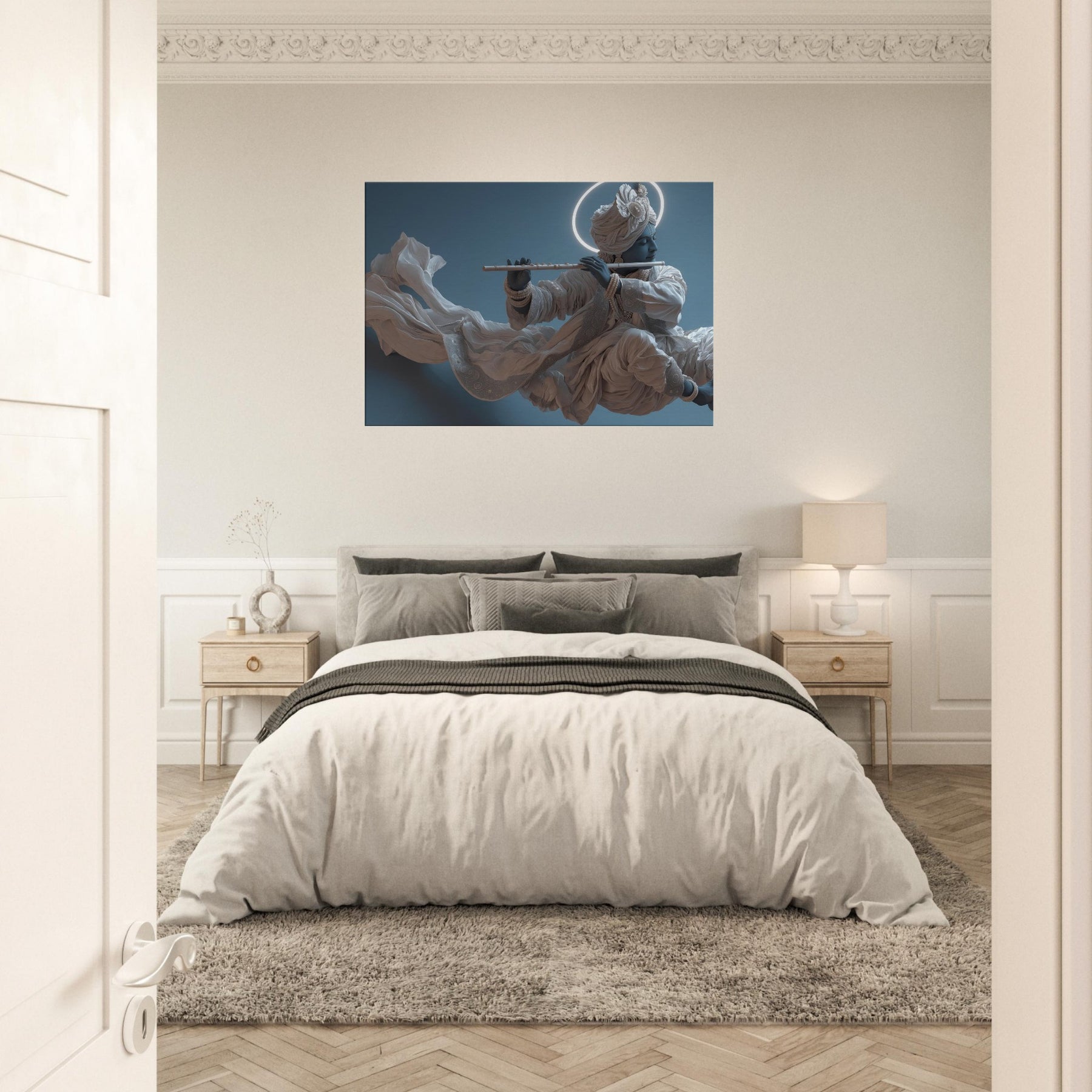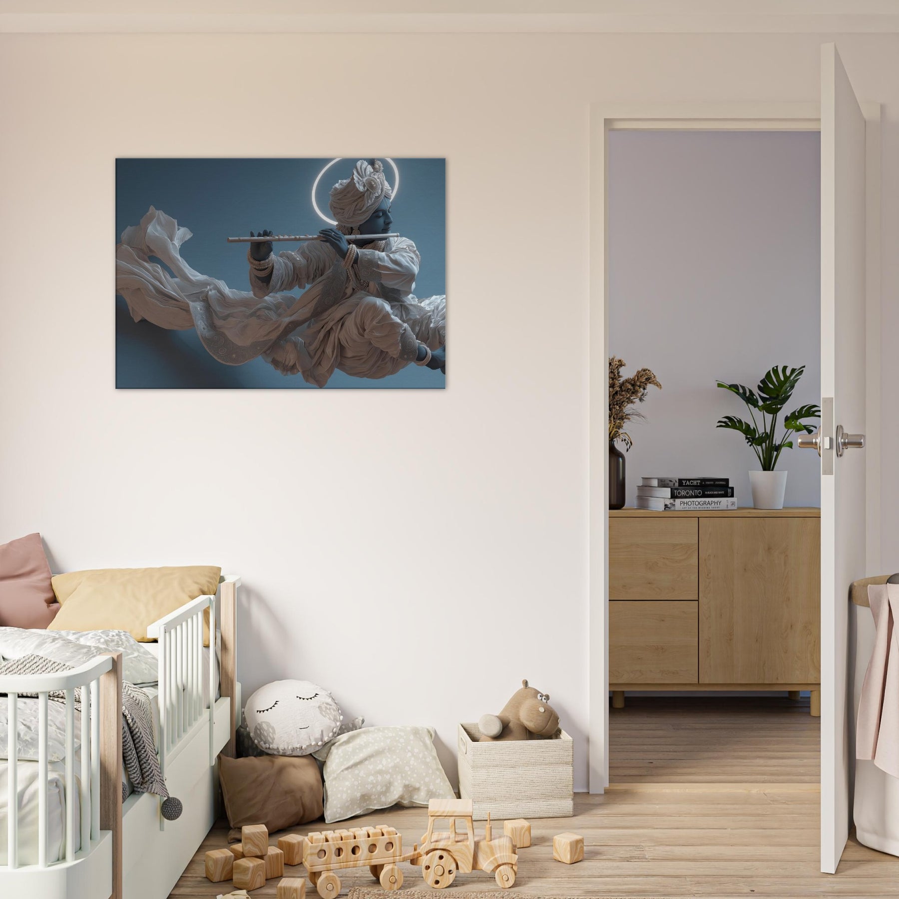 Krishna with Flute takes flight through a dreamscape where fabric garments billow like clouds and a luminous halo circles the head. The surreal composition invites breath and stillness into the room, turning walls into a sanctuary of soundless music. This mystical tableau blends myth and modernity, making a focal point that calms a living space with cool tones, tactile textures, and a whisper of fragrance from imagined gardens. It feels both ancient and new, a portal to contemplation and wonder.