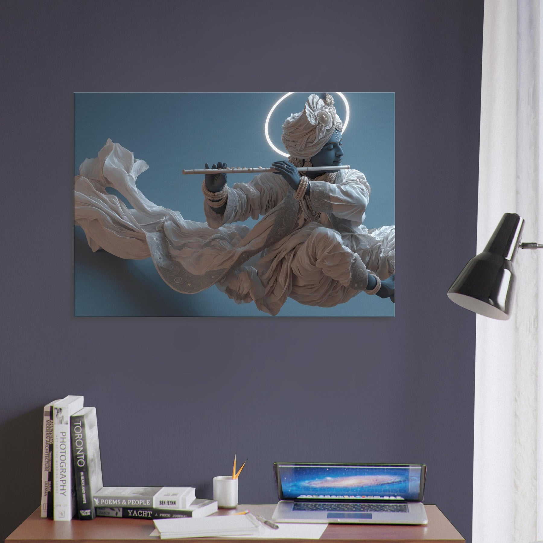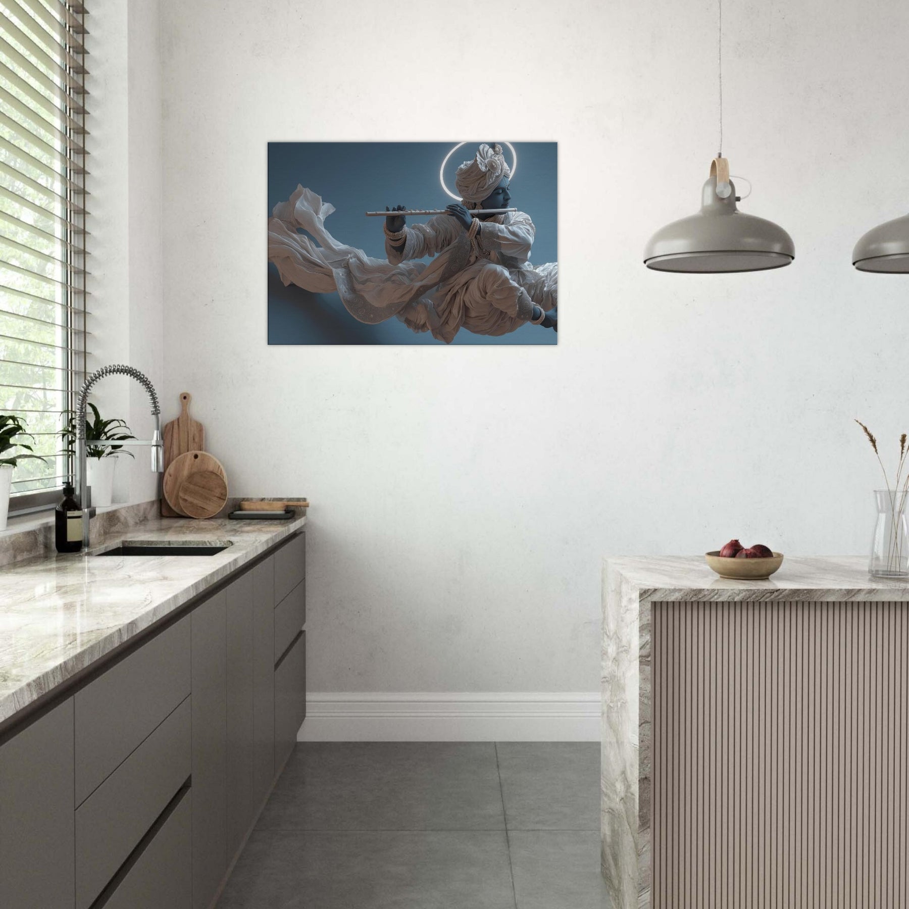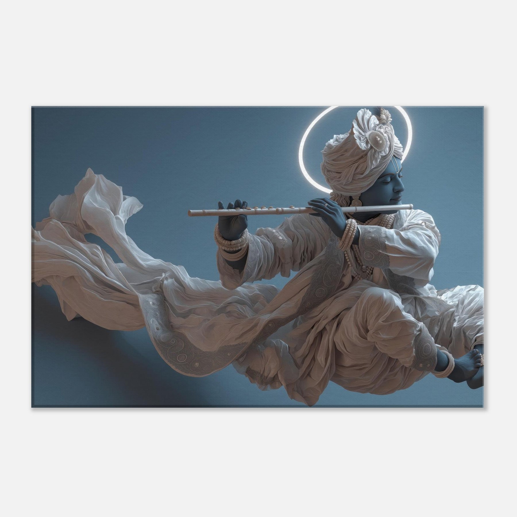 Krishna with Flute takes flight through a dreamscape where fabric garments billow like clouds and a luminous halo circles the head. The surreal composition invites breath and stillness into the room, turning walls into a sanctuary of soundless music. This mystical tableau blends myth and modernity, making a focal point that calms a living space with cool tones, tactile textures, and a whisper of fragrance from imagined gardens. It feels both ancient and new, a portal to contemplation and wonder.
