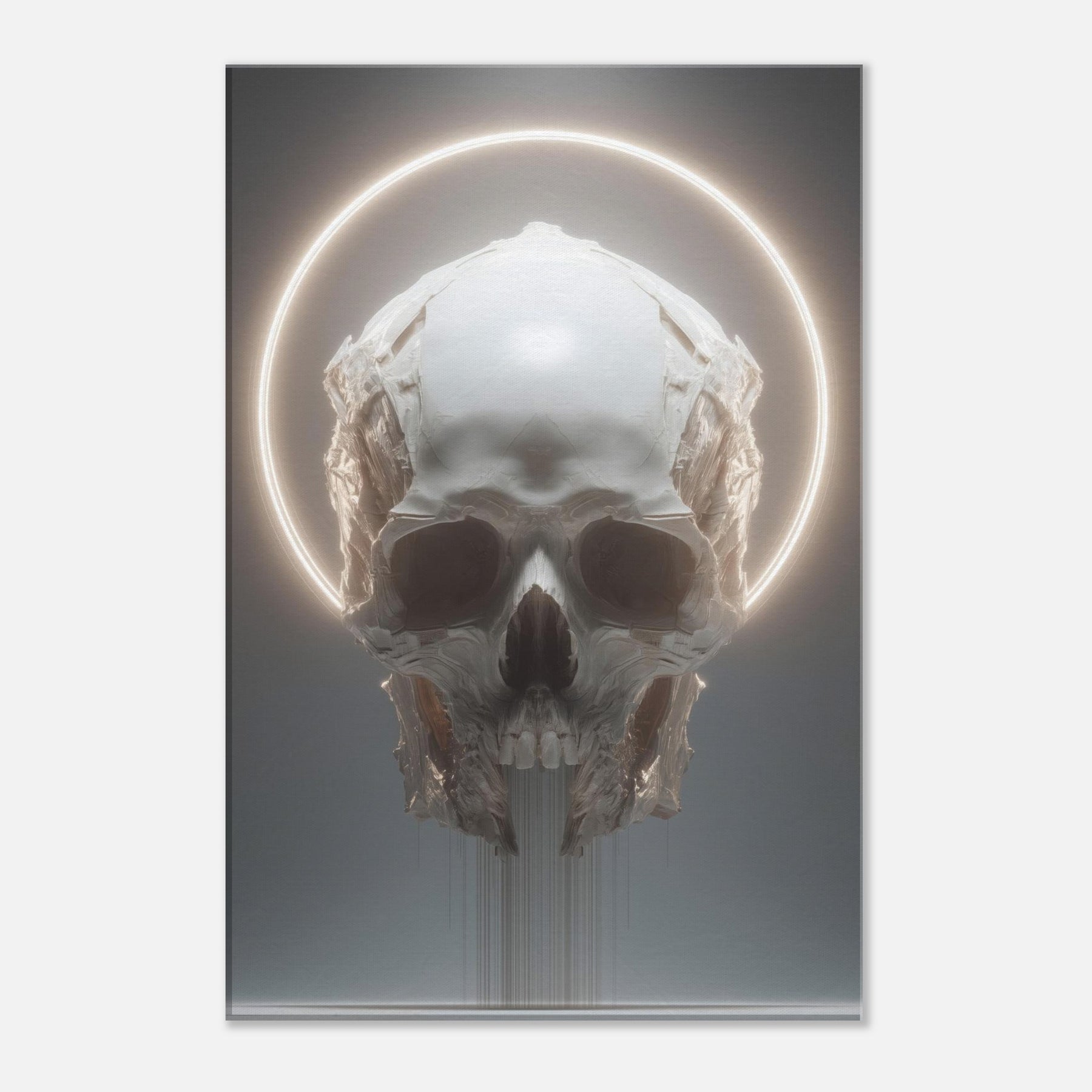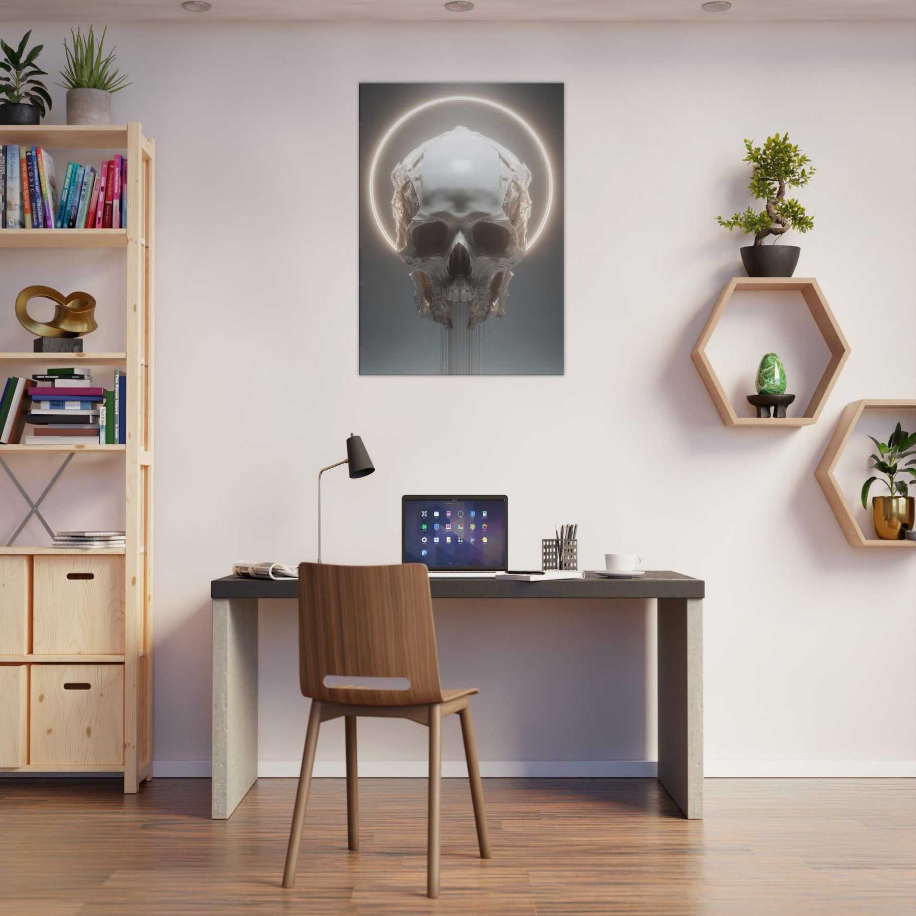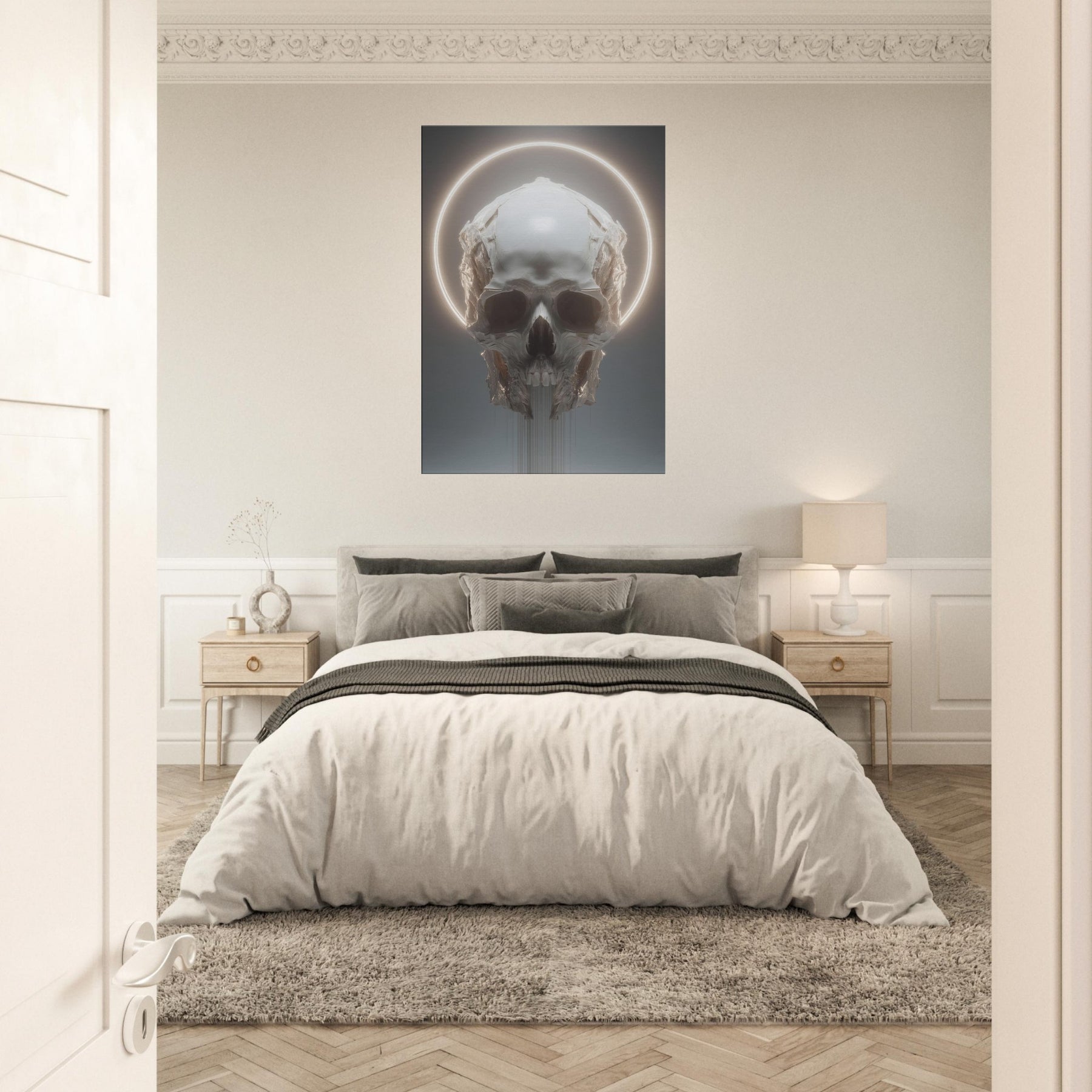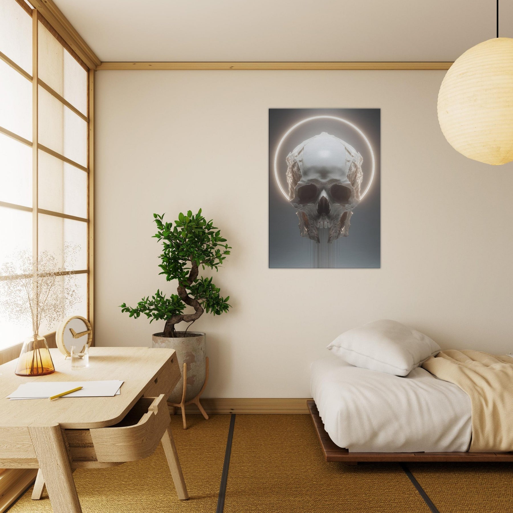 Gifted with a quiet gravity, Mystical Skull rises from a mist of memory and moonlight, bathed in a soft halo that glows like a night blooming comet. This surreal centerpiece invites contemplation rather than confrontation, turning a living room into a hushed sanctuary of wonder. The porcelain whiteness, the drifting lines, and the faint, architectural drift below the jaw create a dreamscape that feels both ancient and immediate. Hang it where you want conversation to drift, and let the atmosphere breathe with you.