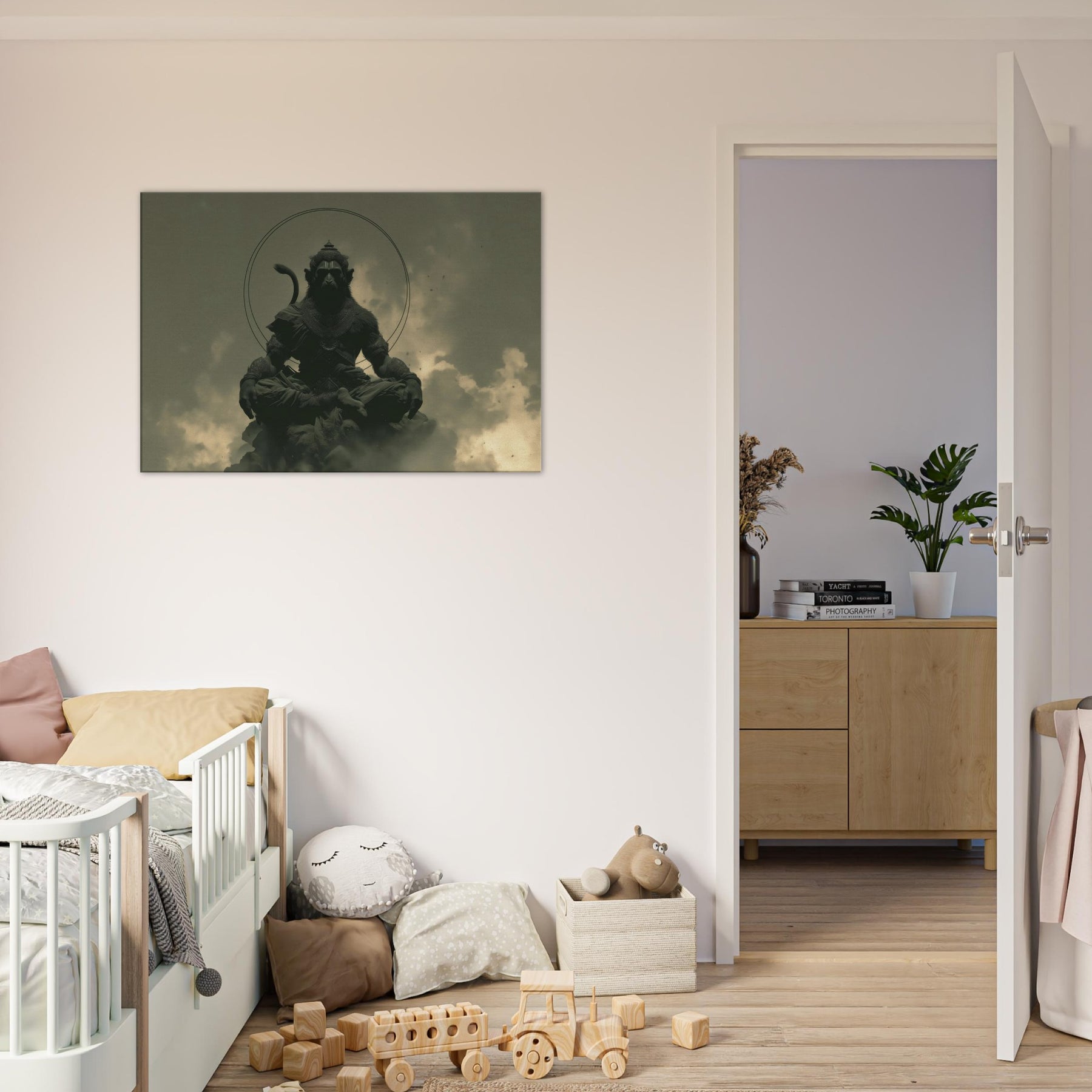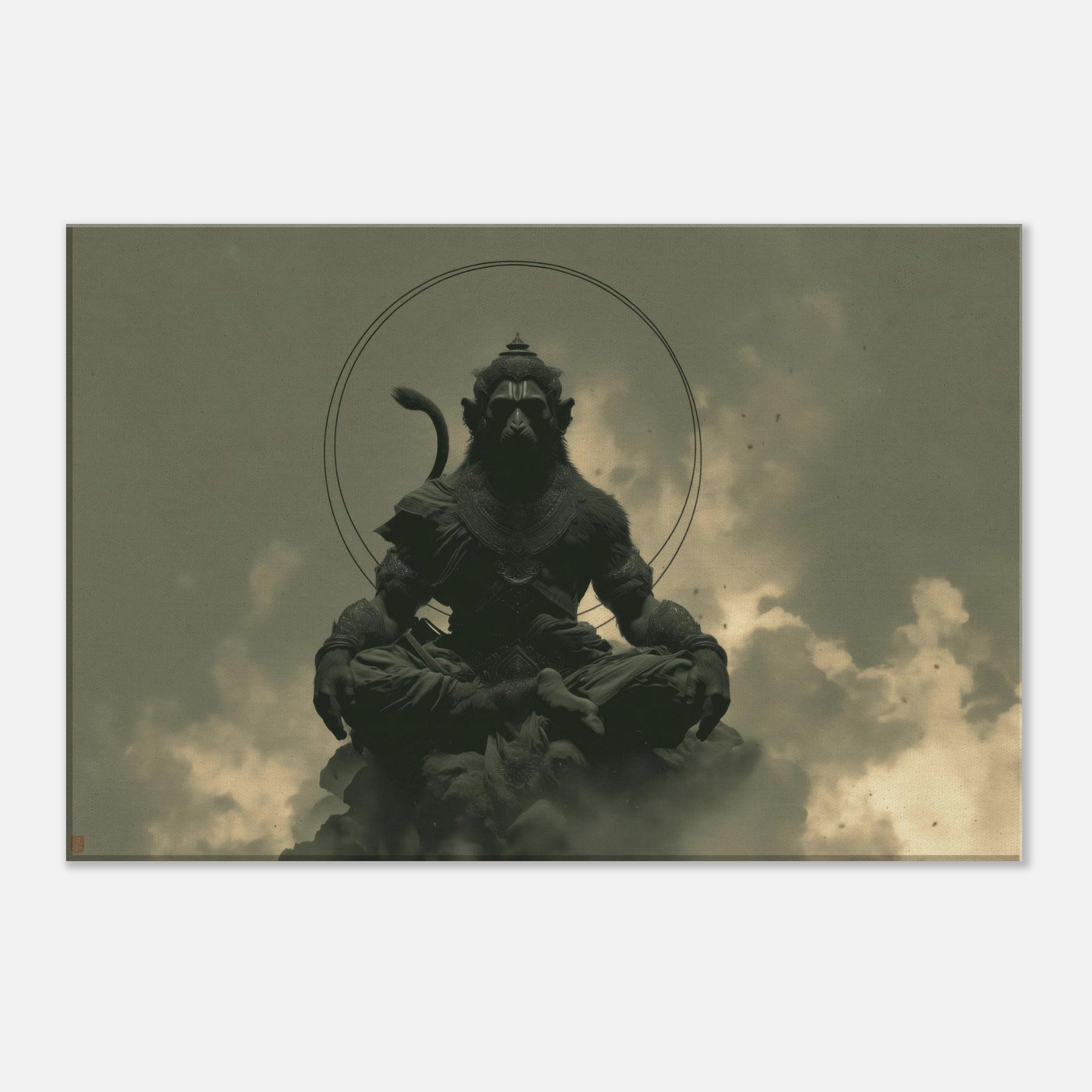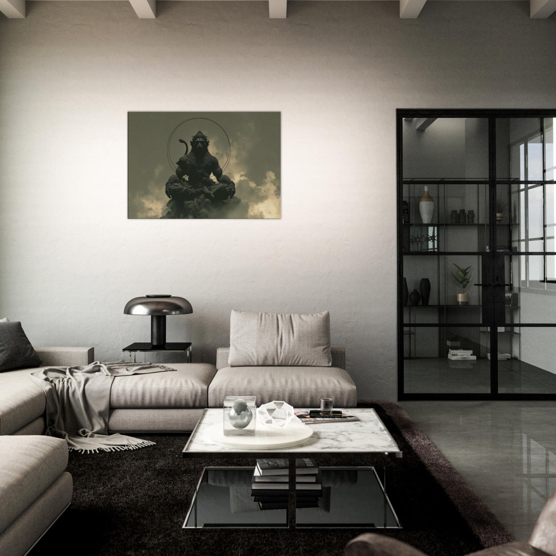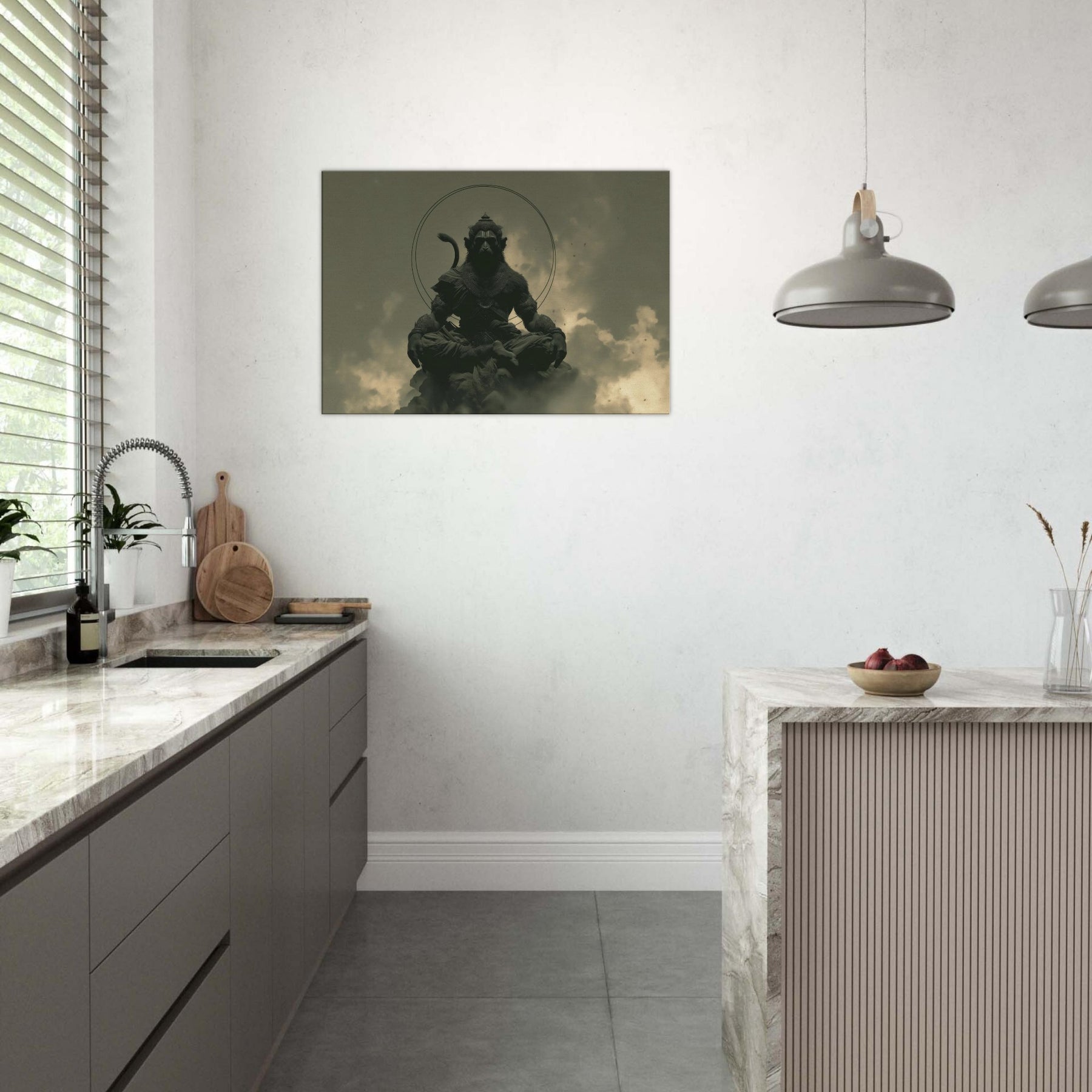 Suspended between dusk and dream, this Hanuman meditative sculpture rises from a clouded pedestal, encircled by two delicate rings that orbit like celestial breath. In muted greens and sepia, the figure exudes strength and gentleness, a paradox that invites quiet reflection rather than rush. This surreal, mystical composition turns a wall into a sanctuary, inviting warm light, soft shadows, and a sense of ancient myth awakening in the room.