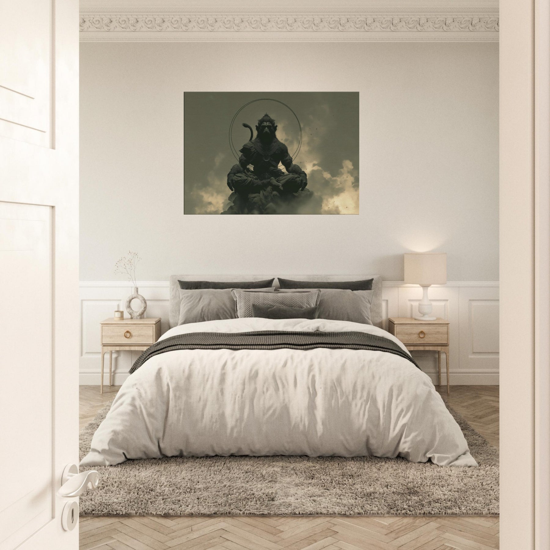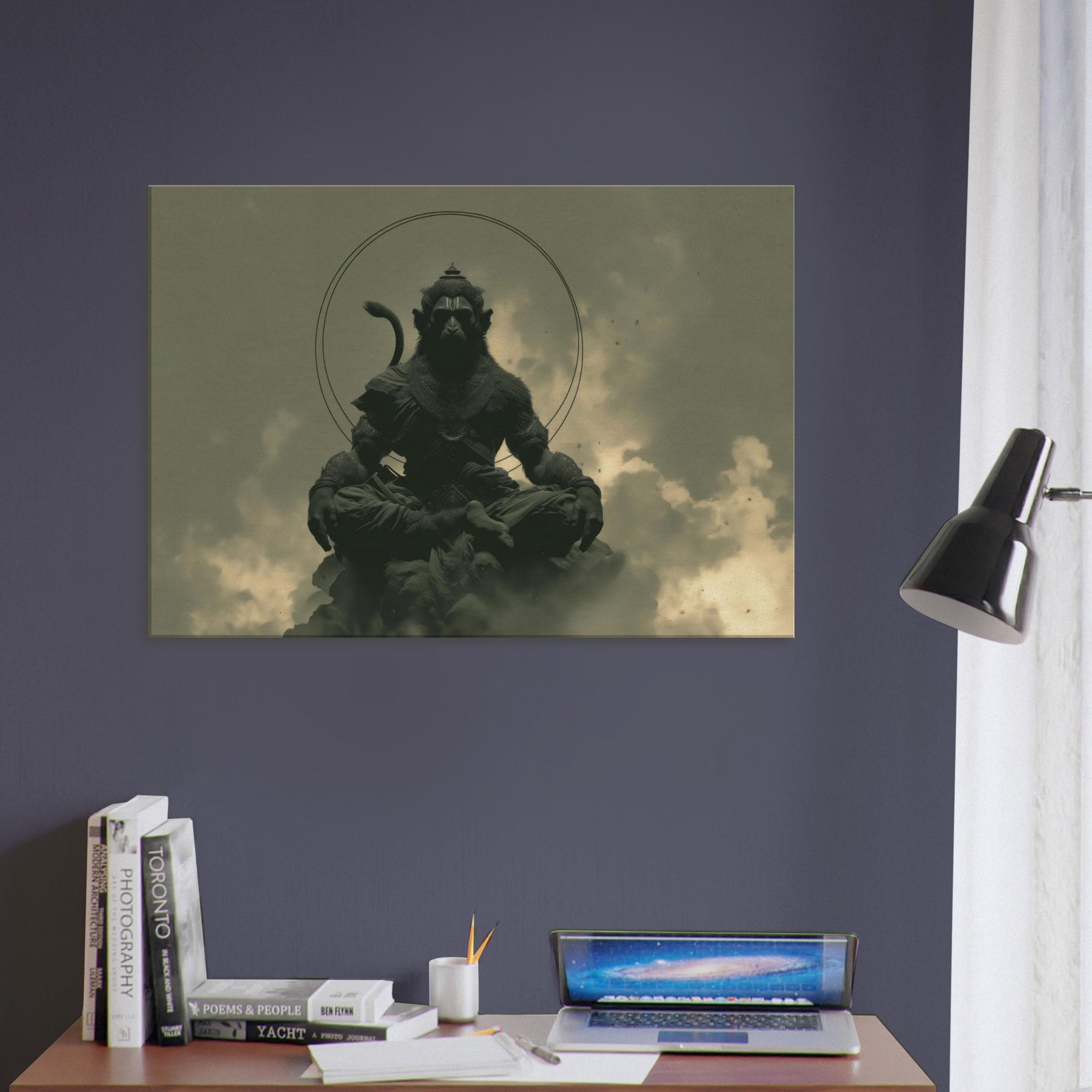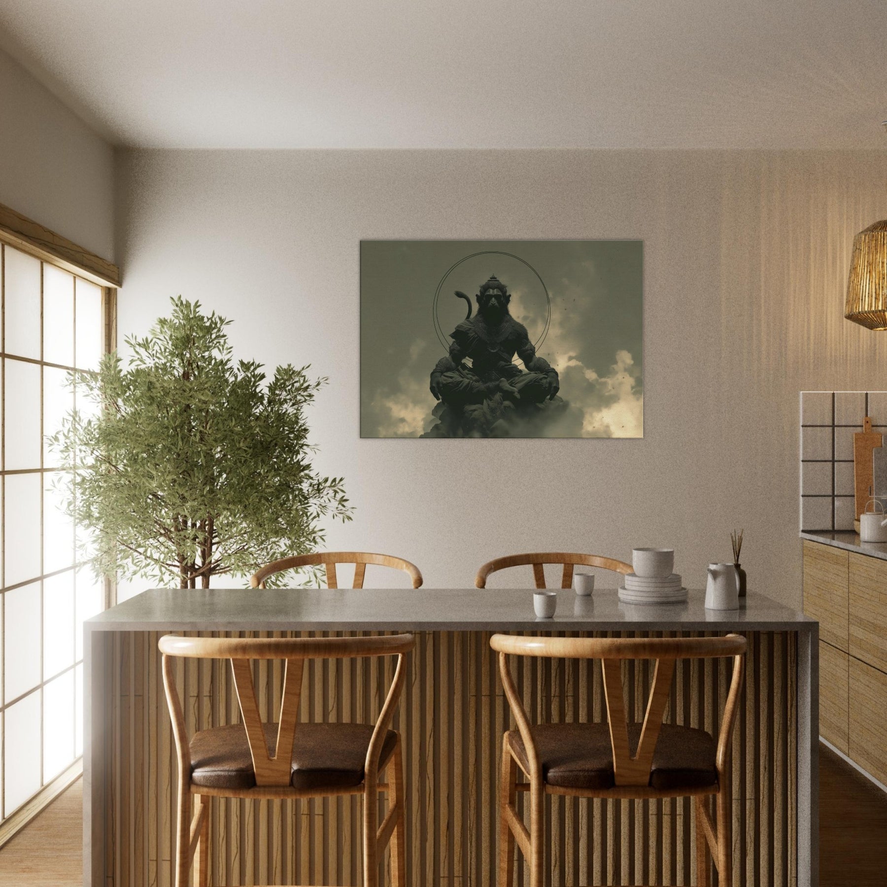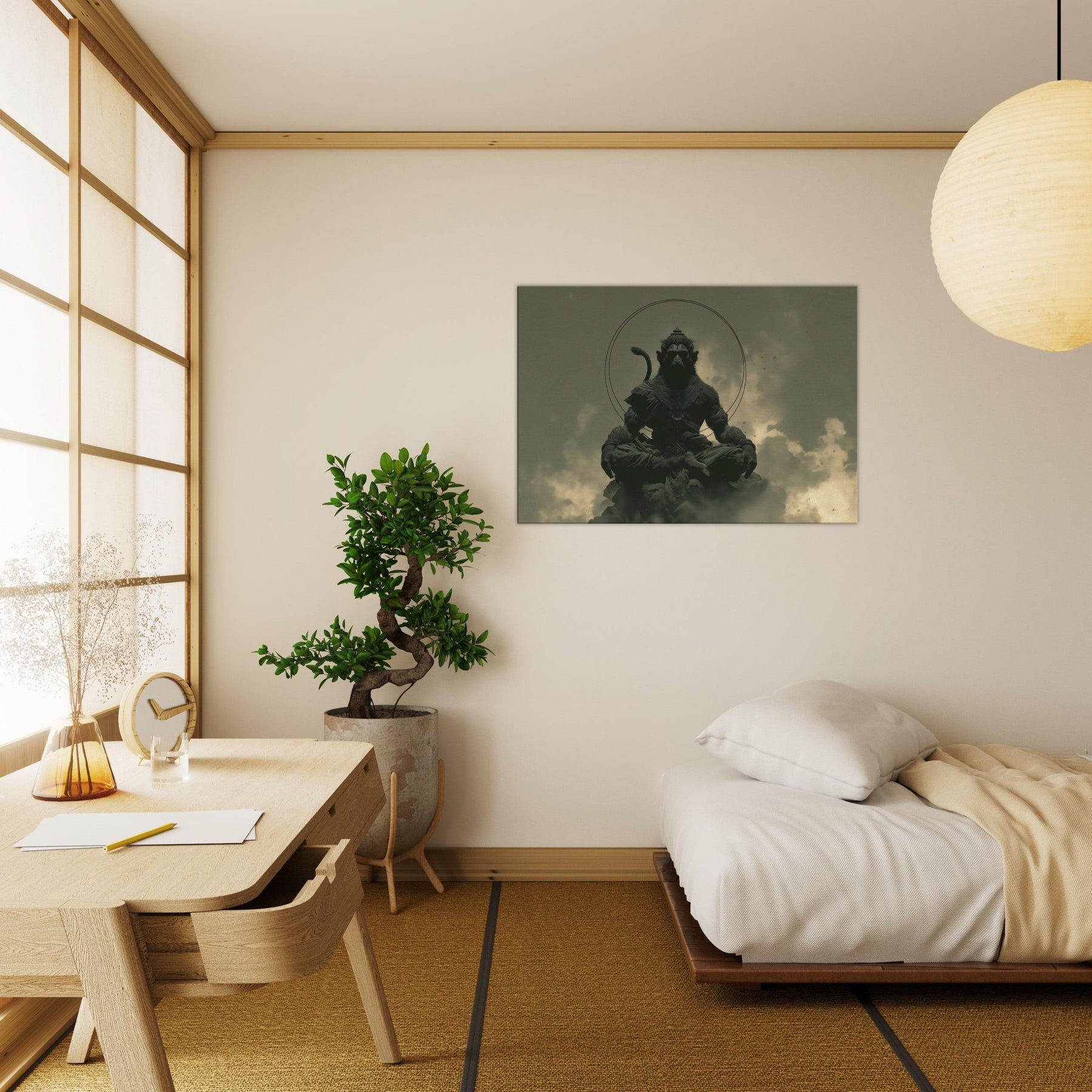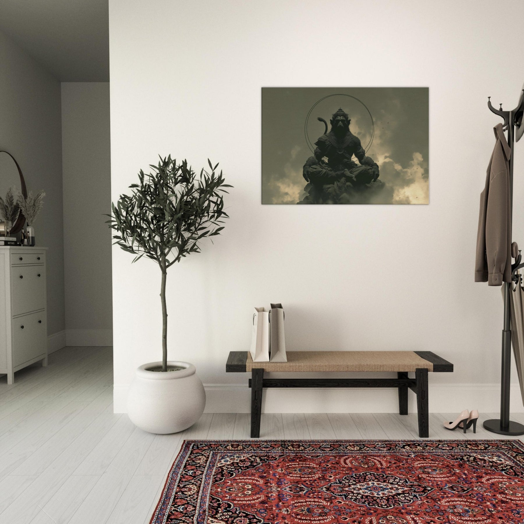 Suspended between dusk and dream, this Hanuman meditative sculpture rises from a clouded pedestal, encircled by two delicate rings that orbit like celestial breath. In muted greens and sepia, the figure exudes strength and gentleness, a paradox that invites quiet reflection rather than rush. This surreal, mystical composition turns a wall into a sanctuary, inviting warm light, soft shadows, and a sense of ancient myth awakening in the room.