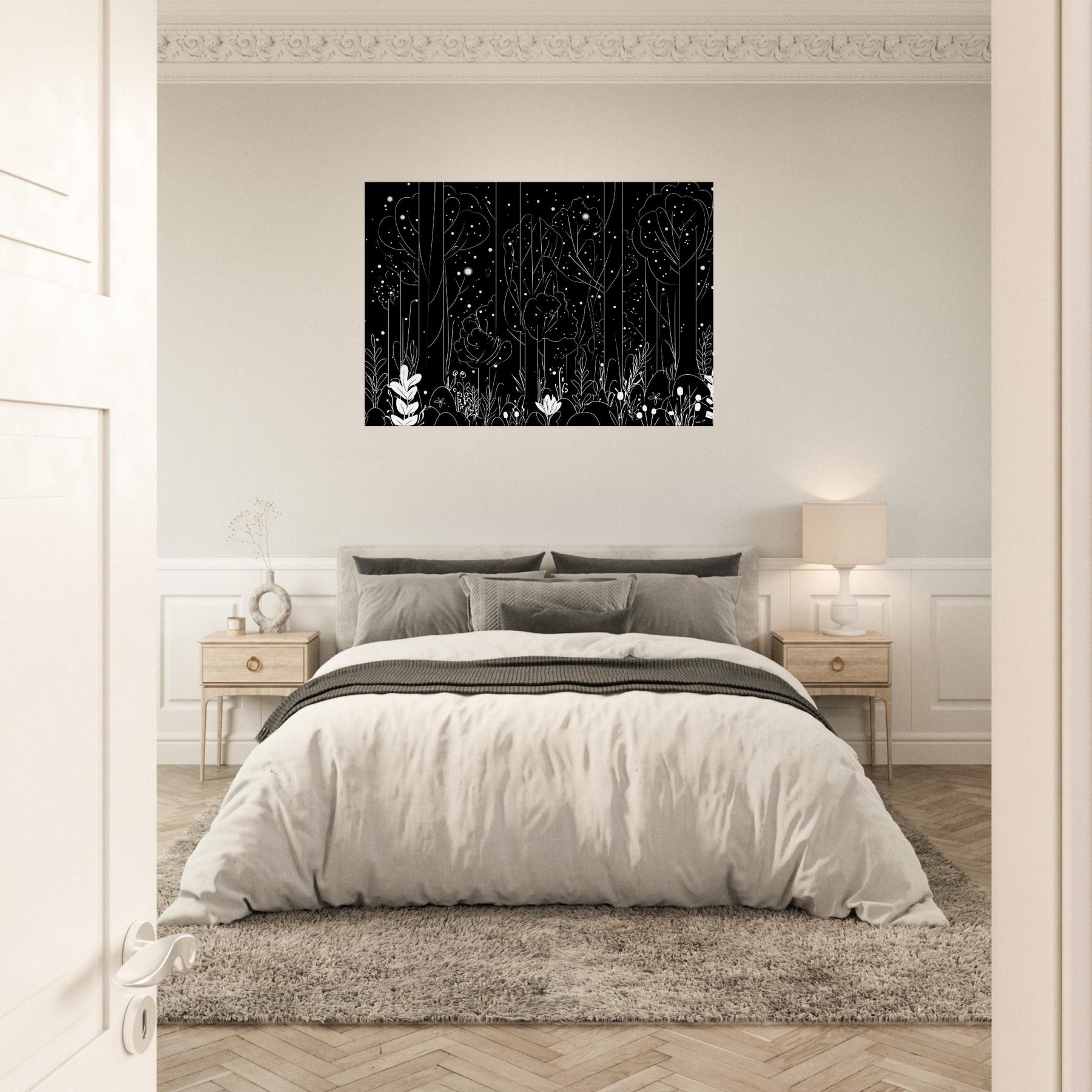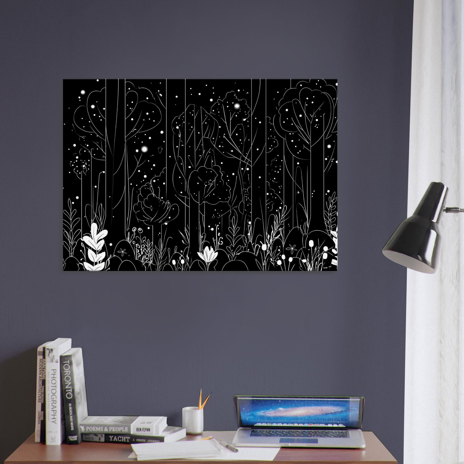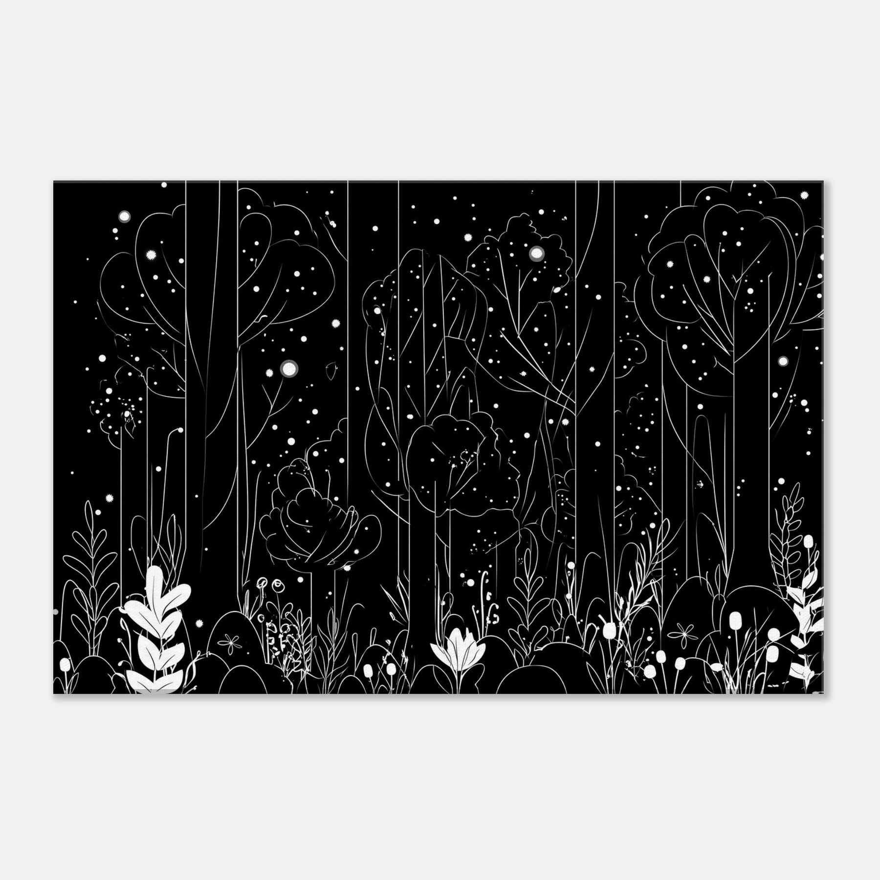 Step into the Enchanted Forest Filled with Glowing Lights and Spirits, captured in delicate line art that glimmers with quiet magic. This artwork invites a contemplative mood, its slender trees and ethereal orbs weaving through your space, casting soft, luminous silhouettes on walls and furnishings. Perfect for a living room or study, it enhances candlelit evenings and morning sun alike, turning a hallway into a dreamlike passage. A touch of fantasy and myth, rendered with restraint and elegance.