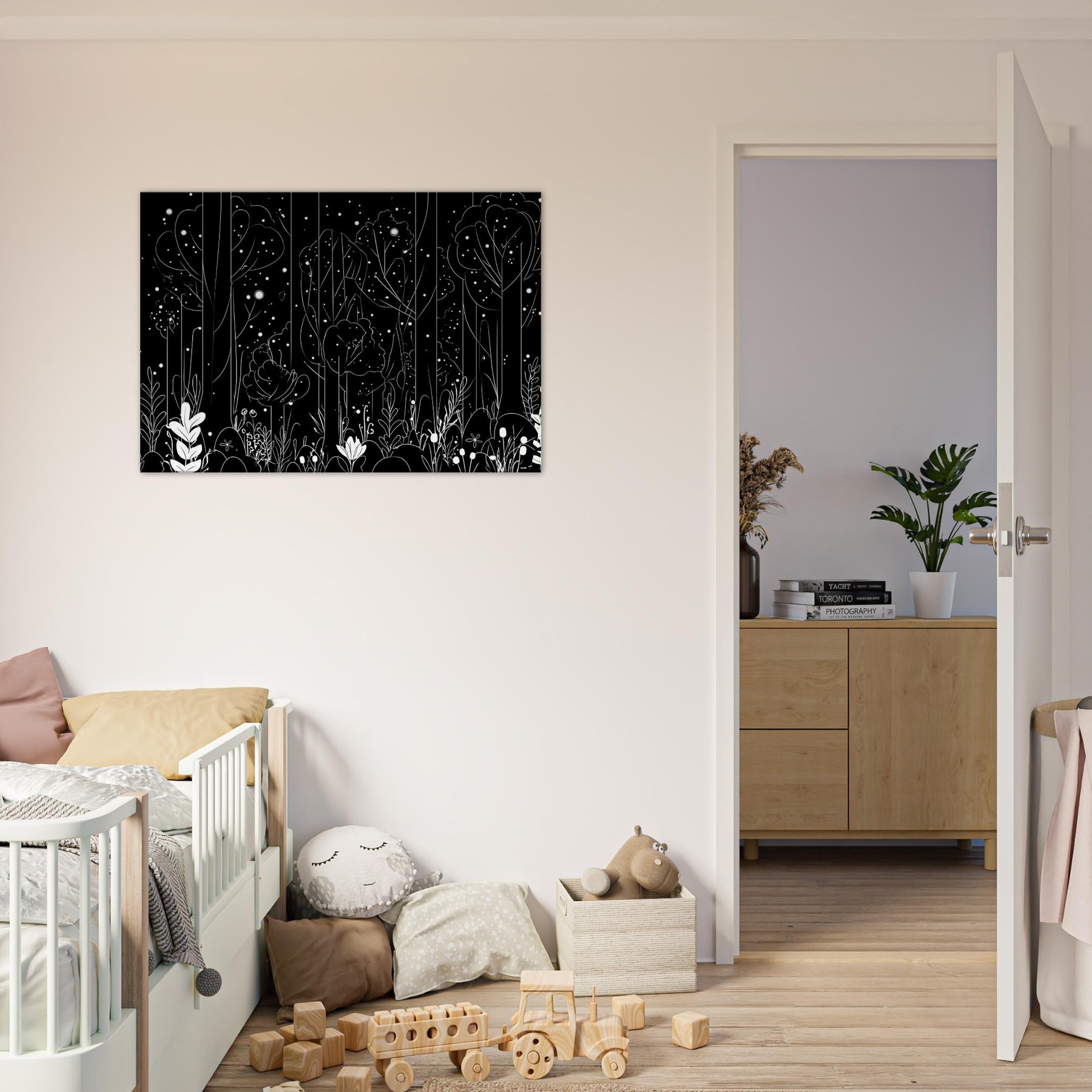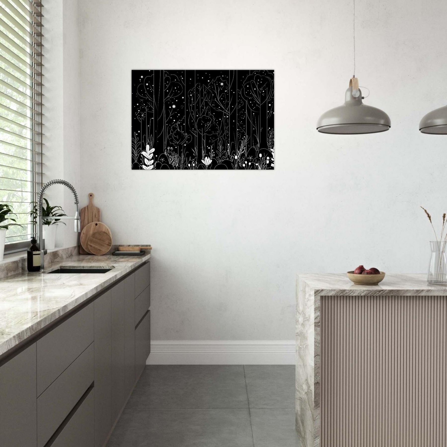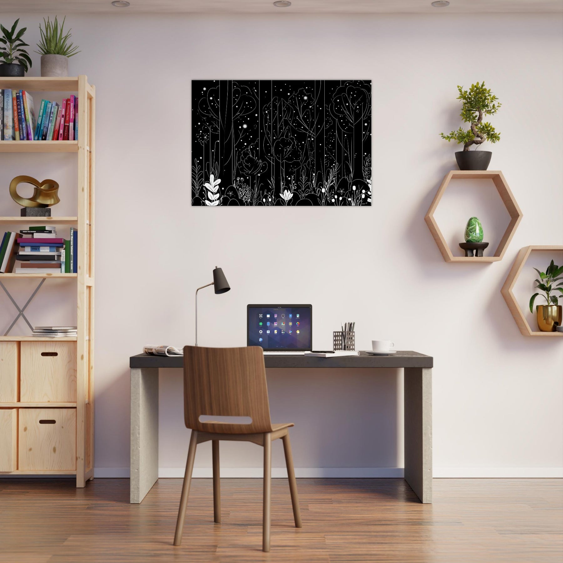 Step into the Enchanted Forest Filled with Glowing Lights and Spirits, captured in delicate line art that glimmers with quiet magic. This artwork invites a contemplative mood, its slender trees and ethereal orbs weaving through your space, casting soft, luminous silhouettes on walls and furnishings. Perfect for a living room or study, it enhances candlelit evenings and morning sun alike, turning a hallway into a dreamlike passage. A touch of fantasy and myth, rendered with restraint and elegance.