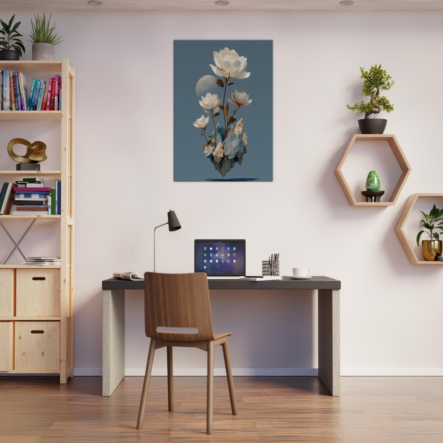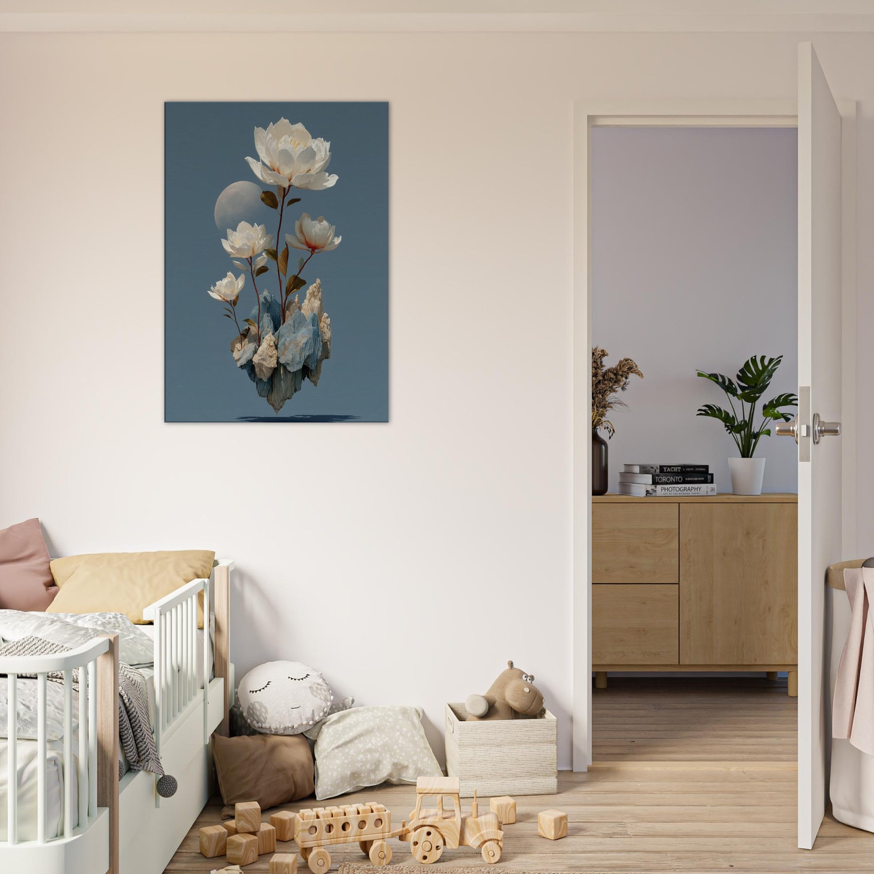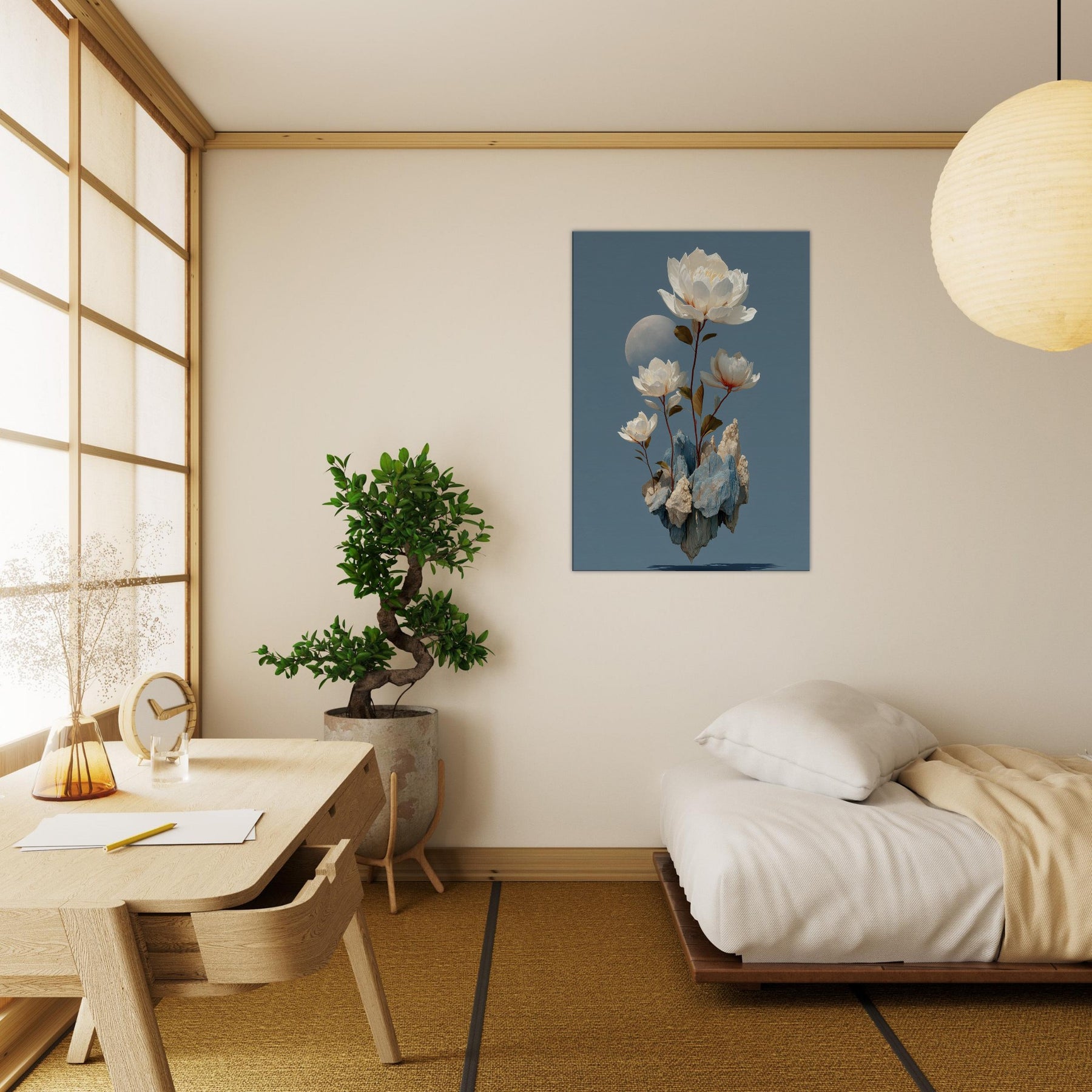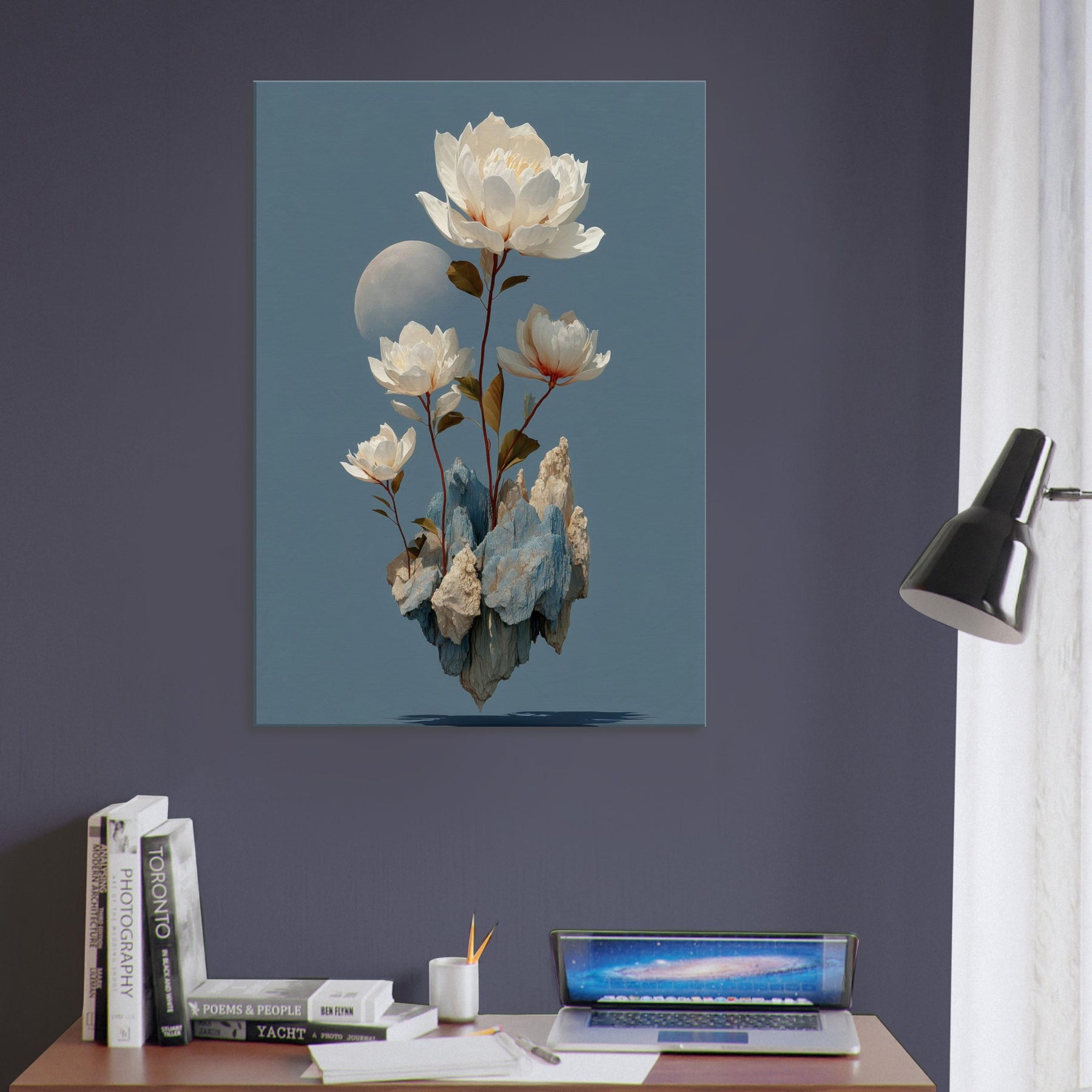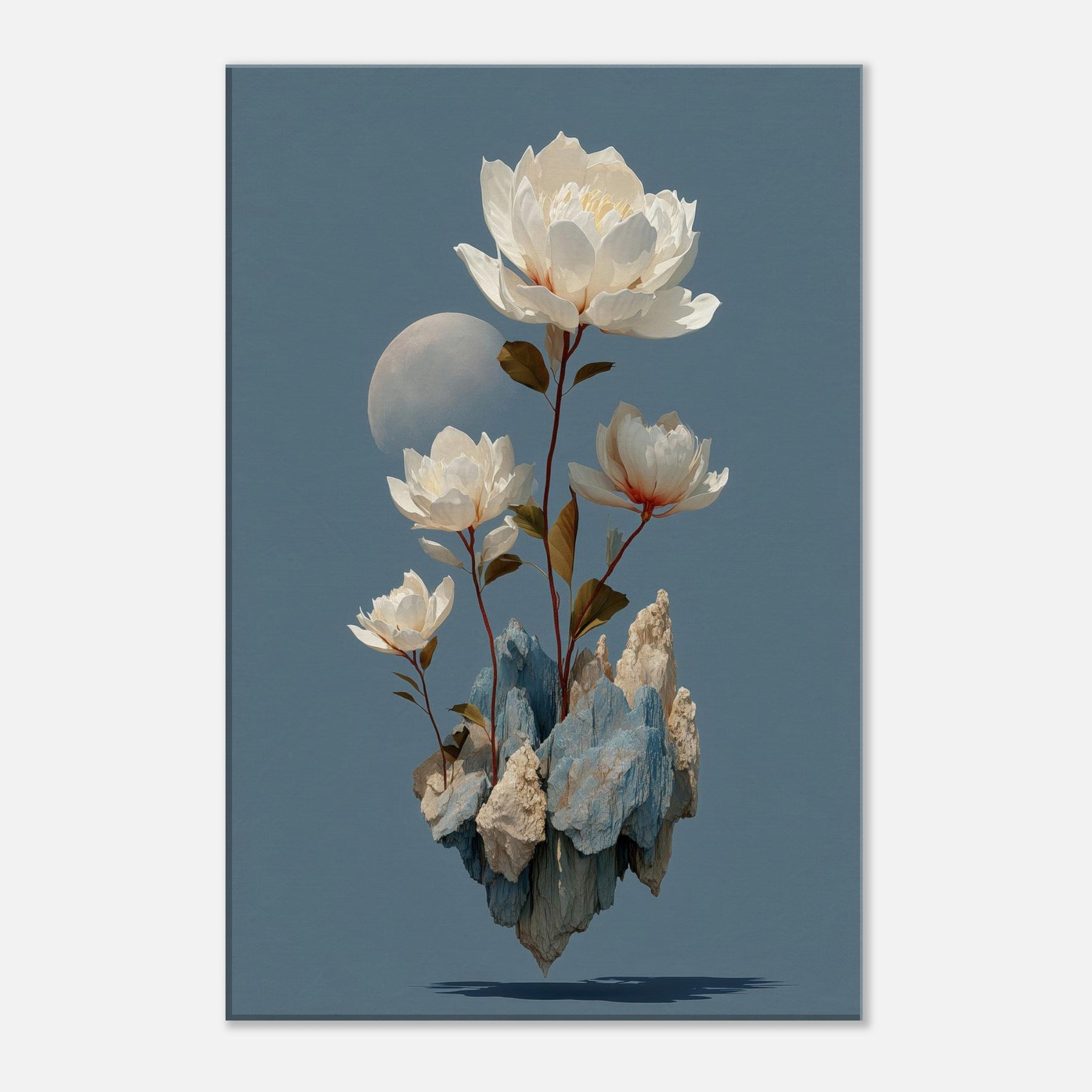 From a floating blue stone, the Primary Subject: Magnolia rises in a dreamlike ascent, where flora and geology mingle in quiet defiance of gravity. Ivory petals glow against a slate blue sky, and a pale moon sits behind, casting a soft, otherworldly light. The scene hums with stillness, inviting contemplation and a slower pace, while the surreal balance between rock and bloom evokes gentleness and resilience. This artwork softens walls and mornings alike, making living spaces feel expansive, tranquil, and filled with poetic possibility.