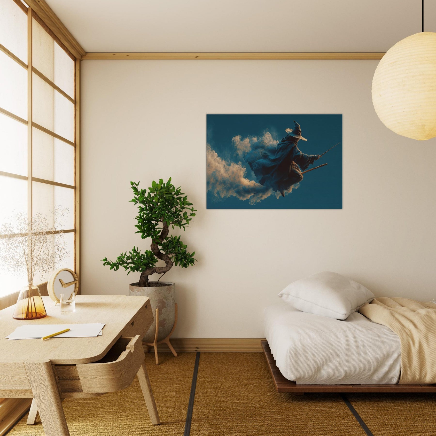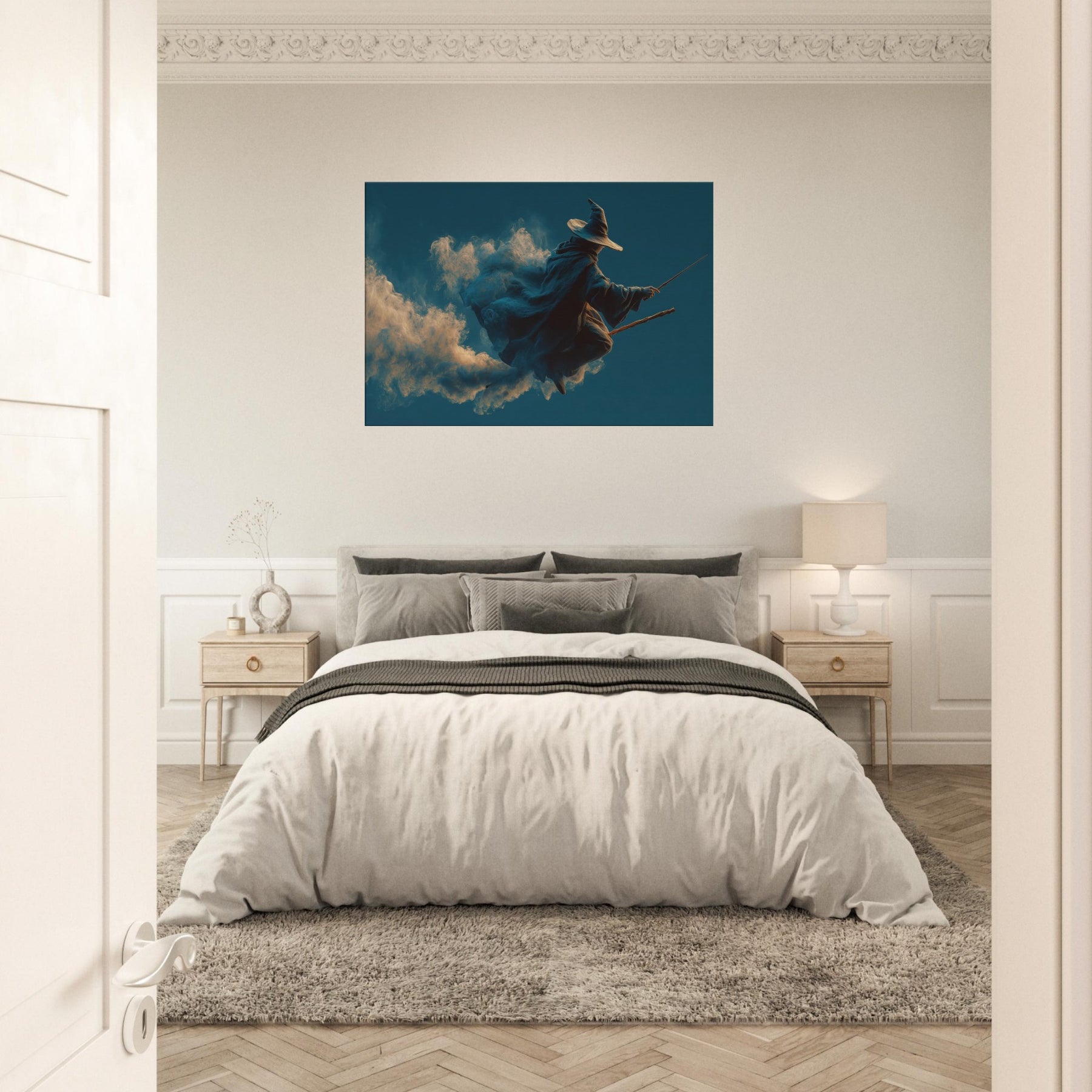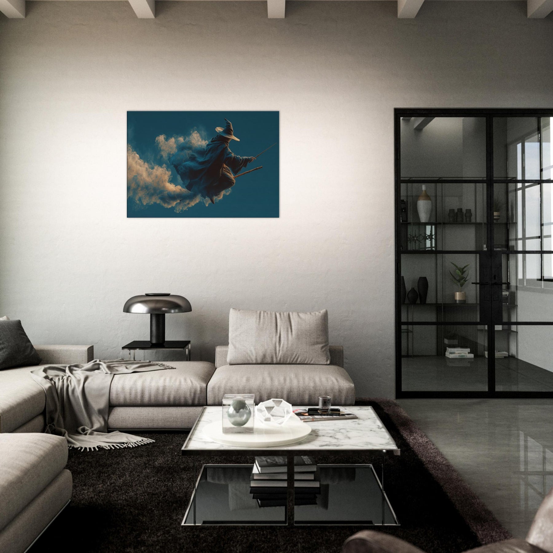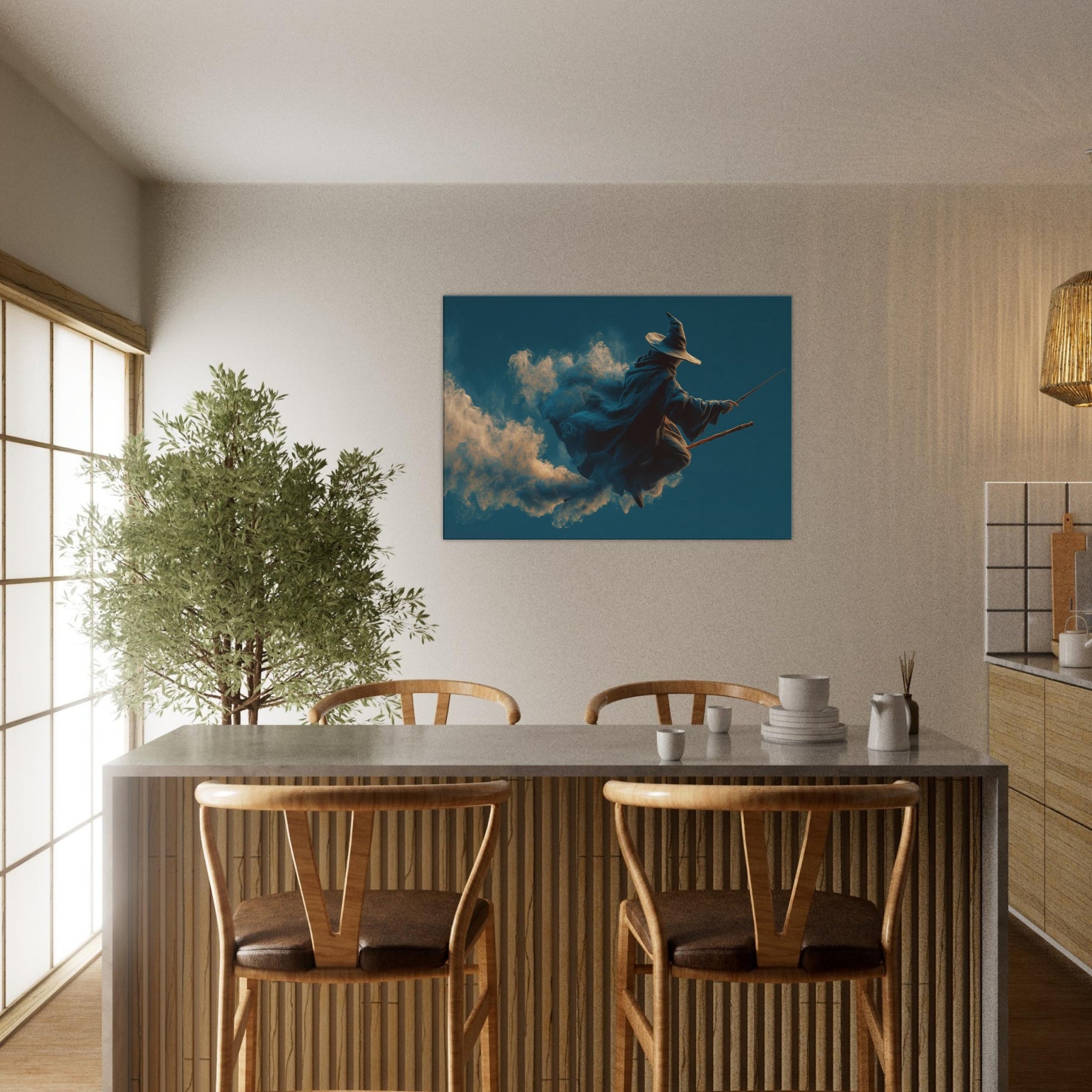 Immerse your walls in a nocturnal spell of light and shadow. This painting centers the Mysterious Wizard Casting Spells within a fluttering cloak, wisps of cloud and a wand of secrets, suspended in a dreamlike blue dusk. The surreal composition threads soft vapors and glints of amber through the void, inviting quiet awe and curiosity. Hang it in a living room or study to conjure a mood of wonder, where imagination breathes and conversations drift like smoke along the edges of the frame.