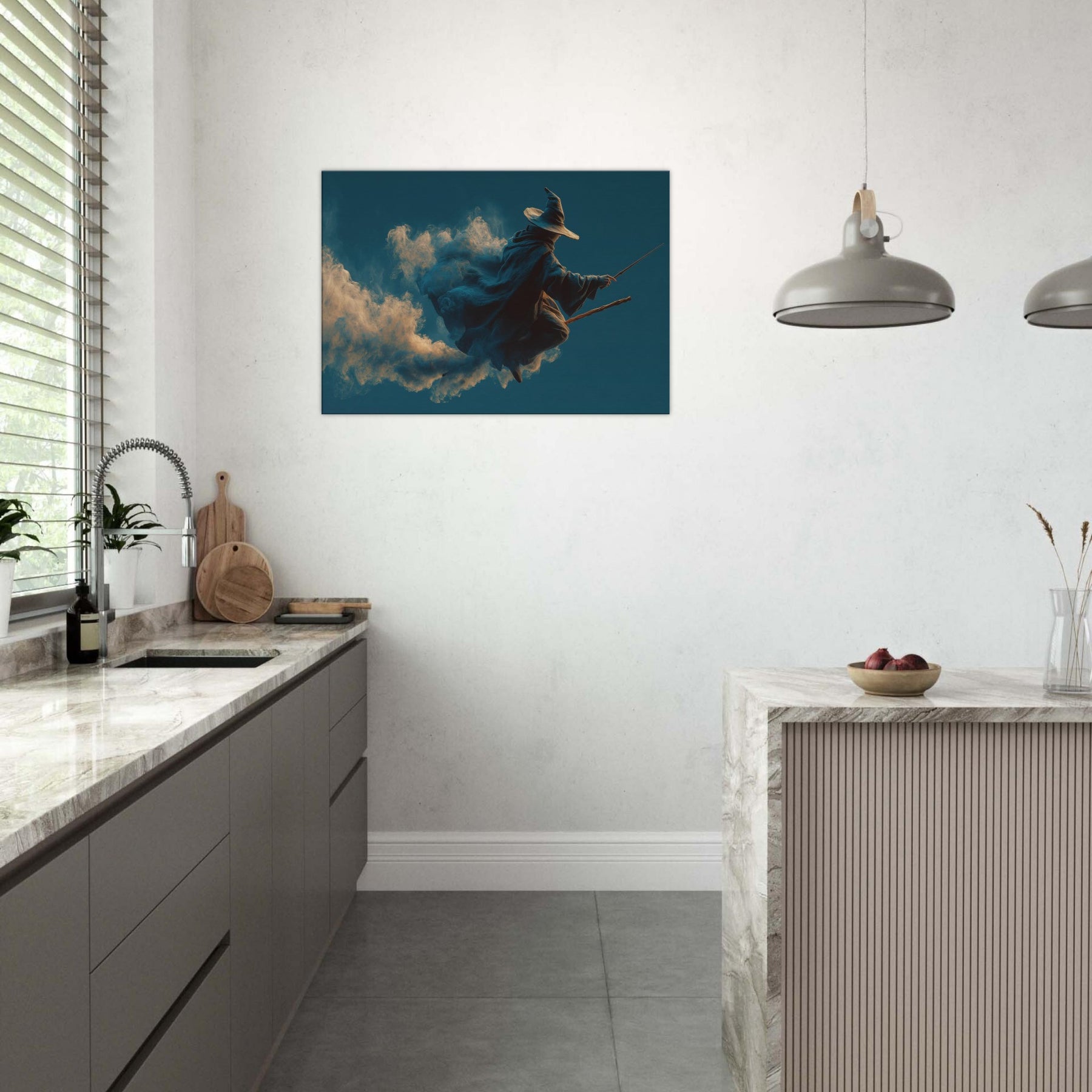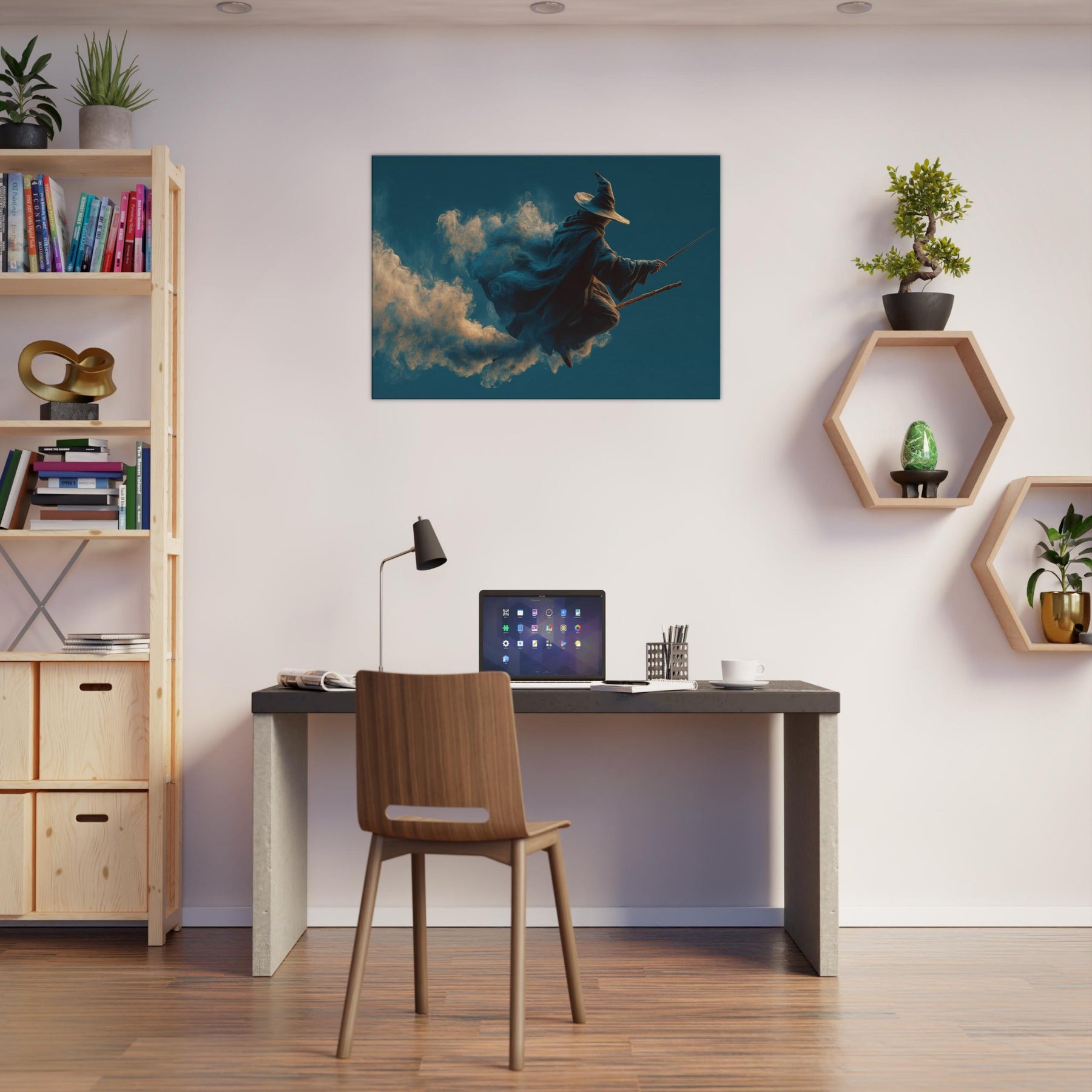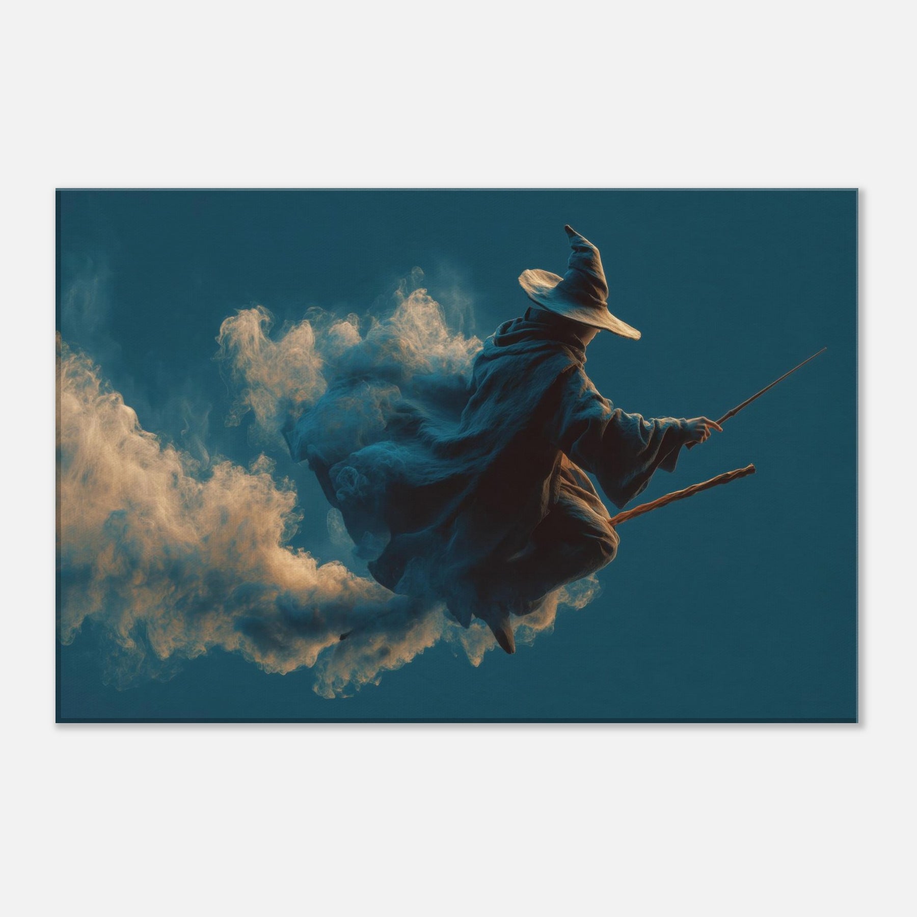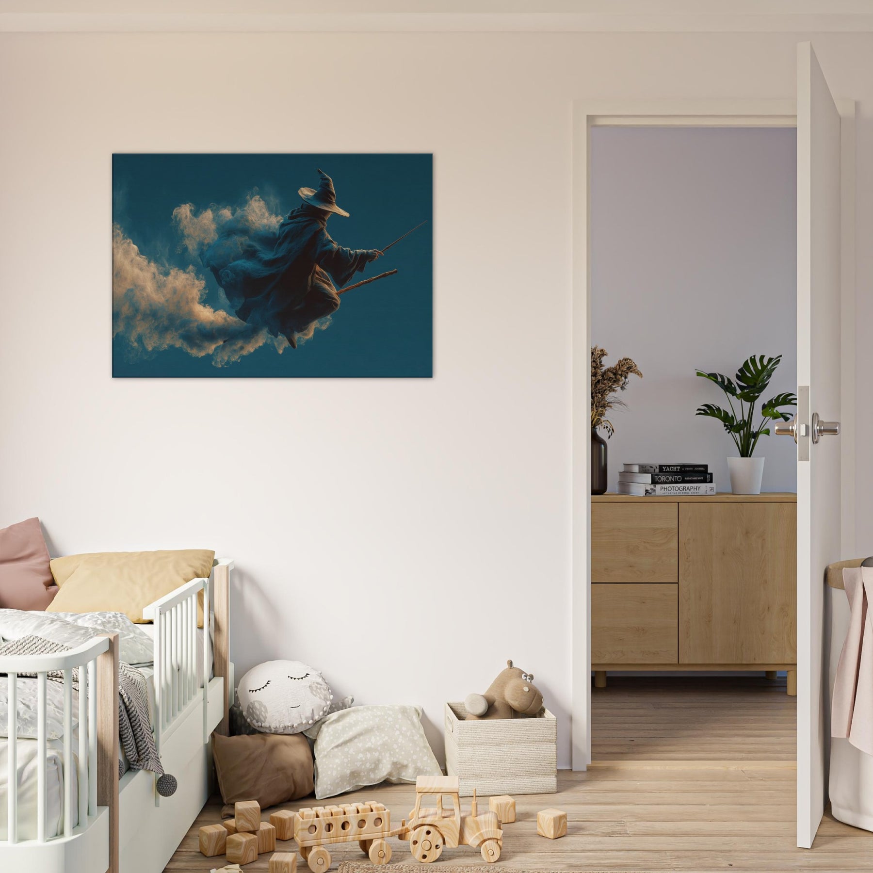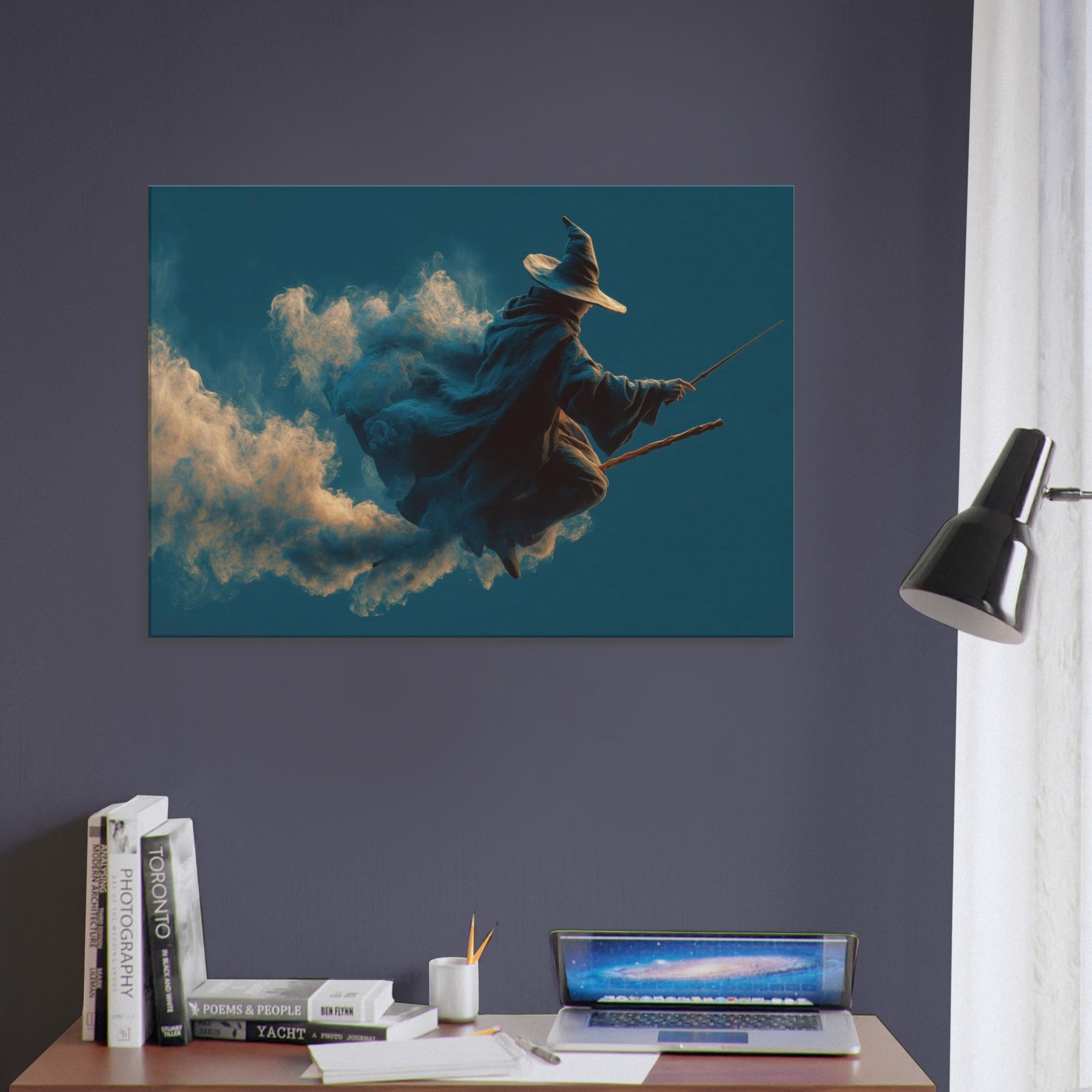 Immerse your walls in a nocturnal spell of light and shadow. This painting centers the Mysterious Wizard Casting Spells within a fluttering cloak, wisps of cloud and a wand of secrets, suspended in a dreamlike blue dusk. The surreal composition threads soft vapors and glints of amber through the void, inviting quiet awe and curiosity. Hang it in a living room or study to conjure a mood of wonder, where imagination breathes and conversations drift like smoke along the edges of the frame.