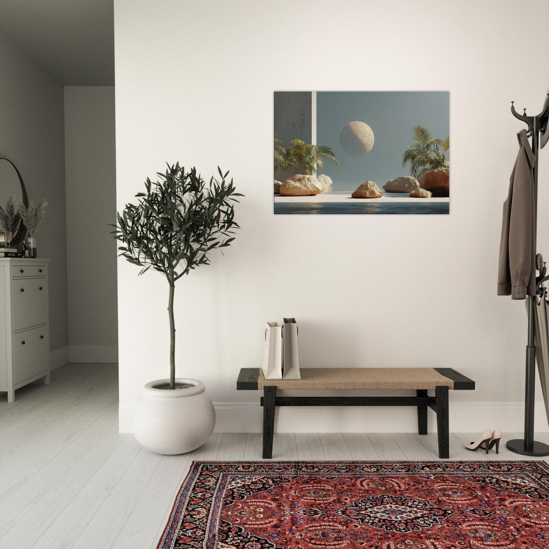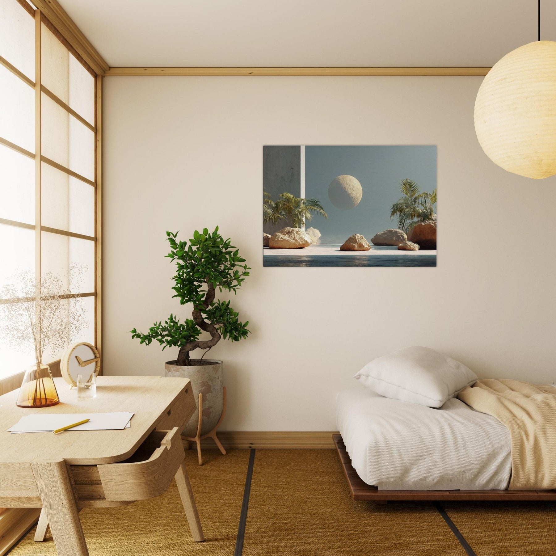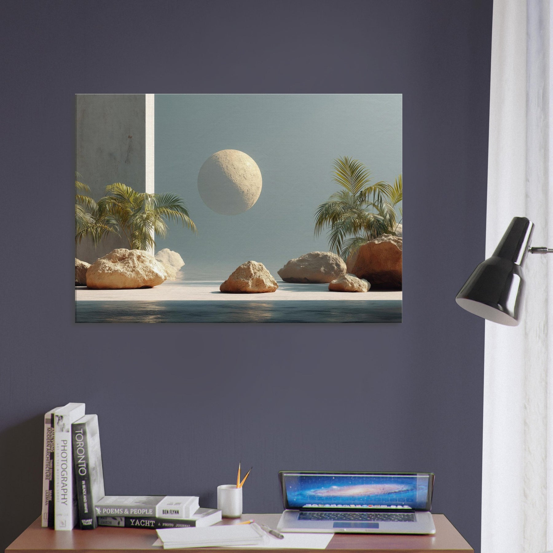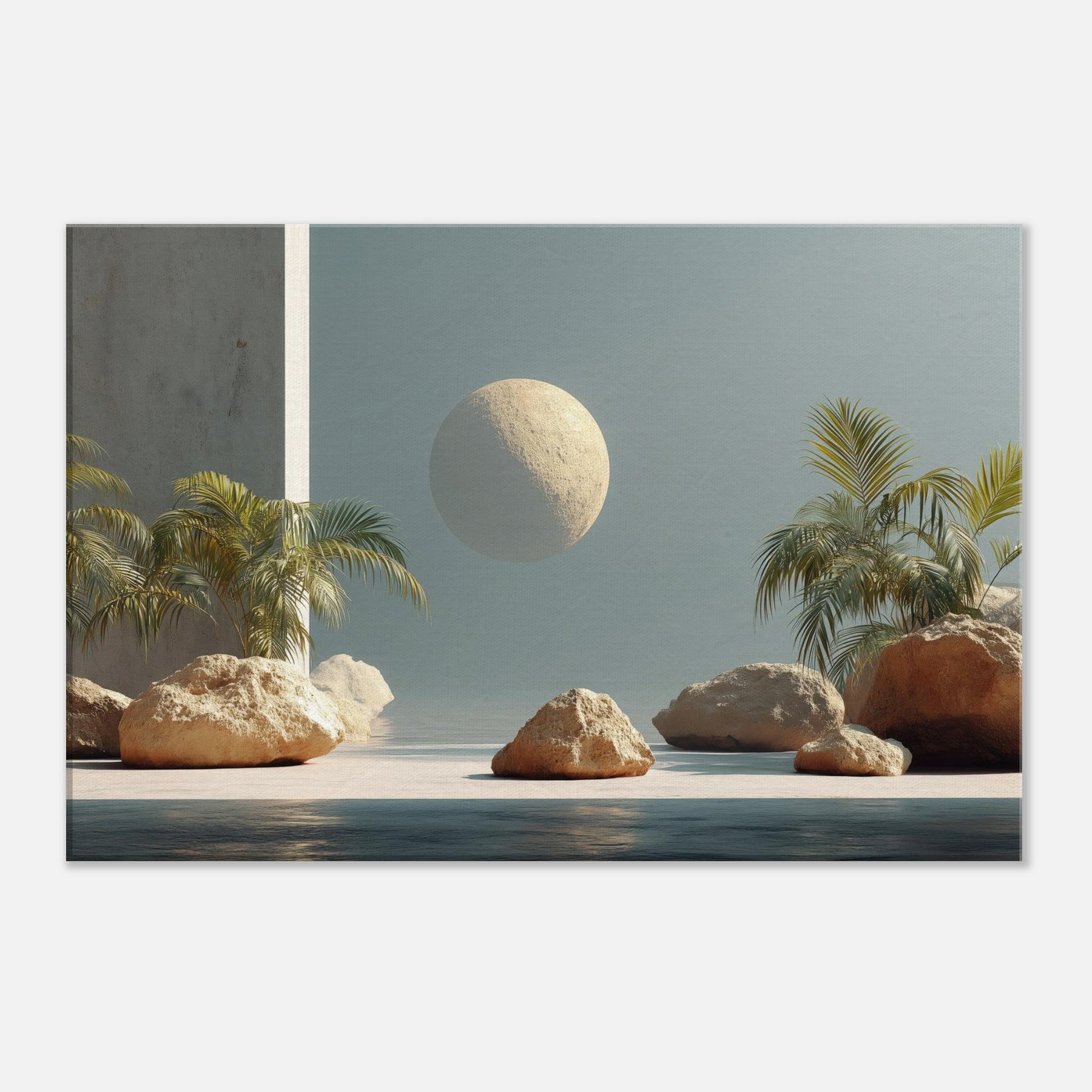 Palm leaves shimmer in a calm, dreamlike where a pale sphere hangs in an airy horizon. The Primary Subject the Palm Leaves are rendered with tactile warmth, bending the ordinary into wonder as stone and water soften into a serene sanctuary. This surreal composition invites slow, contemplative moments, turning any wall into a window that breathes: sun washed textures, cool shadows, and a whisper of distant tides. Place it in a living room or entryway to nourish mood and memory.