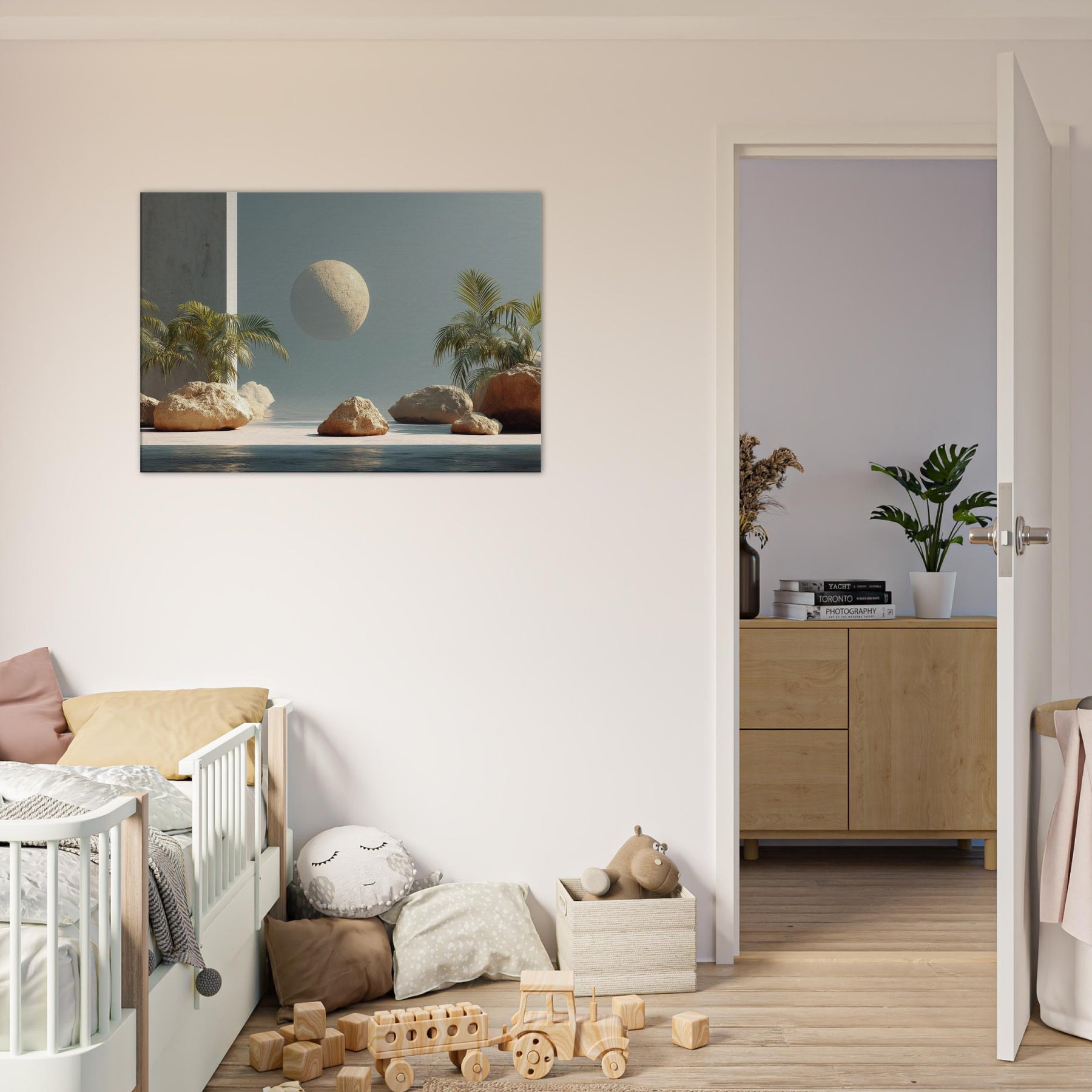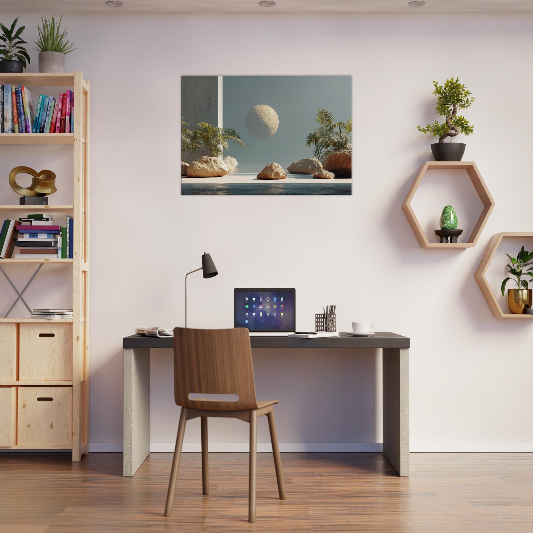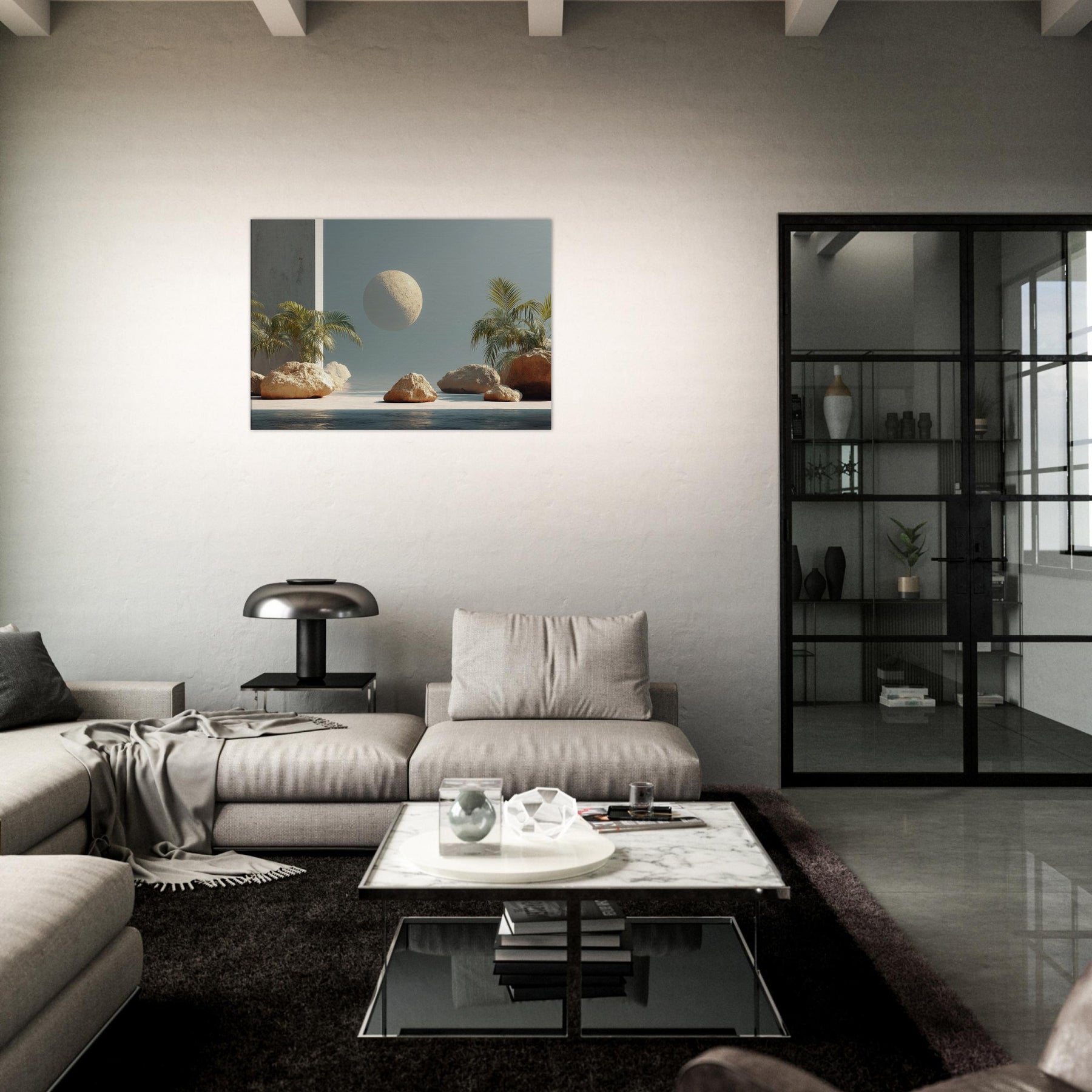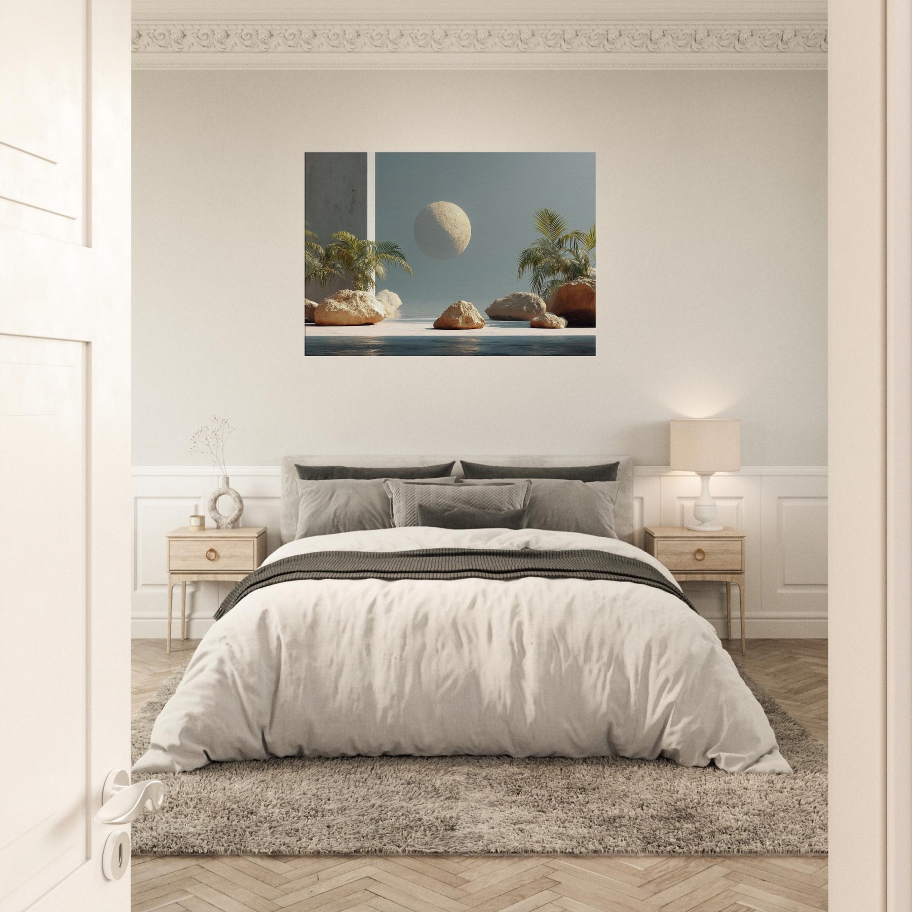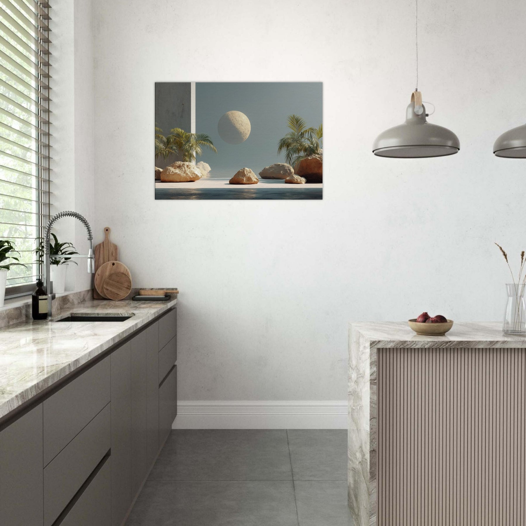 Palm leaves shimmer in a calm, dreamlike where a pale sphere hangs in an airy horizon. The Primary Subject the Palm Leaves are rendered with tactile warmth, bending the ordinary into wonder as stone and water soften into a serene sanctuary. This surreal composition invites slow, contemplative moments, turning any wall into a window that breathes: sun washed textures, cool shadows, and a whisper of distant tides. Place it in a living room or entryway to nourish mood and memory.