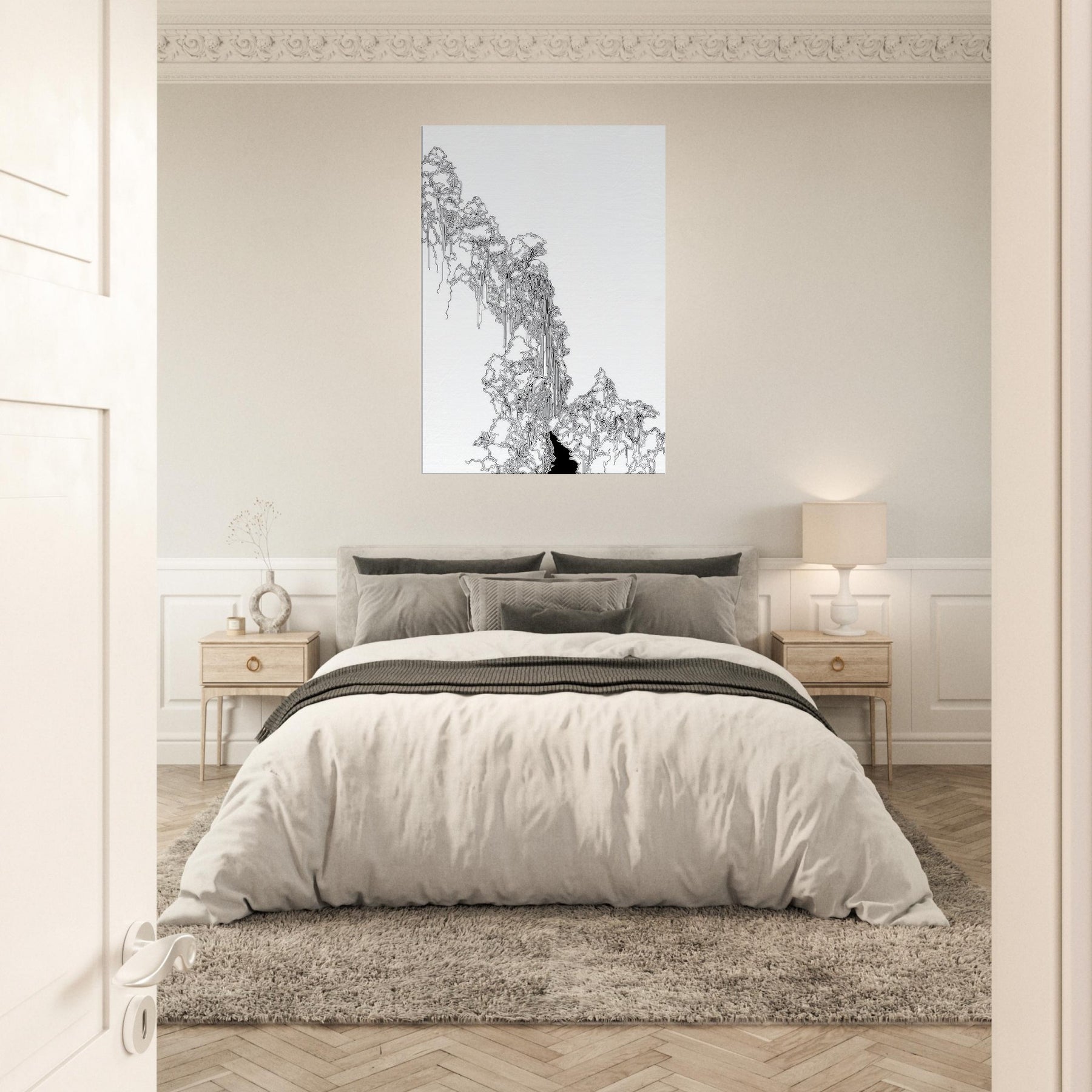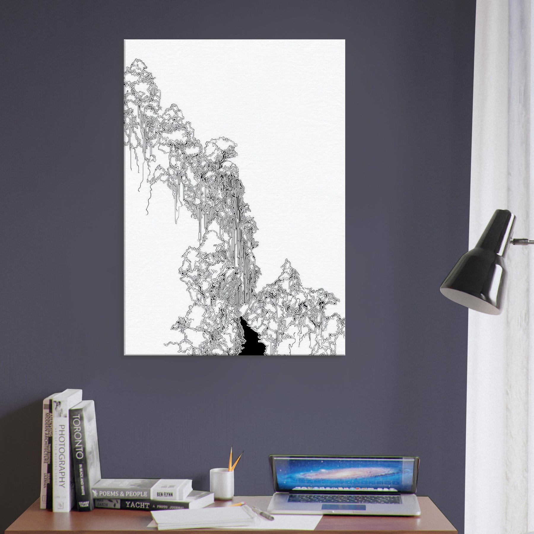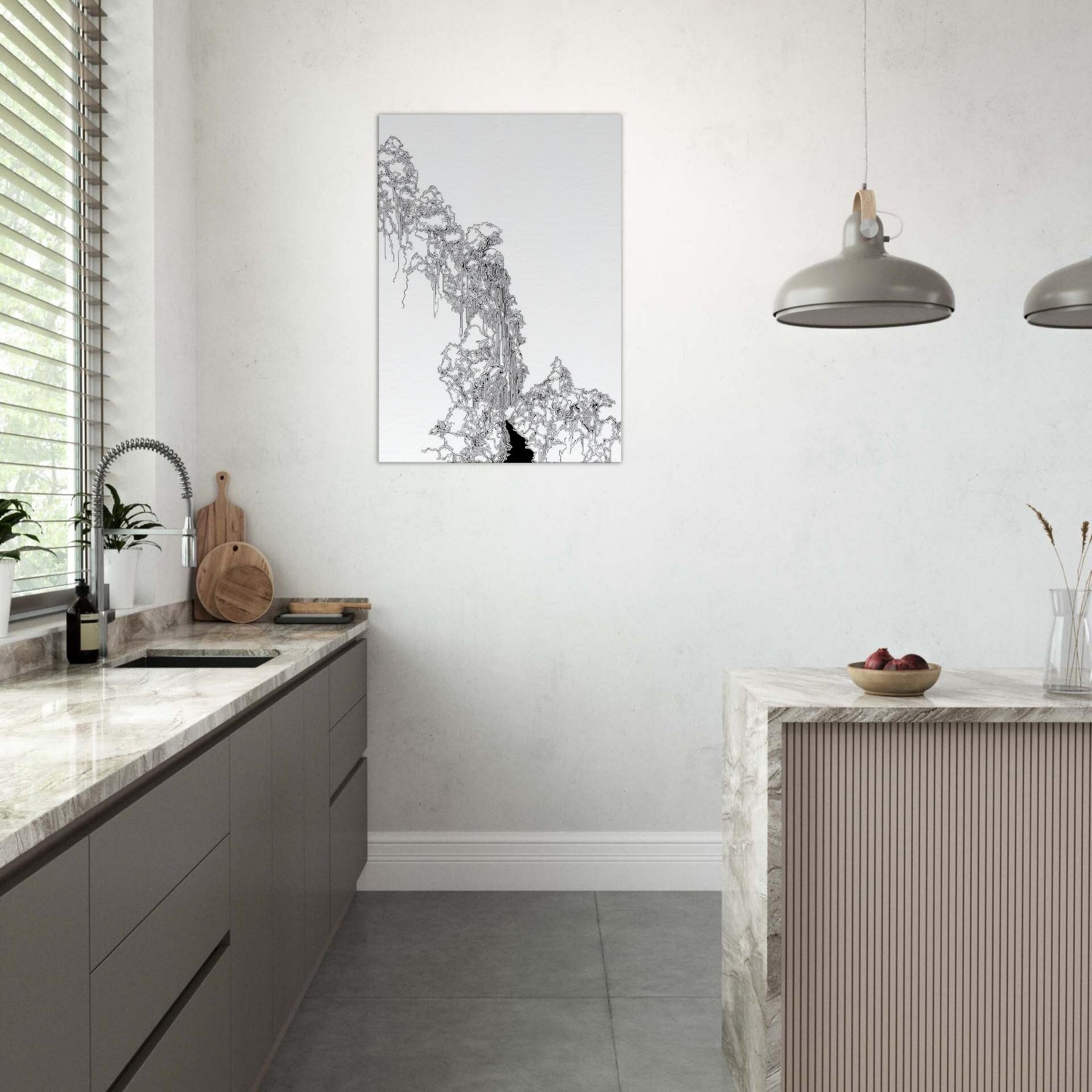 The Tropical Rain is rendered in elegant line art, where slender trunks rise like inked thread and leaves cascade along the page. The image breathes with rainy hush, turning light into texture and space into mood. The stark black lines on white surface mimic rain trails, inviting a meditative pause in a living room, bedroom, or hallway. Hang this piece to invite nature’s cadence, serenity, and the glow of rain washed mornings into everyday life.