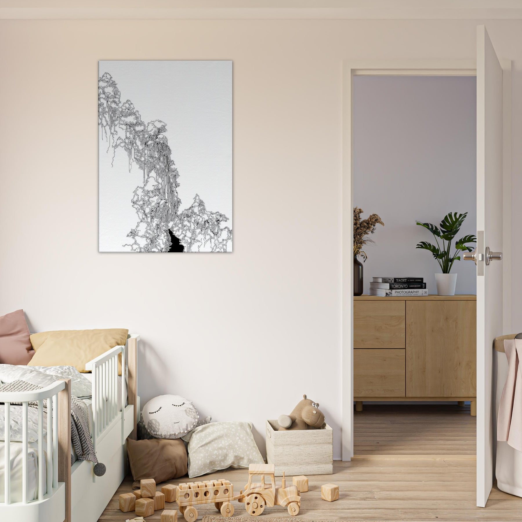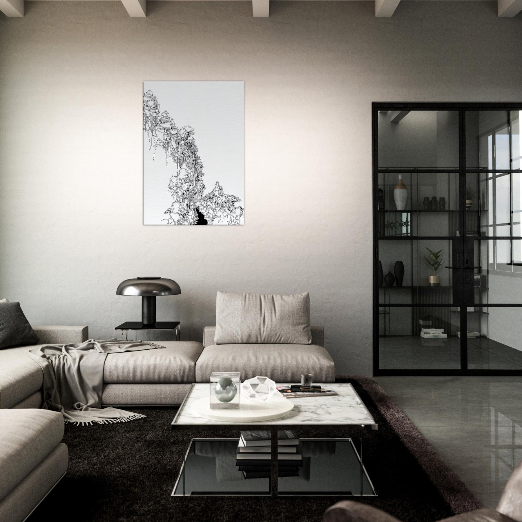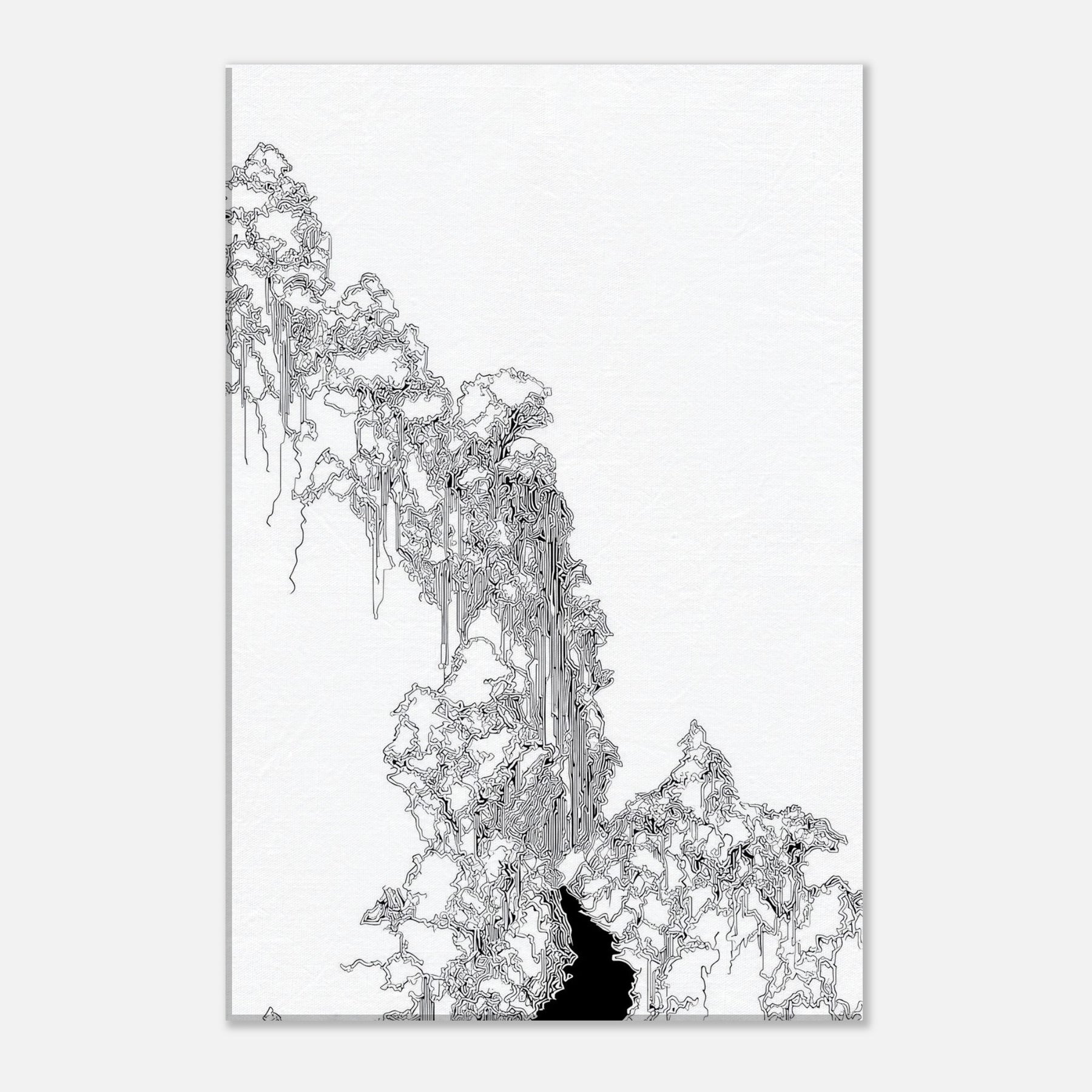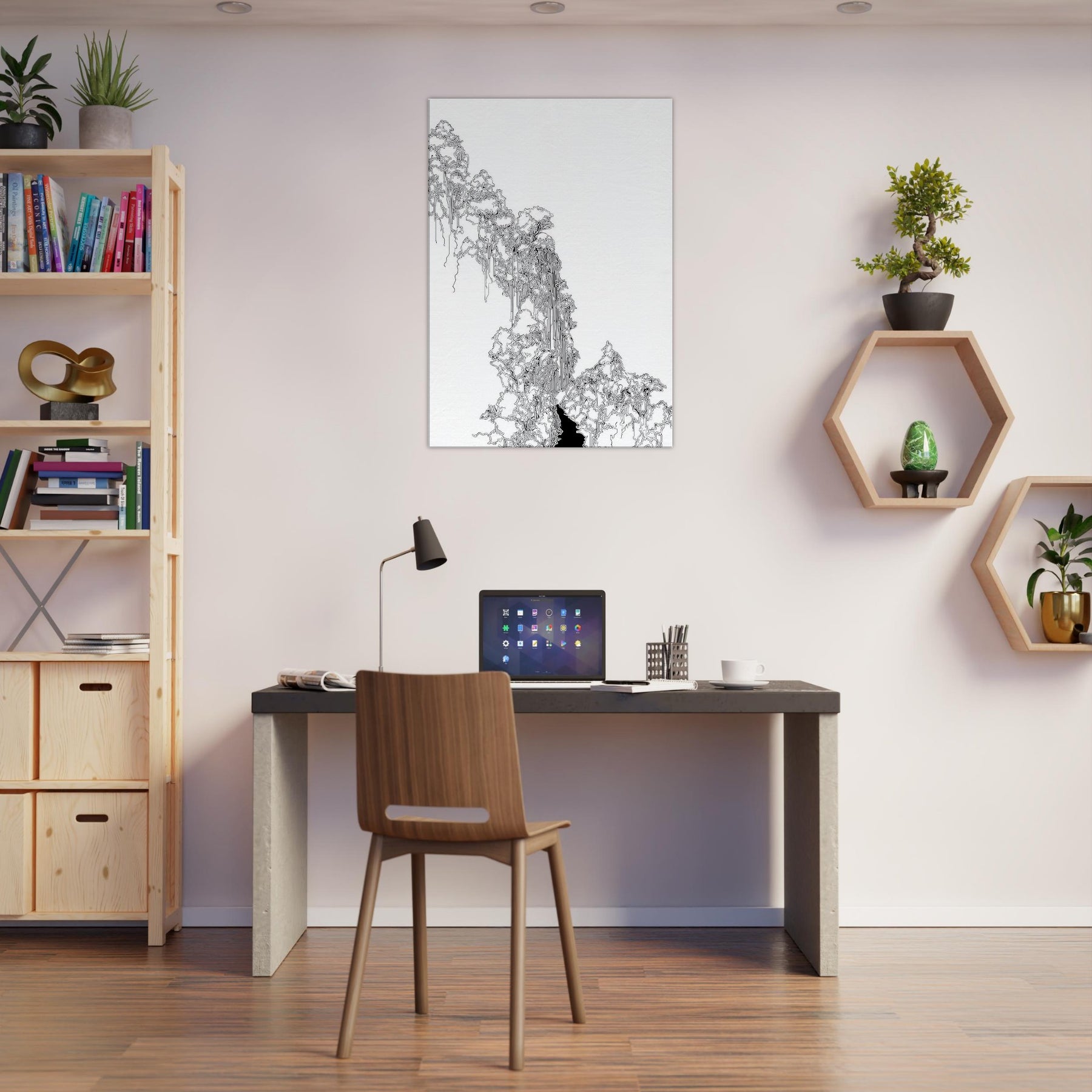 The Tropical Rain is rendered in elegant line art, where slender trunks rise like inked thread and leaves cascade along the page. The image breathes with rainy hush, turning light into texture and space into mood. The stark black lines on white surface mimic rain trails, inviting a meditative pause in a living room, bedroom, or hallway. Hang this piece to invite nature’s cadence, serenity, and the glow of rain washed mornings into everyday life.