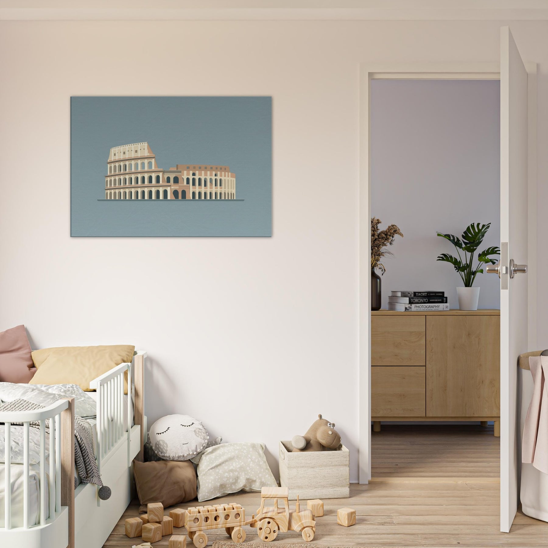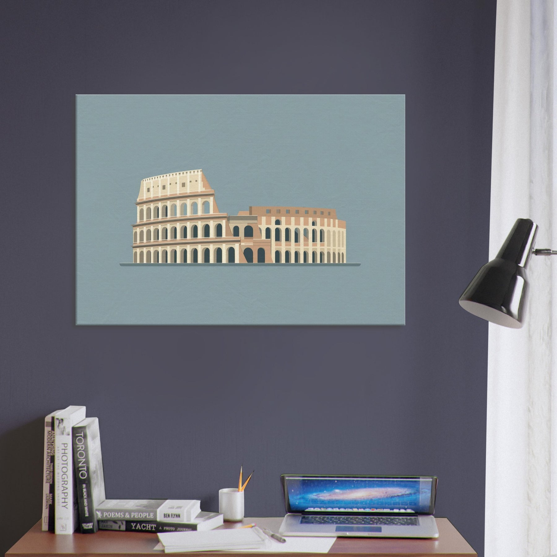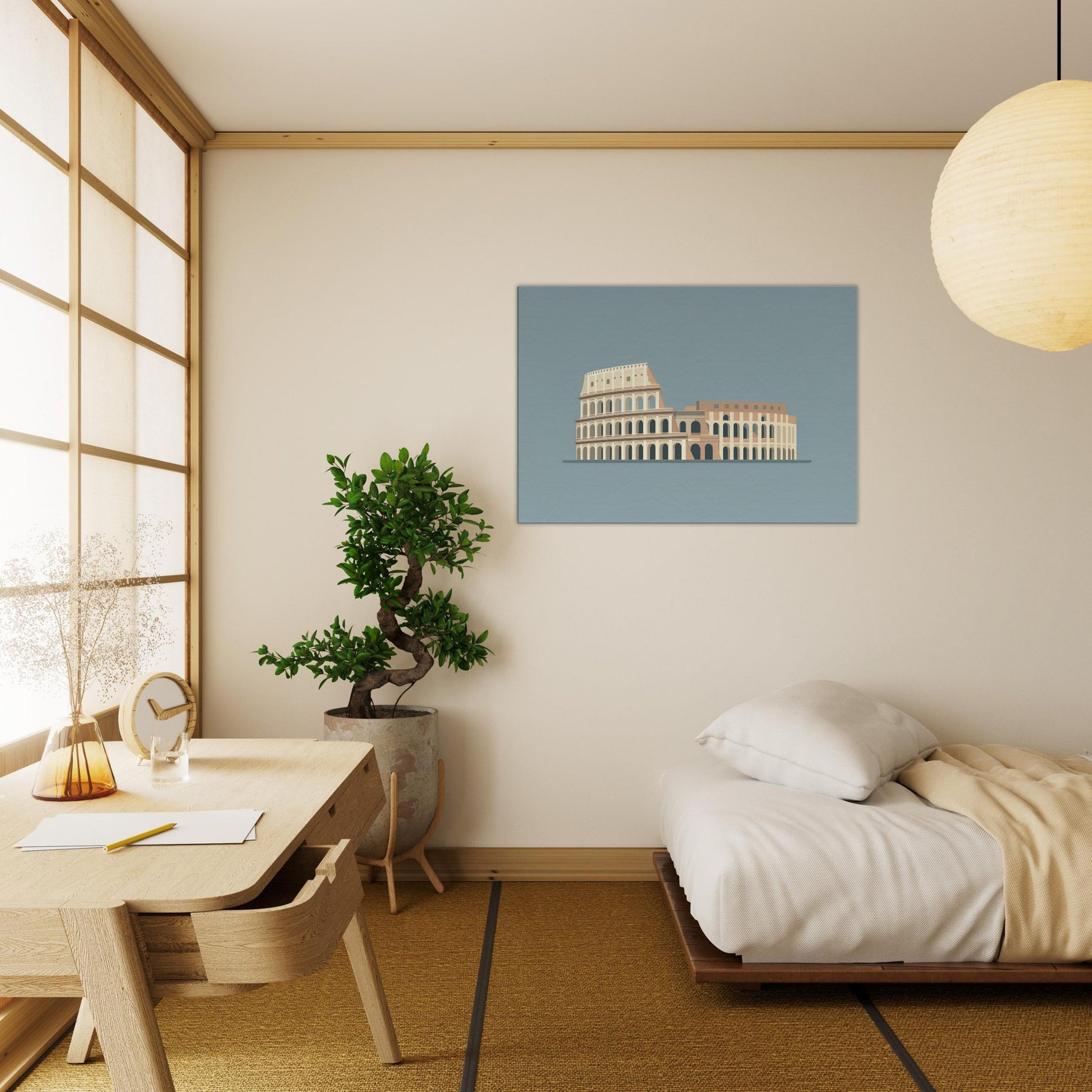 A quiet silhouette of the Colosseum unfolds in clean lines and warm, sunlit tones, inviting calm into any room. The restrained composition preserves memory and weight, letting soft light fall across walls as if you stood among ancient stones at dusk. This piece pairs effortlessly with modern furnishings, creating a serene focal point that feels both timeless and intimate. It breathes through the room, elevating living space with quiet grandeur and a hushed sense of history.