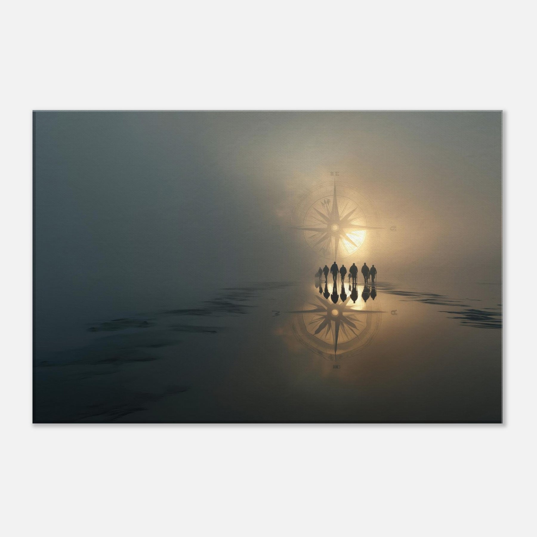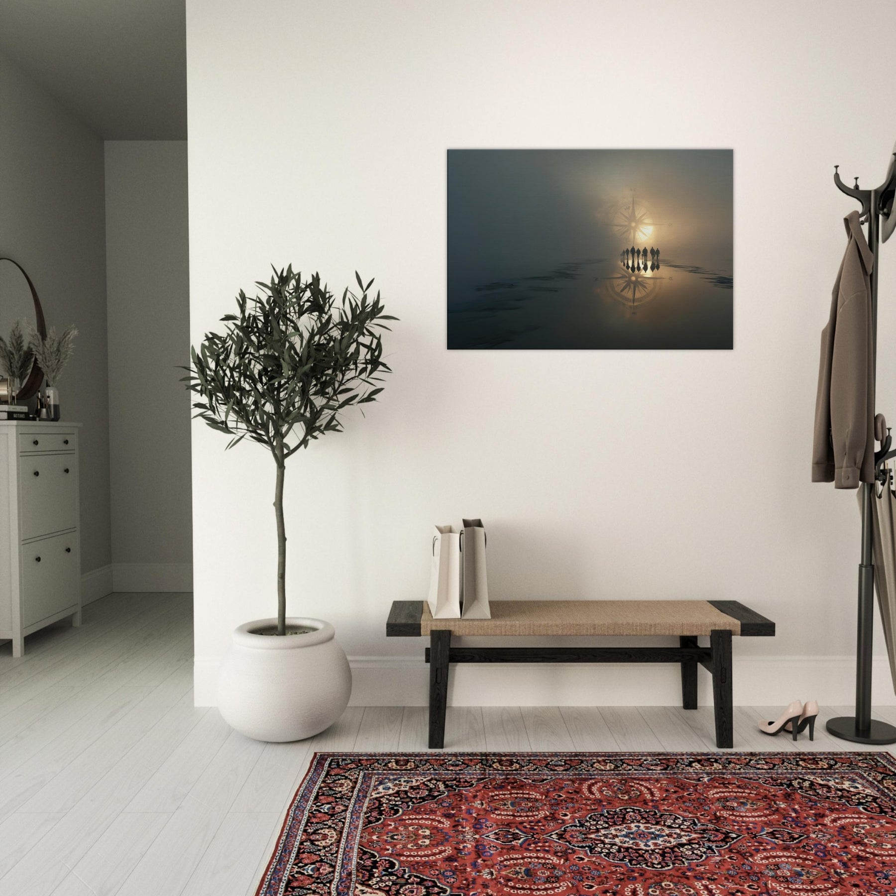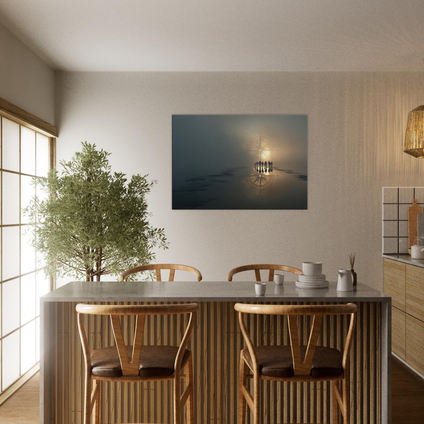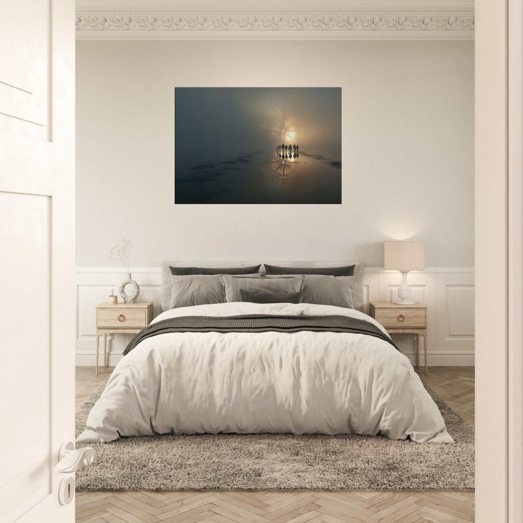 An otherworldly compass rises from the pale fog, its star spoked face pulsing with dawn light as a line of silhouettes moves toward the horizon. The scene lingers between dream and waking, where water becomes glass and echoes mirror their march. This Compass inspired image radiates quiet authority, turning any room into a sanctuary of intention and pause. Its surreal atmosphere invites reflection, conversation, and a soft glow in the evenings, making living spaces feel more expansive, mysterious, and beautifully judged.