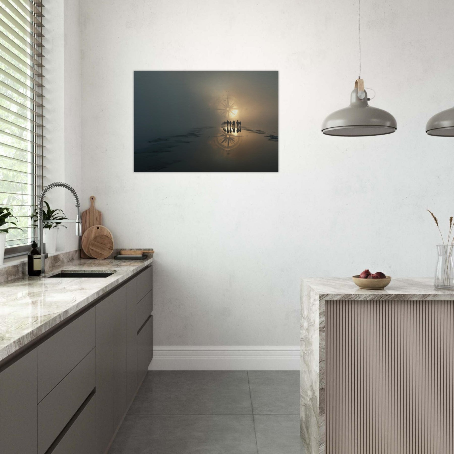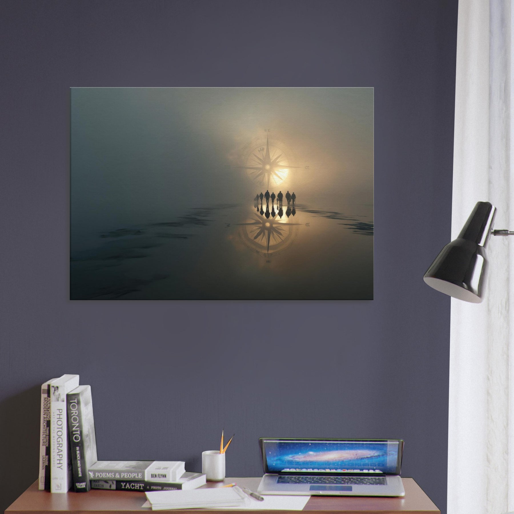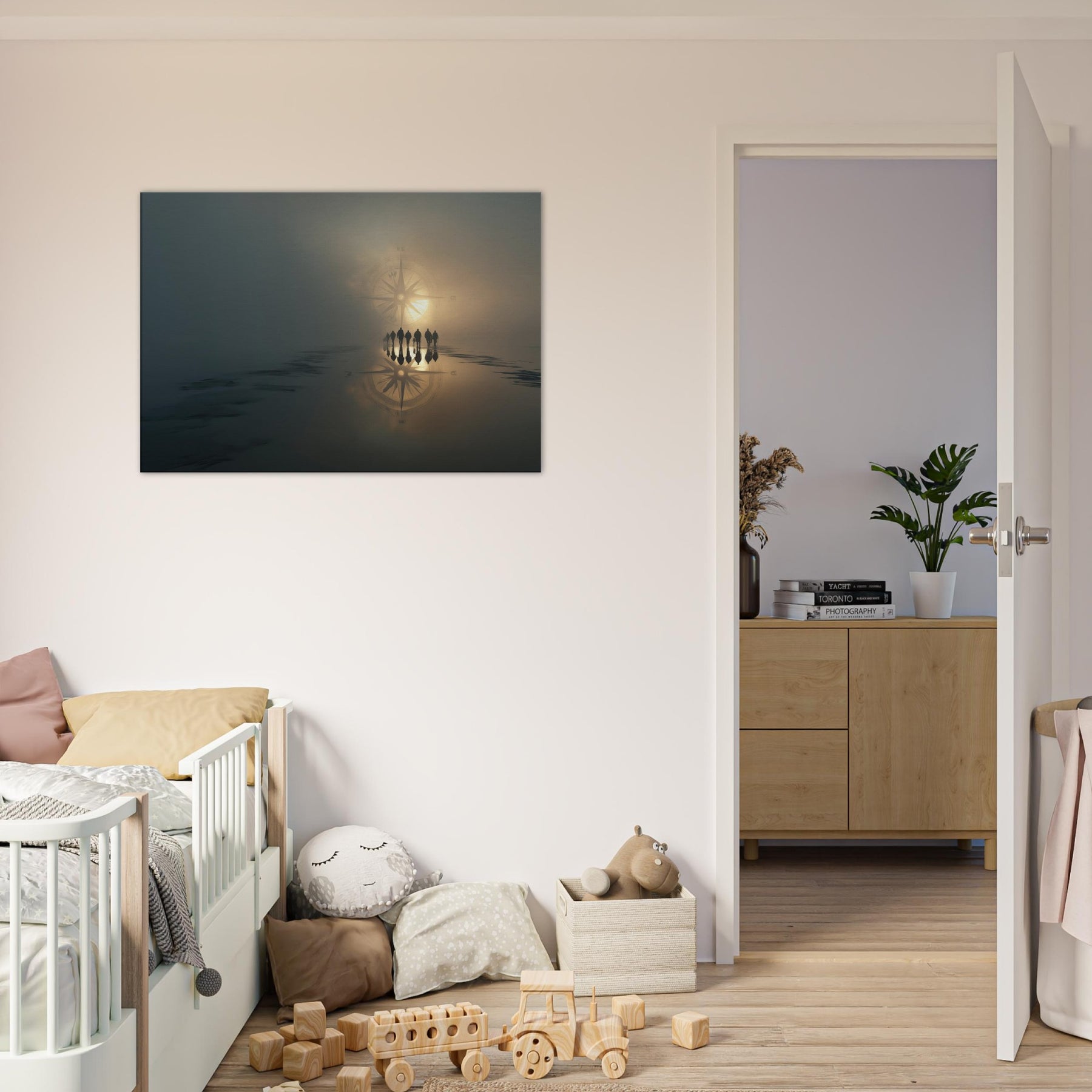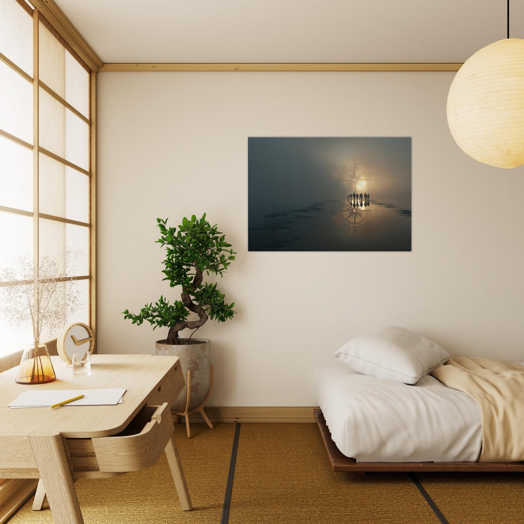 An otherworldly compass rises from the pale fog, its star spoked face pulsing with dawn light as a line of silhouettes moves toward the horizon. The scene lingers between dream and waking, where water becomes glass and echoes mirror their march. This Compass inspired image radiates quiet authority, turning any room into a sanctuary of intention and pause. Its surreal atmosphere invites reflection, conversation, and a soft glow in the evenings, making living spaces feel more expansive, mysterious, and beautifully judged.