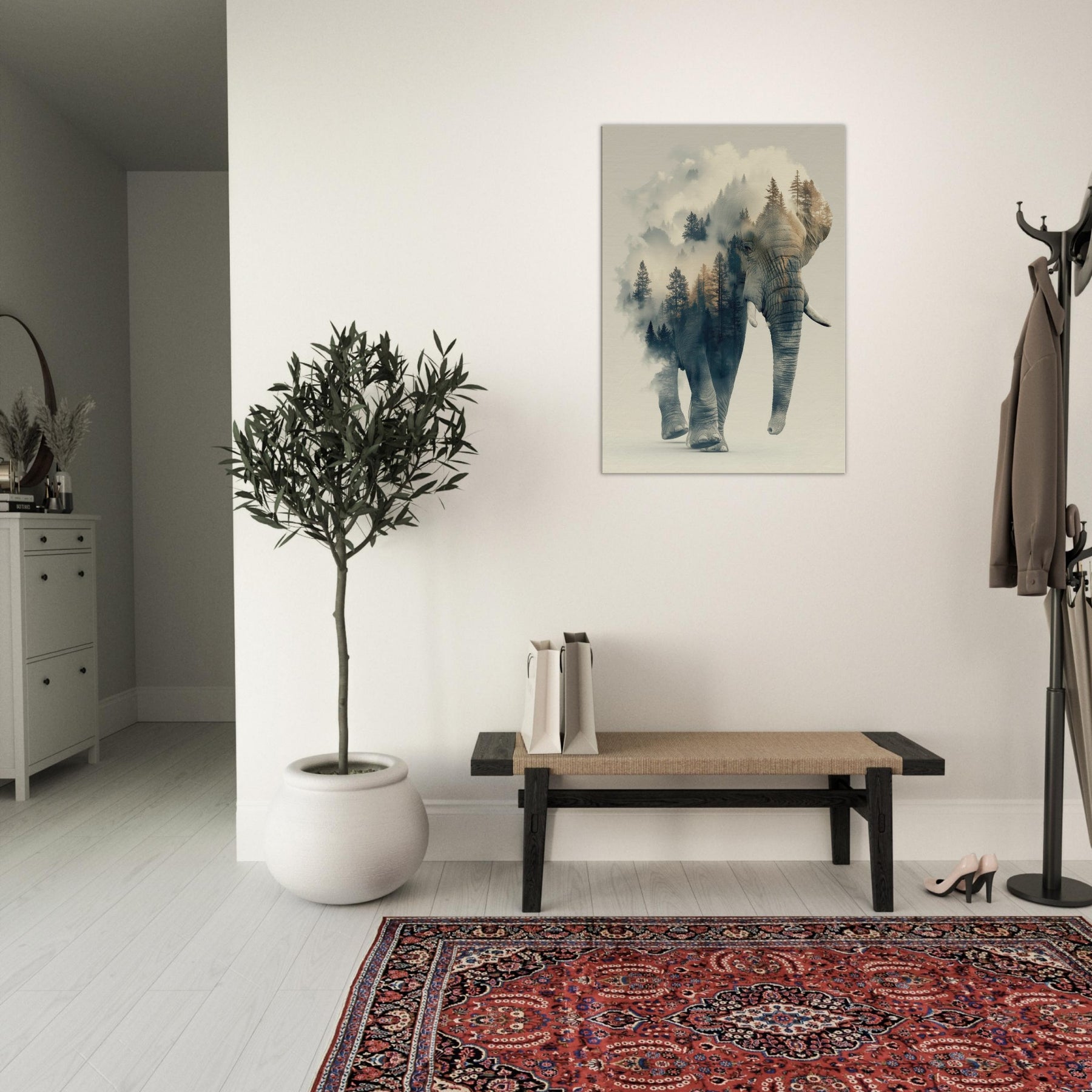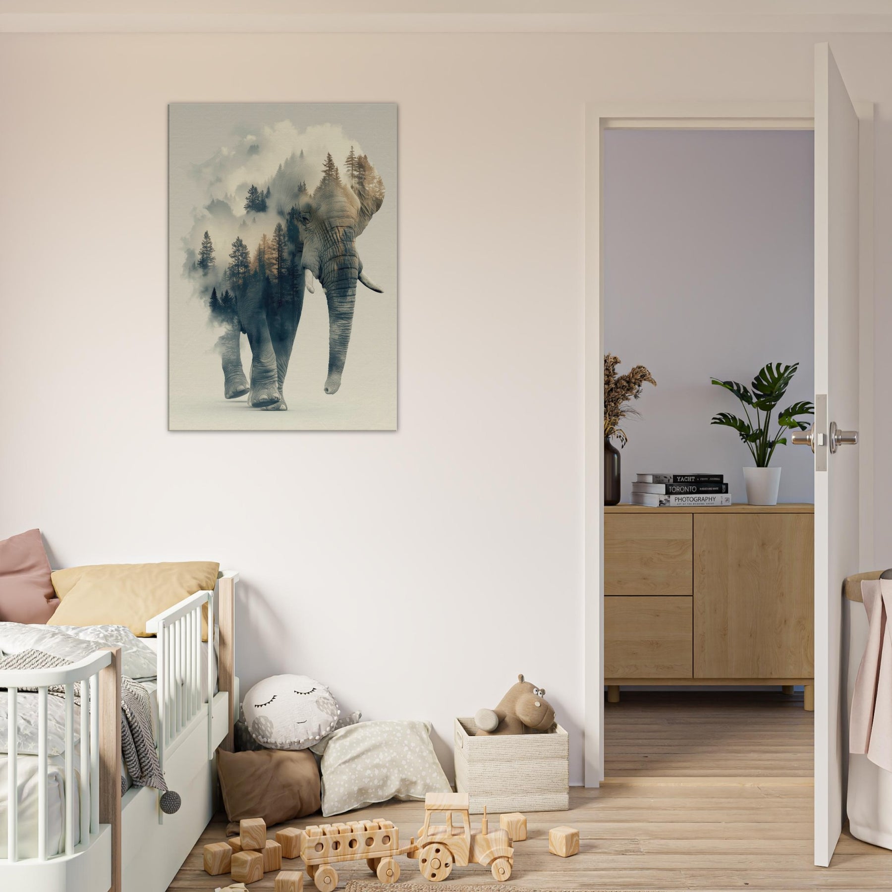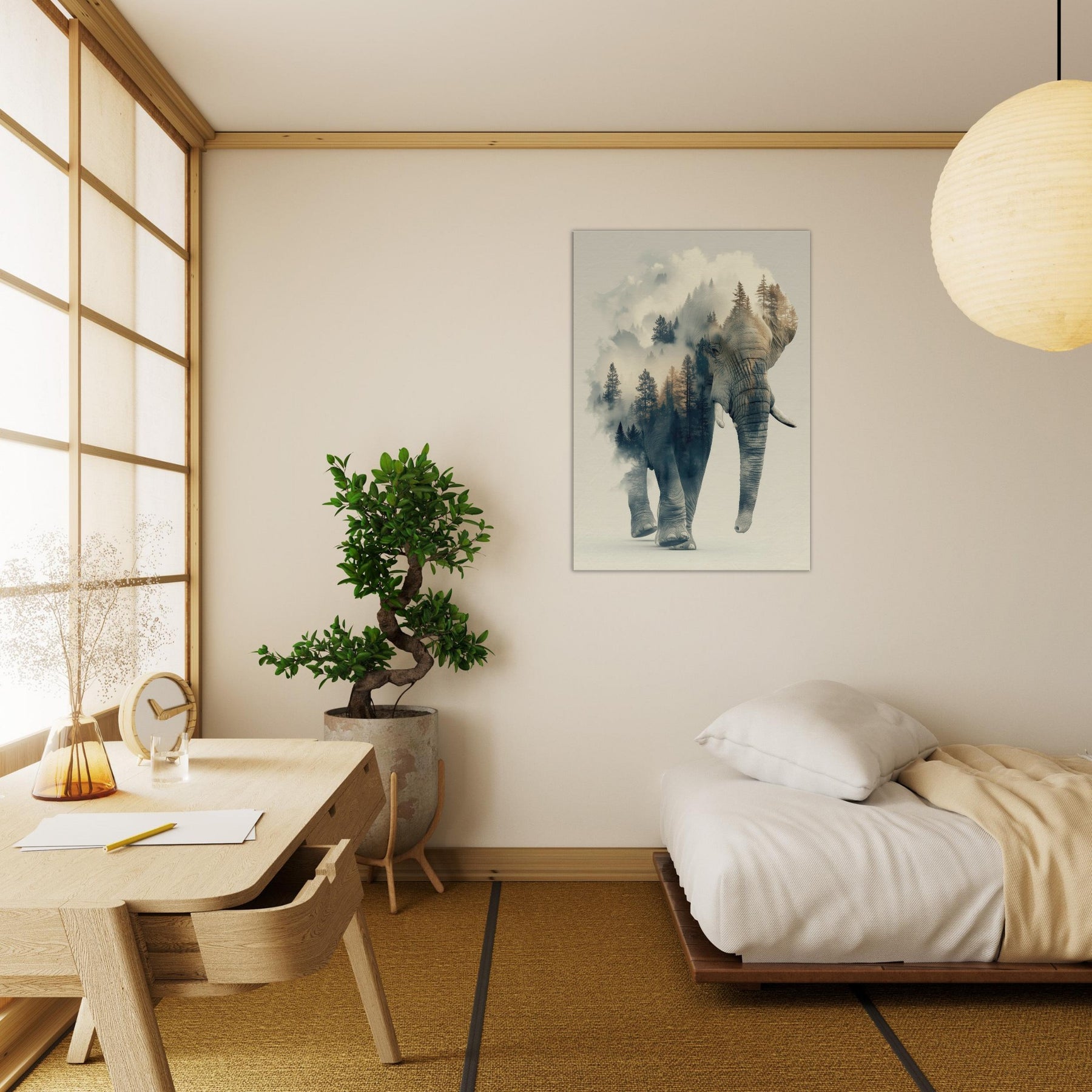 Drift into a quiet realm where the gentle Elephant becomes part forest, part memory. This piece layers the creature against a veil of mist and pine, a double exposure of terrain and soul that breathes with the hush of dawn. The cool blues and warm timber tones invite calm, inviting soft light and quiet conversation in any room. Hang it in a living room or study to anchor a sense of spacious stillness, transforming walls into a doorway to memory, nature, and wonder.