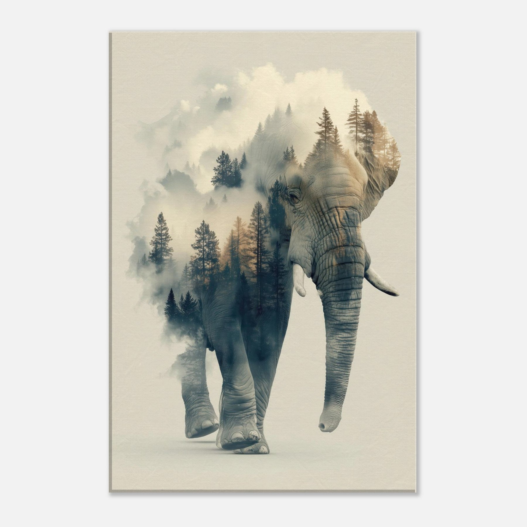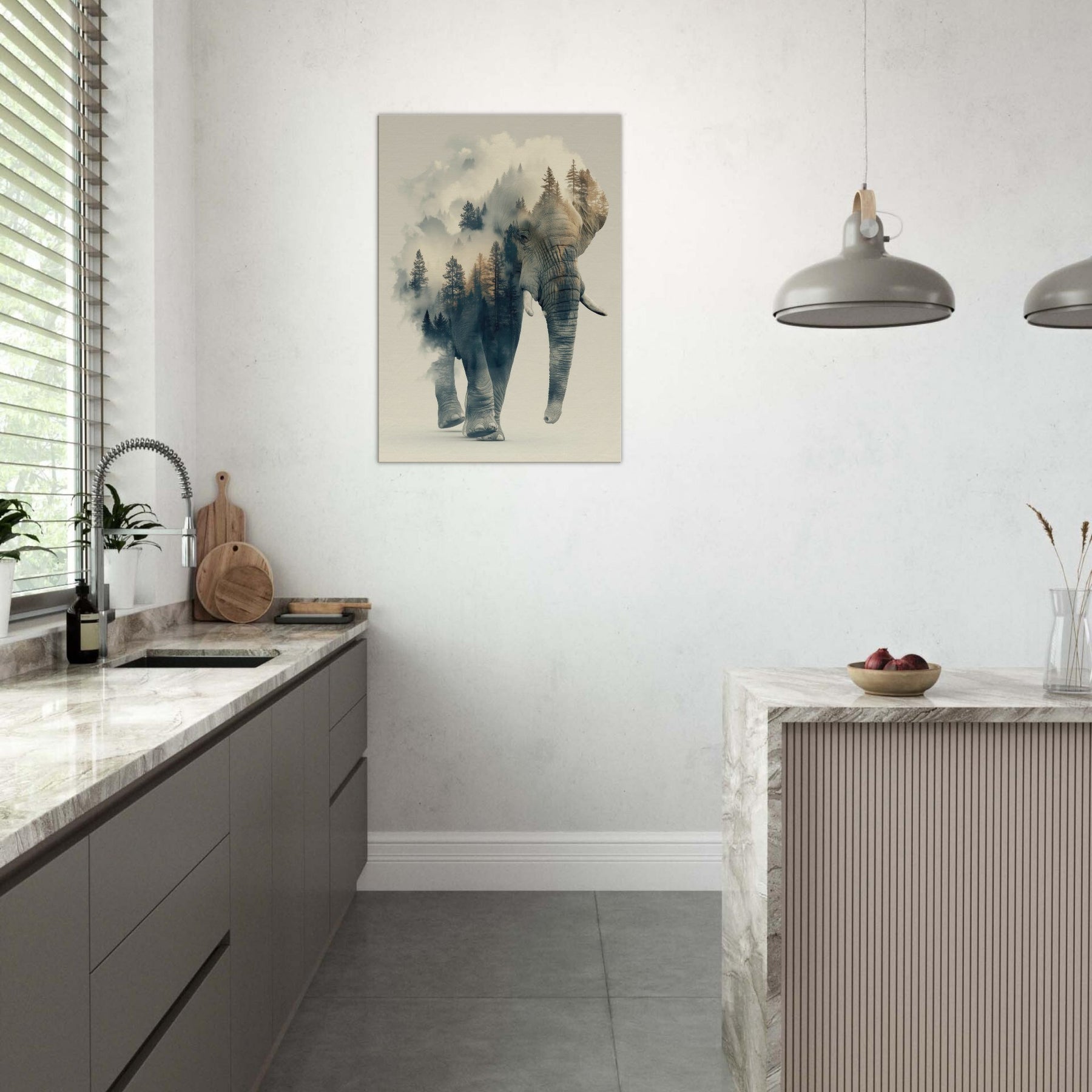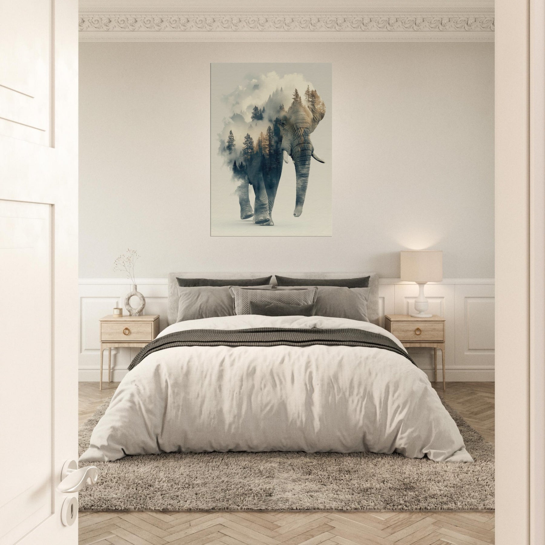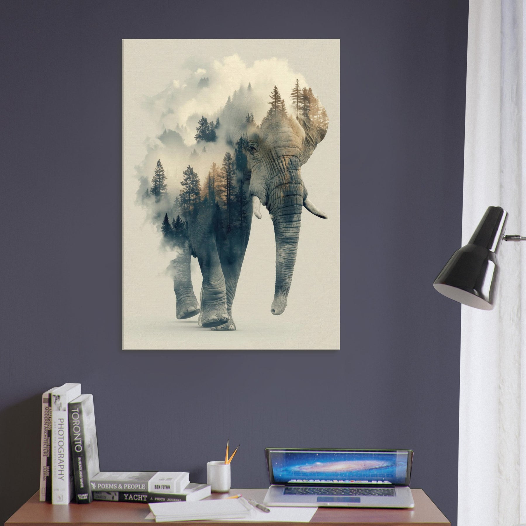 Drift into a quiet realm where the gentle Elephant becomes part forest, part memory. This piece layers the creature against a veil of mist and pine, a double exposure of terrain and soul that breathes with the hush of dawn. The cool blues and warm timber tones invite calm, inviting soft light and quiet conversation in any room. Hang it in a living room or study to anchor a sense of spacious stillness, transforming walls into a doorway to memory, nature, and wonder.