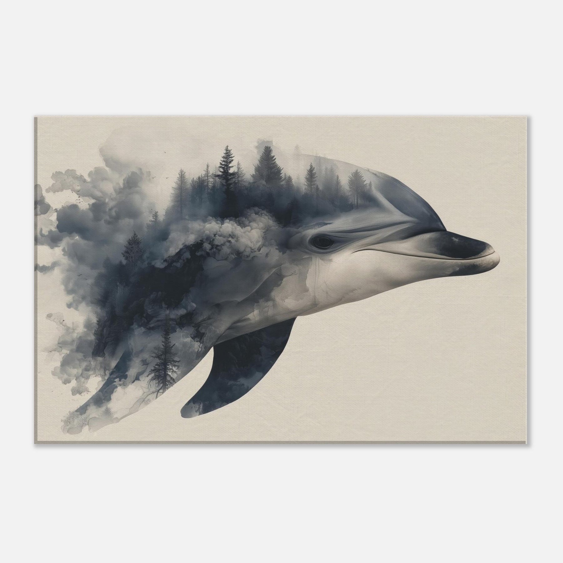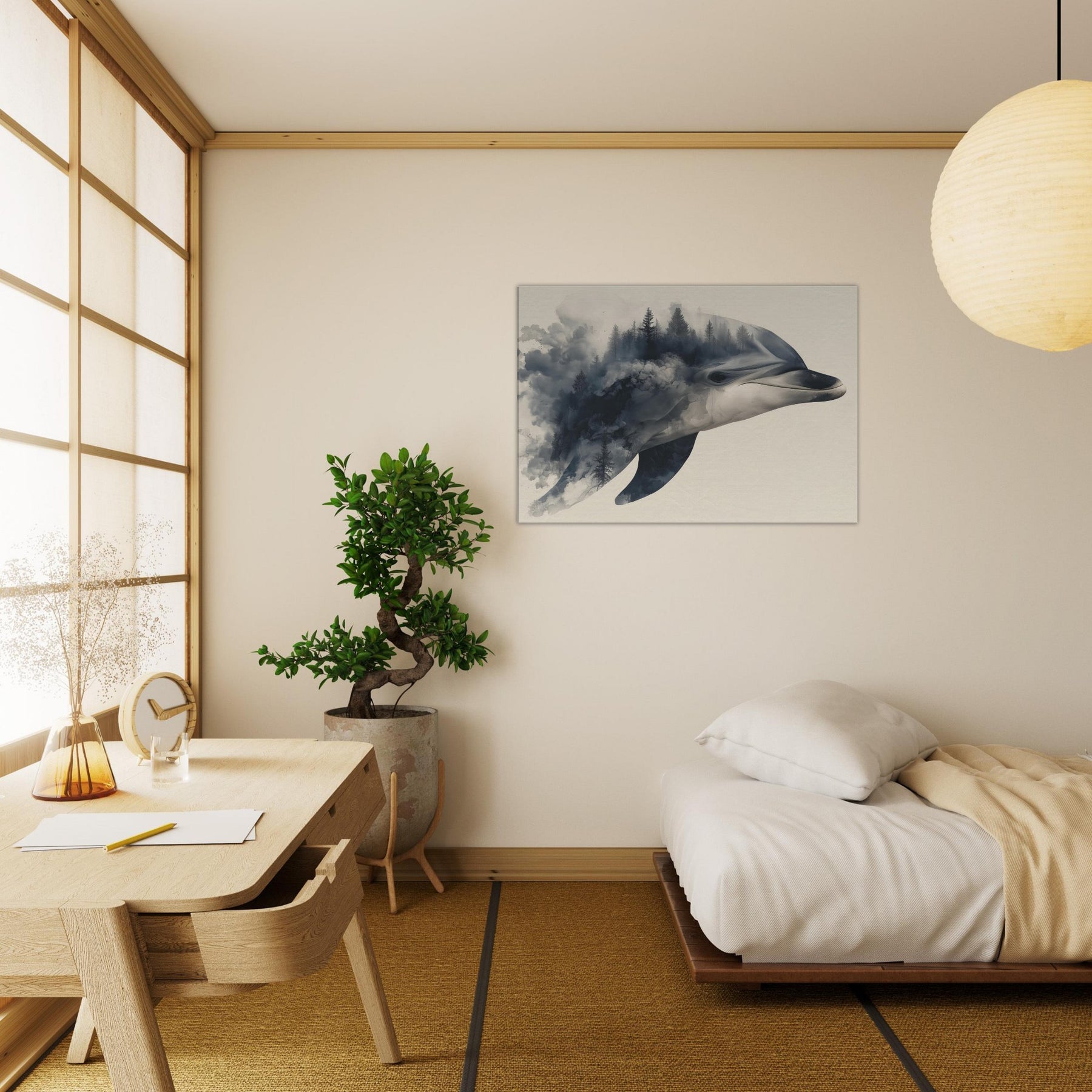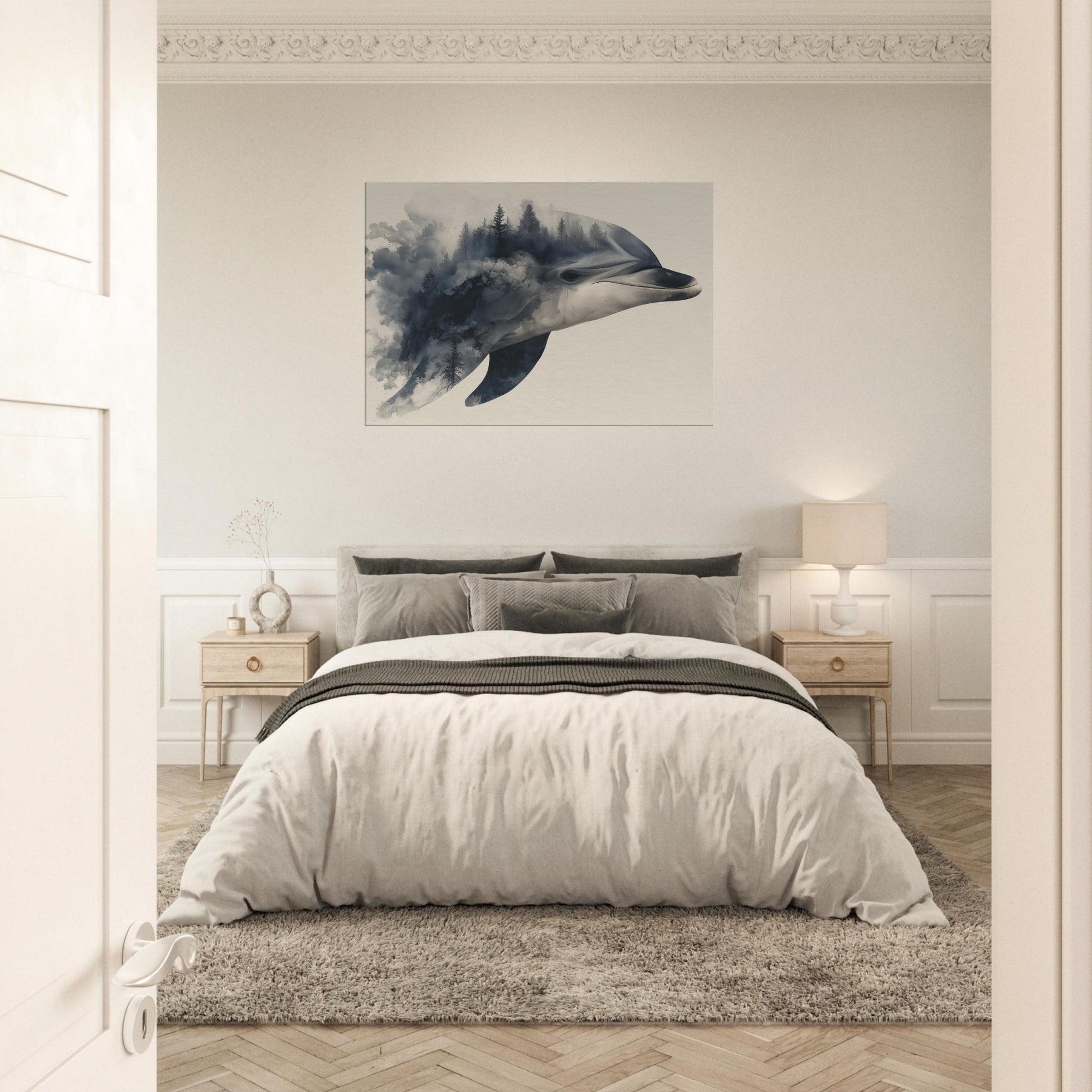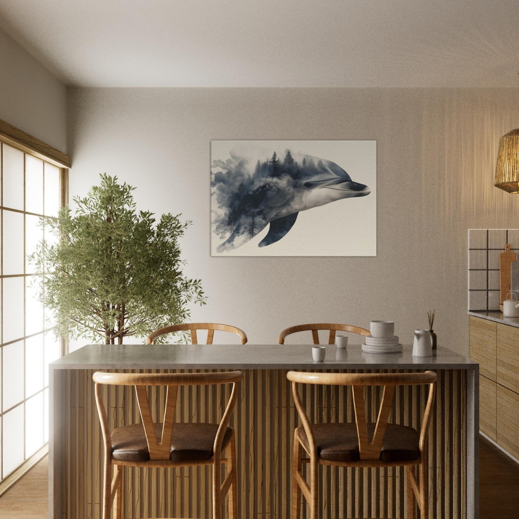 A dreamlike voyage through ink and mist, this piece folds a serene ocean creature into a living forest. The Dolphin appears to glide through smoky pines and hazy clouds, its form dissolving into silhouettes and soft textures. The palette hums in quiet blues and graphite grays, inviting stillness and wonder. Hang it in a lounge or study to conjure a continuous pulse of movement, memory, and calm as if the room itself is breathing with you.