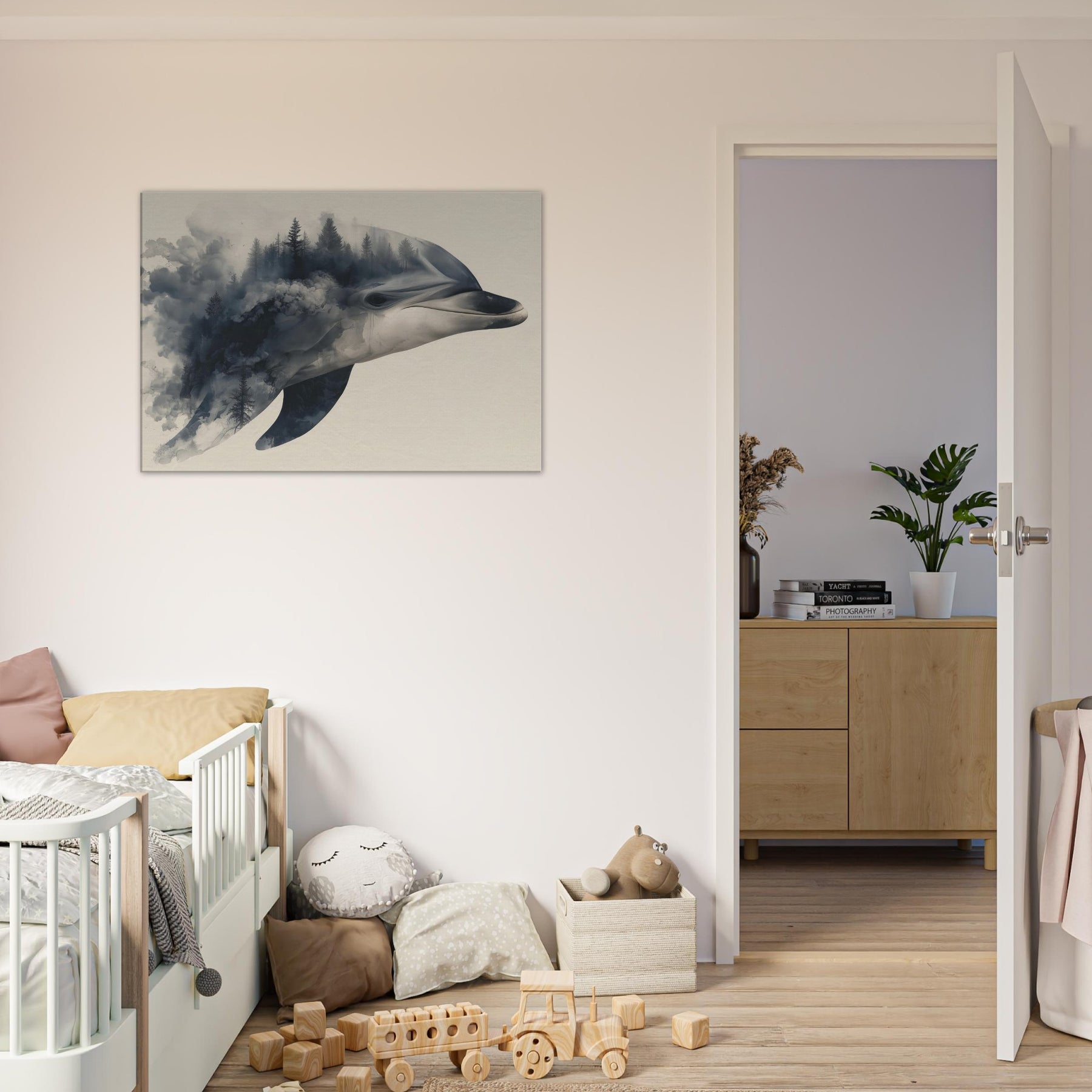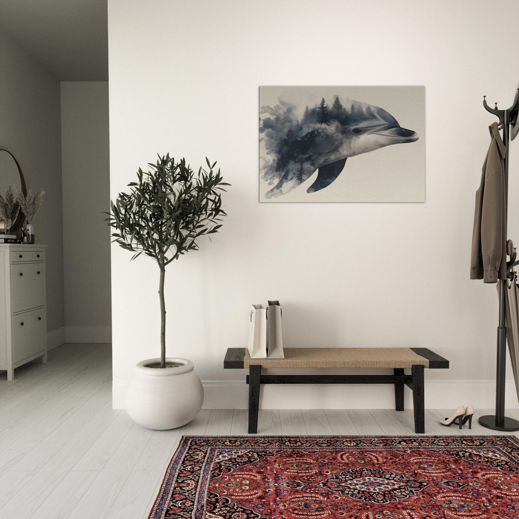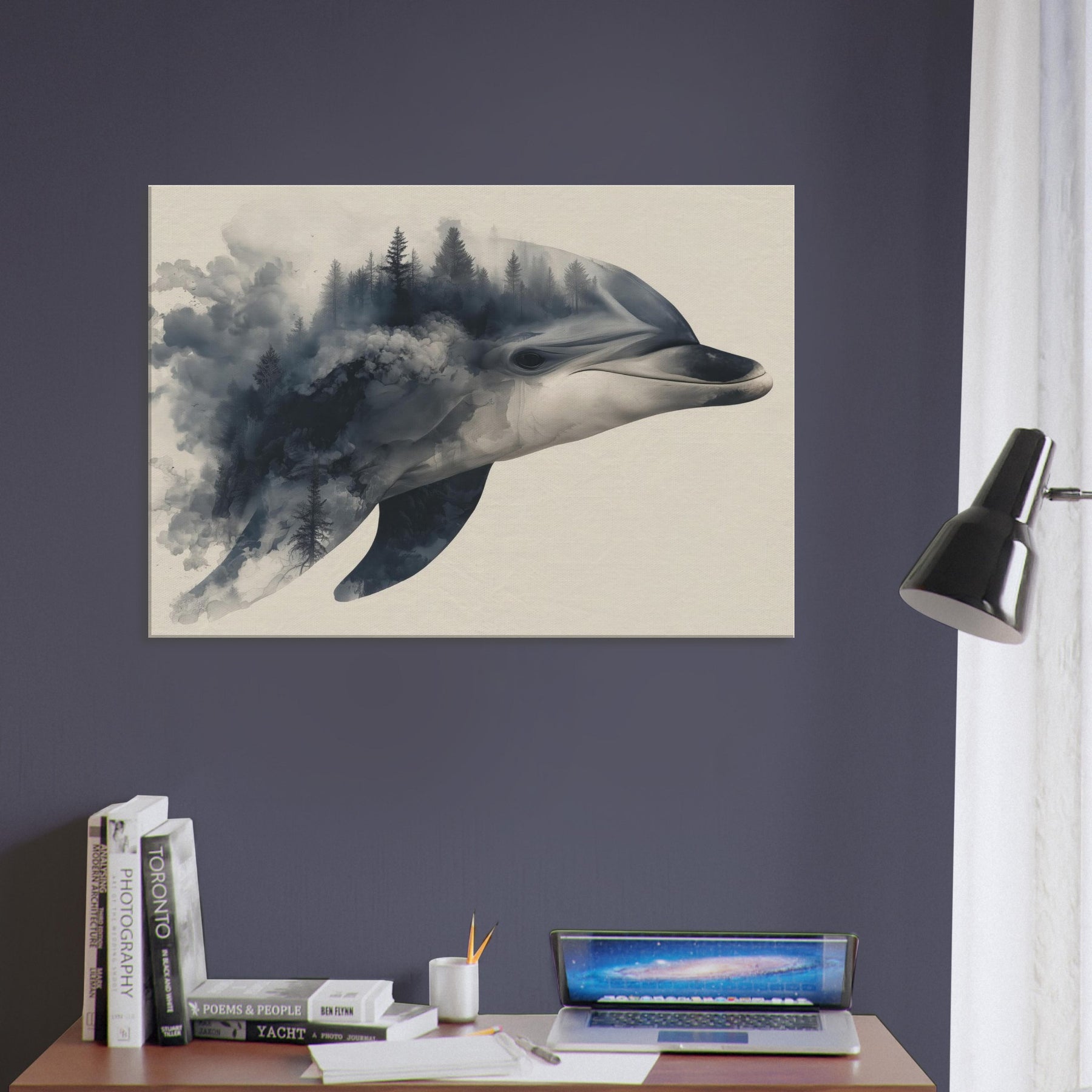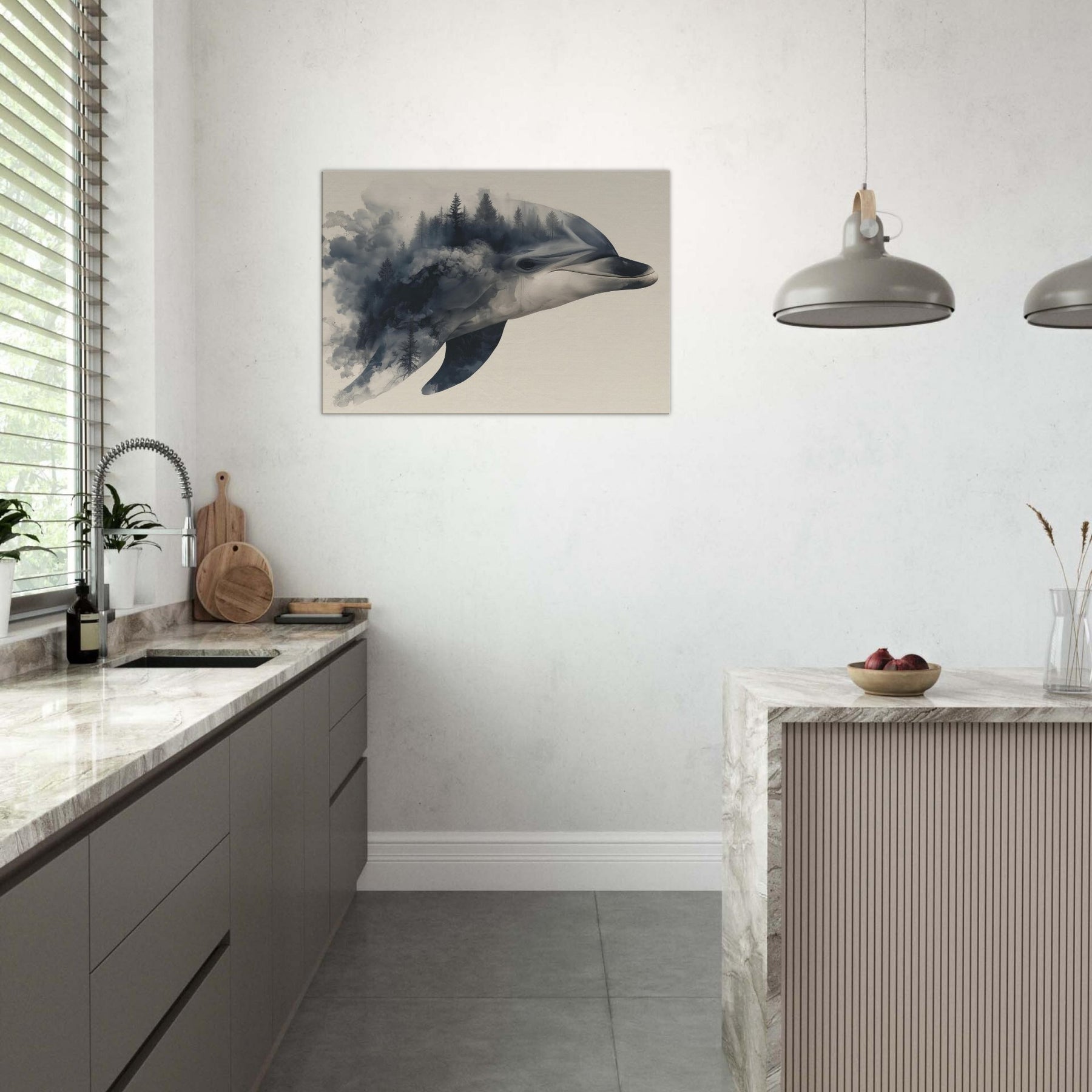 A dreamlike voyage through ink and mist, this piece folds a serene ocean creature into a living forest. The Dolphin appears to glide through smoky pines and hazy clouds, its form dissolving into silhouettes and soft textures. The palette hums in quiet blues and graphite grays, inviting stillness and wonder. Hang it in a lounge or study to conjure a continuous pulse of movement, memory, and calm as if the room itself is breathing with you.