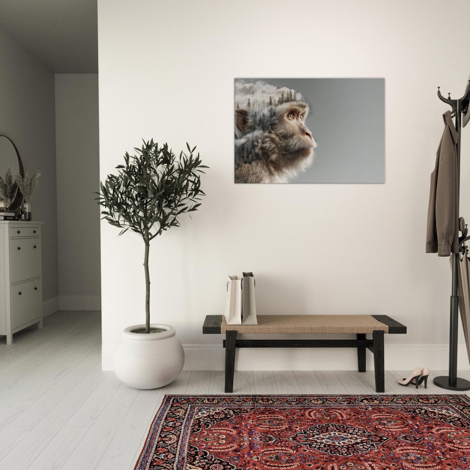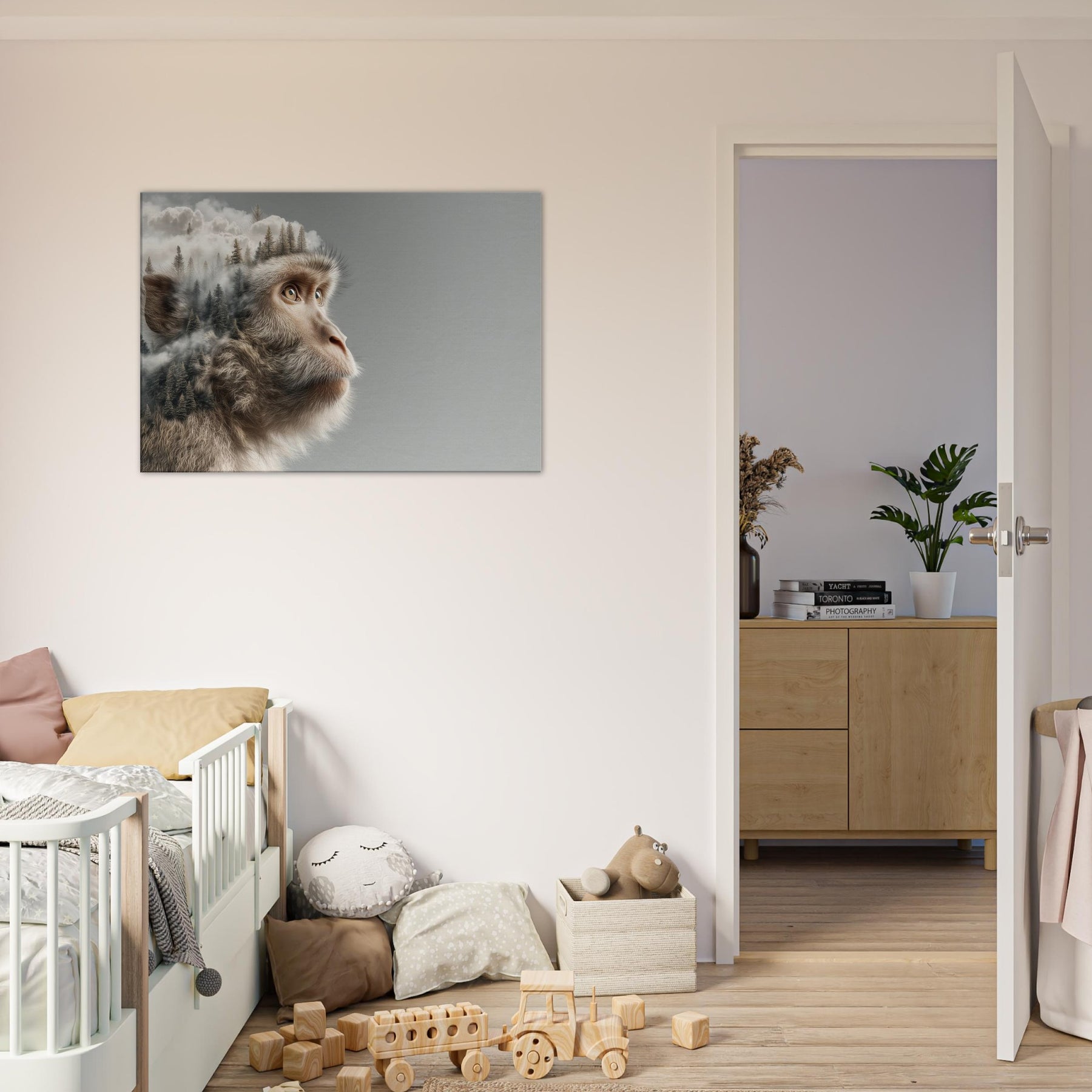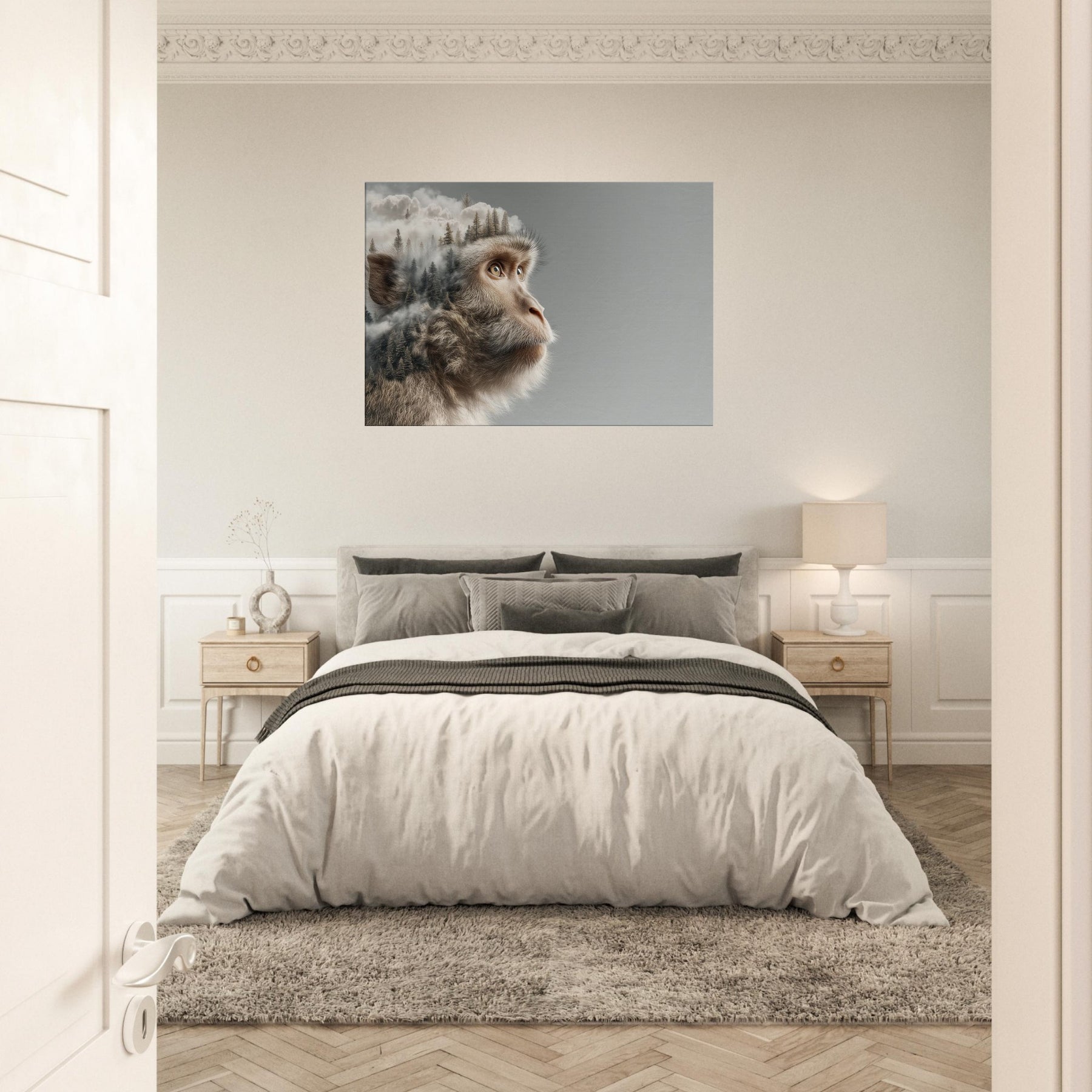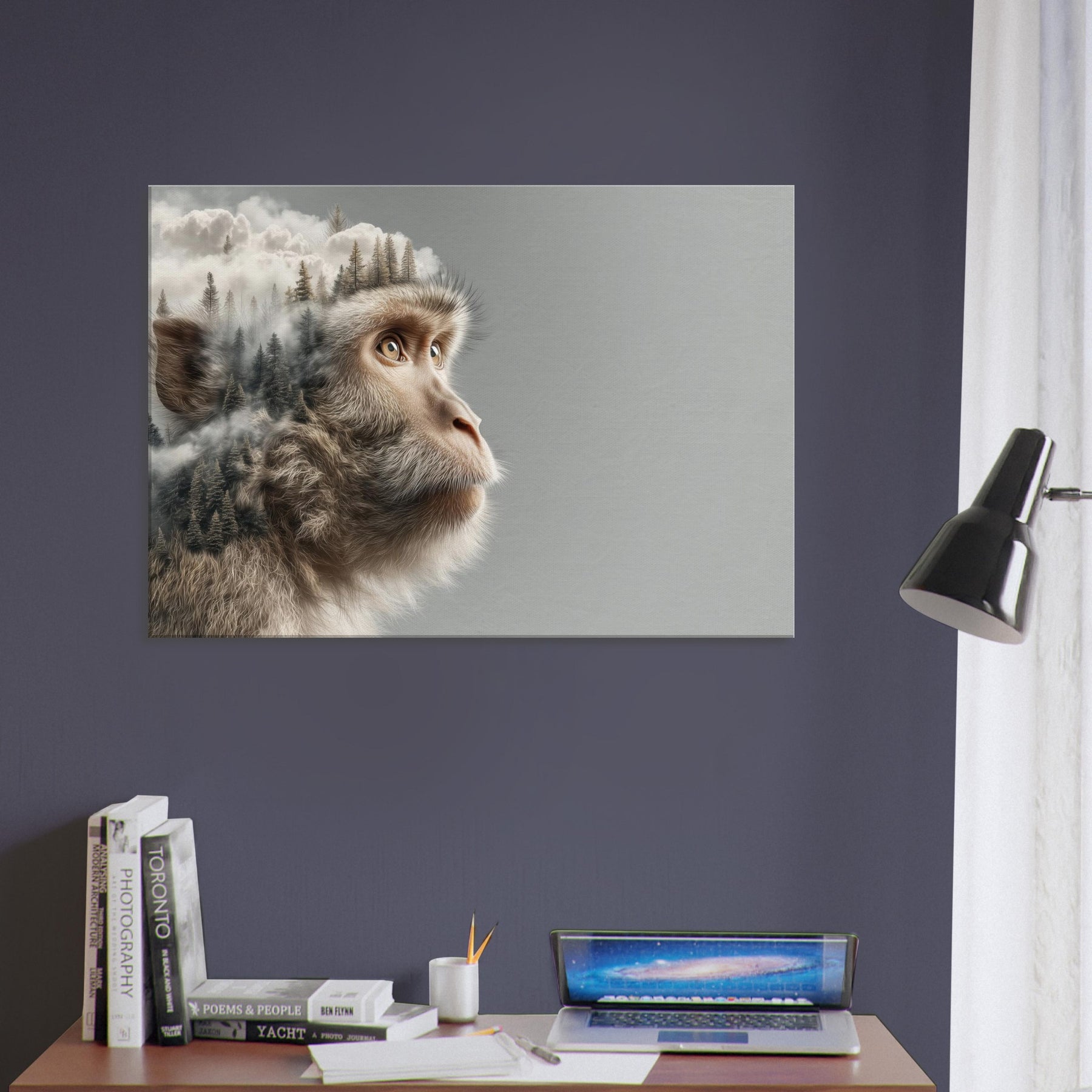 Enter a dream where forest whispers inhabit the contours of a thoughtful Monkey. This surreal composition merges misty pines with a serene gaze, inviting the senses to drift through texture and light. Perfect for a living room or study, it inspires calm, curiosity, and conversation, turning walls into a portal of memory and imagination. Let the creature's contemplative presence anchor your space with quiet wonder.
