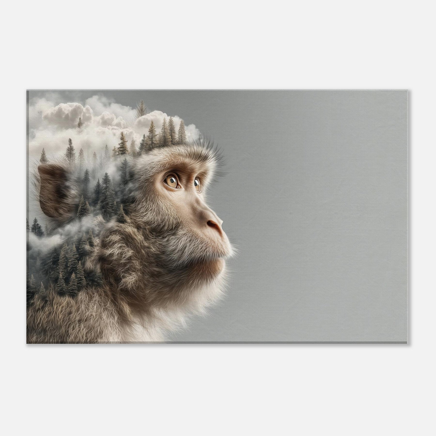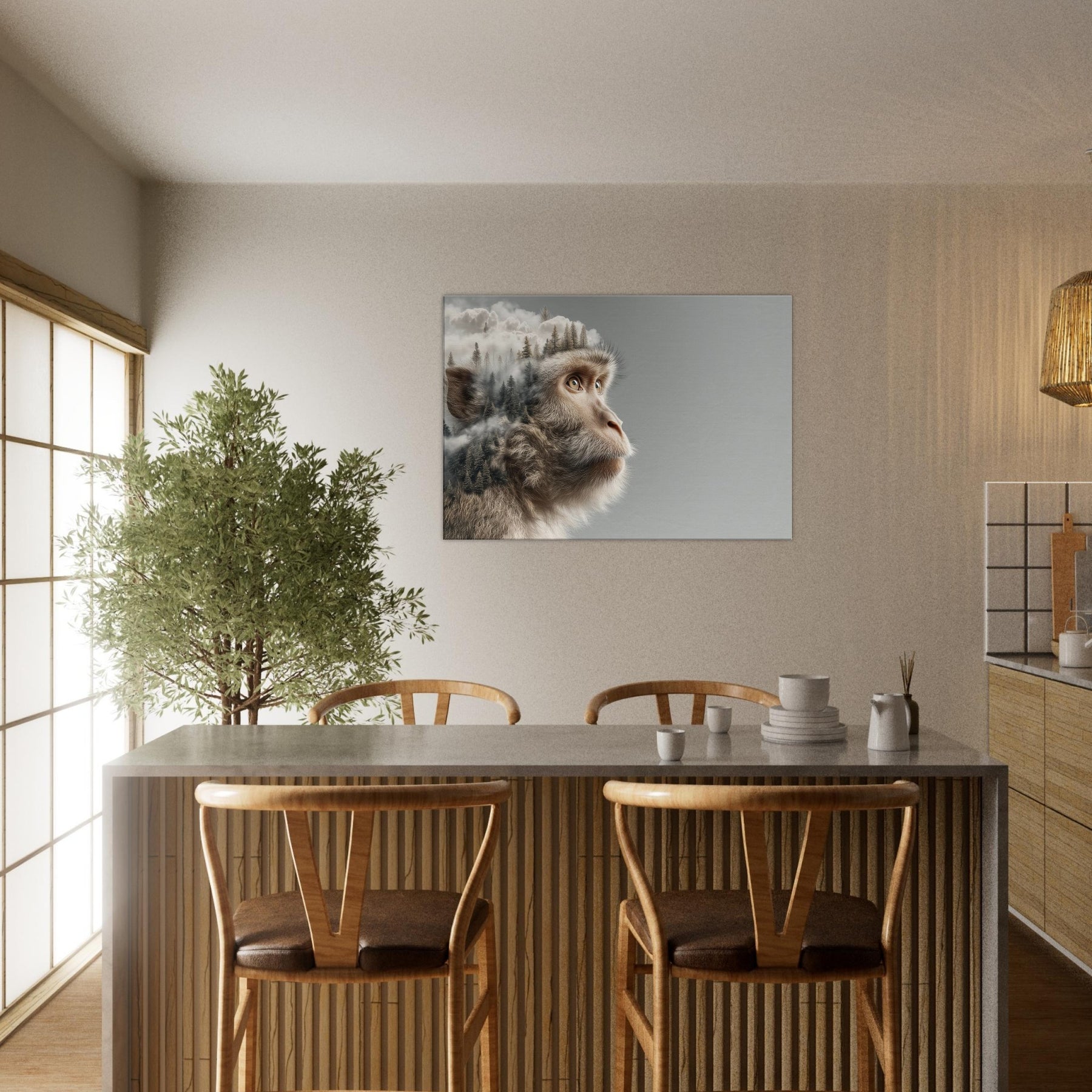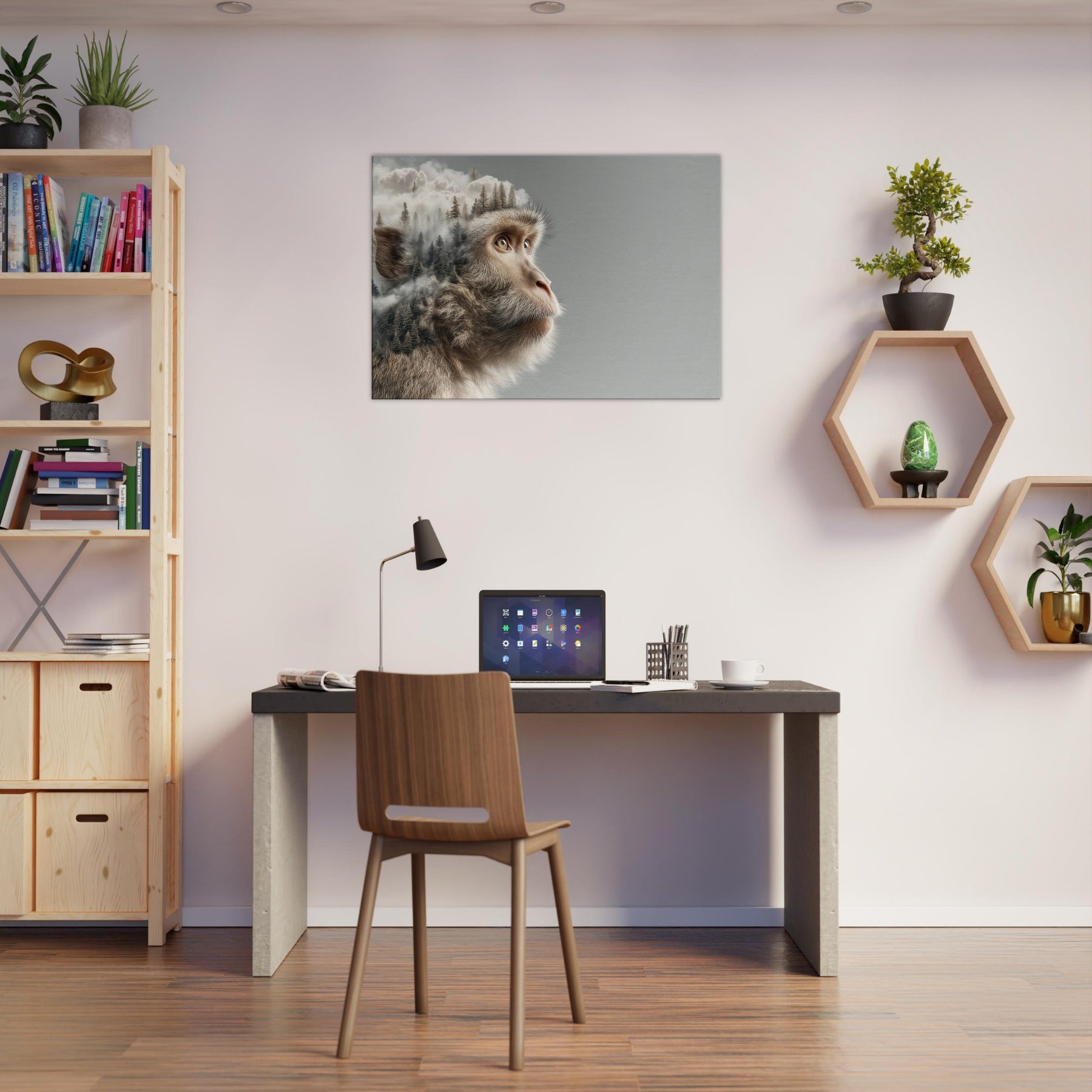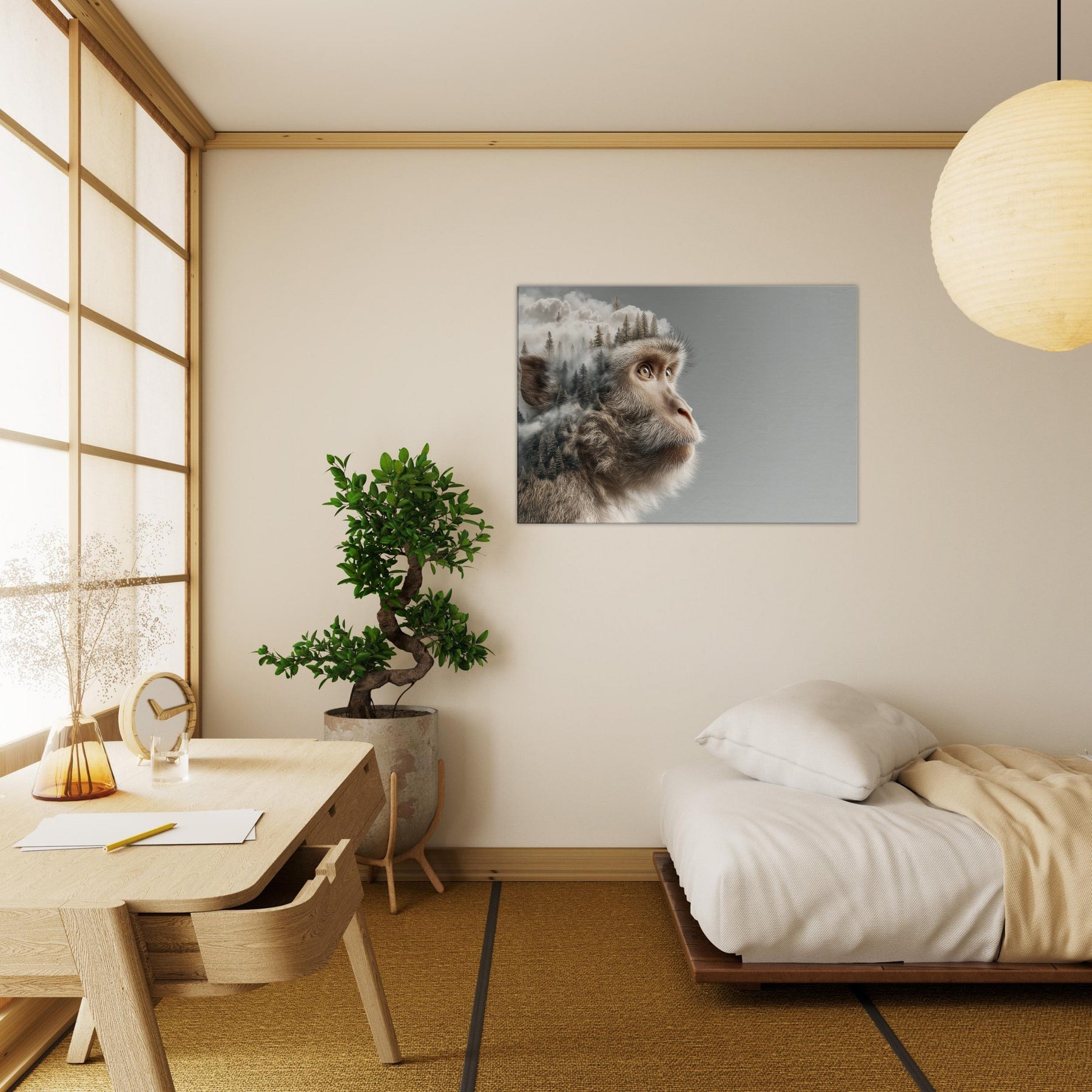 Enter a dream where forest whispers inhabit the contours of a thoughtful Monkey. This surreal composition merges misty pines with a serene gaze, inviting the senses to drift through texture and light. Perfect for a living room or study, it inspires calm, curiosity, and conversation, turning walls into a portal of memory and imagination. Let the creature's contemplative presence anchor your space with quiet wonder.