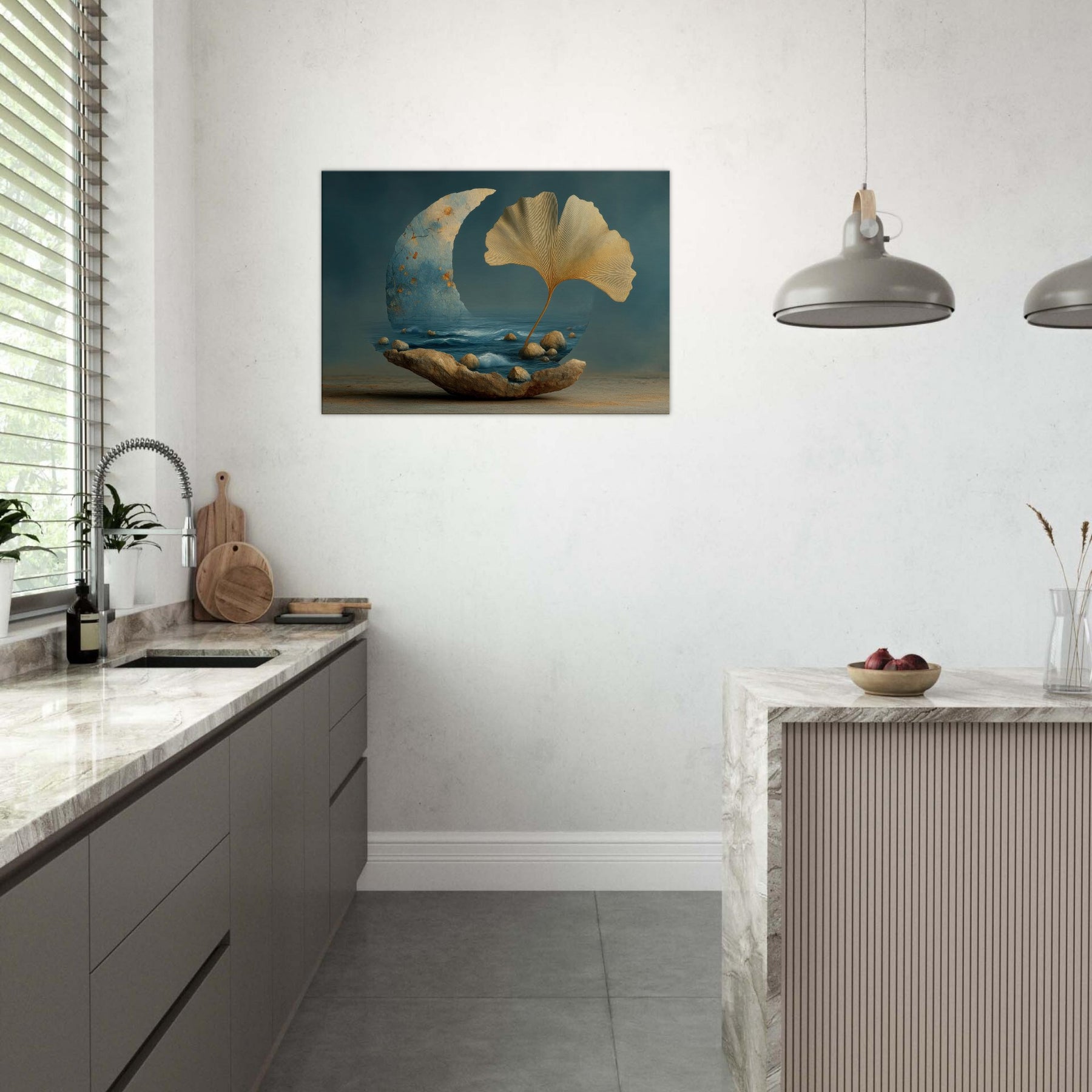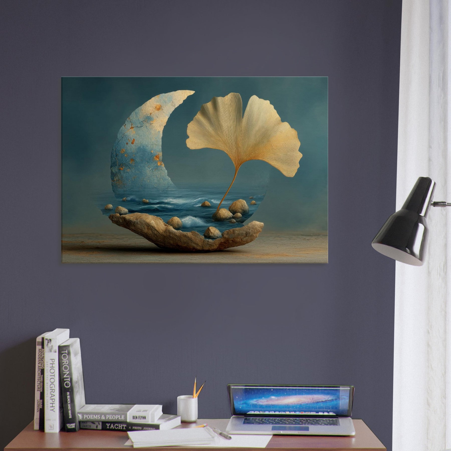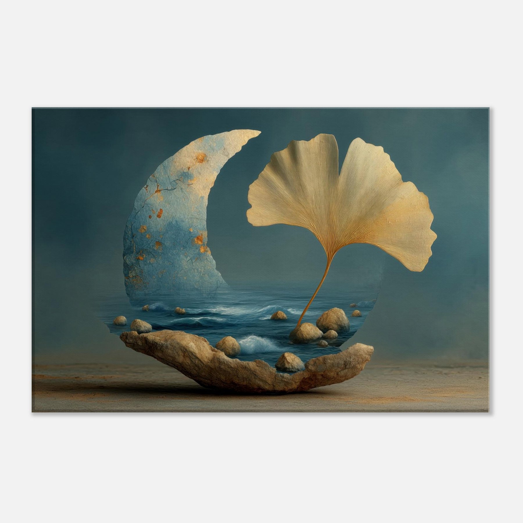 A dreamlike convergence of shore and leaf, this Primary Subject, the Ginkgo Leaf, leaps from stone to sea in a single, suspended moment. Surrounded by a soft mineral dusk, the image folds nature into a surreal arch where memory and weather meet. The leaf's delicate veins glow like tide washed gullies, inviting quiet contemplation. Hang it in a living room or study to conjure a sanctuary of calm, where earthy textures, luminous water, and the sinuous line of nature fuse into a luminous, timeless mood.