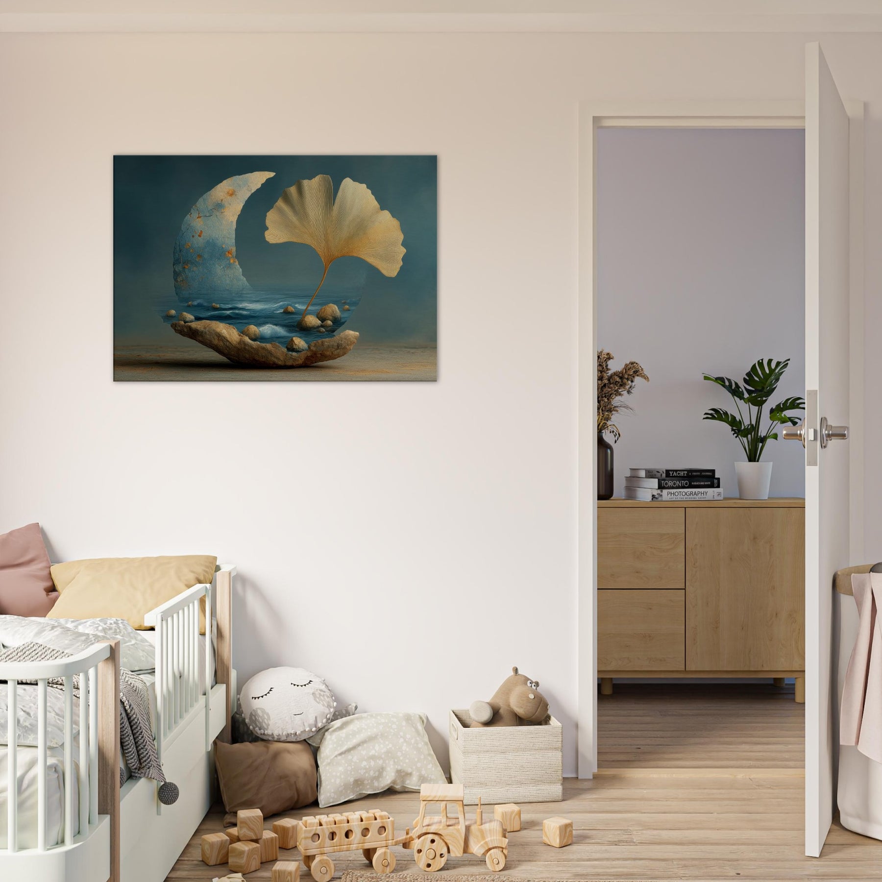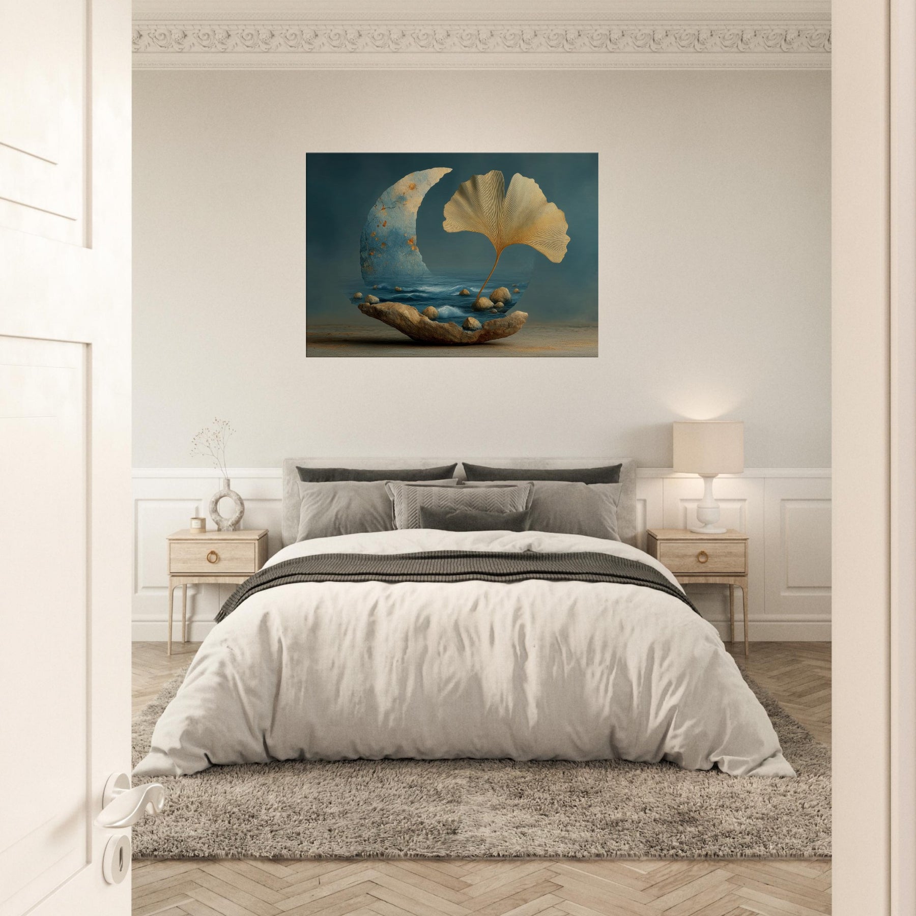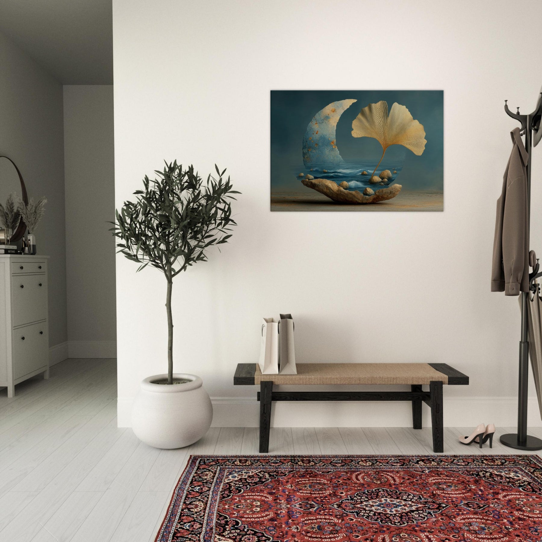 A dreamlike convergence of shore and leaf, this Primary Subject, the Ginkgo Leaf, leaps from stone to sea in a single, suspended moment. Surrounded by a soft mineral dusk, the image folds nature into a surreal arch where memory and weather meet. The leaf's delicate veins glow like tide washed gullies, inviting quiet contemplation. Hang it in a living room or study to conjure a sanctuary of calm, where earthy textures, luminous water, and the sinuous line of nature fuse into a luminous, timeless mood.