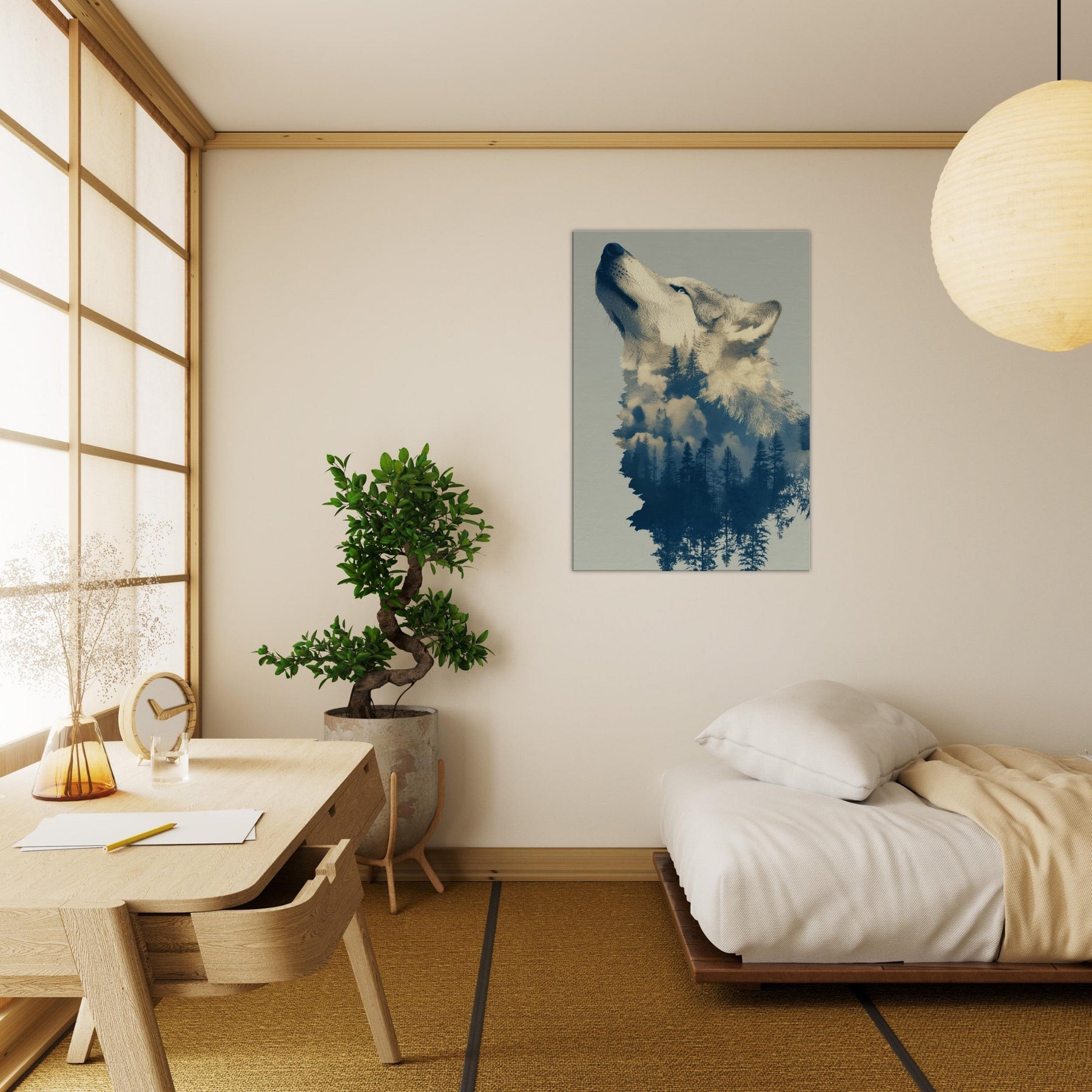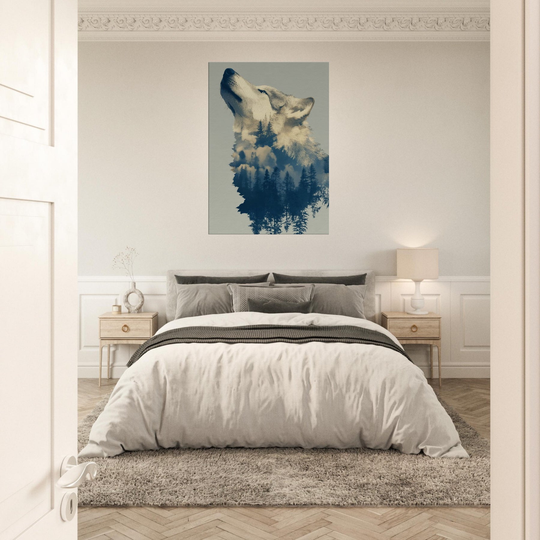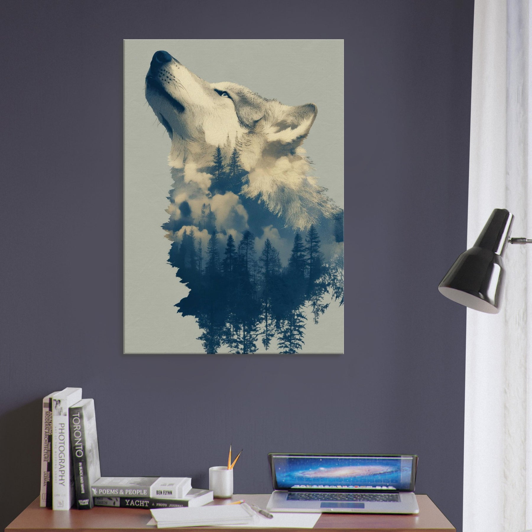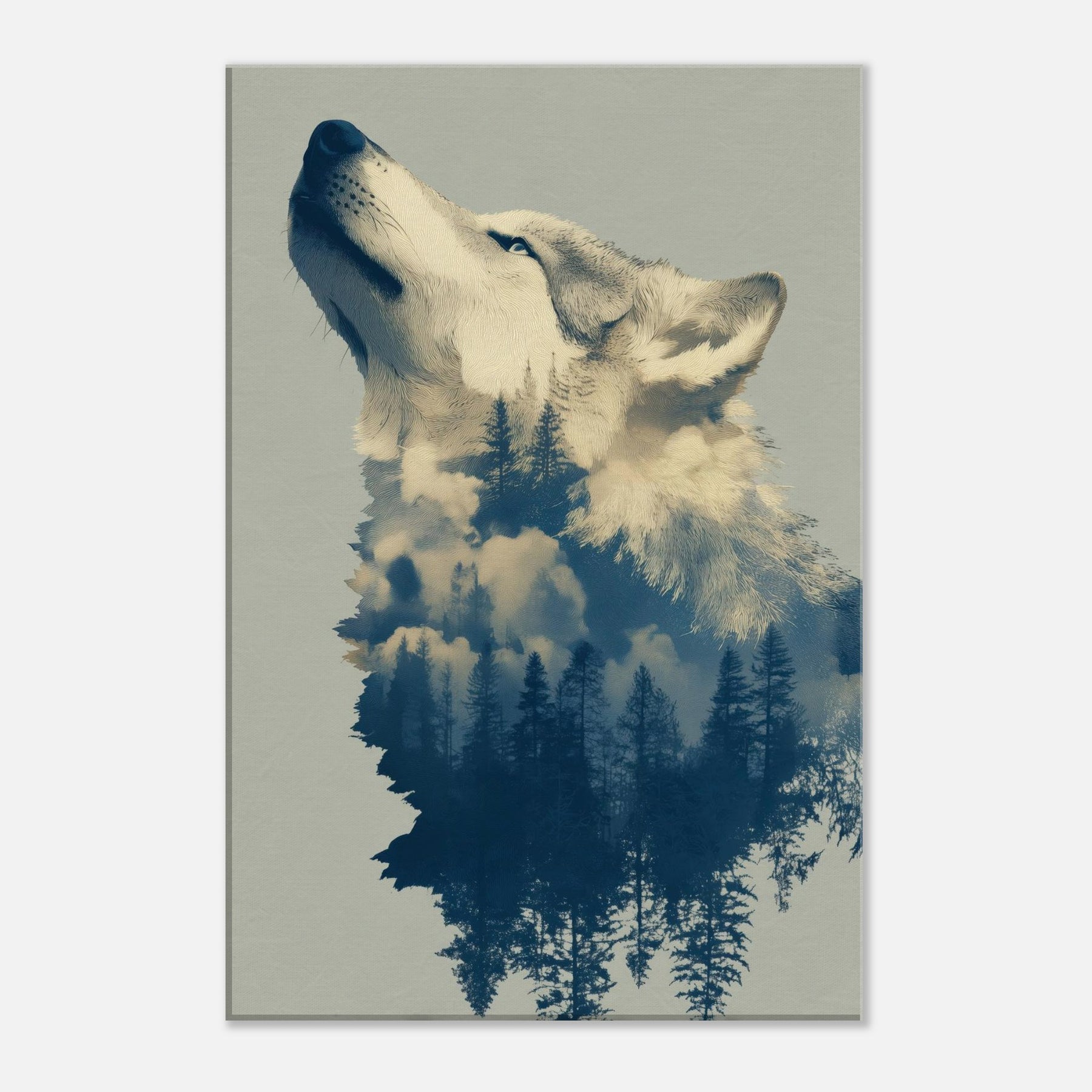 Under a moonlit canopy, this Wolf dissolves into a forest of tall pines and drift of clouds, inviting a dreamlike stillness into any room. The surreal composition blends embers of color with cool blues, echoing the hush of dawn and the scent of pine. Hang it in a living area or bedroom to cultivate a tranquil, cinematic mood the Wolf becomes both guardian and whisperer of your space, transforming walls into a nocturnal sanctuary.