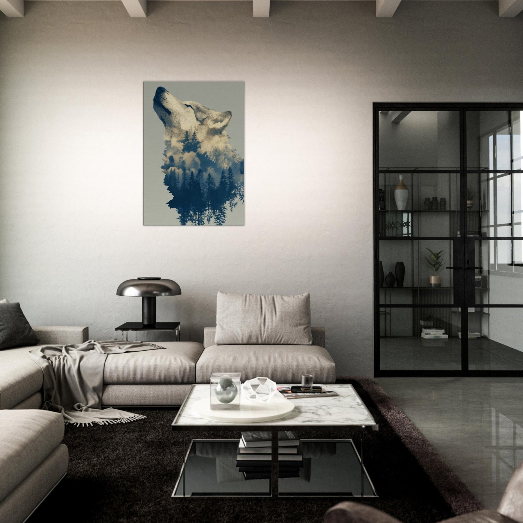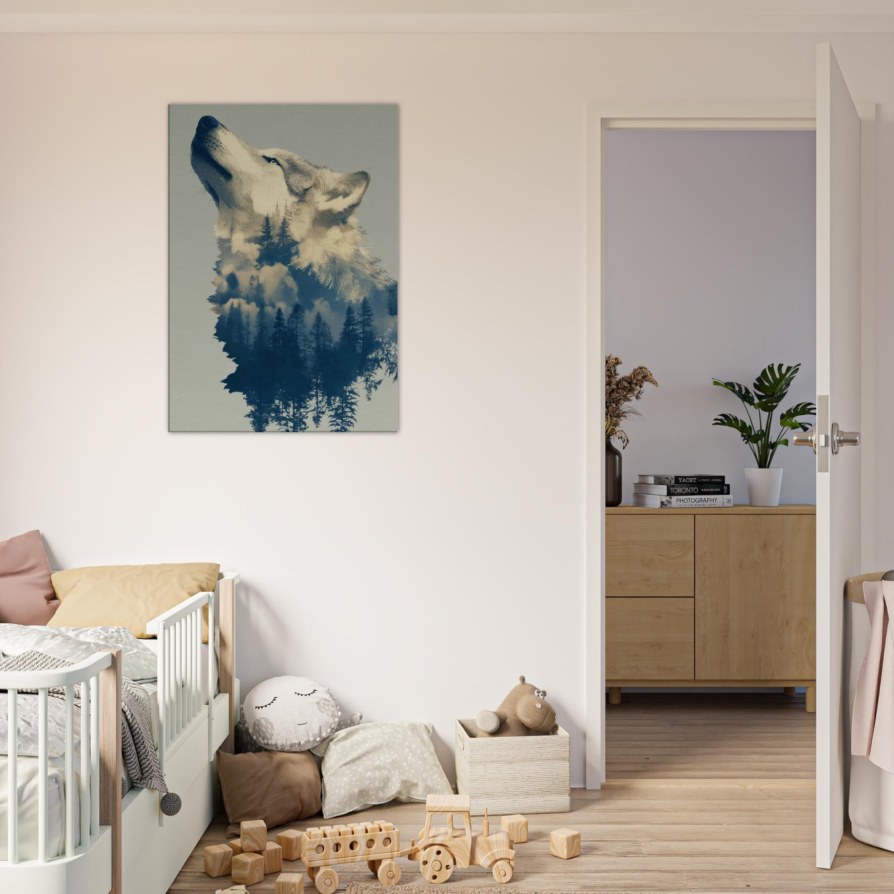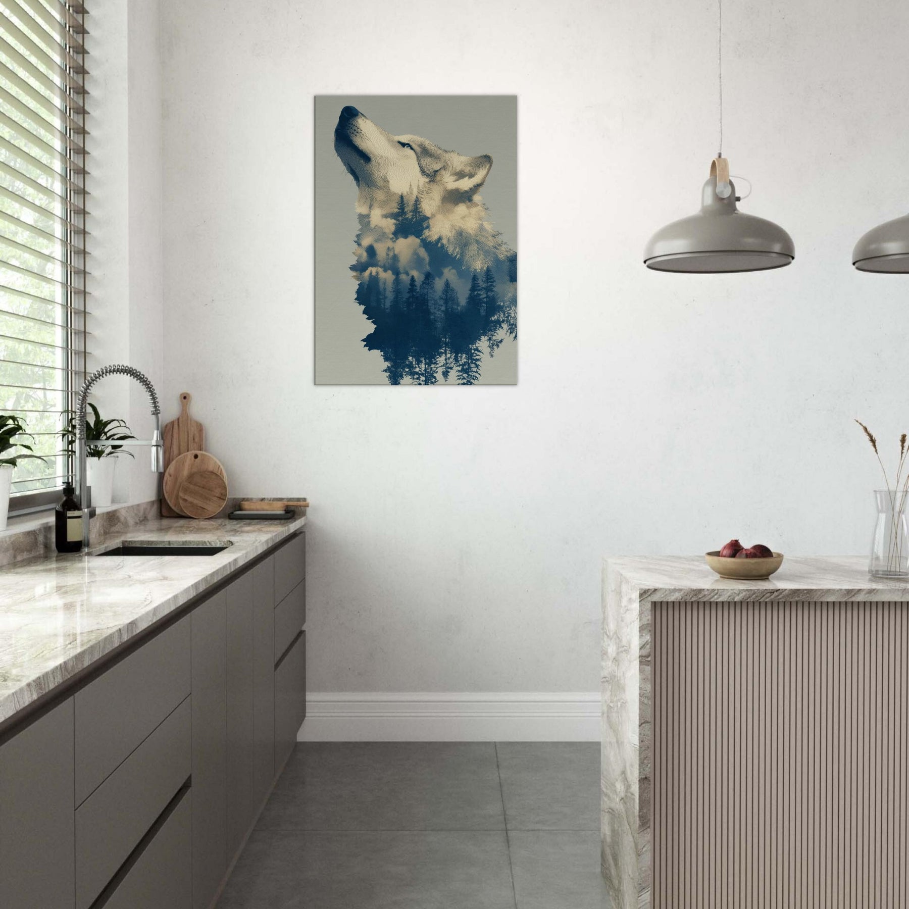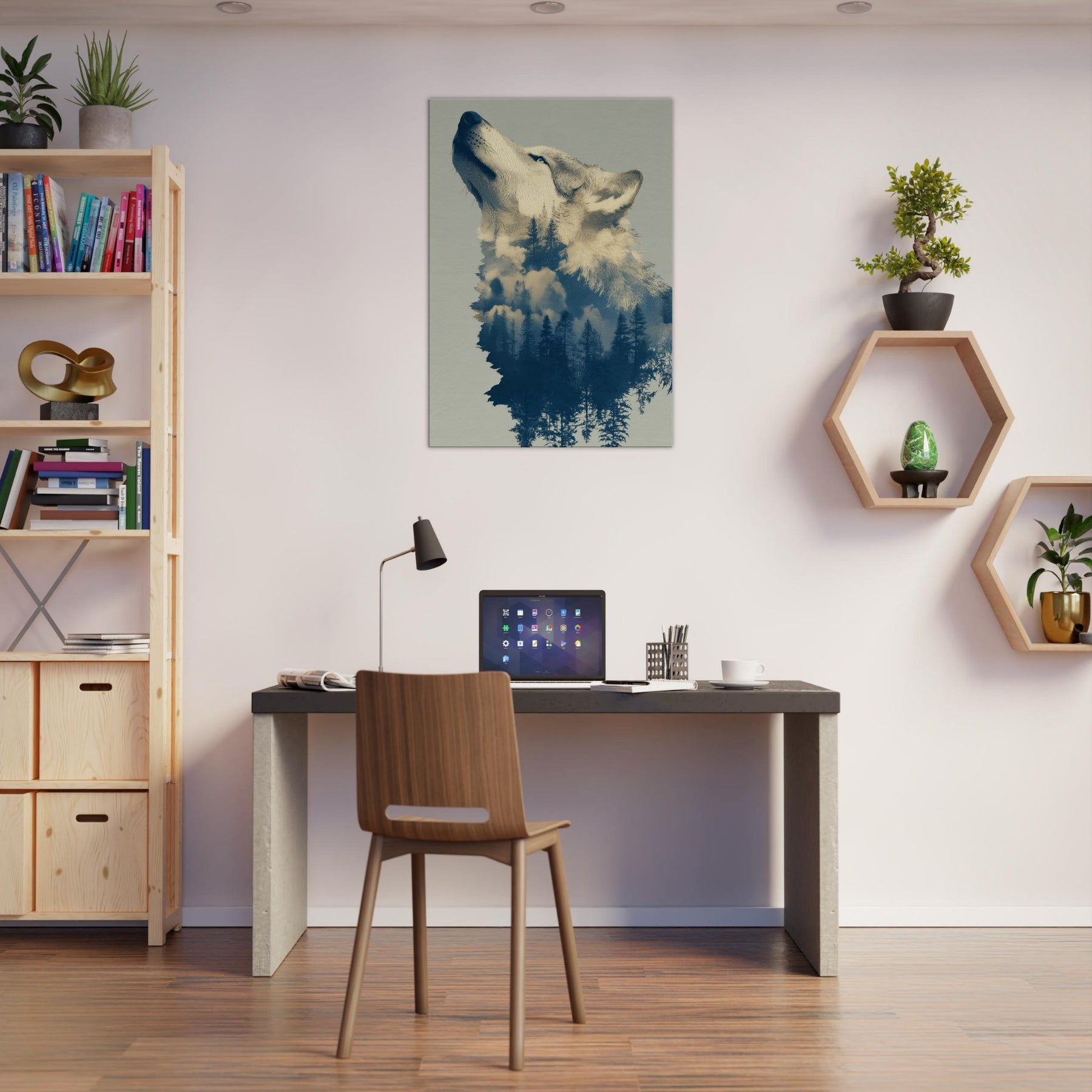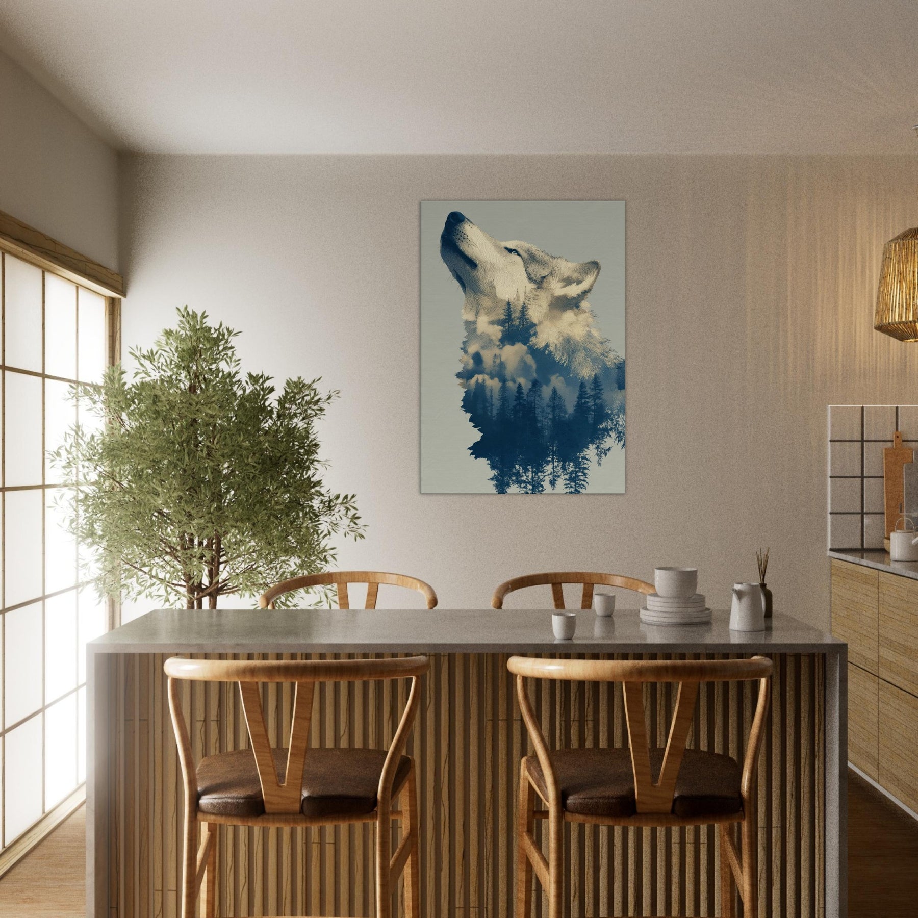 Under a moonlit canopy, this Wolf dissolves into a forest of tall pines and drift of clouds, inviting a dreamlike stillness into any room. The surreal composition blends embers of color with cool blues, echoing the hush of dawn and the scent of pine. Hang it in a living area or bedroom to cultivate a tranquil, cinematic mood the Wolf becomes both guardian and whisperer of your space, transforming walls into a nocturnal sanctuary.