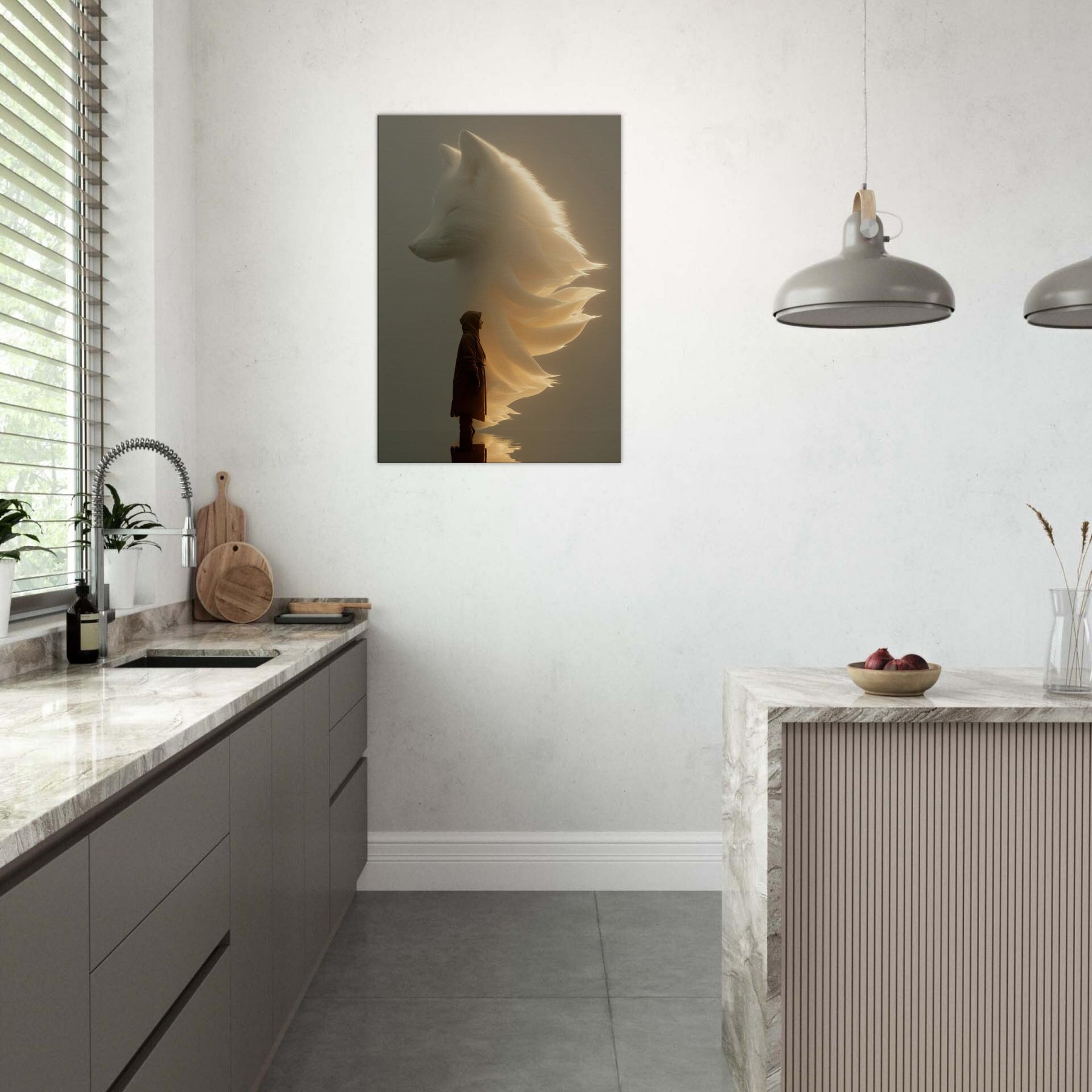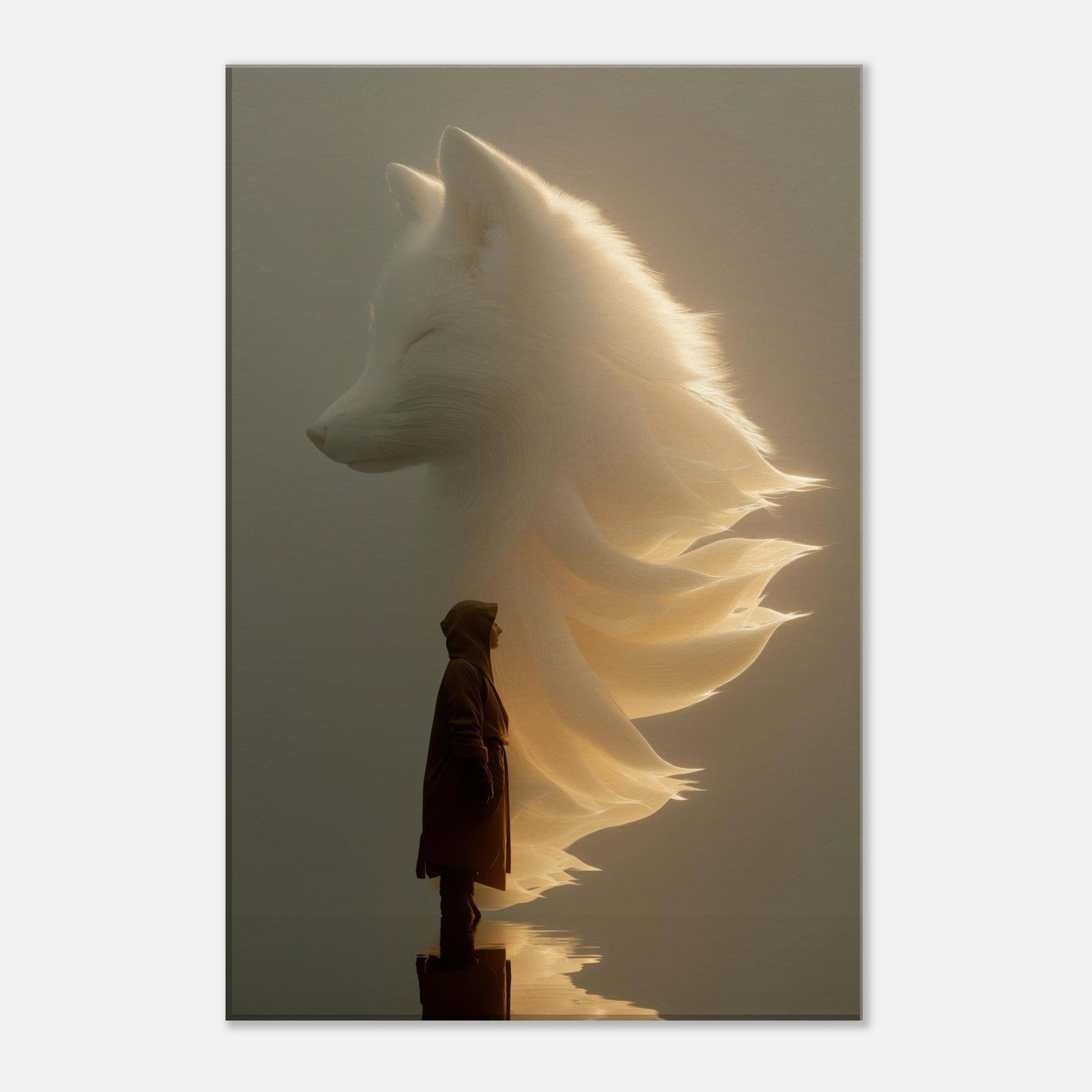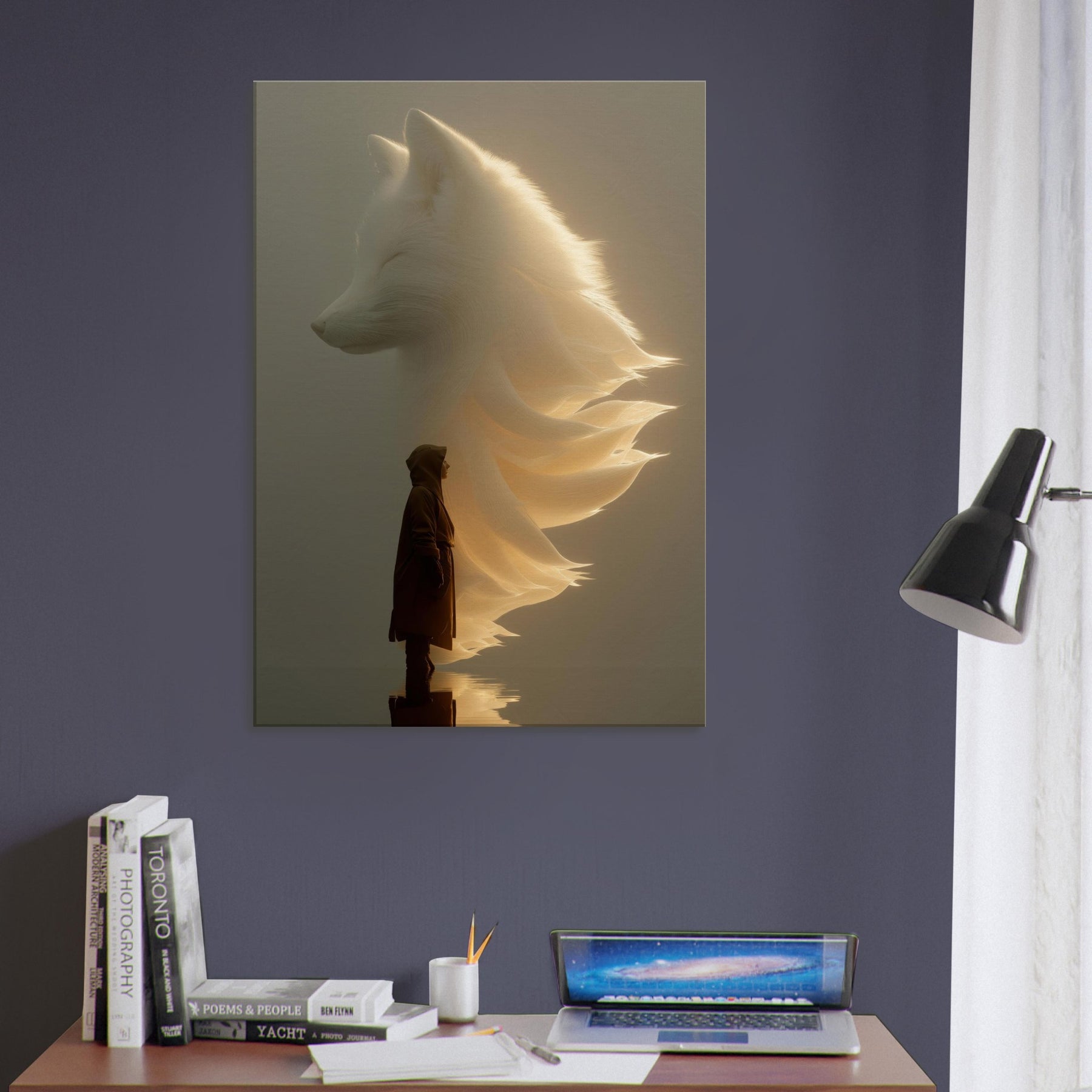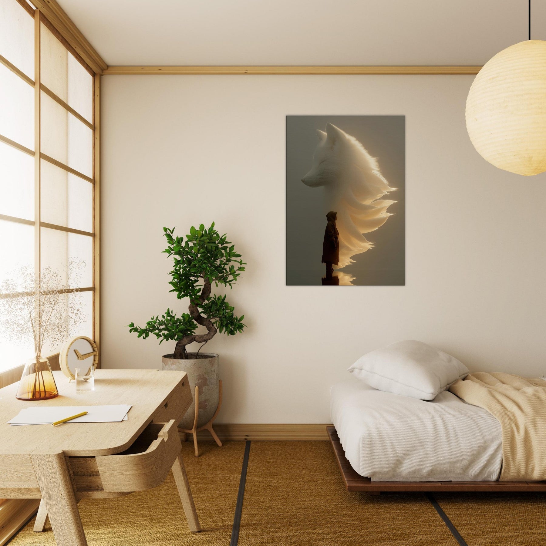 Step into a realm where a lone figure meets an awakening fox of legend. This Kitsune inspired floats between shadow and light, its tails unfurling like luminous banners in a quiet wind. The surreal, dreamlike glow casts a warm radiance across a room, inviting contemplation and calm. Hang it where you savor evenings or dawn rituals; the artwork deepens atmosphere, heightens color, and turns everyday spaces into a doorway to myth, memory, and grace.