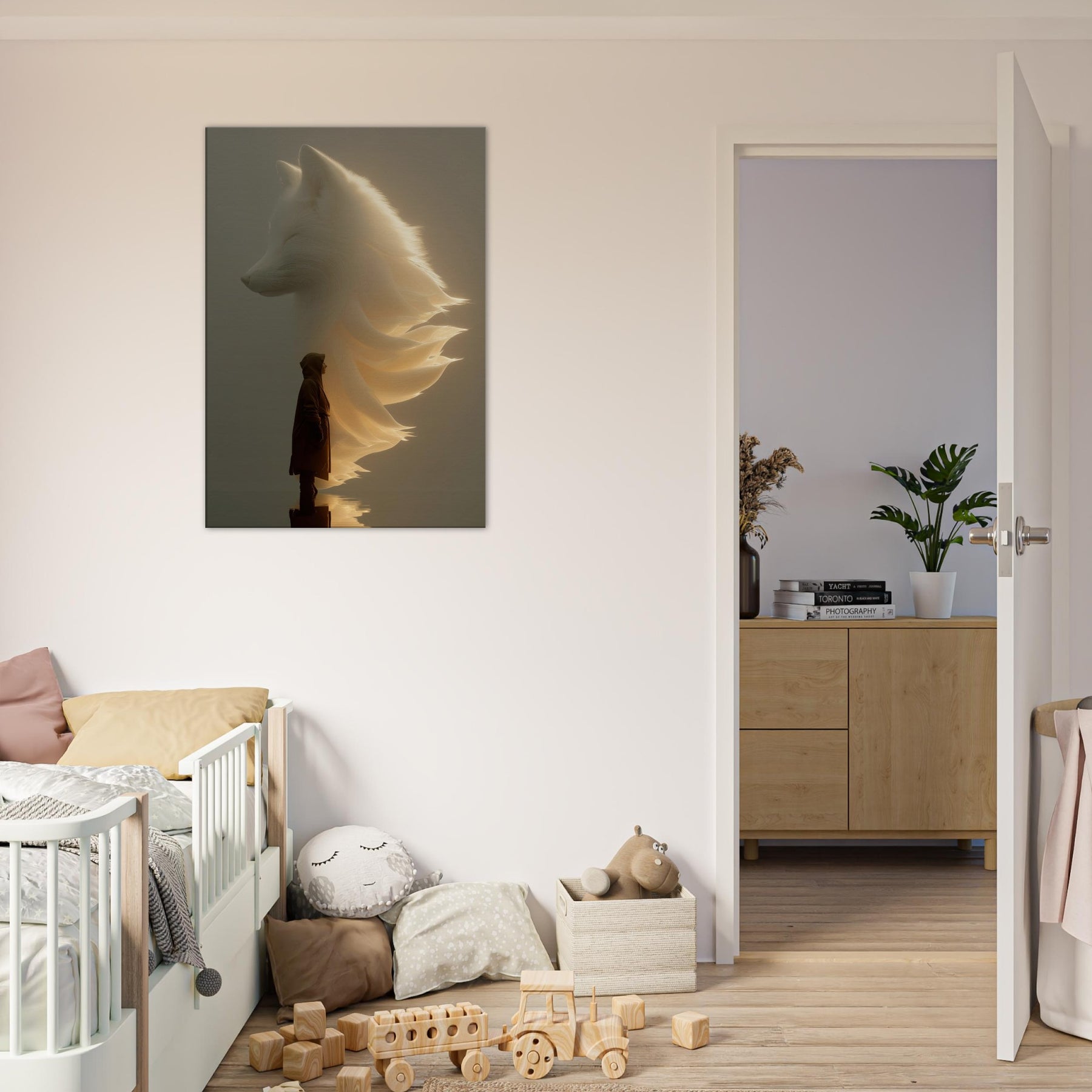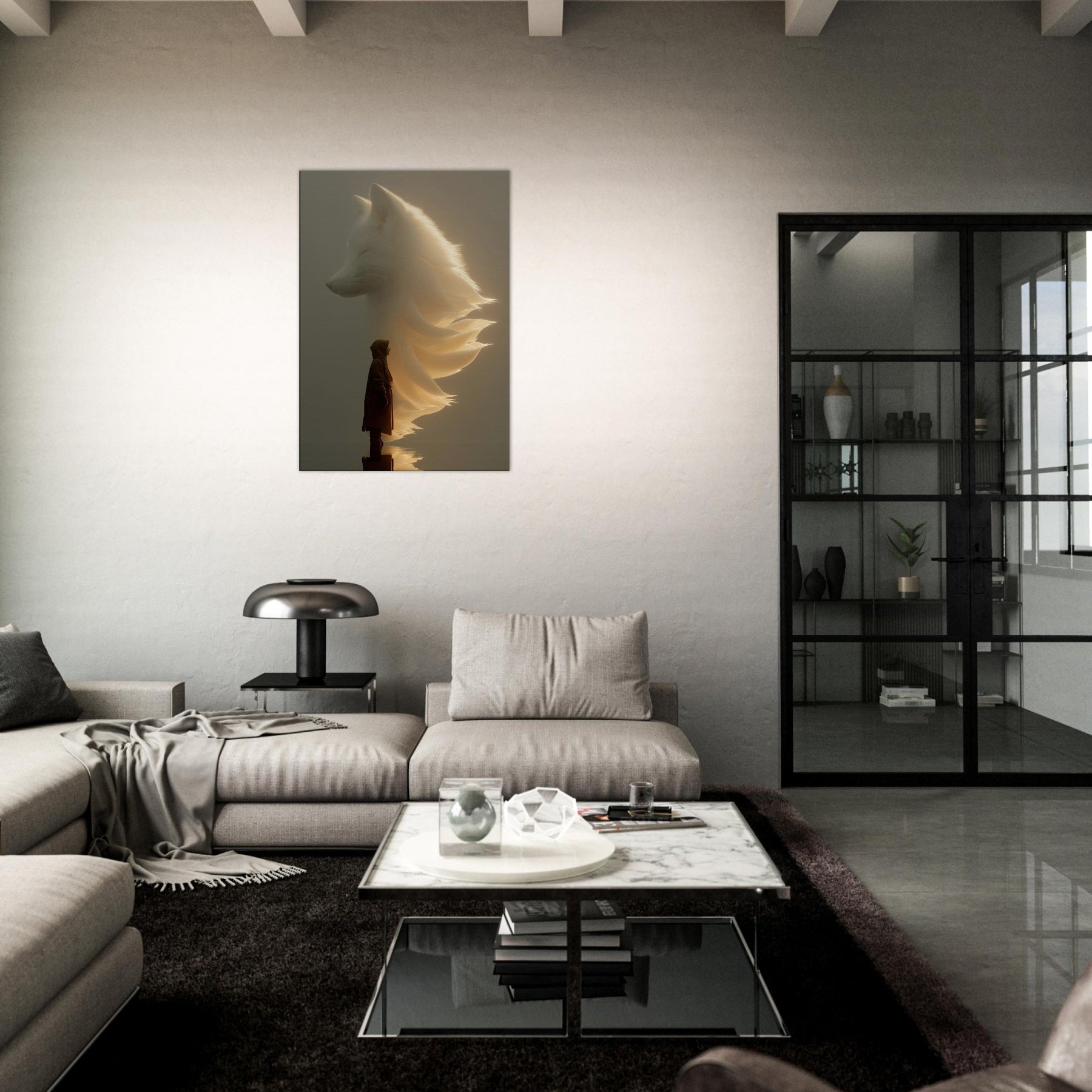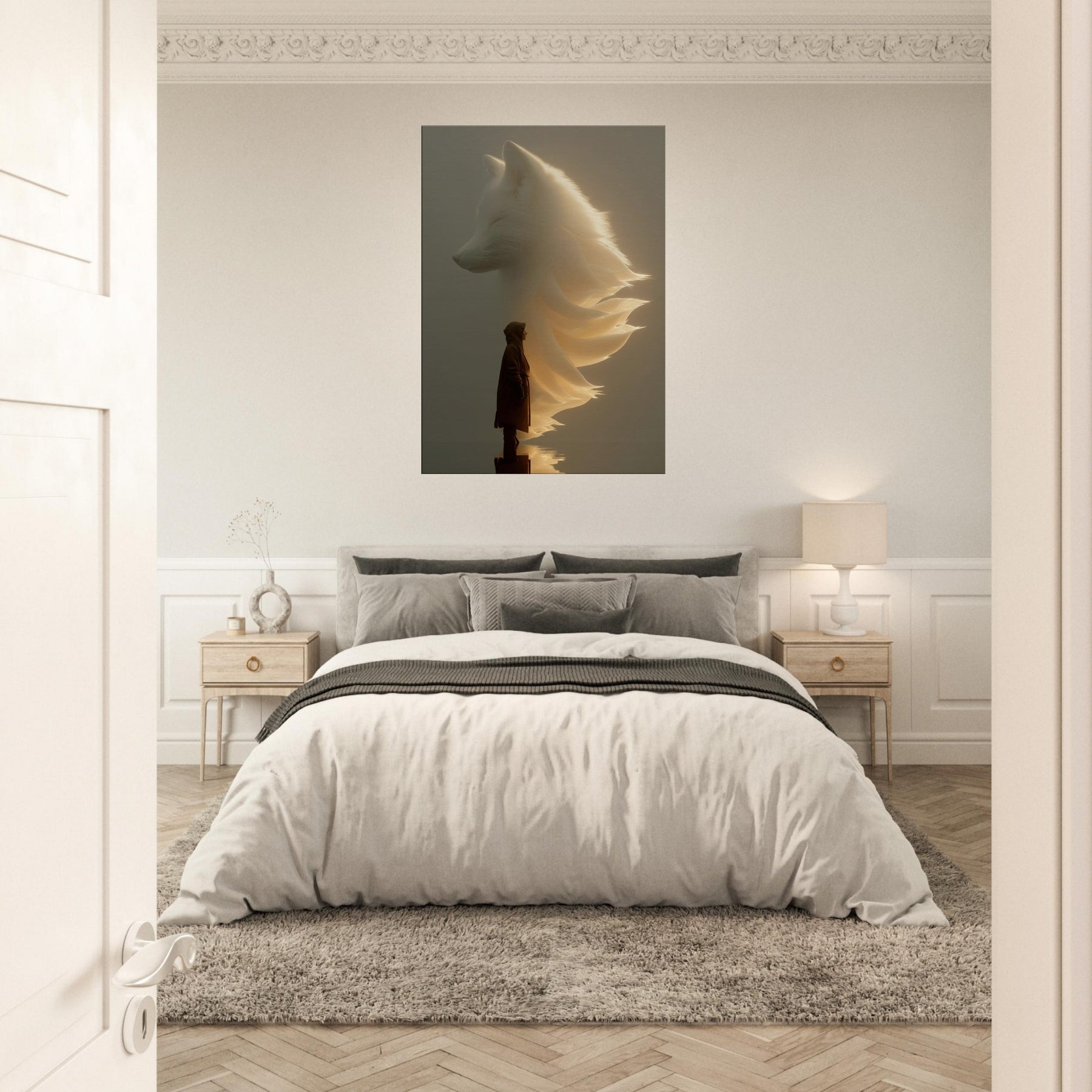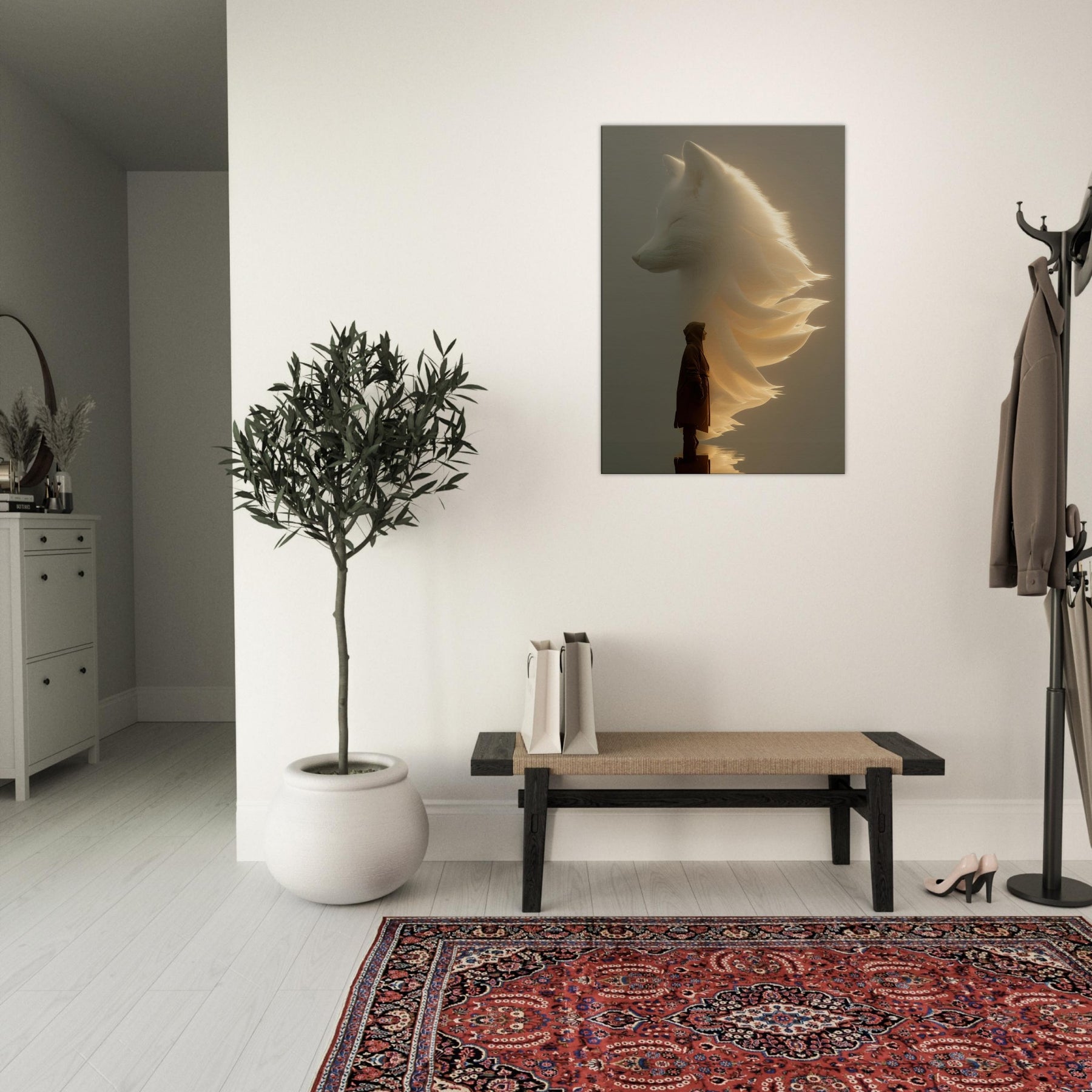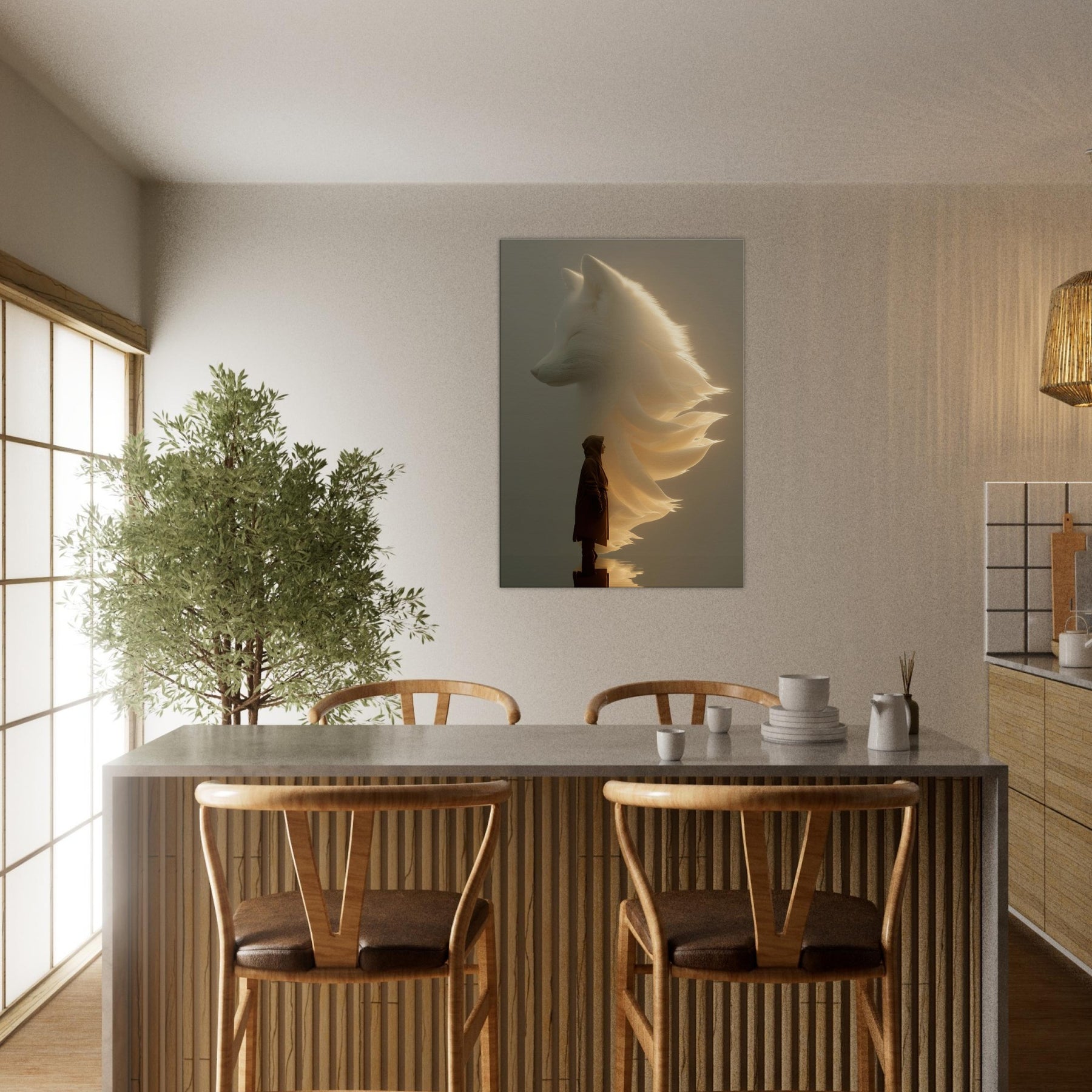 Step into a realm where a lone figure meets an awakening fox of legend. This Kitsune inspired floats between shadow and light, its tails unfurling like luminous banners in a quiet wind. The surreal, dreamlike glow casts a warm radiance across a room, inviting contemplation and calm. Hang it where you savor evenings or dawn rituals; the artwork deepens atmosphere, heightens color, and turns everyday spaces into a doorway to myth, memory, and grace.