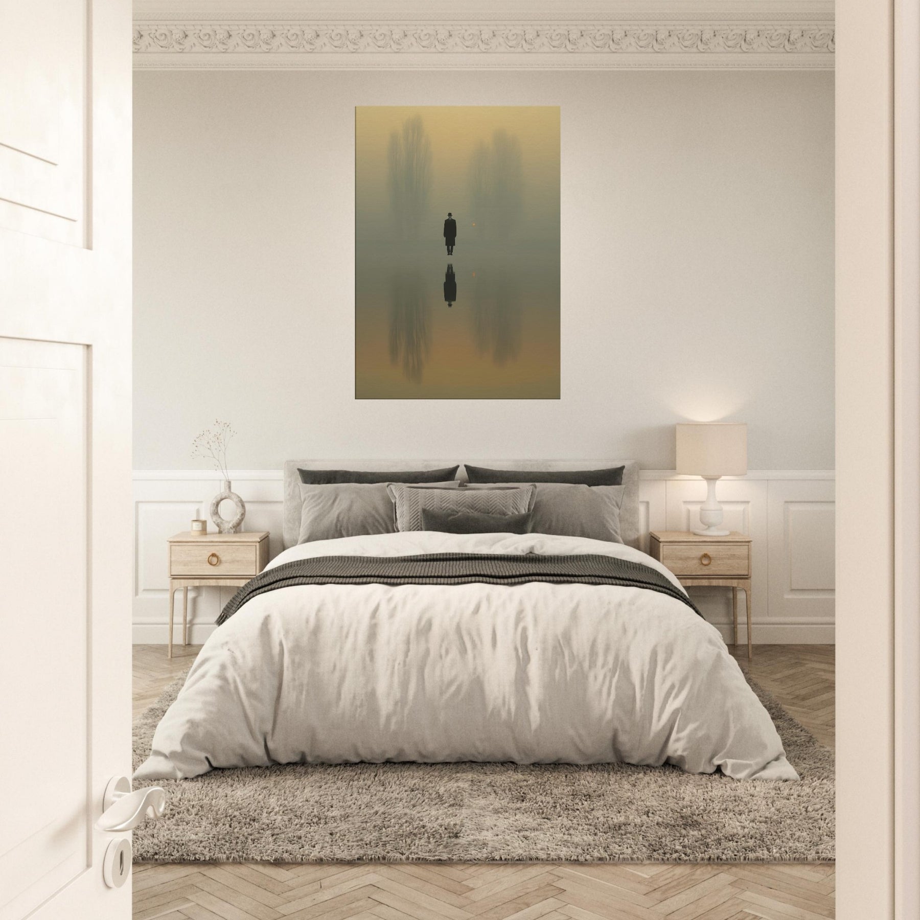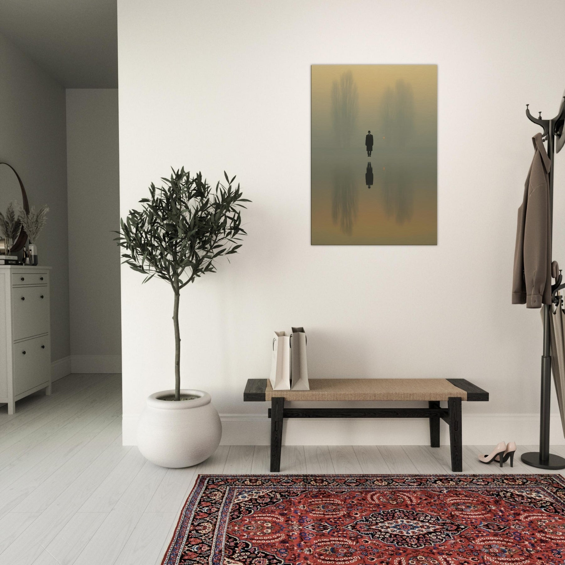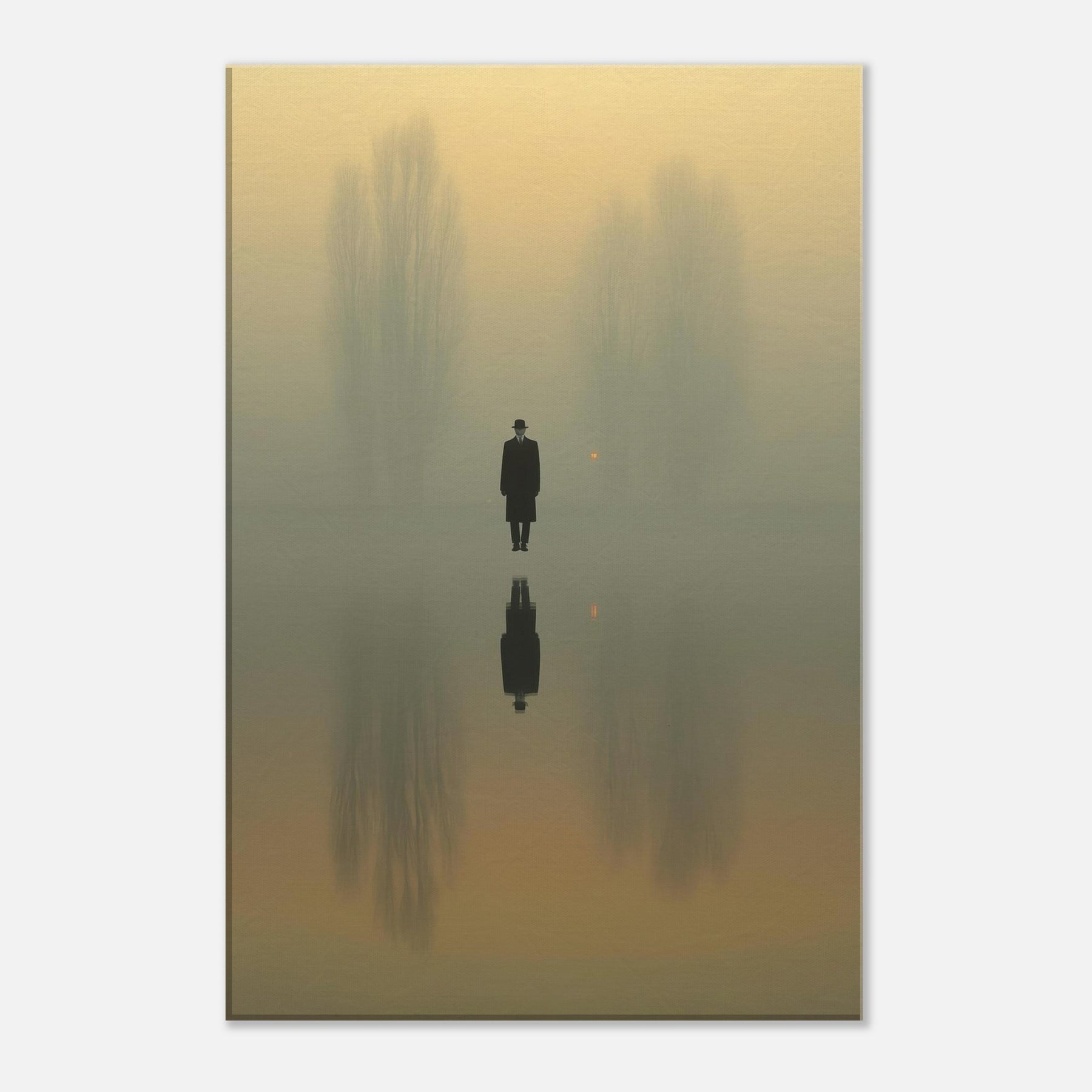 Step into a pale theatre of fog and dawn, where light breathes through silence. The Primary Subject, Mask (Neutral Theater) Silhouette, hovers between memory and present moment, a lone figure mirrored by still water and distant trees. This surreal, dreamlike scene invites slow reflection, as warm hues soften the room with quiet drama. Hung at eye level, it becomes a contemplative focal point a invitation to breathe, listen, and let the space between shadow and glow become your everyday sanctuary.