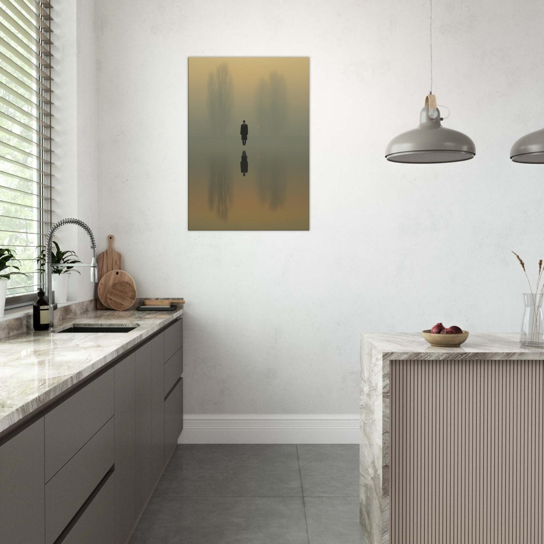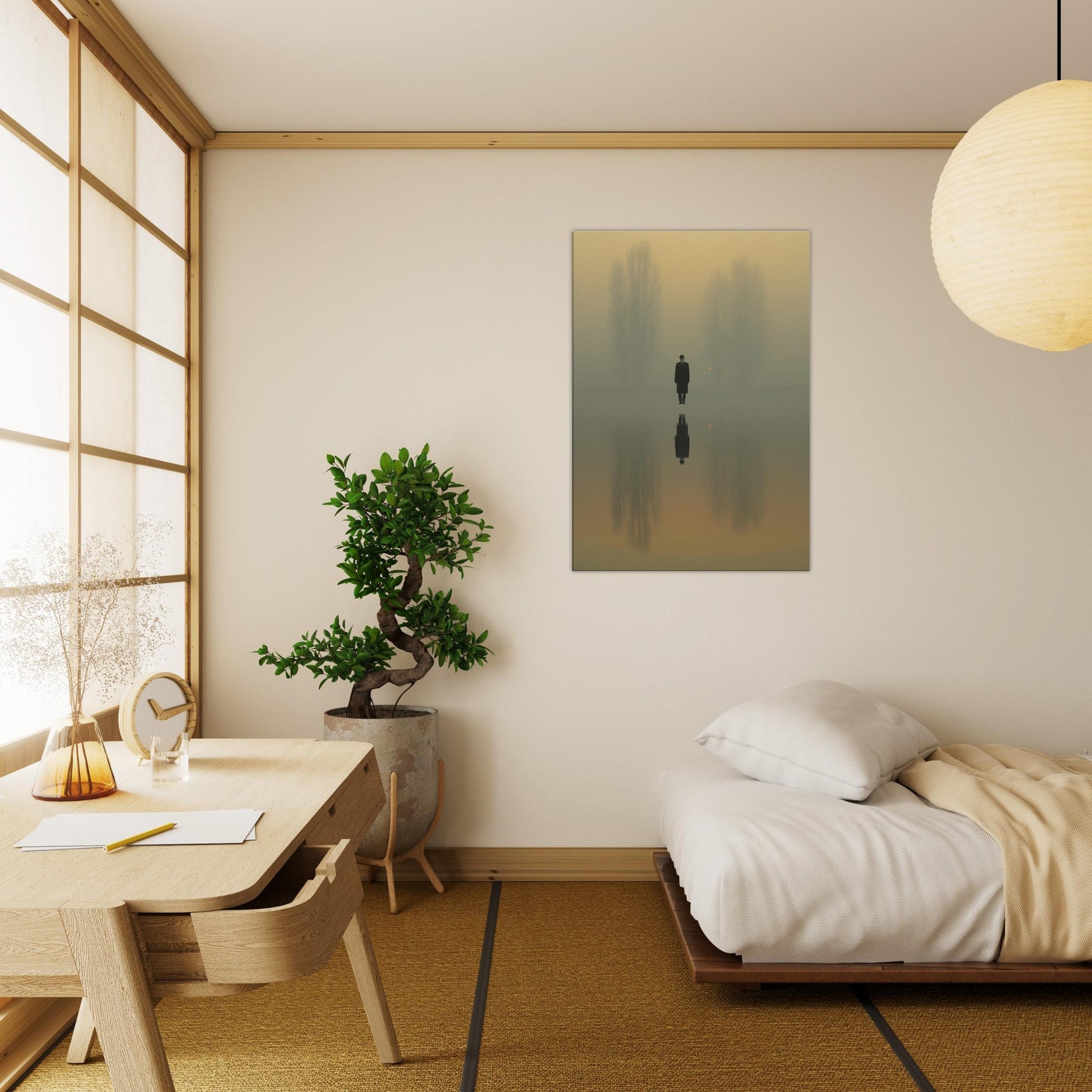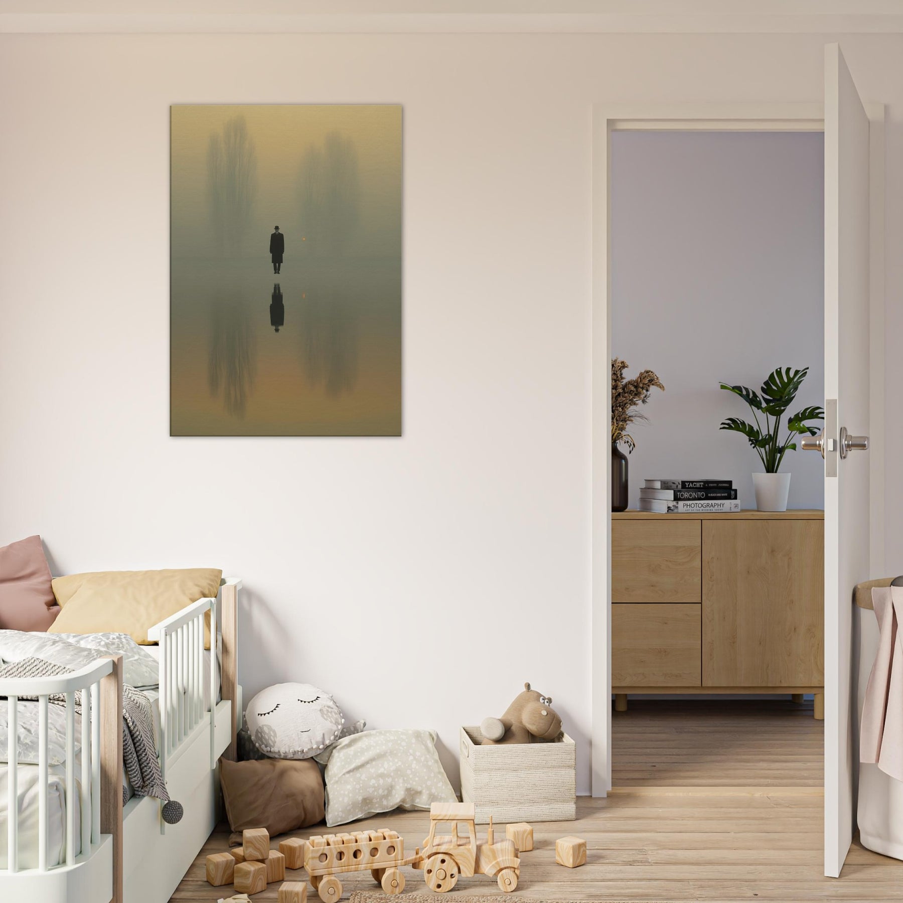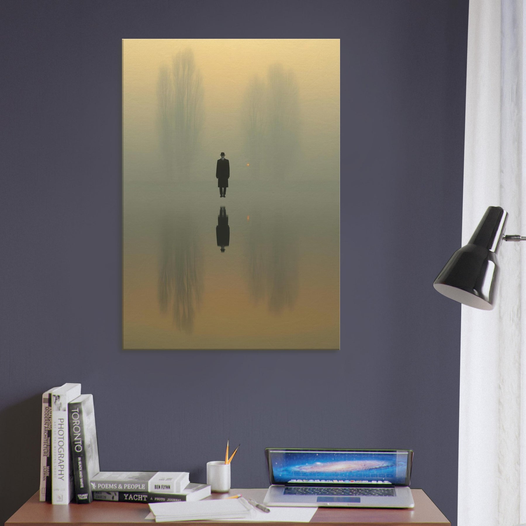 Step into a pale theatre of fog and dawn, where light breathes through silence. The Primary Subject, Mask (Neutral Theater) Silhouette, hovers between memory and present moment, a lone figure mirrored by still water and distant trees. This surreal, dreamlike scene invites slow reflection, as warm hues soften the room with quiet drama. Hung at eye level, it becomes a contemplative focal point a invitation to breathe, listen, and let the space between shadow and glow become your everyday sanctuary.