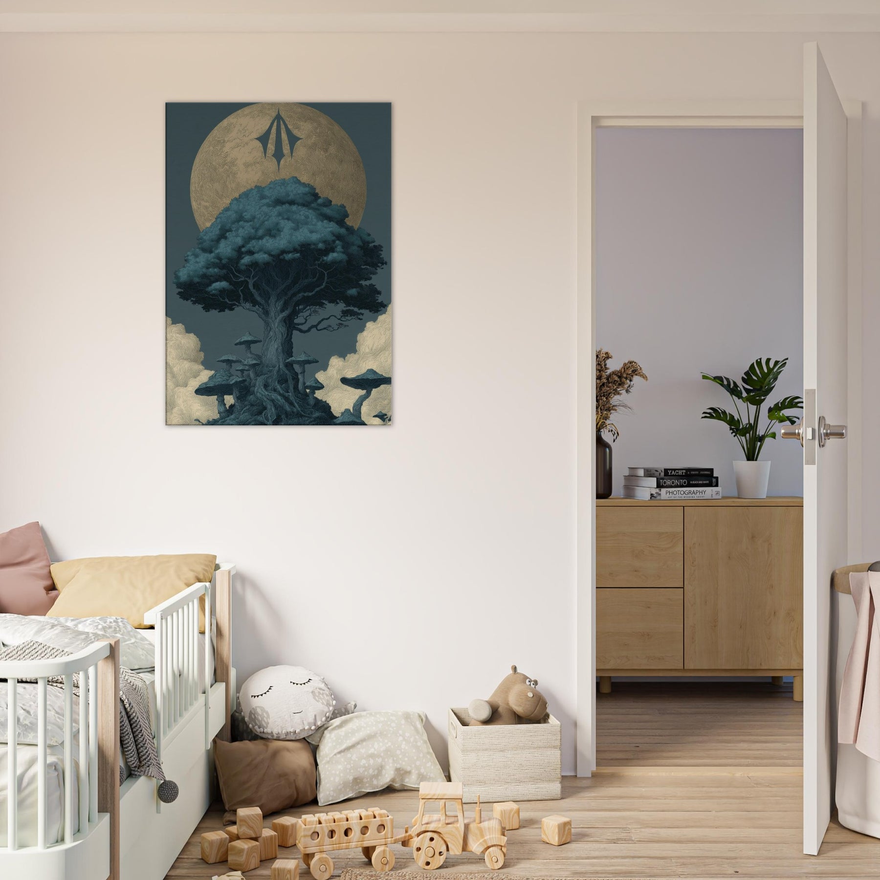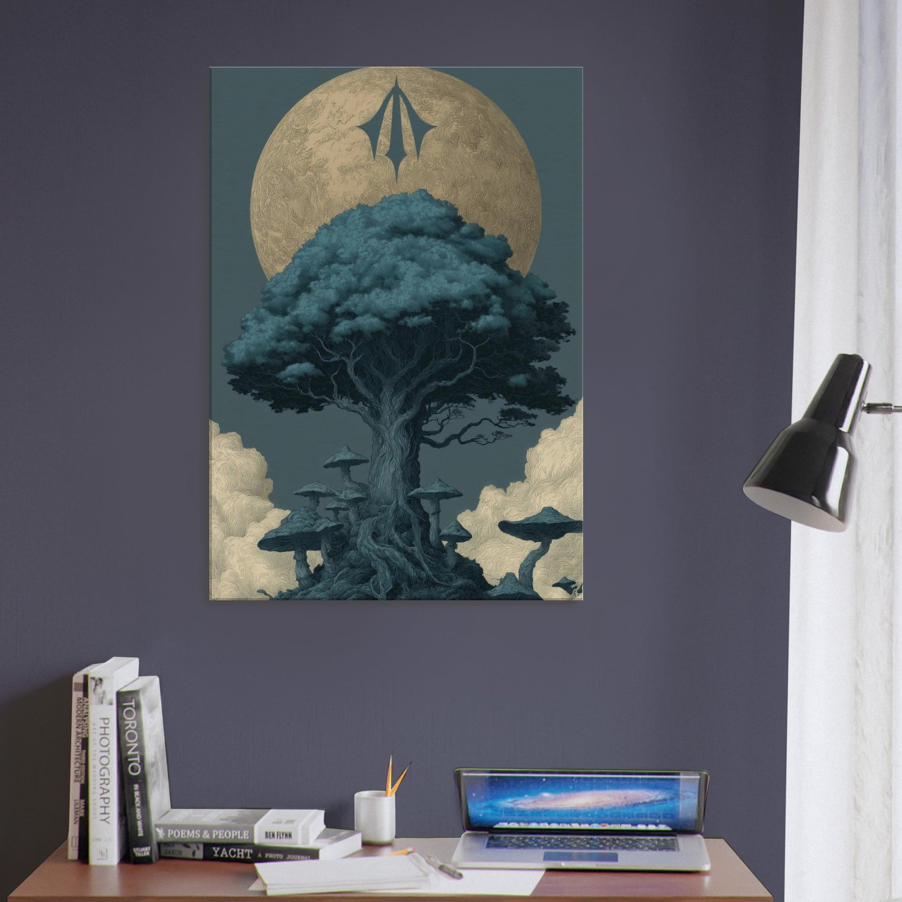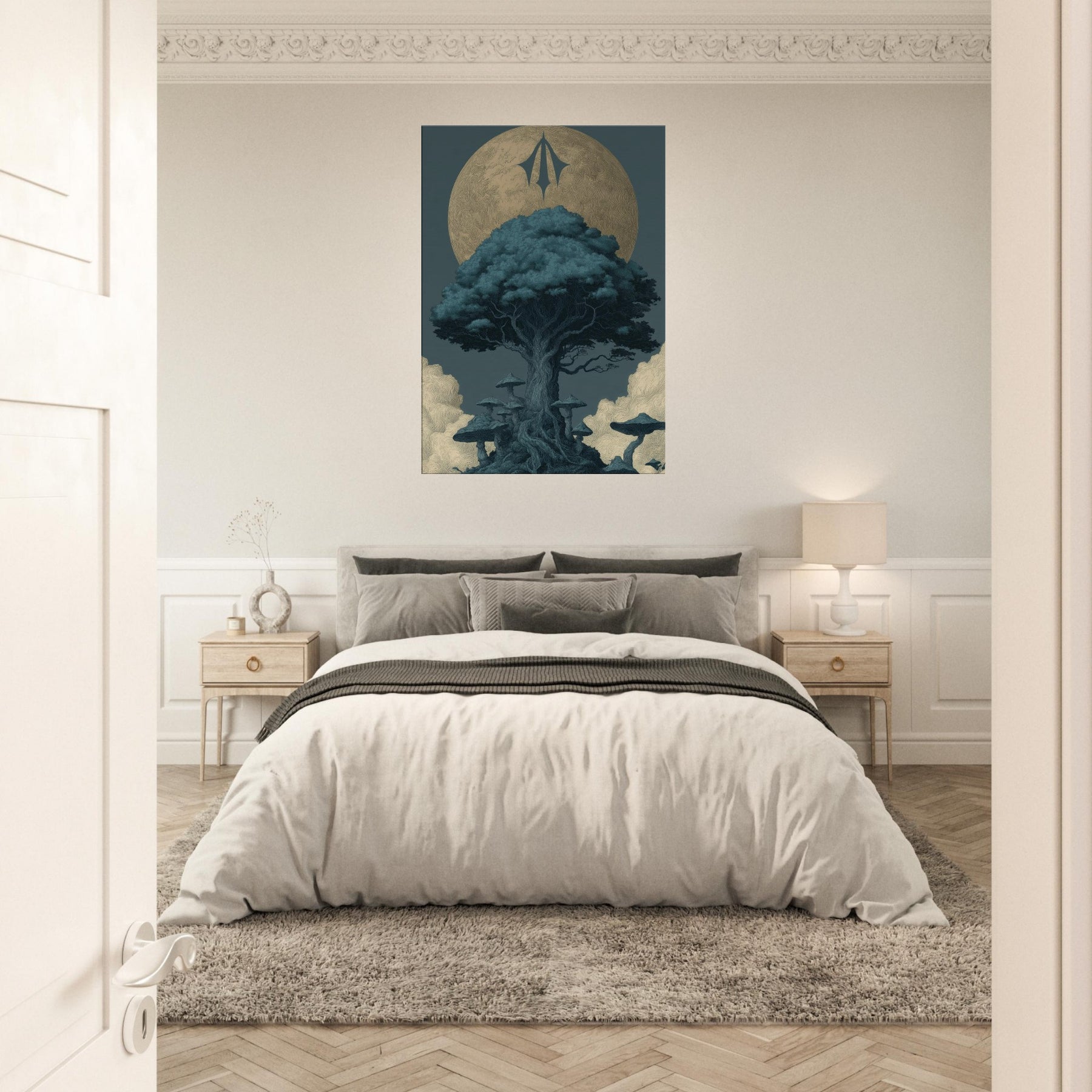 Let Nebula rise in your living room as a doorway to another realm. This surreal composition threads a luminous celestial circle with a towering blue tree, its roots curling around ethereal fungi and clouded canopies. The warm gold of the moon behind invites calm, wonder, and introspection, casting a dreamlike glow across the room. A statement piece that deepens atmosphere, it pairs beautifully with muted textures and woods, anchoring conversations, dreams, and quiet evenings in a modern sanctuary.