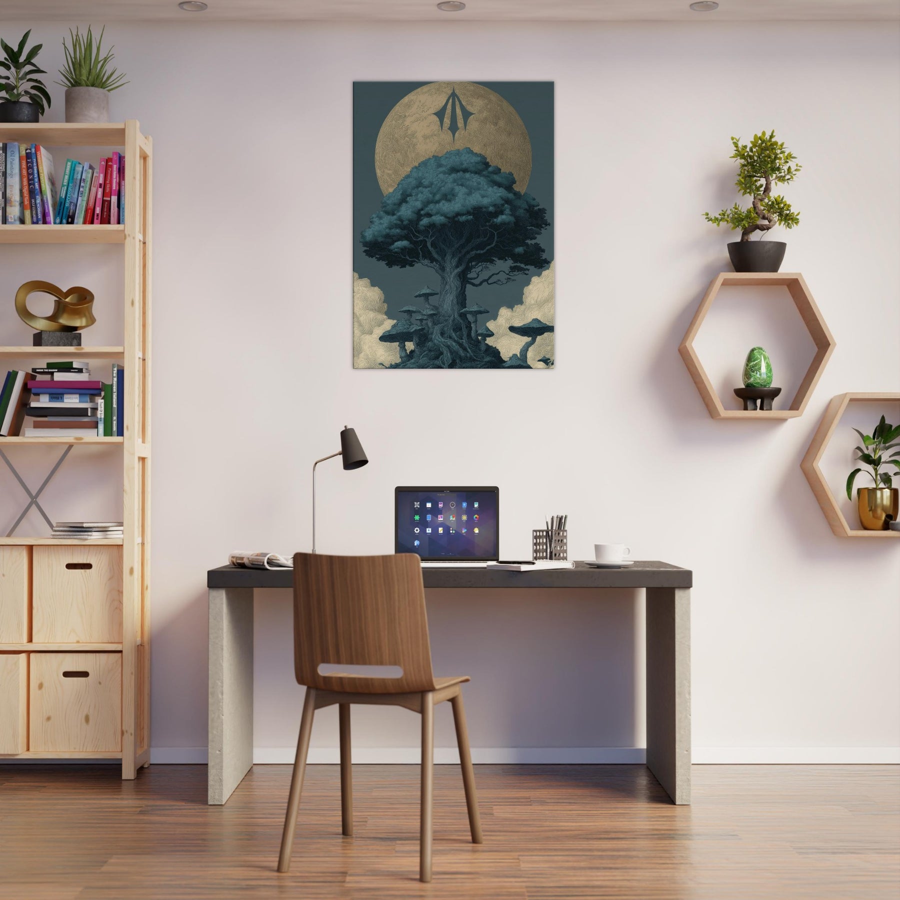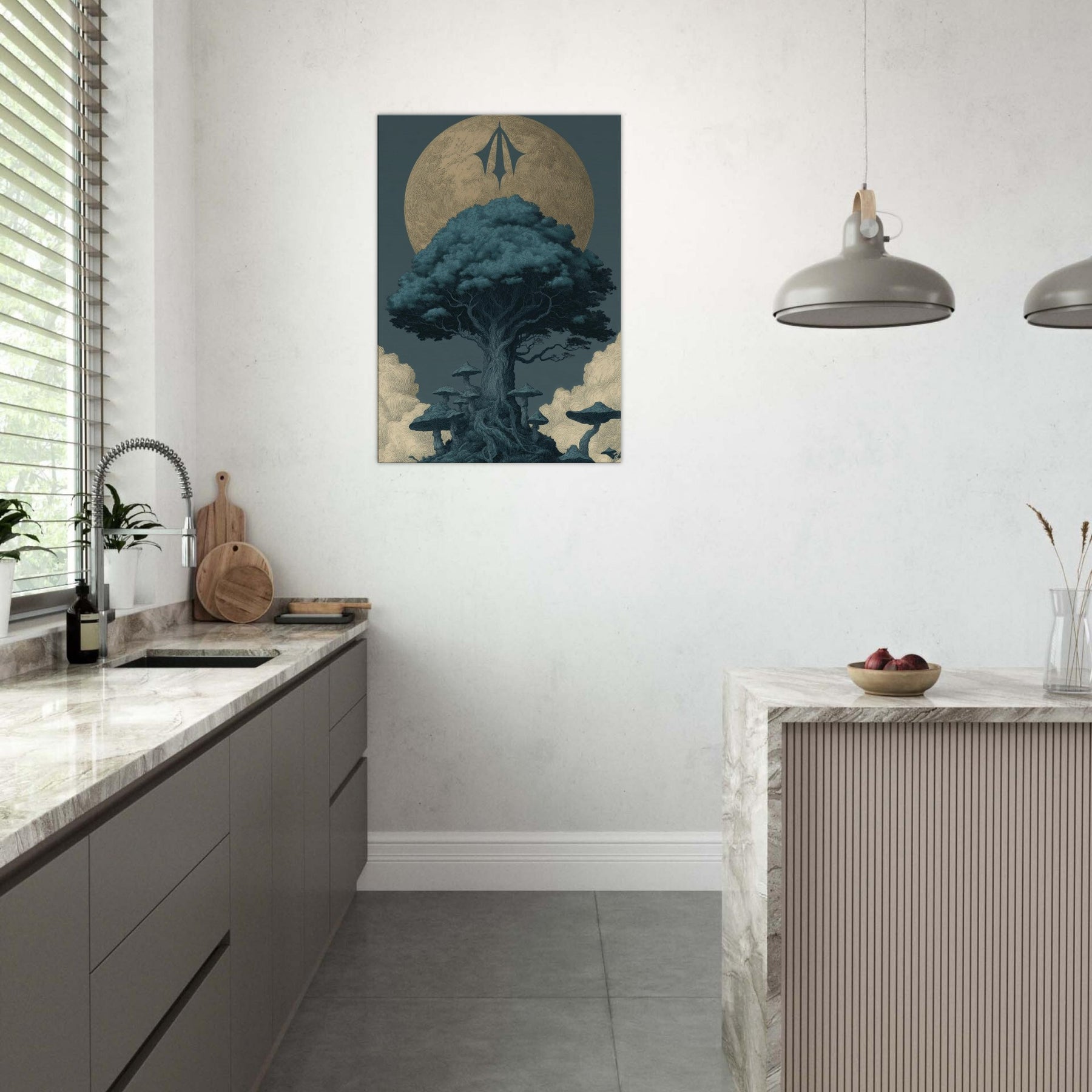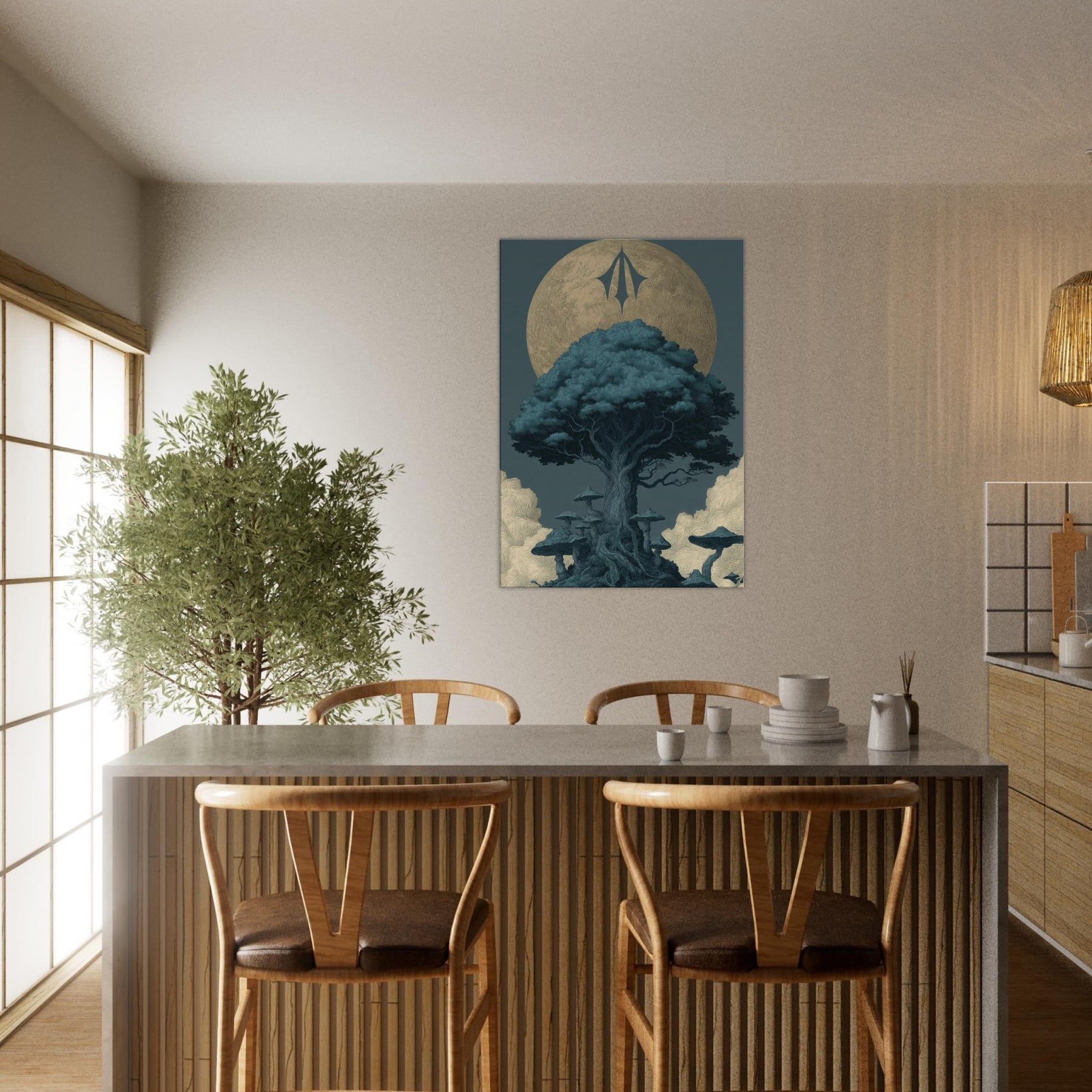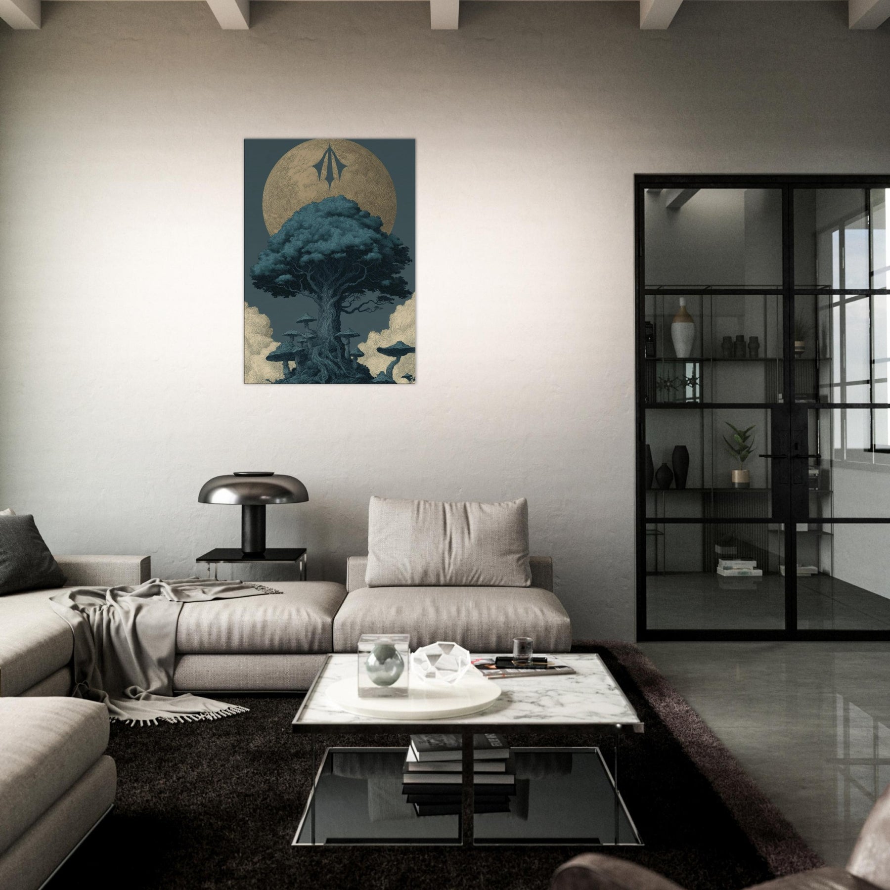 Let Nebula rise in your living room as a doorway to another realm. This surreal composition threads a luminous celestial circle with a towering blue tree, its roots curling around ethereal fungi and clouded canopies. The warm gold of the moon behind invites calm, wonder, and introspection, casting a dreamlike glow across the room. A statement piece that deepens atmosphere, it pairs beautifully with muted textures and woods, anchoring conversations, dreams, and quiet evenings in a modern sanctuary.