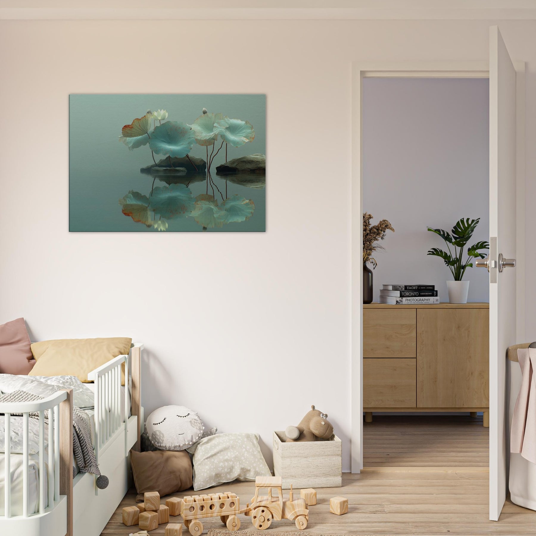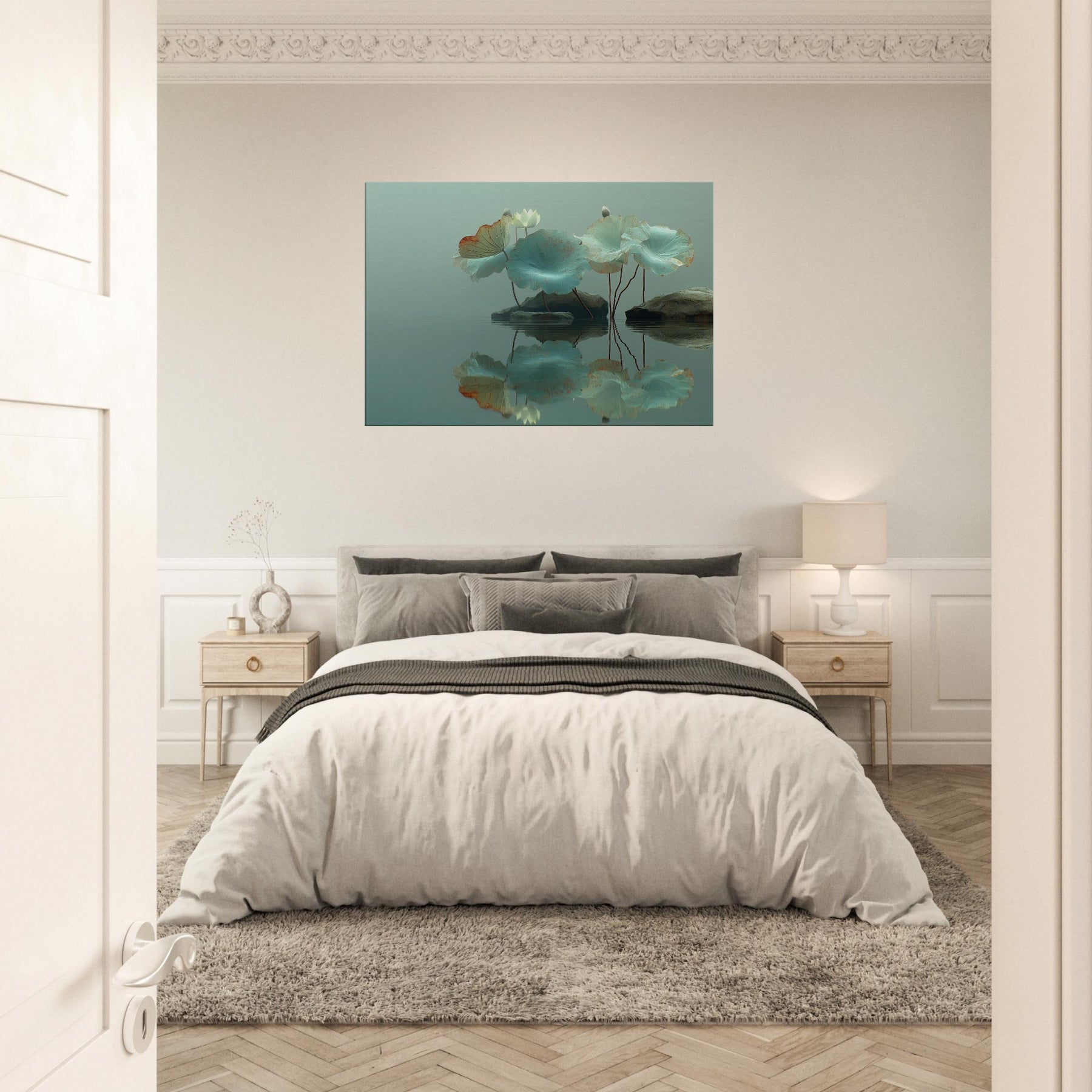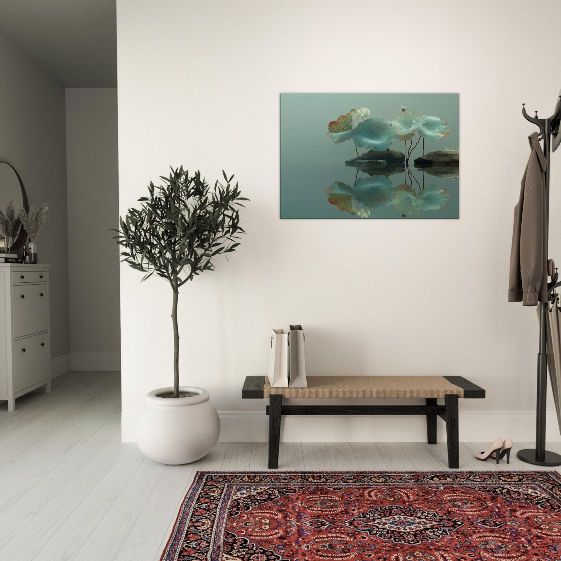 Lotus Leaves drift through a quiet dream where light trembles on still water. In this surreal composition, the delicate lotus leaves rise from calm reflections, their pale teal and bronze accents gifting the room a sense of balance and breath. Rocks anchor the scene as slender stems trace quiet arcs, while the air seems to shimmer with inaudible music. This artwork invites calm afternoons and contemplative evenings, transforming a living space into a sanctuary of nature, memory, and serene possibility.