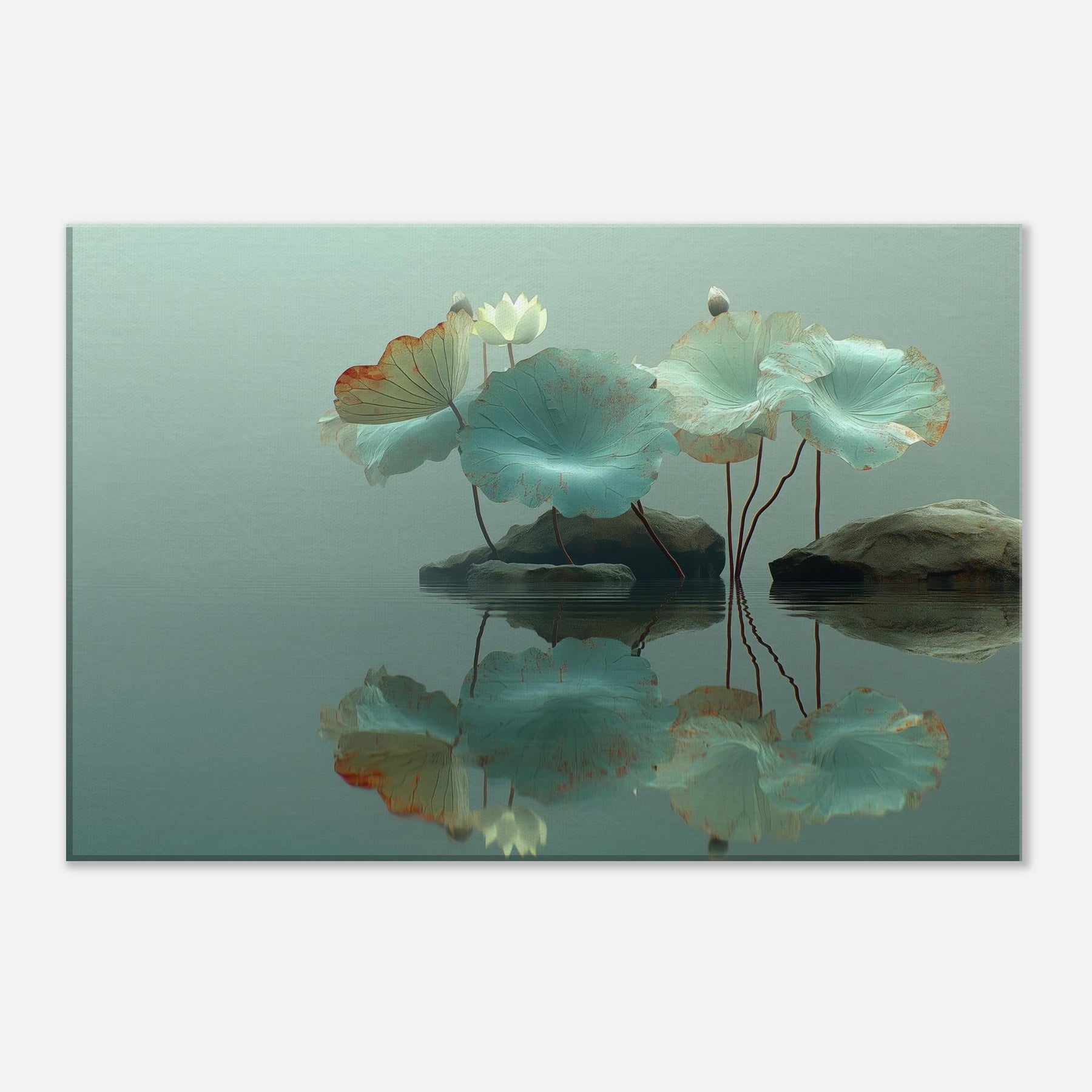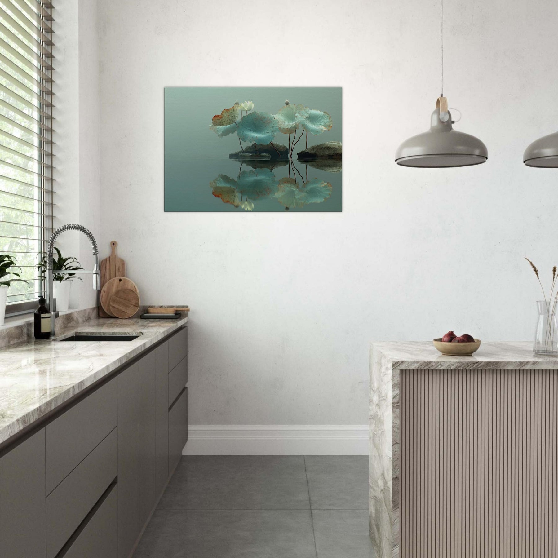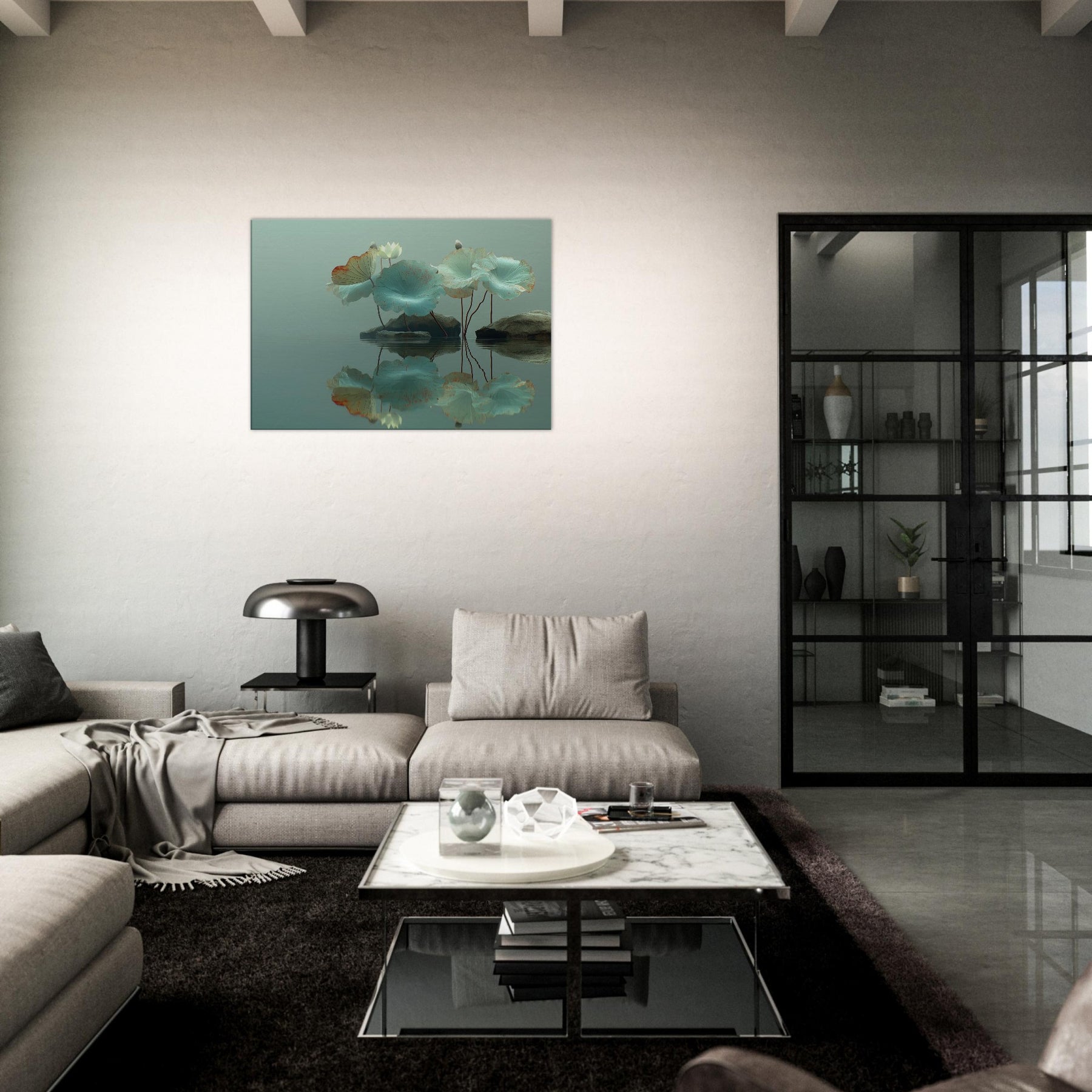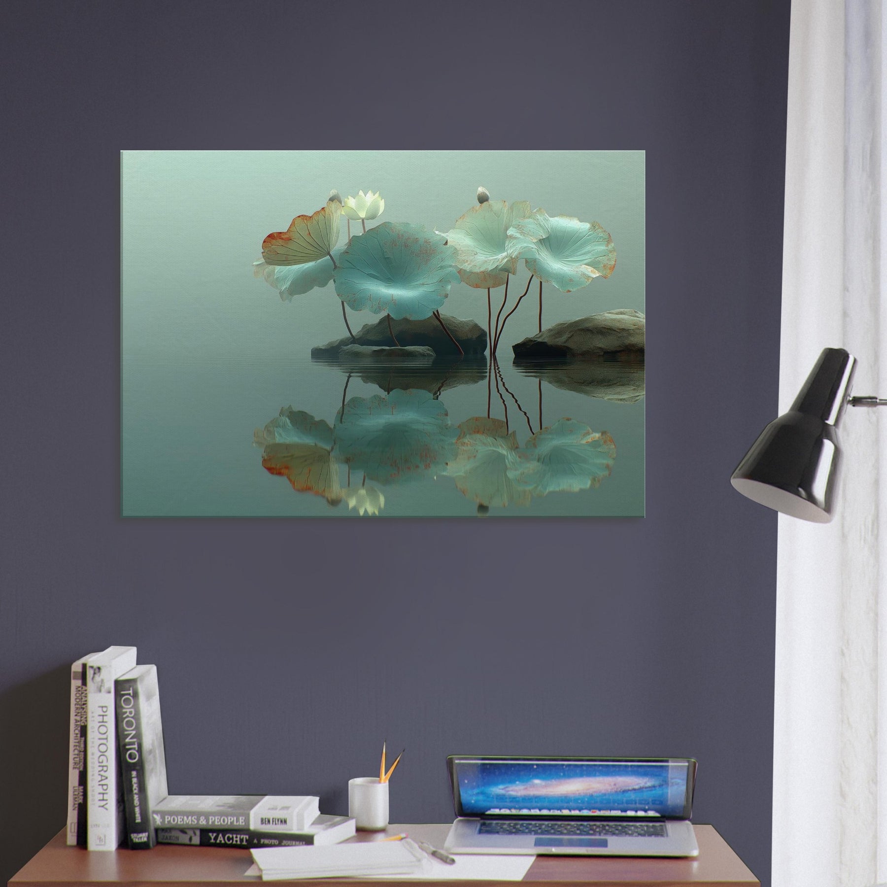 Lotus Leaves drift through a quiet dream where light trembles on still water. In this surreal composition, the delicate lotus leaves rise from calm reflections, their pale teal and bronze accents gifting the room a sense of balance and breath. Rocks anchor the scene as slender stems trace quiet arcs, while the air seems to shimmer with inaudible music. This artwork invites calm afternoons and contemplative evenings, transforming a living space into a sanctuary of nature, memory, and serene possibility.