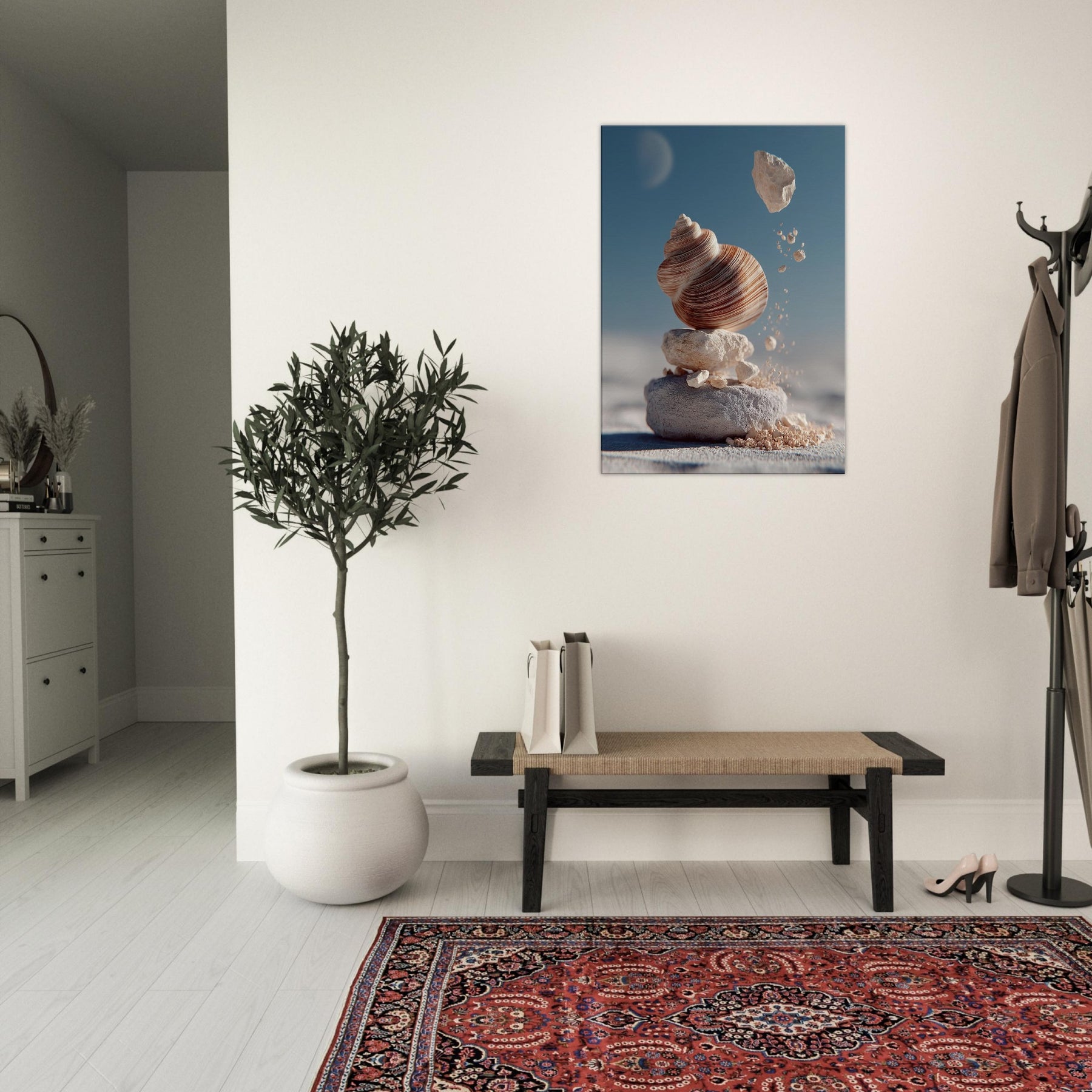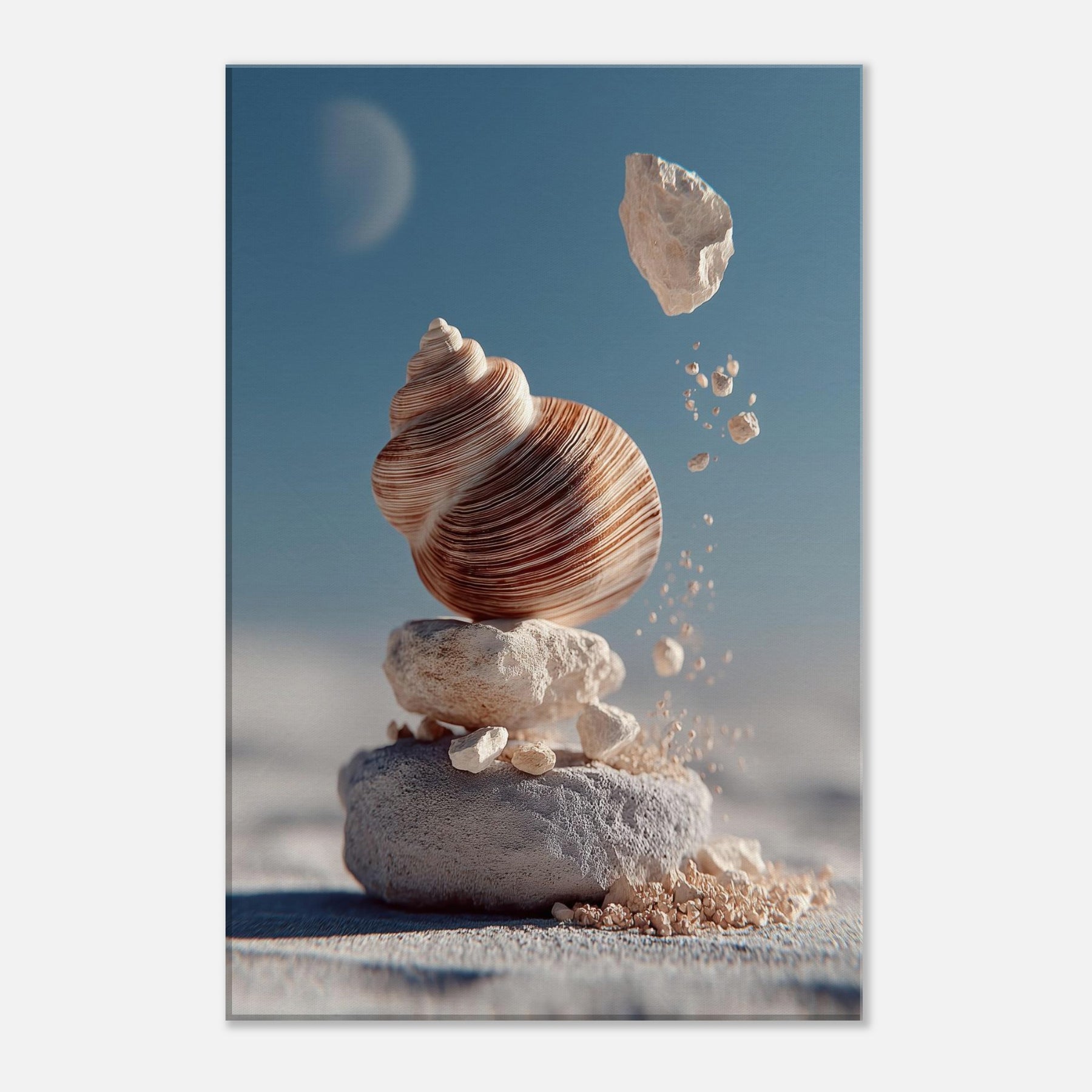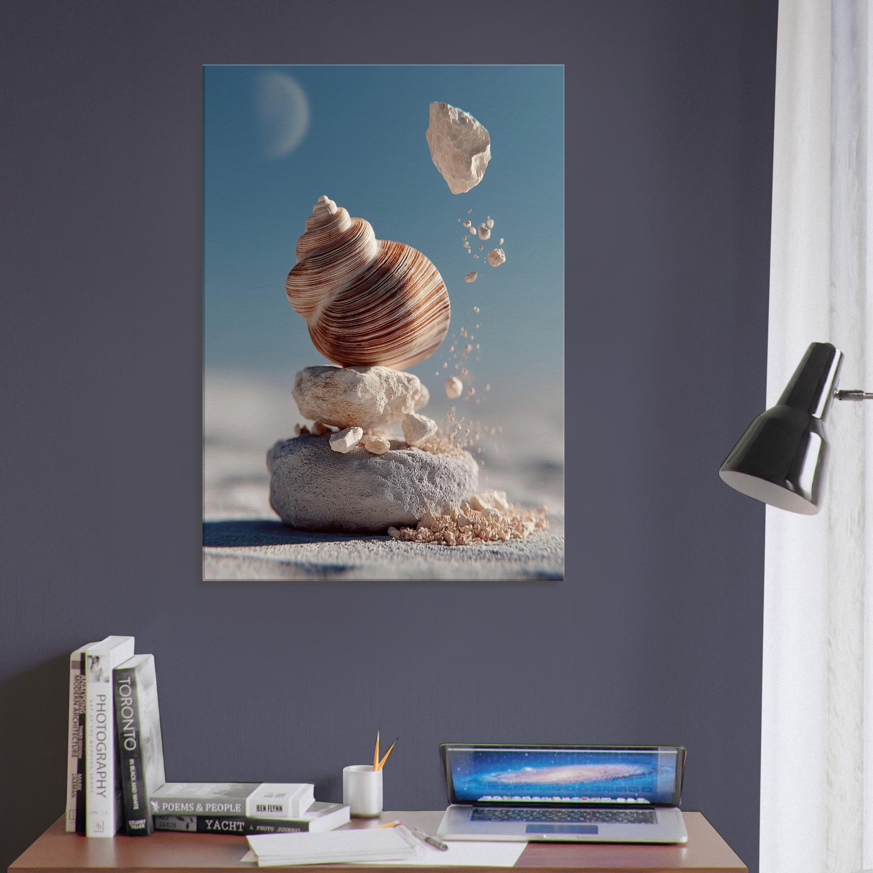 Seashell rises like a quiet oracle from a cairn of eroded stones, set against a horizon where sea and sky blur. In this surreal tableau, the Seashell balances weightless fragments that float upward, while granules scatter in a deliberate, lunar rhythm. The scene invites stillness, memory, and breath a coastal meditation rendered in warm sediment tones. Hang it in a living room to cast a serene, luminous glow and soften the room with tactile, dreamlike calm.