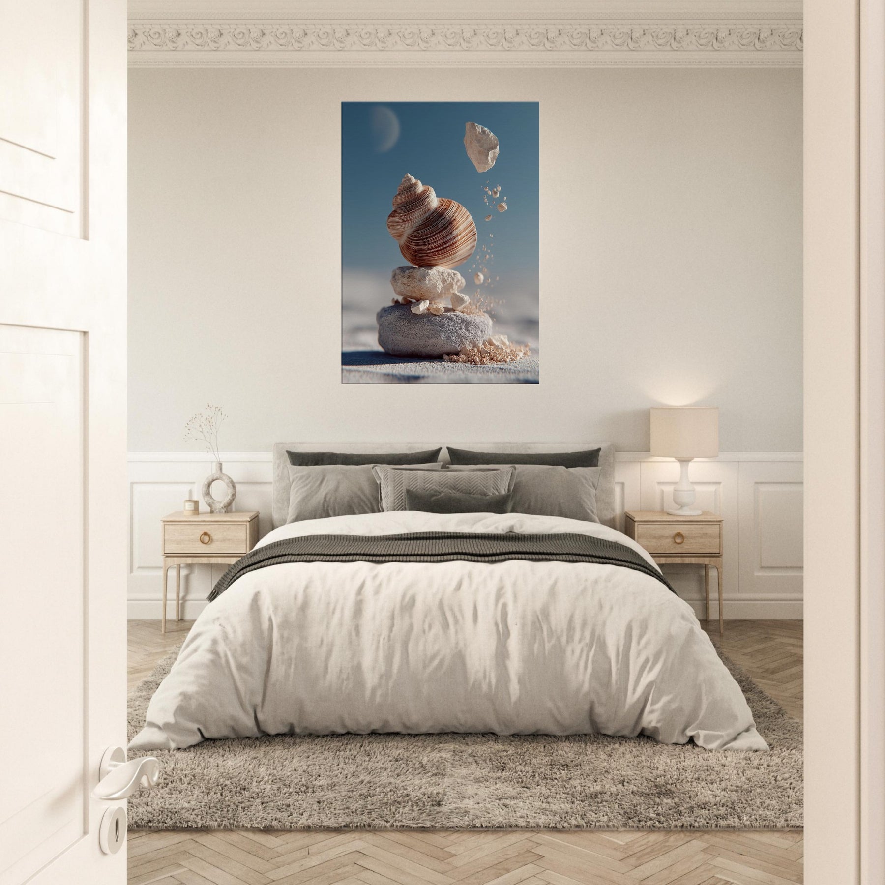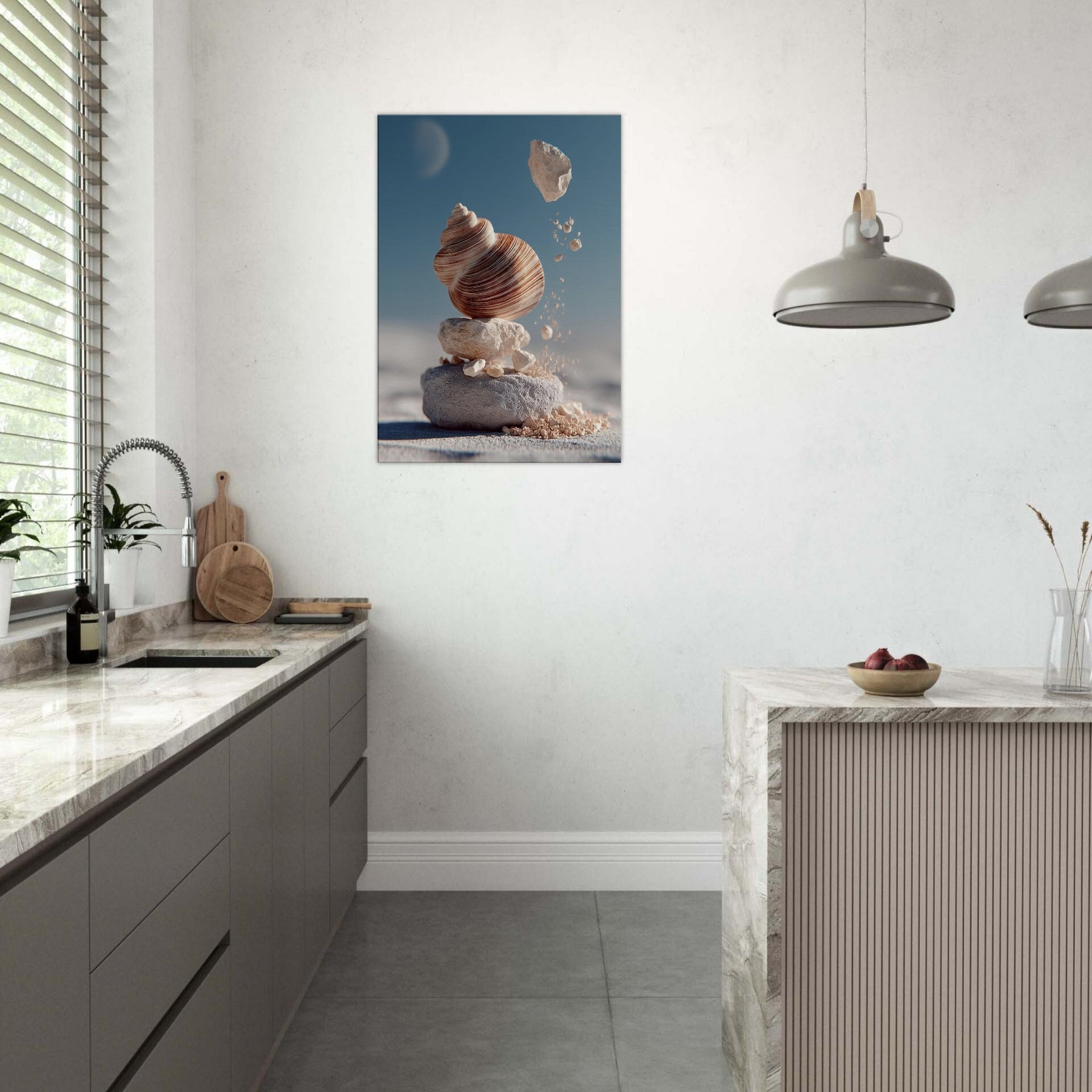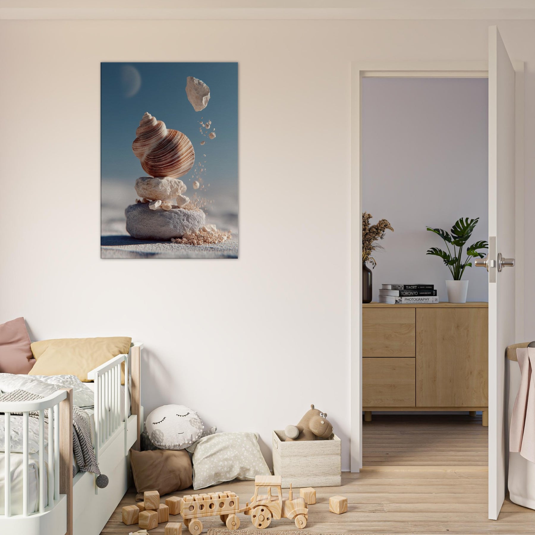 Seashell rises like a quiet oracle from a cairn of eroded stones, set against a horizon where sea and sky blur. In this surreal tableau, the Seashell balances weightless fragments that float upward, while granules scatter in a deliberate, lunar rhythm. The scene invites stillness, memory, and breath a coastal meditation rendered in warm sediment tones. Hang it in a living room to cast a serene, luminous glow and soften the room with tactile, dreamlike calm.