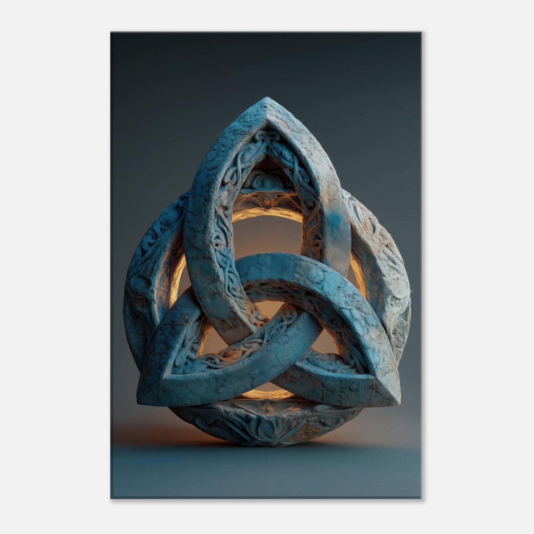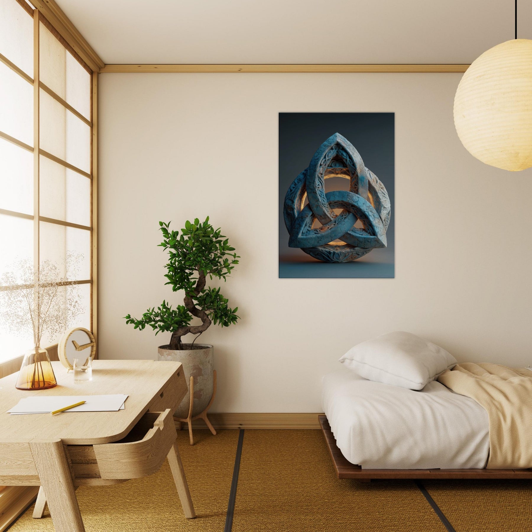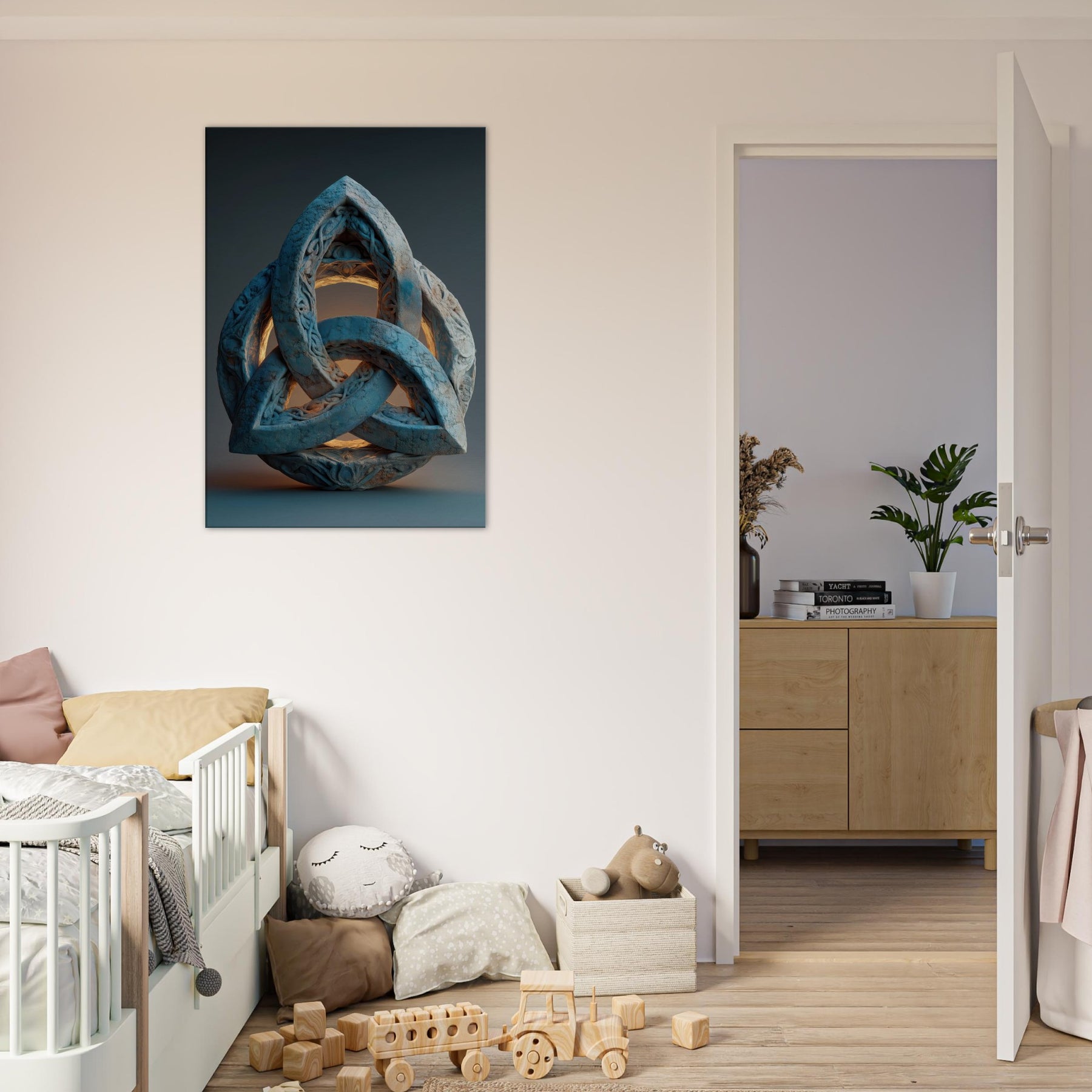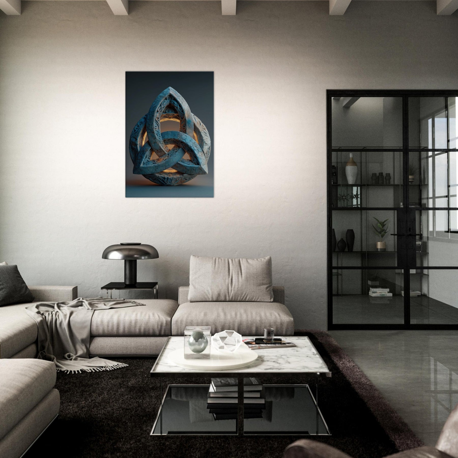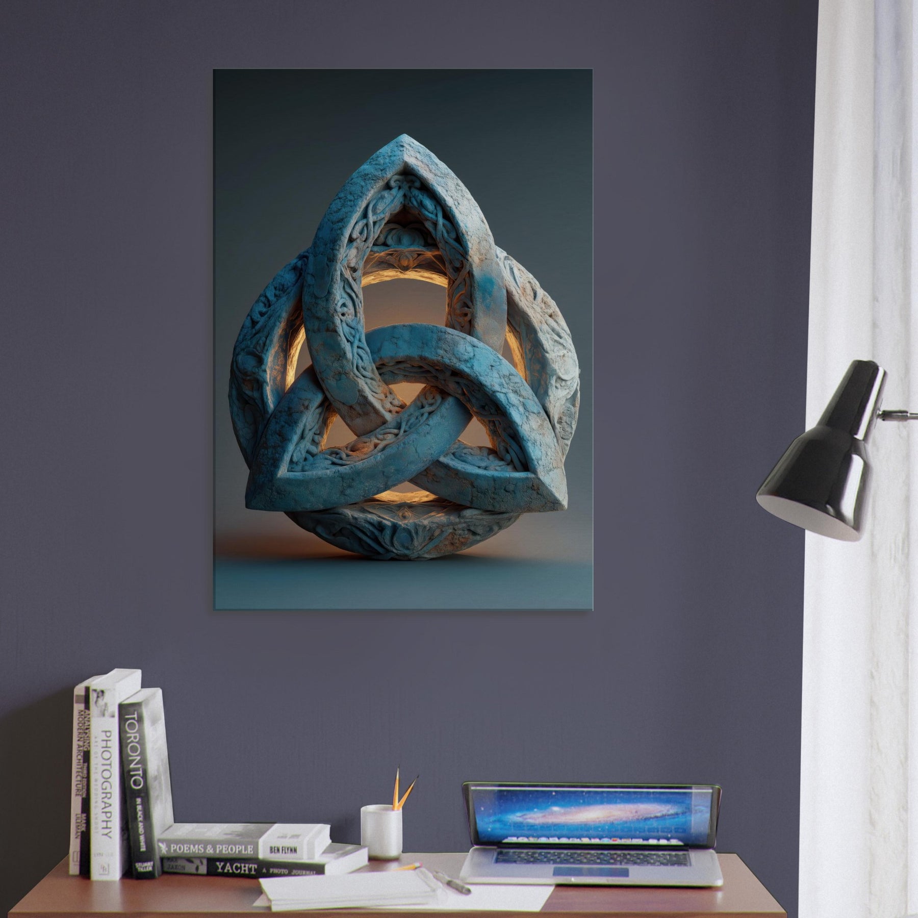 With the Celtic Triquetra as its heartbeat, this surreal wall piece threads ancient symbol and dreamlike form into one luminous presence. A cool stone blue lattice folds into a luminous inner glow, inviting the viewer to pause, breathe, and wander through time. The atmosphere is hushed, almost ceremonial perfect for a living room or study that craves intrigue and calm. Let the mystic knot anchor your space, turning ordinary walls into a portal of memory, ritual, and quiet wonder.