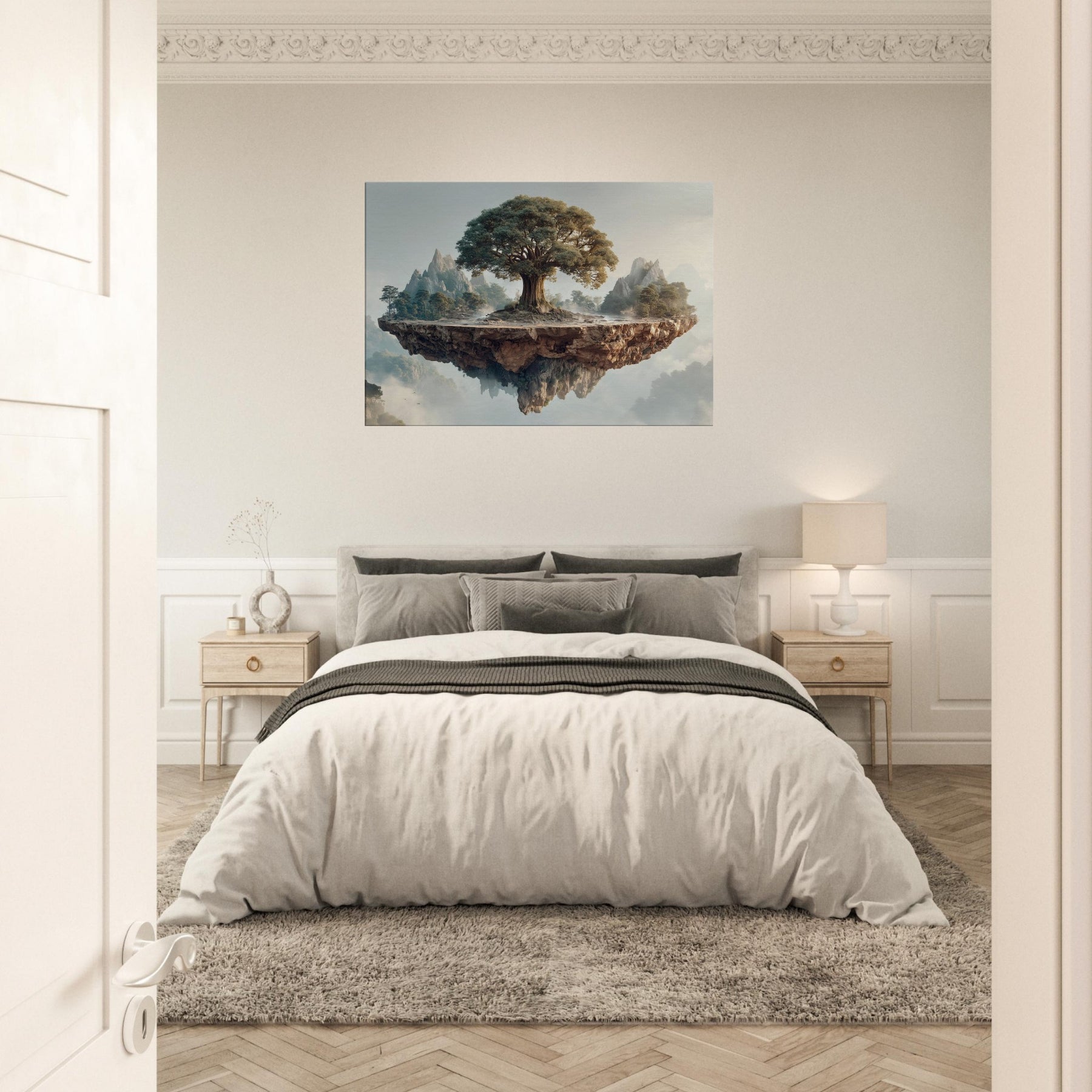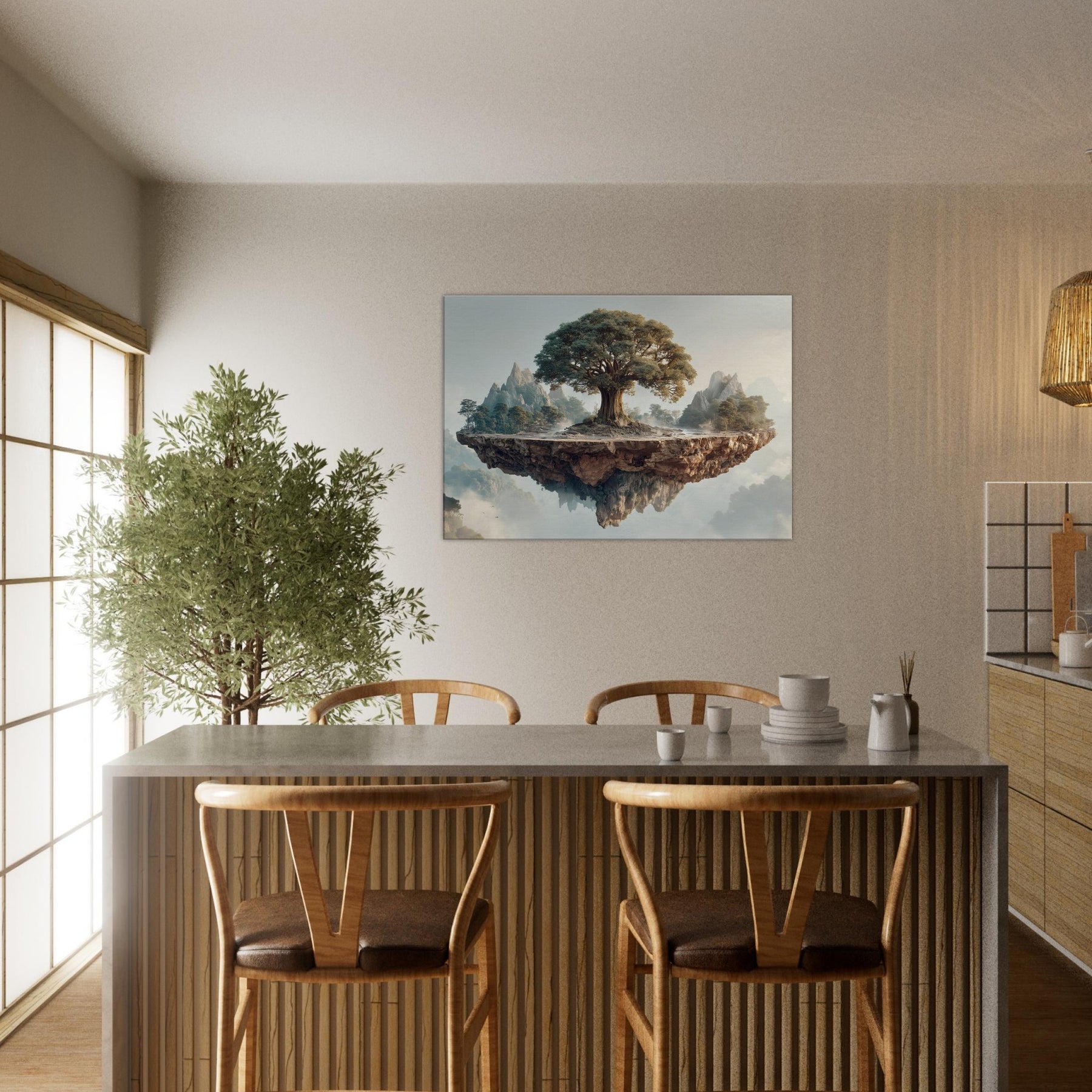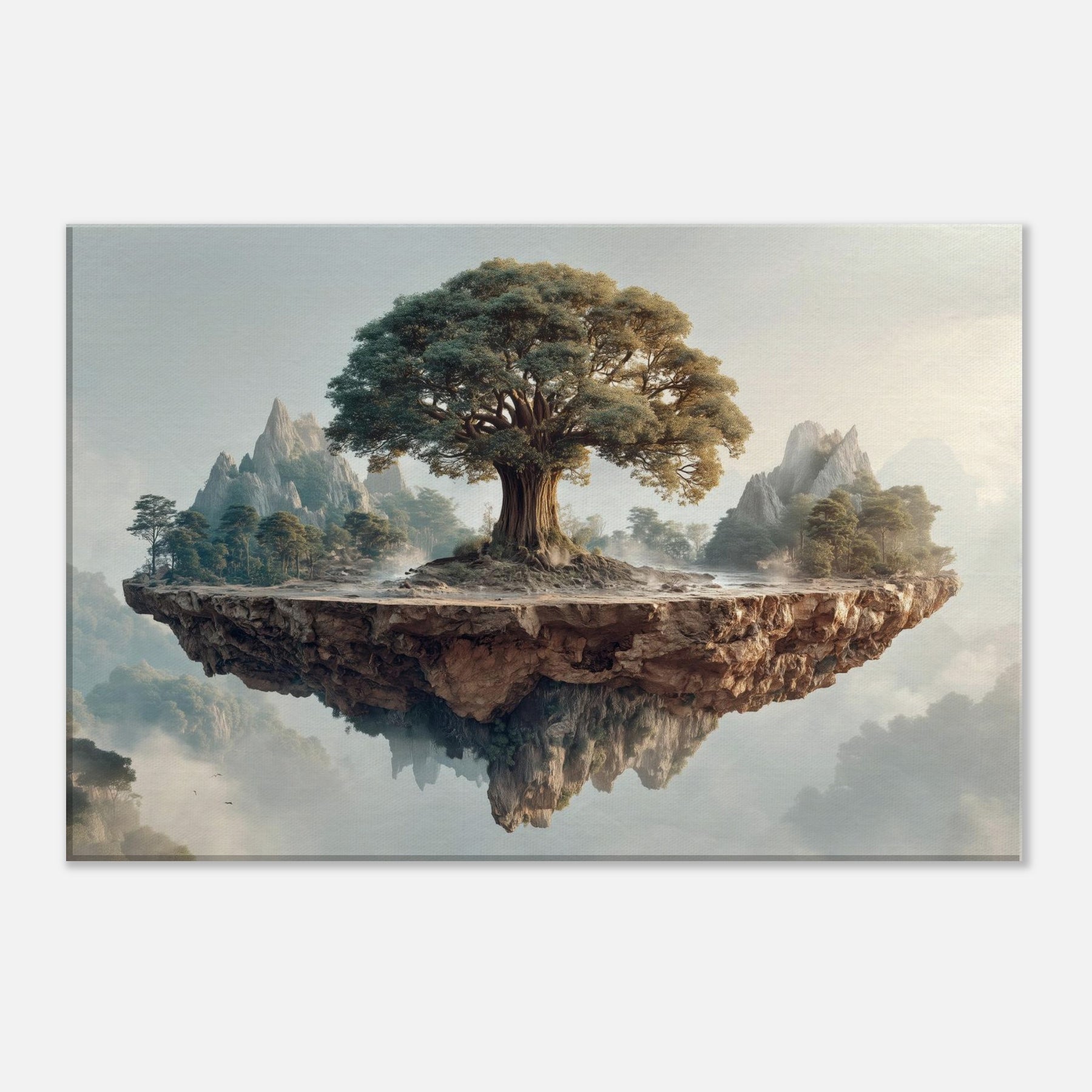 Yggdrasil (World Tree) rises at the heart of a suspended, rune carved island, its ancient trunk spiraling toward a sky brushed with dawn. Surrounded by distant peaks and a soft mist, this mystical image folds time into a single breath, inviting quiet awe and contemplation. The texture of bark, the glow on leaves, and the floating fragment of earth create a sanctuary feel perfect for a living room or study that longs for wonder and a ceremonial stillness.