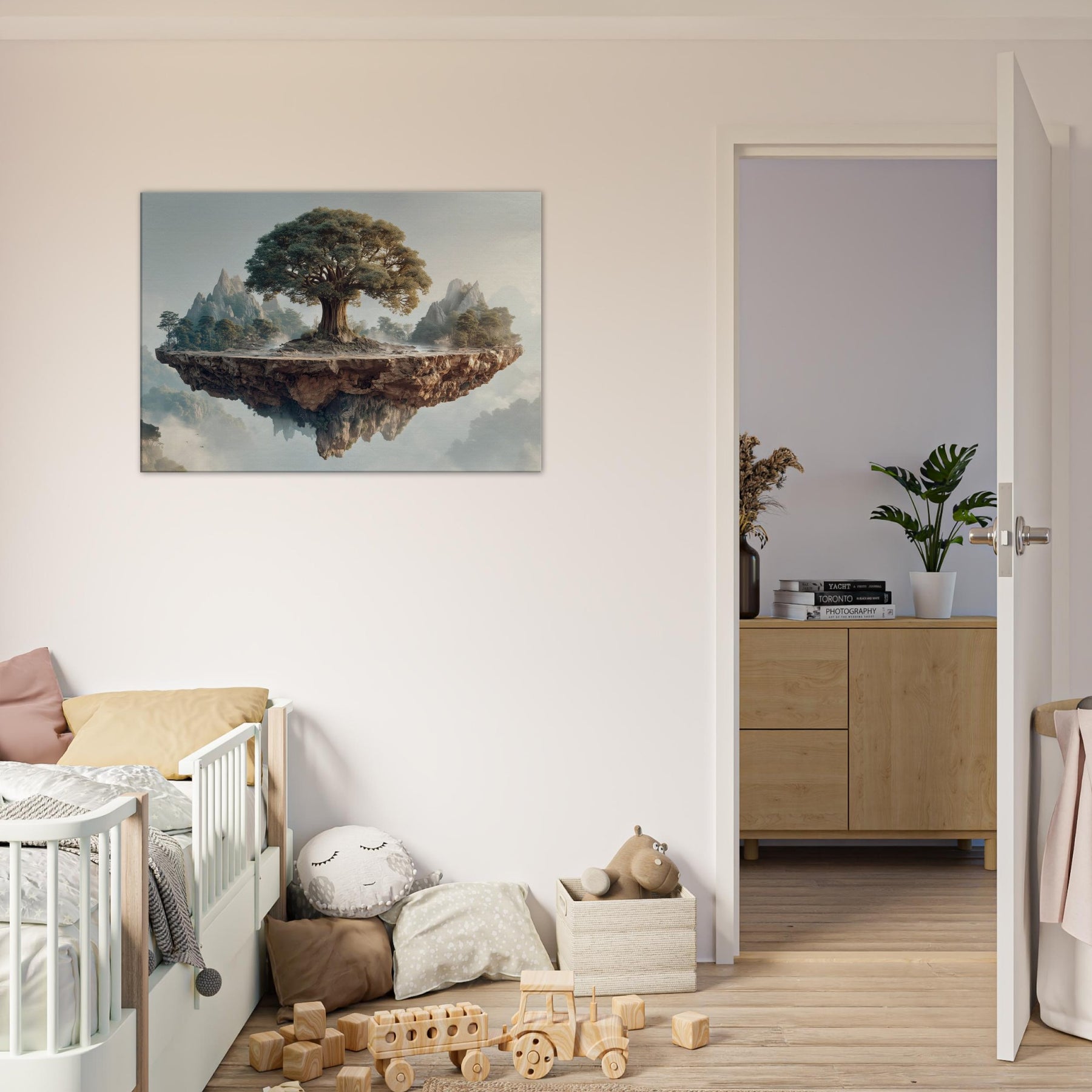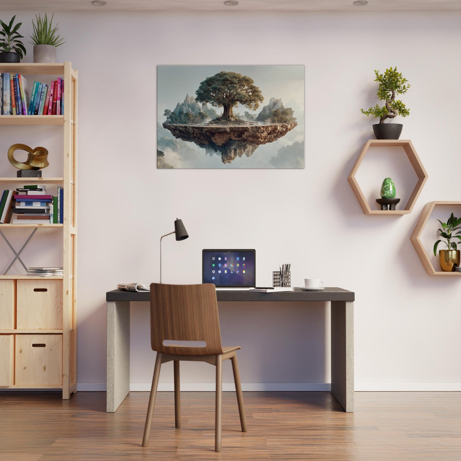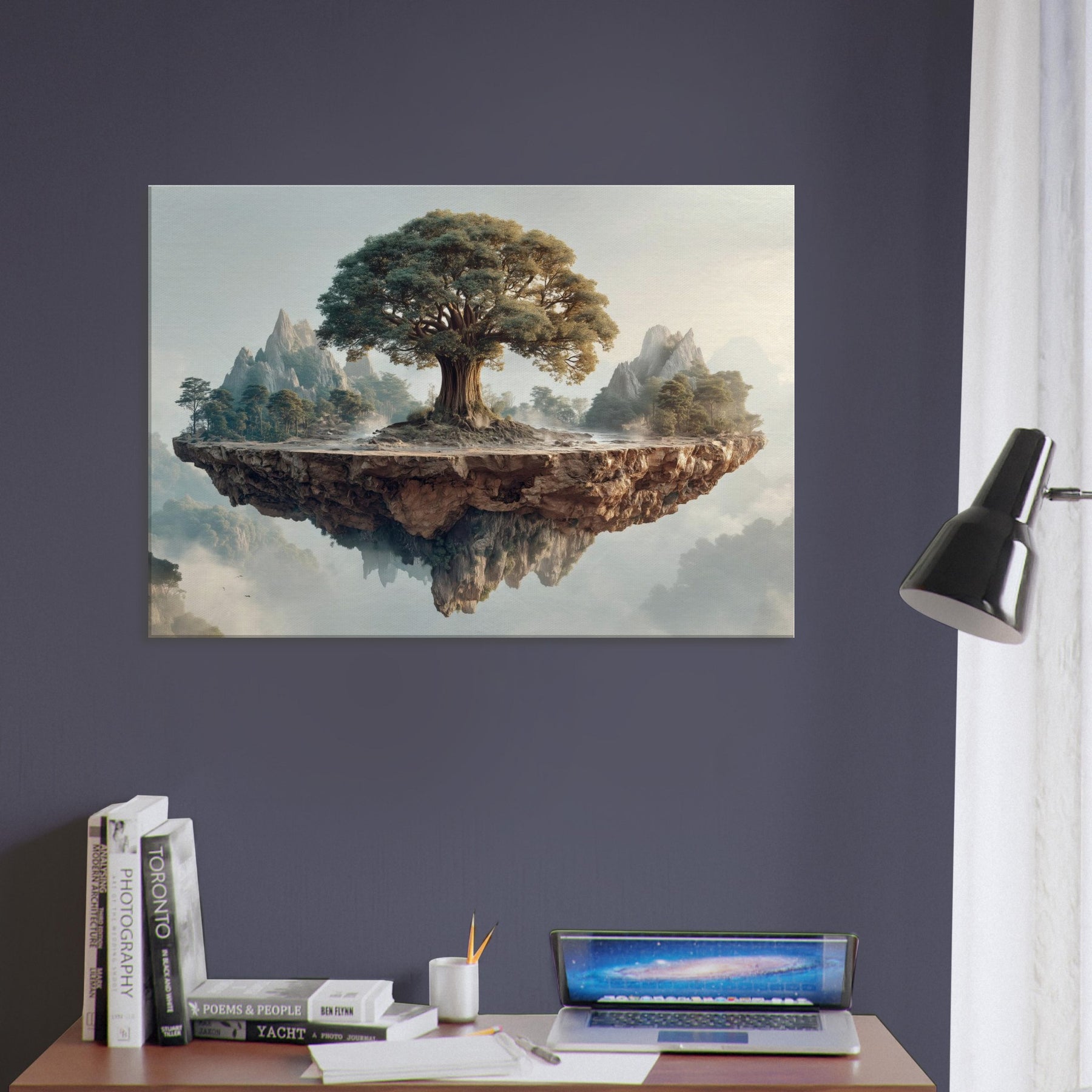 Yggdrasil (World Tree) rises at the heart of a suspended, rune carved island, its ancient trunk spiraling toward a sky brushed with dawn. Surrounded by distant peaks and a soft mist, this mystical image folds time into a single breath, inviting quiet awe and contemplation. The texture of bark, the glow on leaves, and the floating fragment of earth create a sanctuary feel perfect for a living room or study that longs for wonder and a ceremonial stillness.