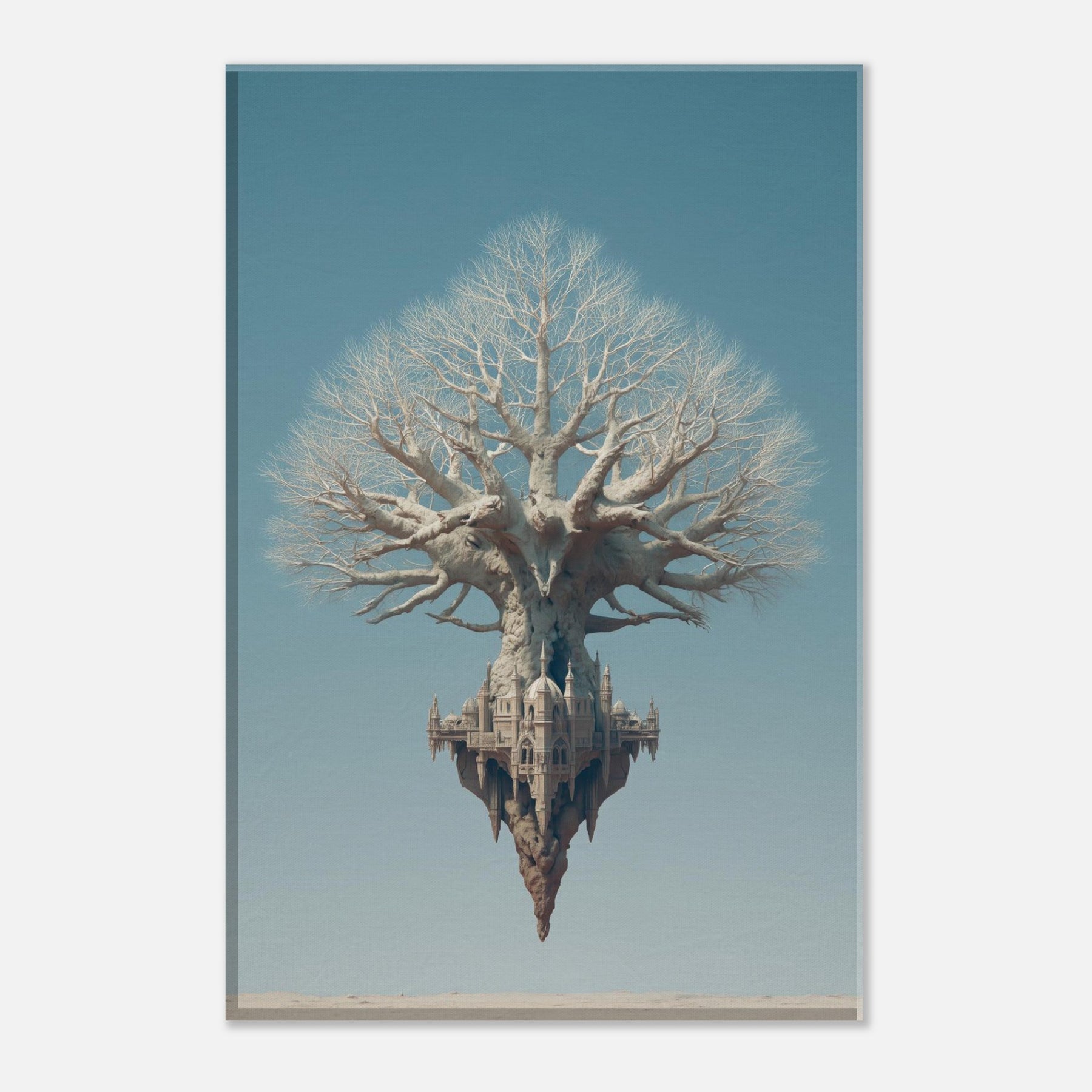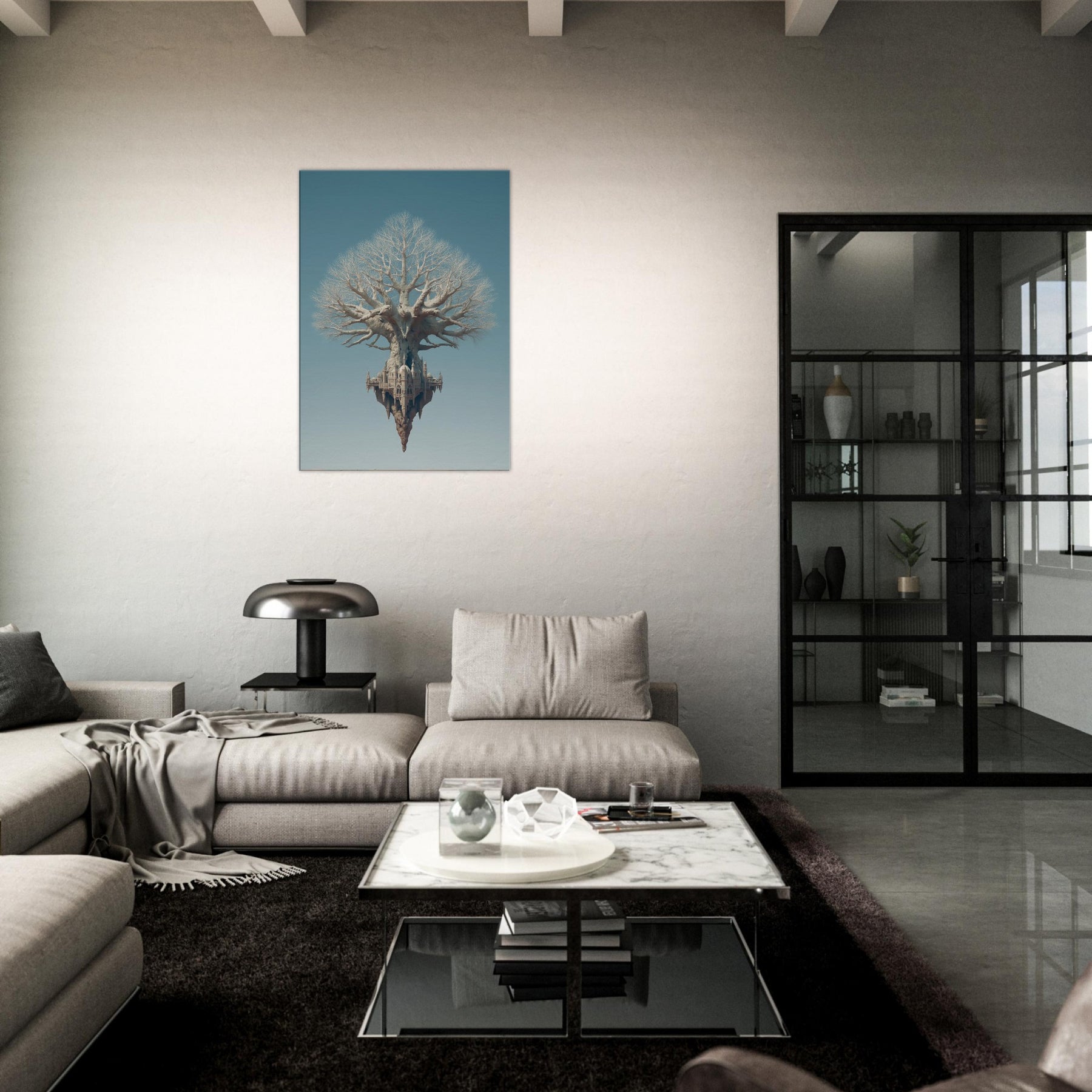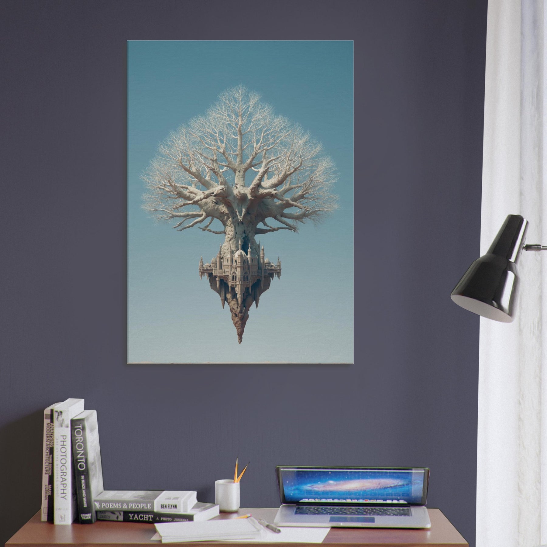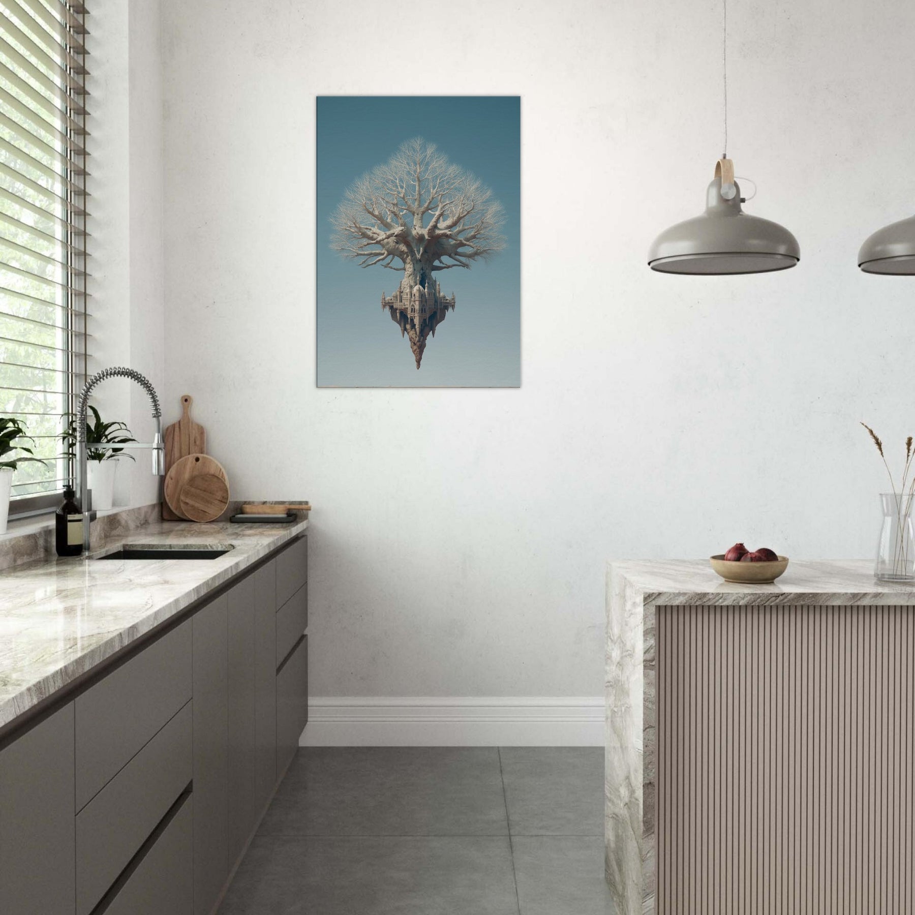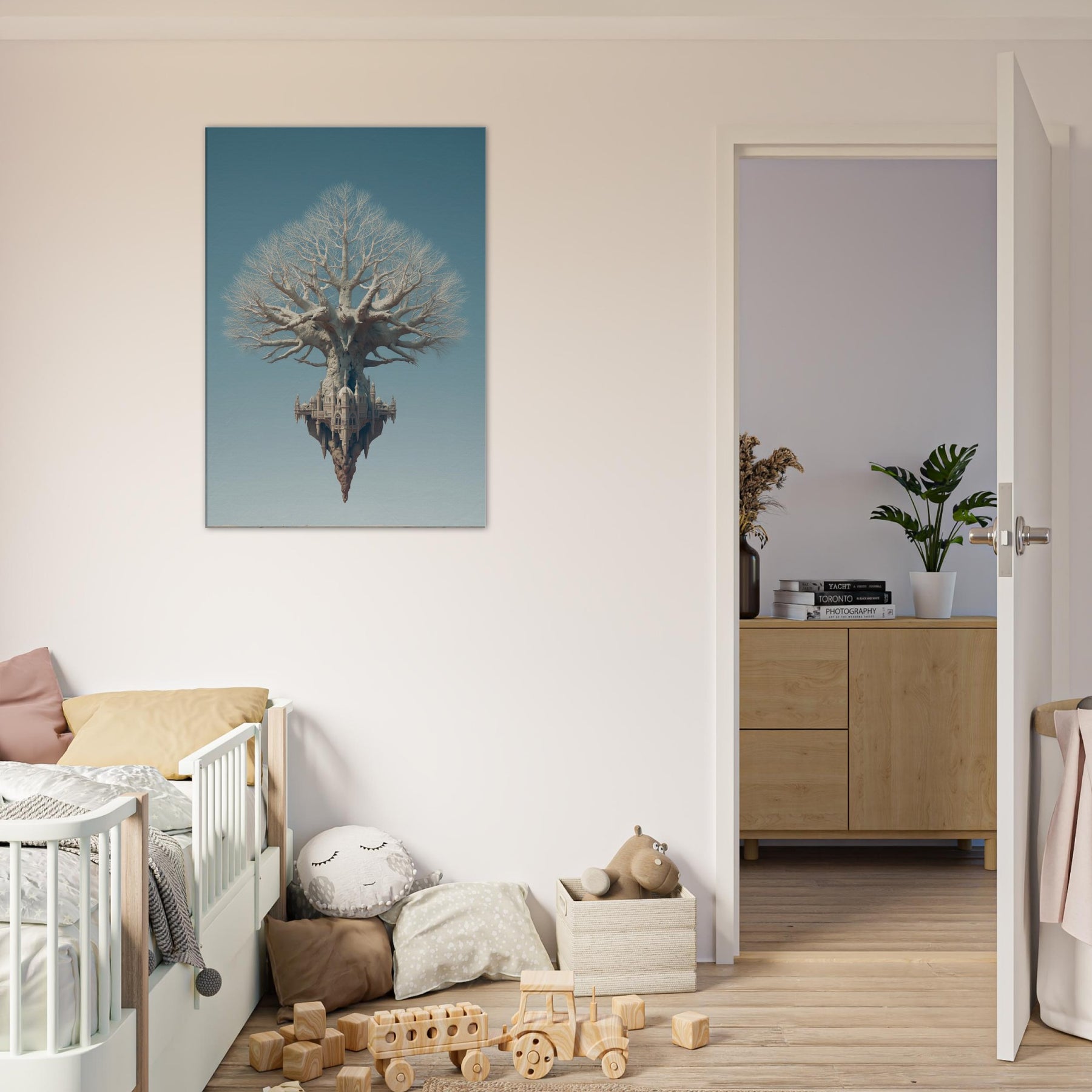 Yggdrasil rises as a dream above a hushed : a colossal, leafless World Tree cradling a floating citadel of stone and spires. Surreal branches cradle the air, inviting quiet contemplation, while cool, pale light threads through the architecture like a whisper of wind. This artwork invites a space to breathe, to dream, to let the mind drift between myth and memory. A centerpiece that elevates living rooms with magical calm. The central subject is Yggdrasil (World Tree).